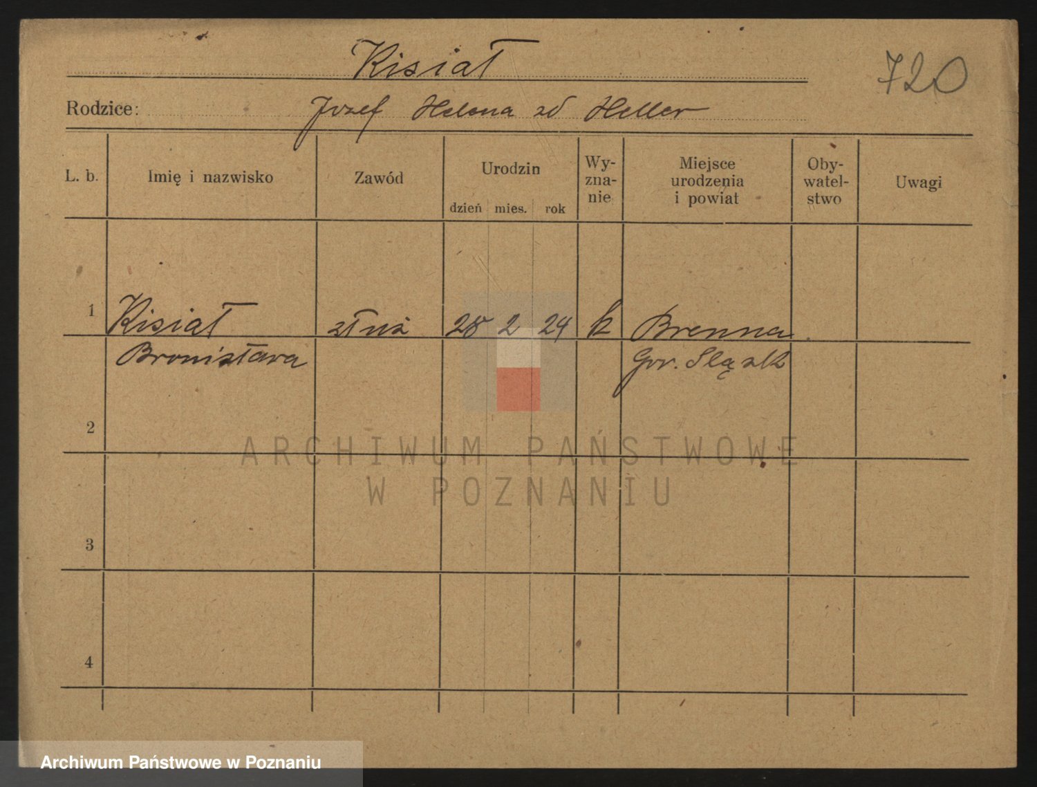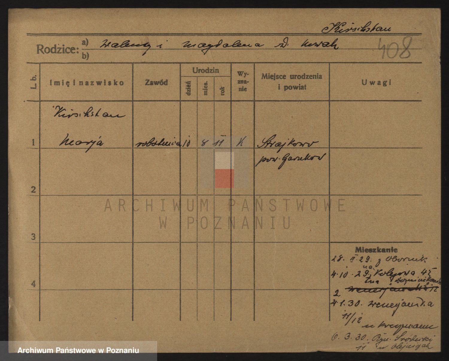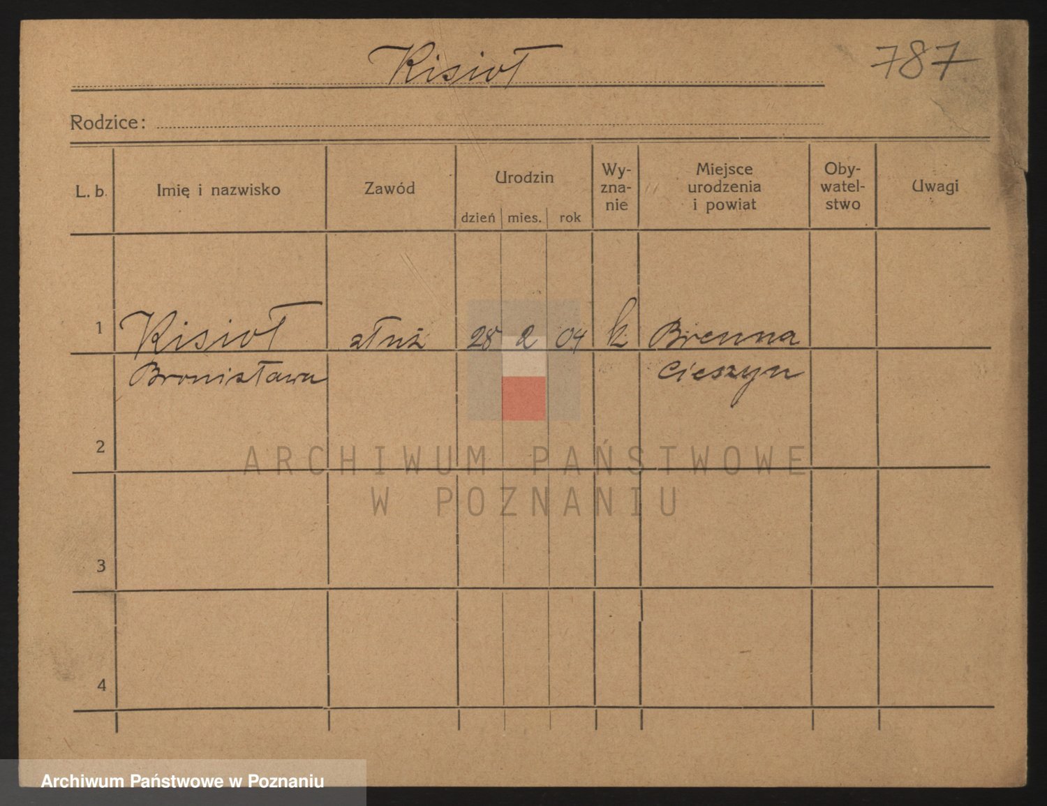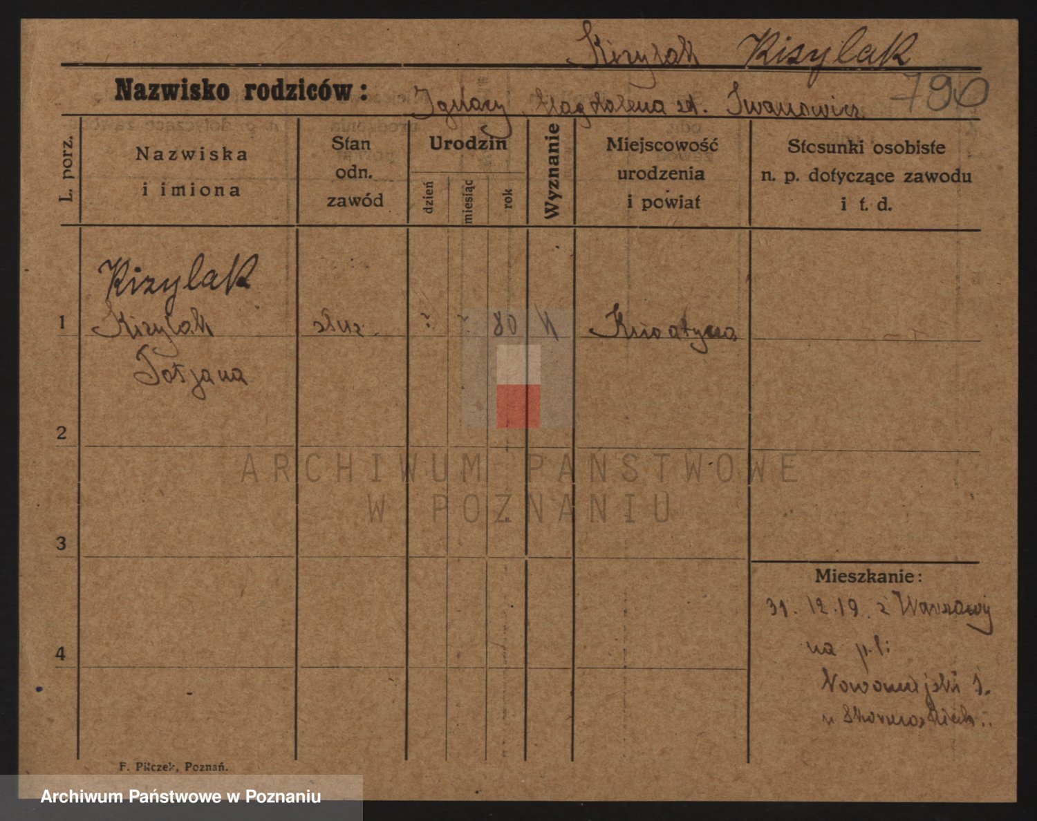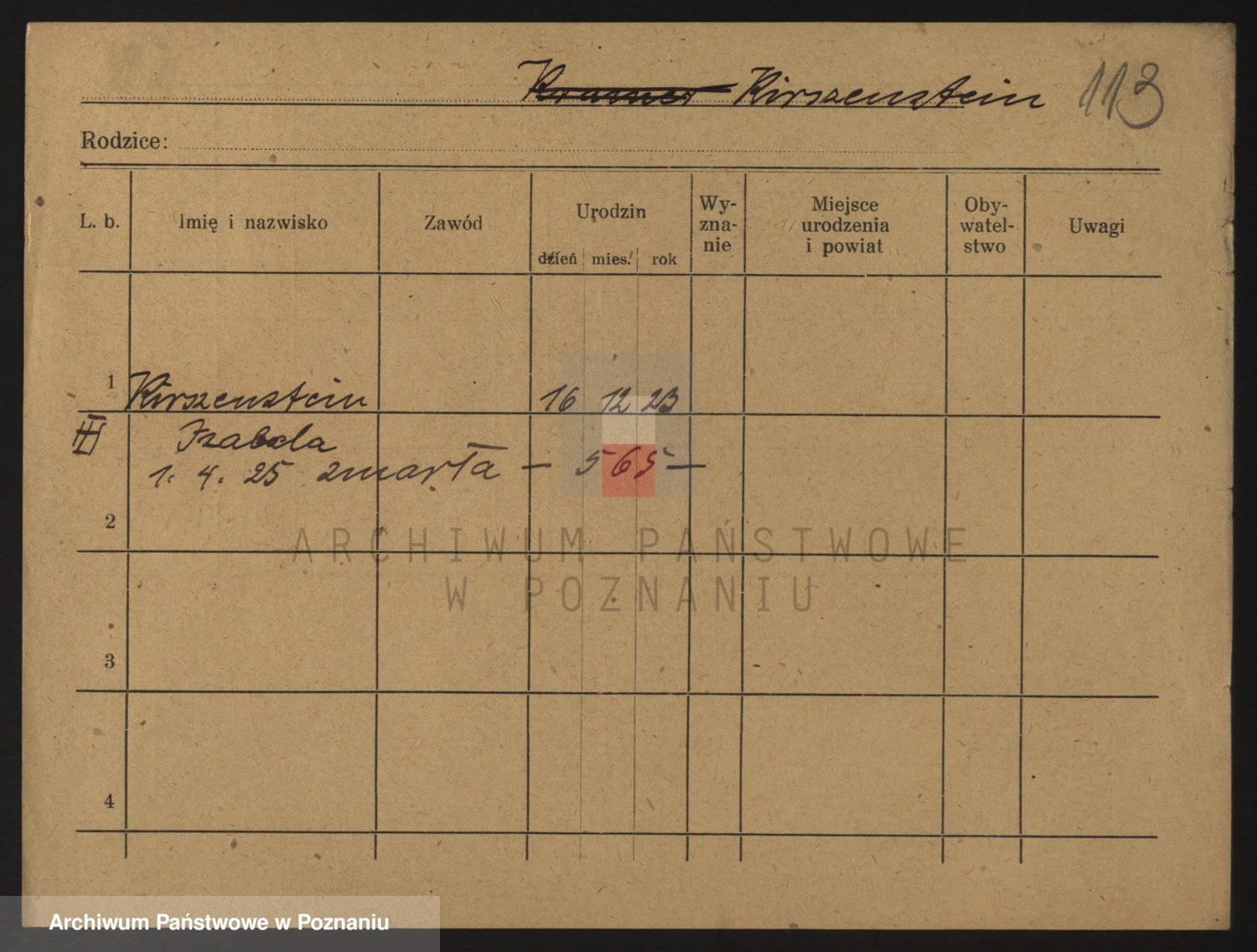 Podgląd karty osobowej dostępny jest po kliknięciu na nazwisko lub ikonkę karty. Można dokonywać powiększenia (ikony na górze) lub przechodzić między kolejnymi skanami (strzałki po bokach).