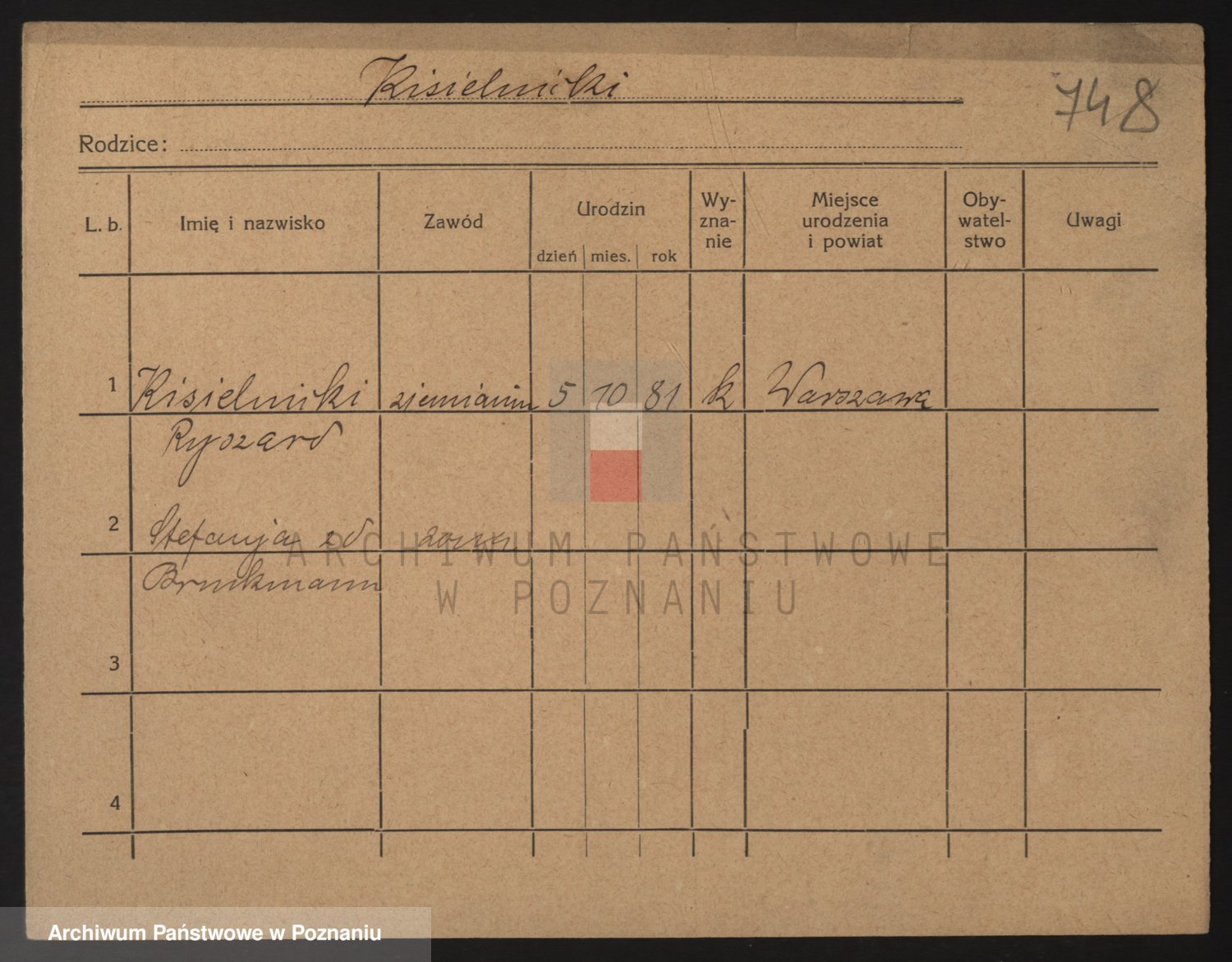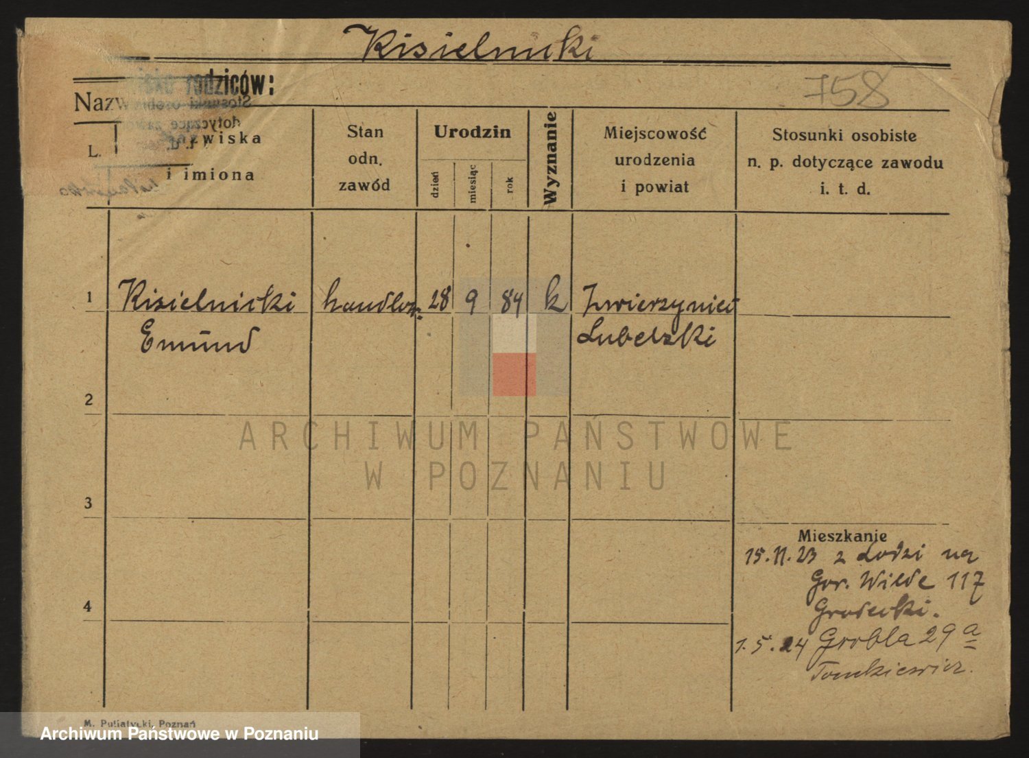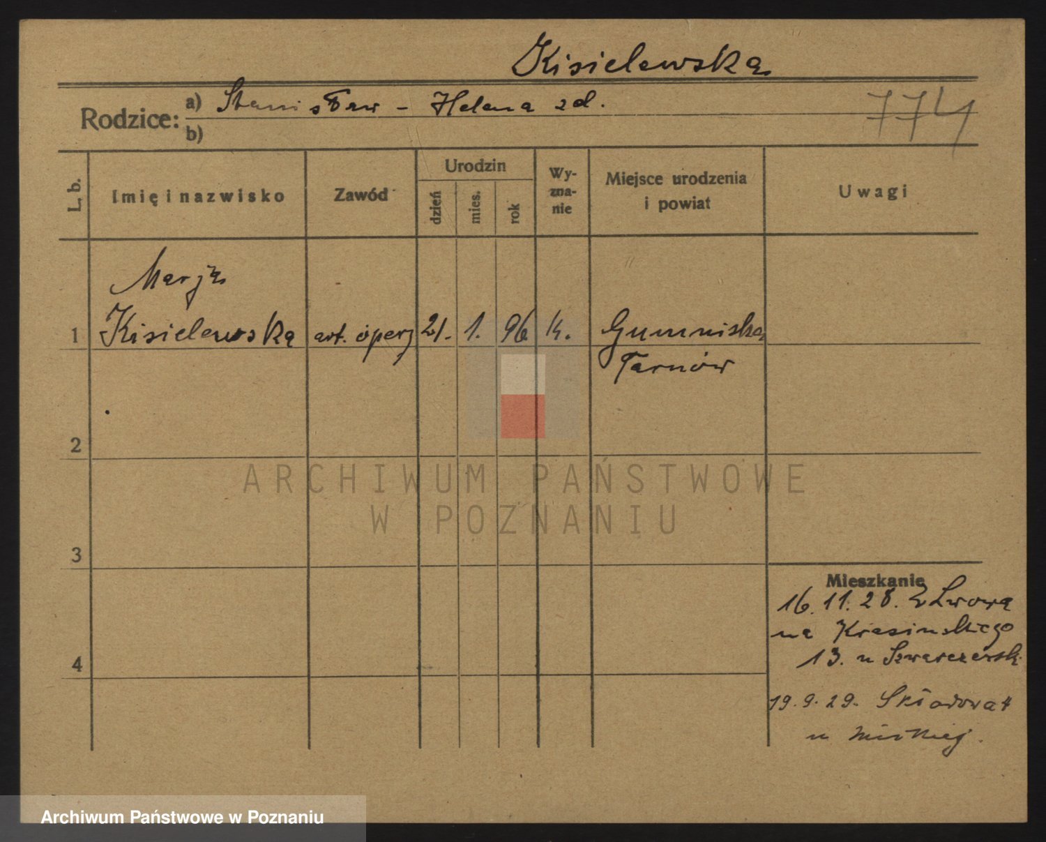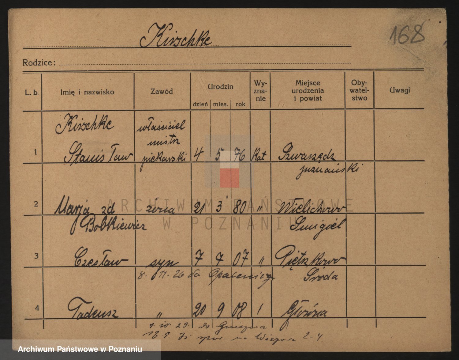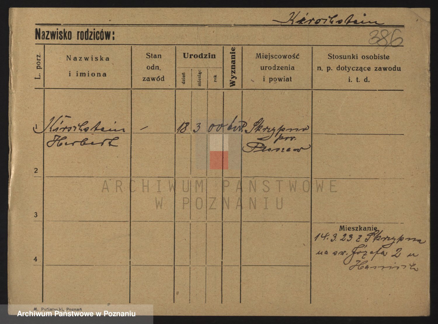 Podgląd karty osobowej dostępny jest po kliknięciu na nazwisko lub ikonkę karty. Można dokonywać powiększenia (ikony na górze) lub przechodzić między kolejnymi skanami (strzałki po bokach).