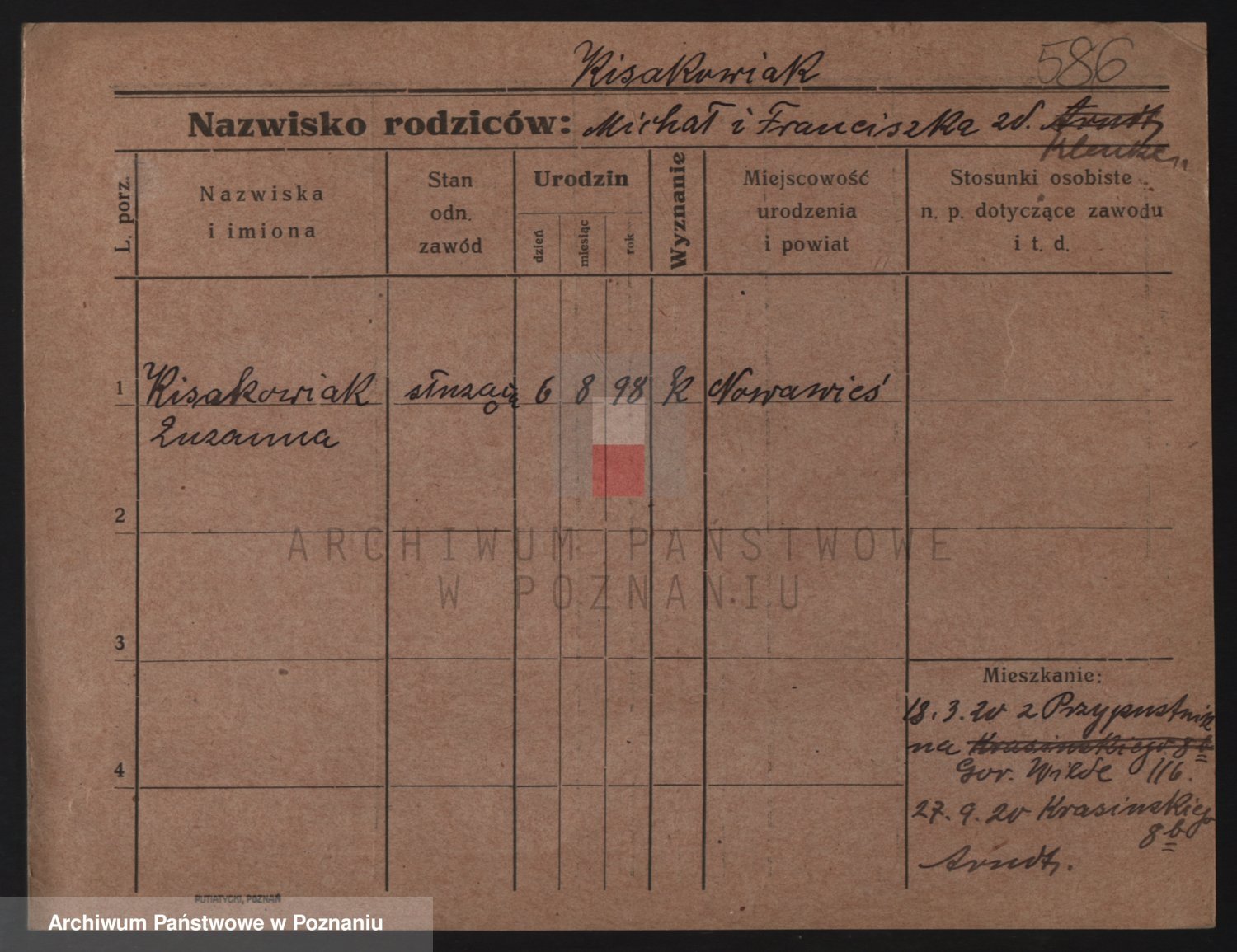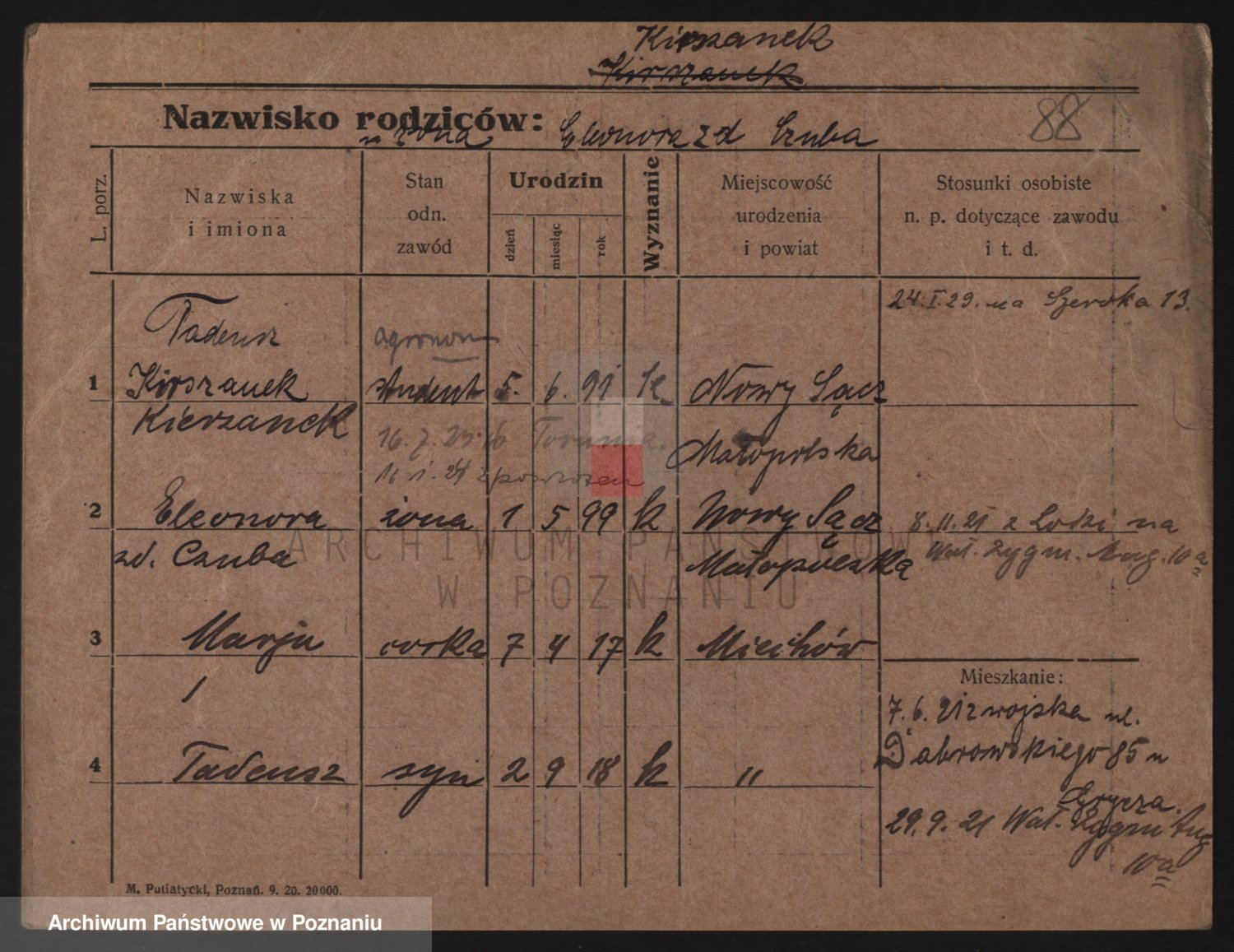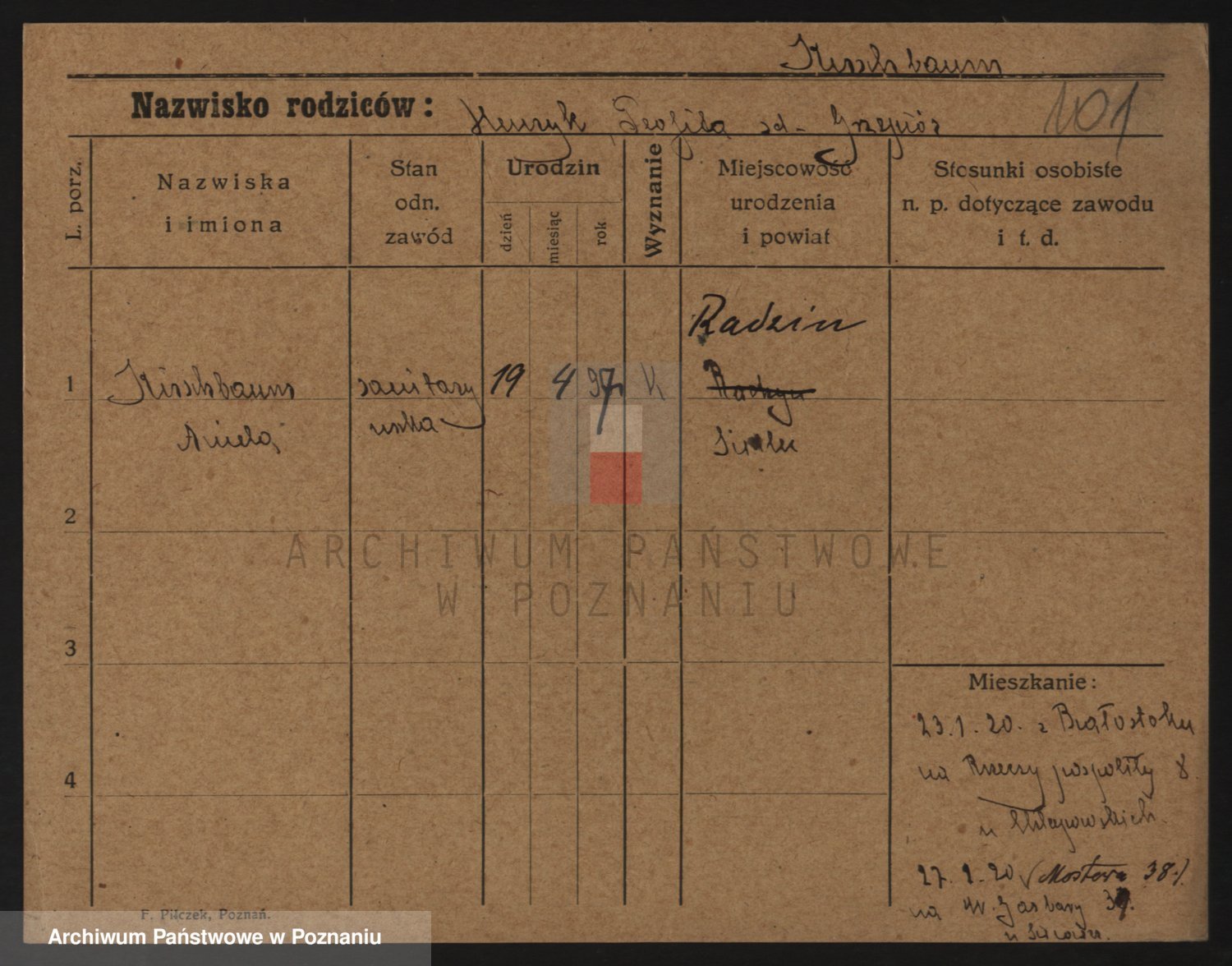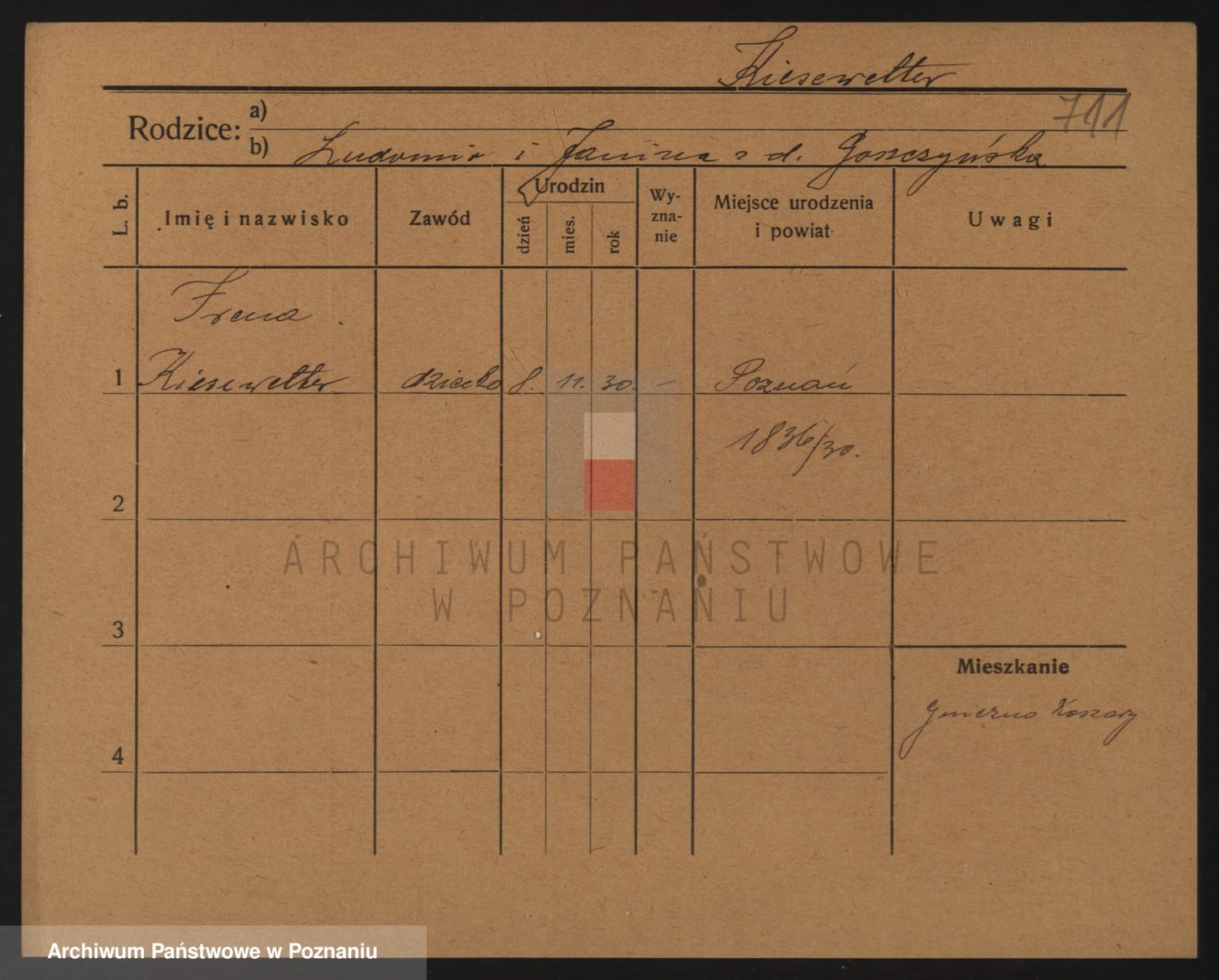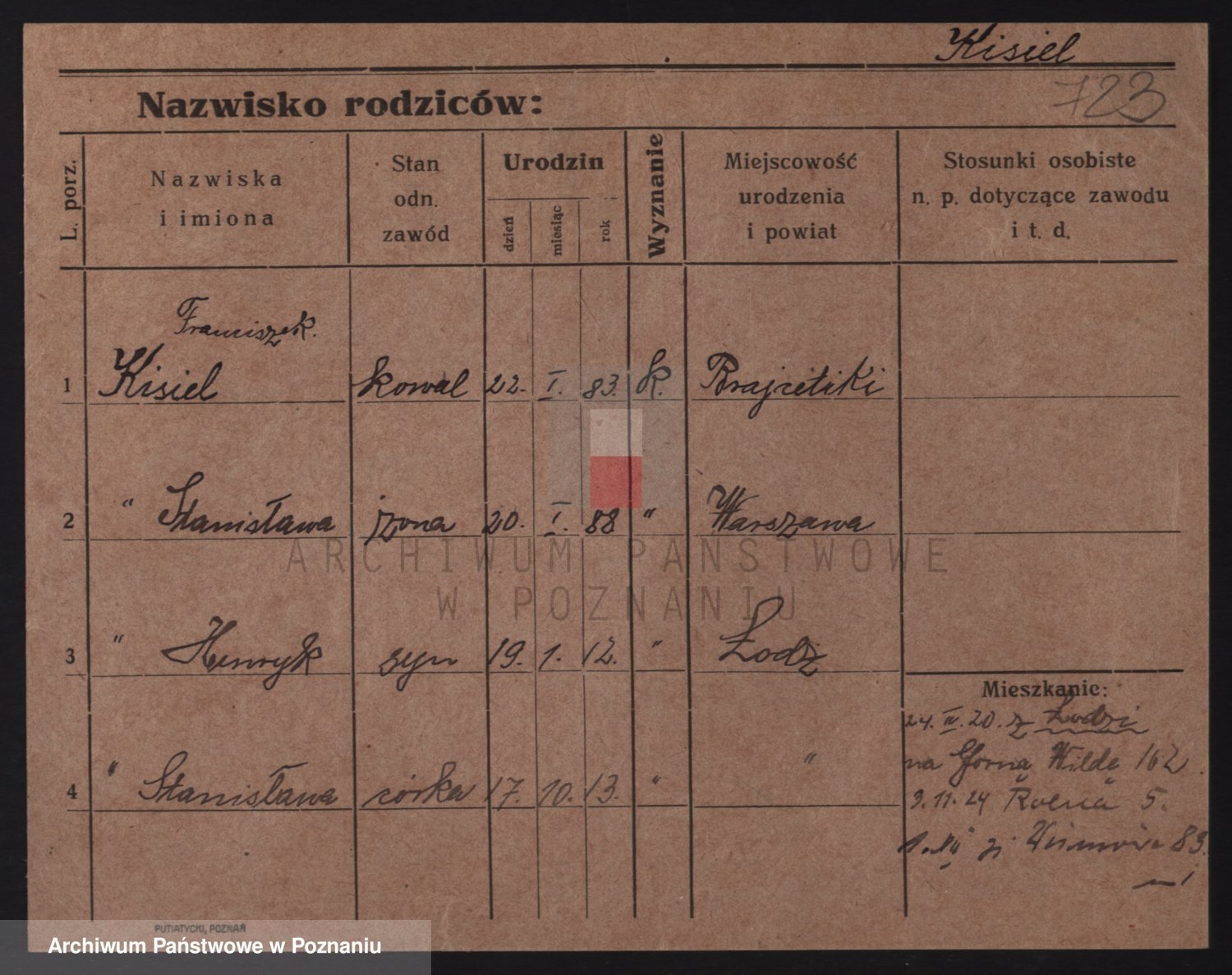 Podgląd karty osobowej dostępny jest po kliknięciu na nazwisko lub ikonkę karty. Można dokonywać powiększenia (ikony na górze) lub przechodzić między kolejnymi skanami (strzałki po bokach).