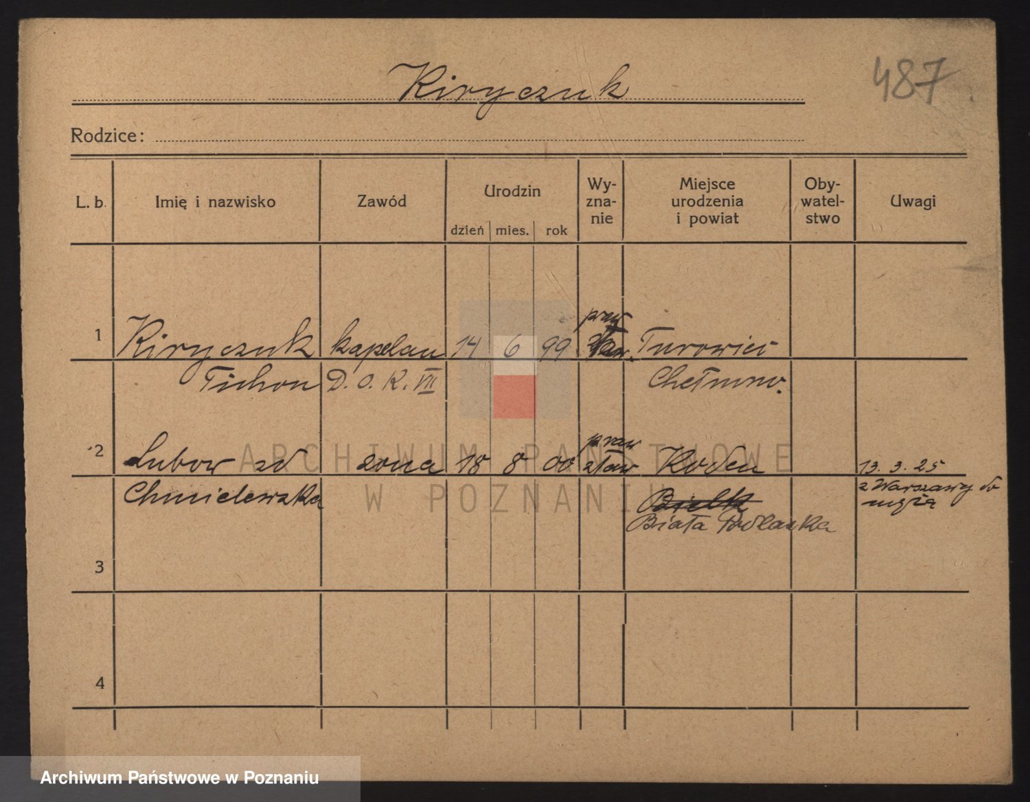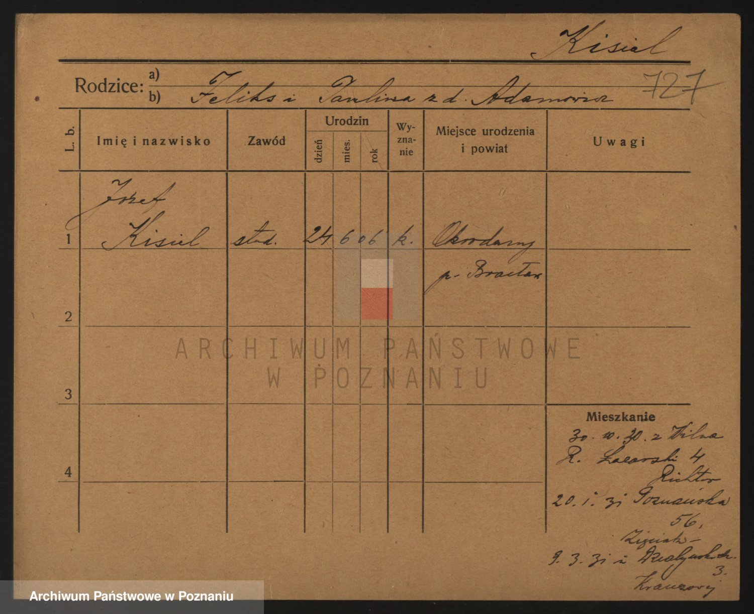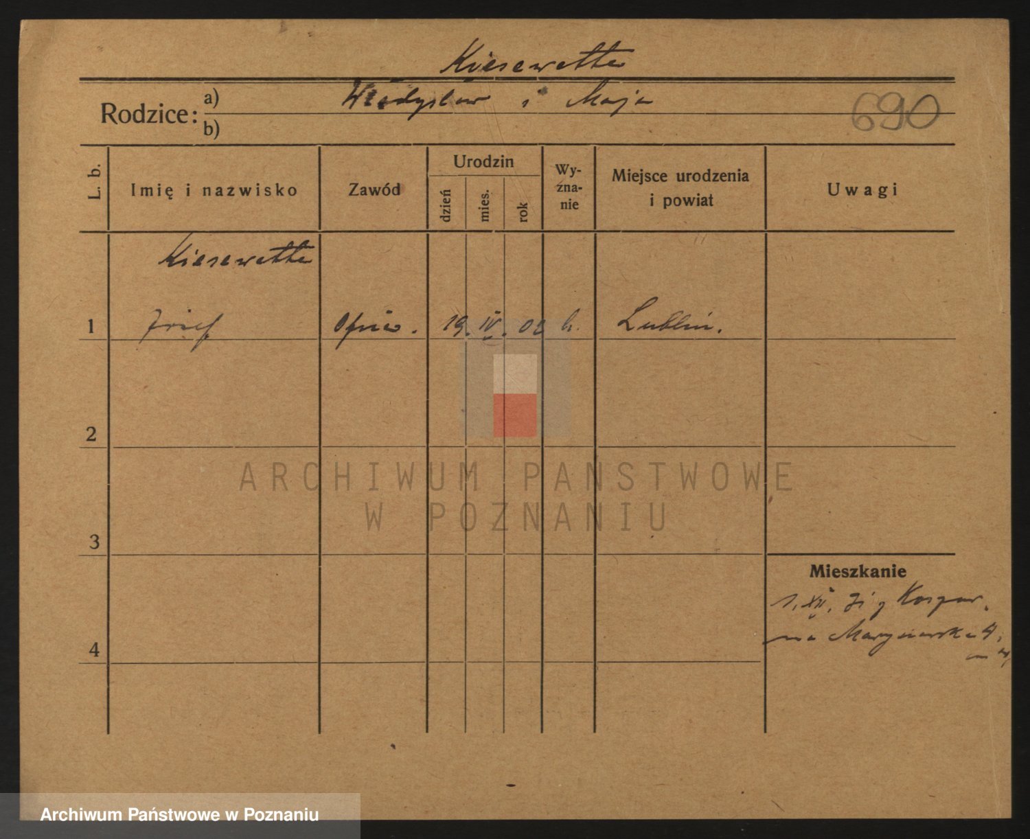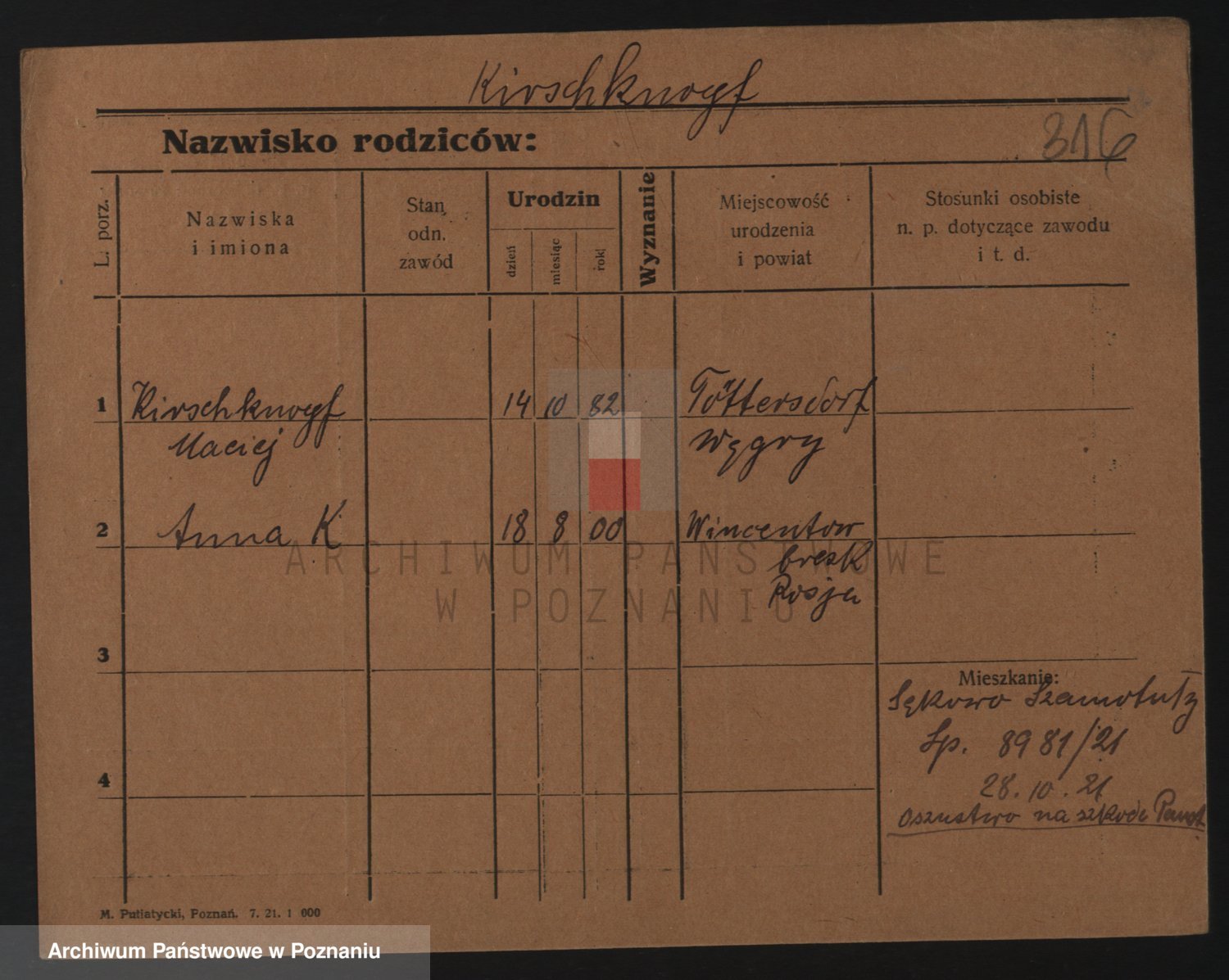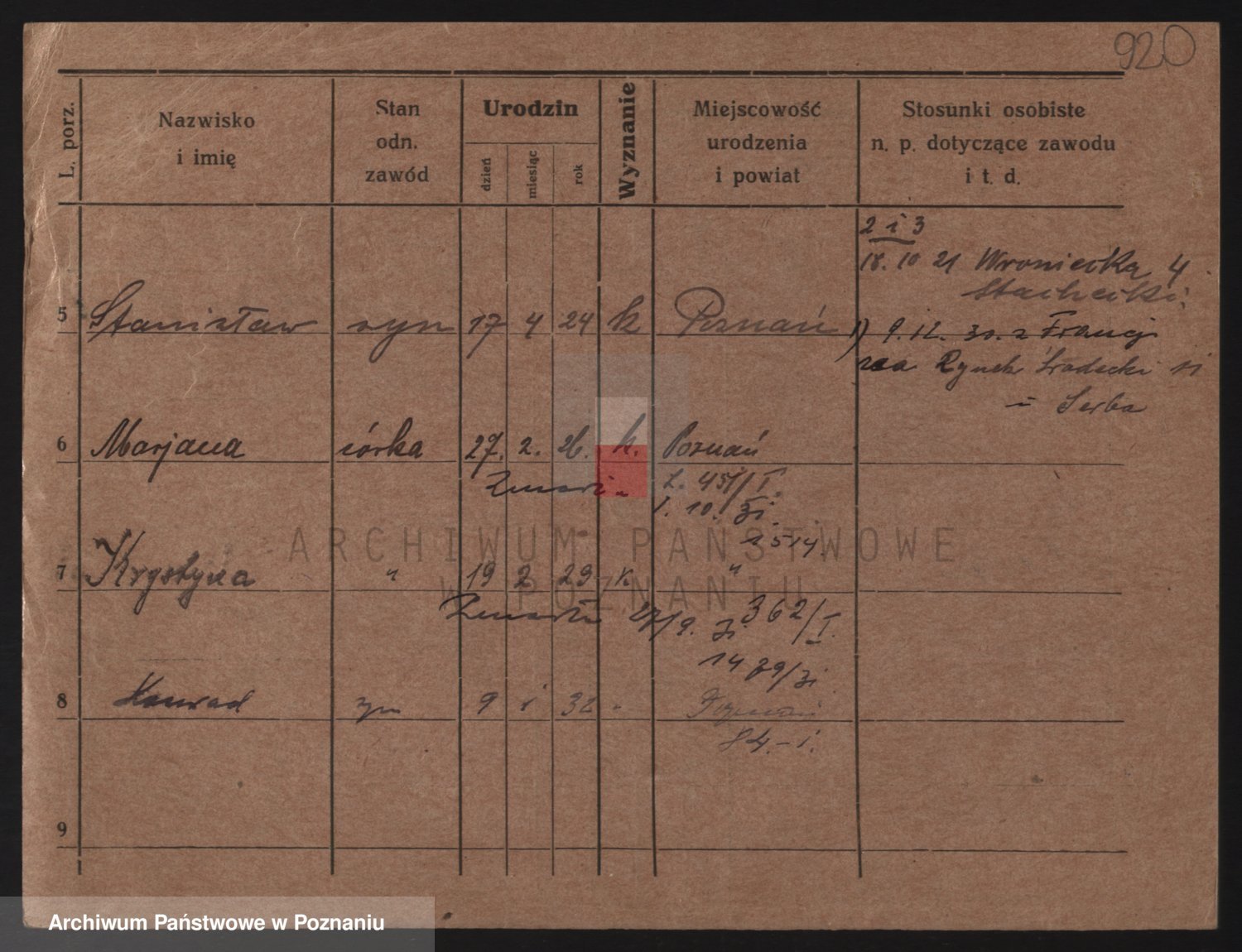 Podgląd karty osobowej dostępny jest po kliknięciu na nazwisko lub ikonkę karty. Można dokonywać powiększenia (ikony na górze) lub przechodzić między kolejnymi skanami (strzałki po bokach).