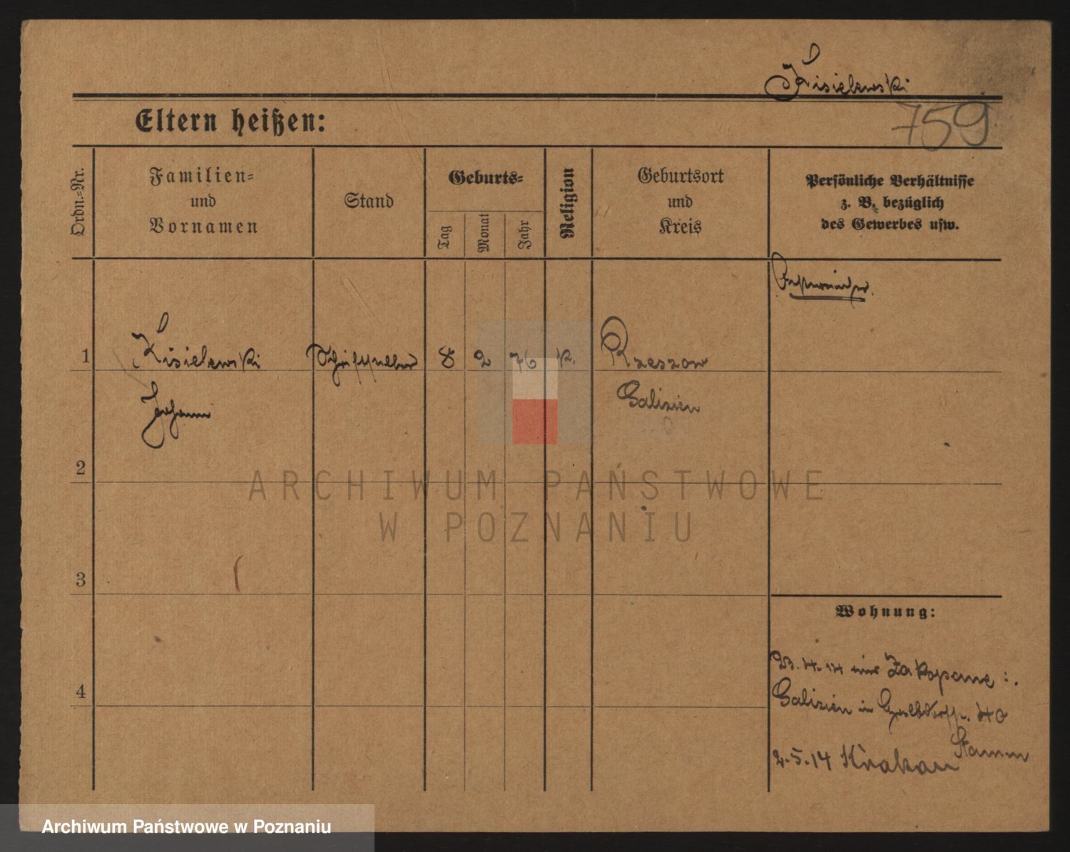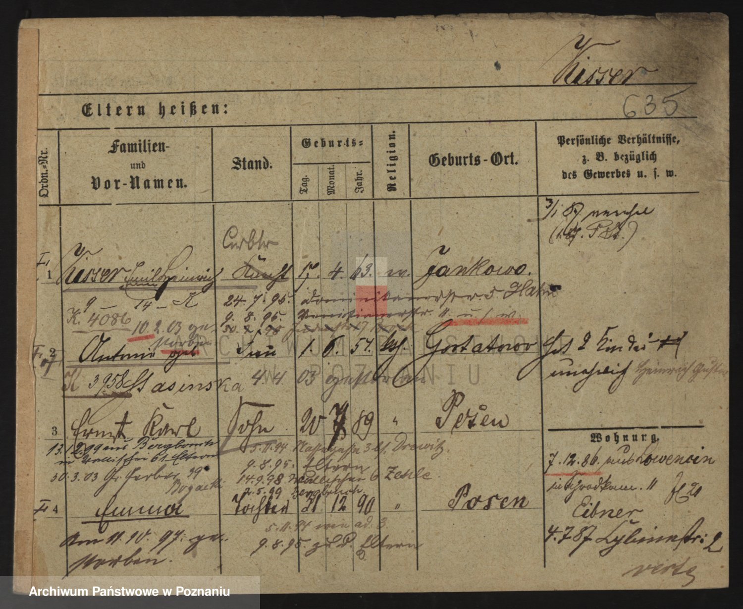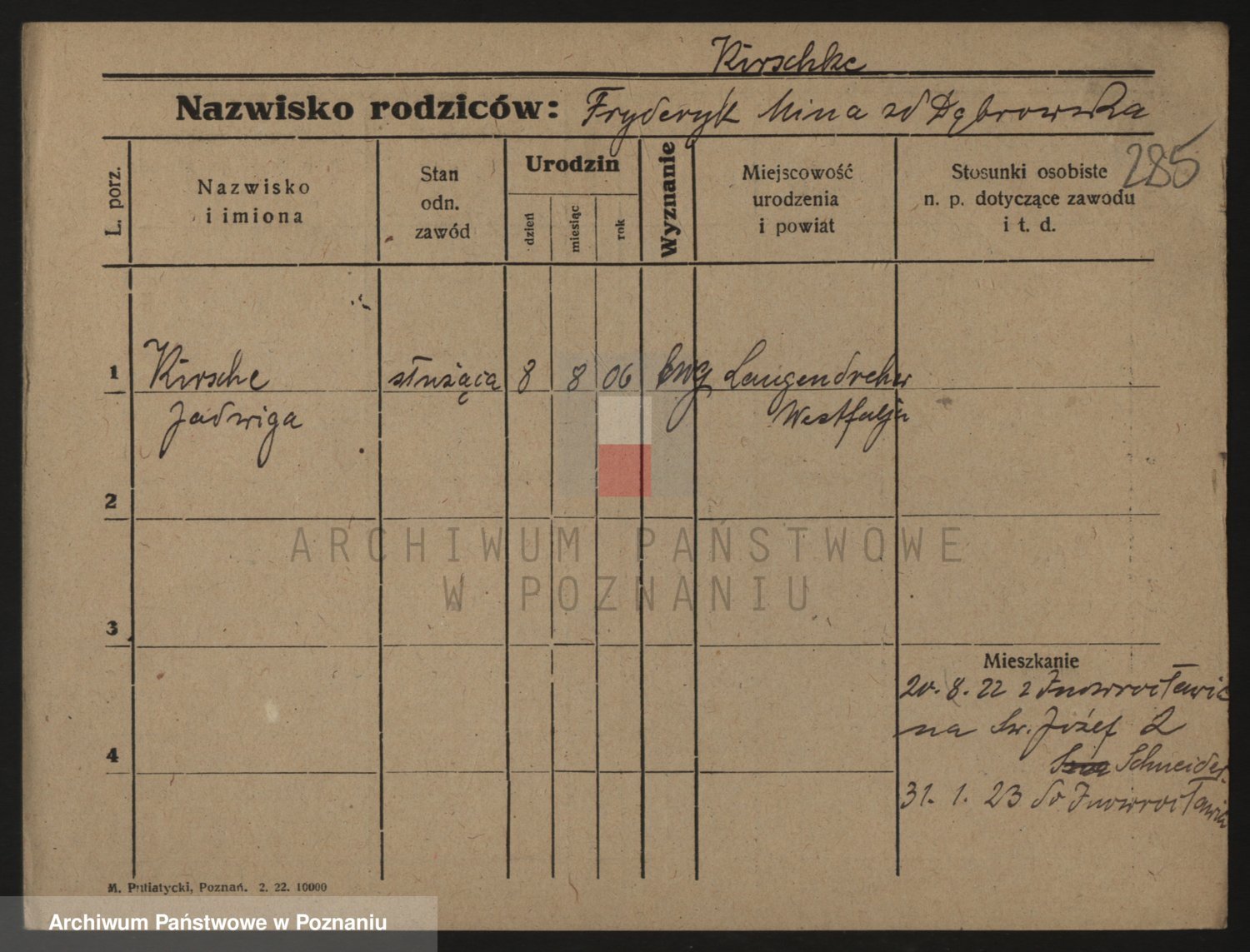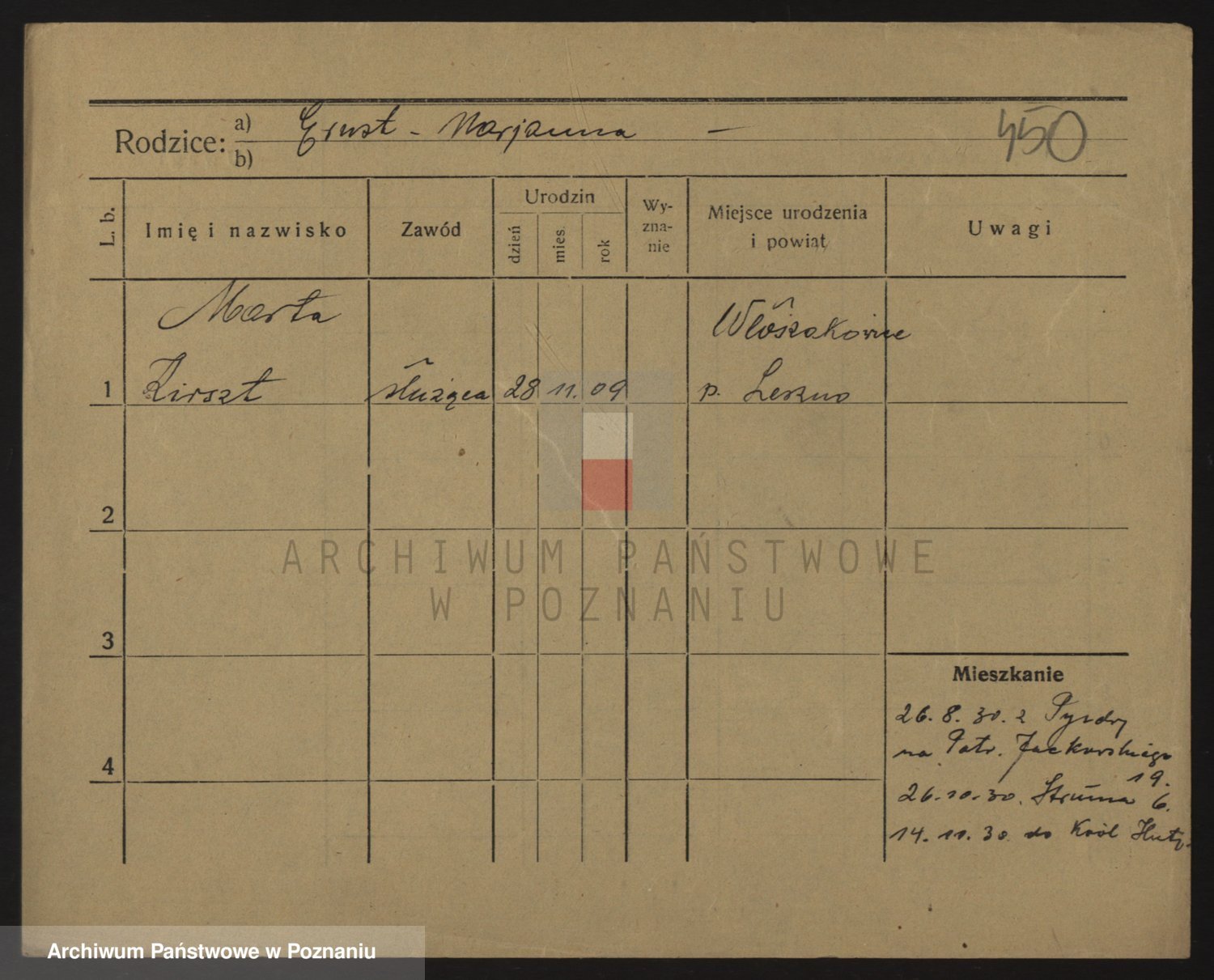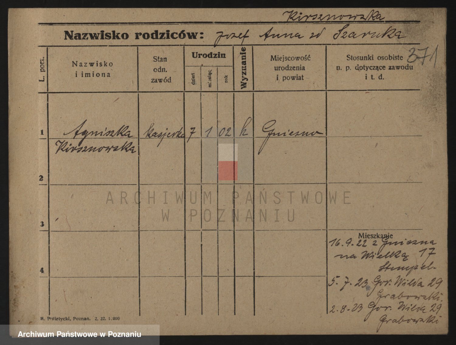 Podgląd karty osobowej dostępny jest po kliknięciu na nazwisko lub ikonkę karty. Można dokonywać powiększenia (ikony na górze) lub przechodzić między kolejnymi skanami (strzałki po bokach).