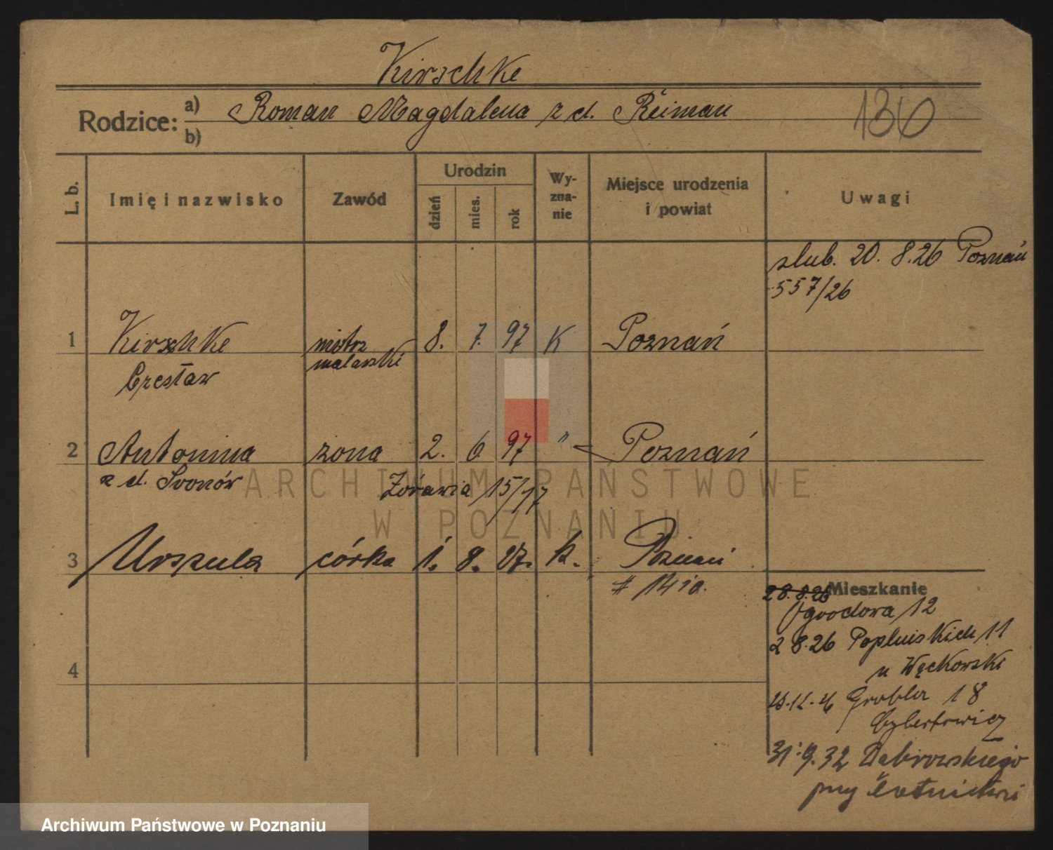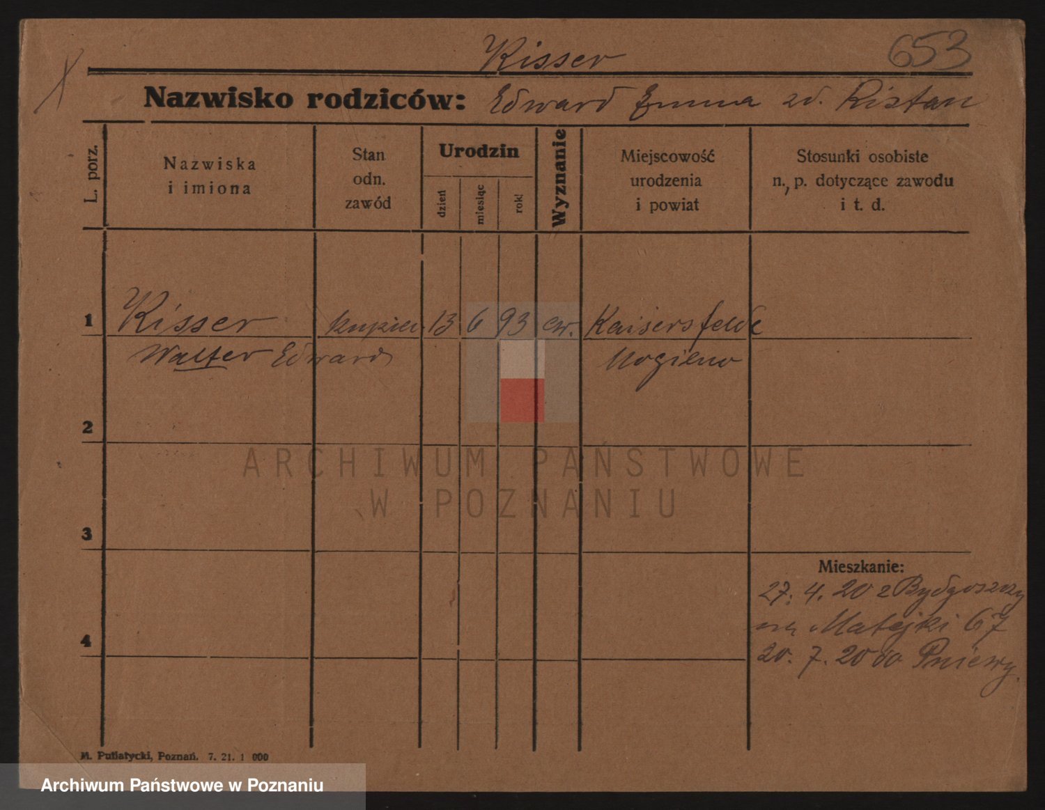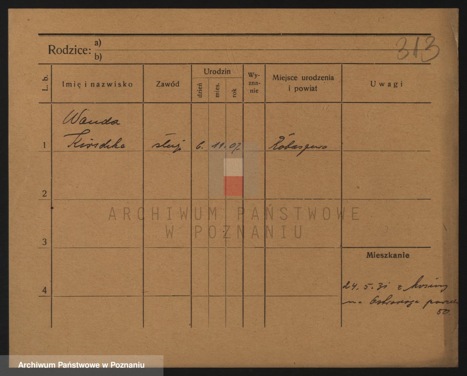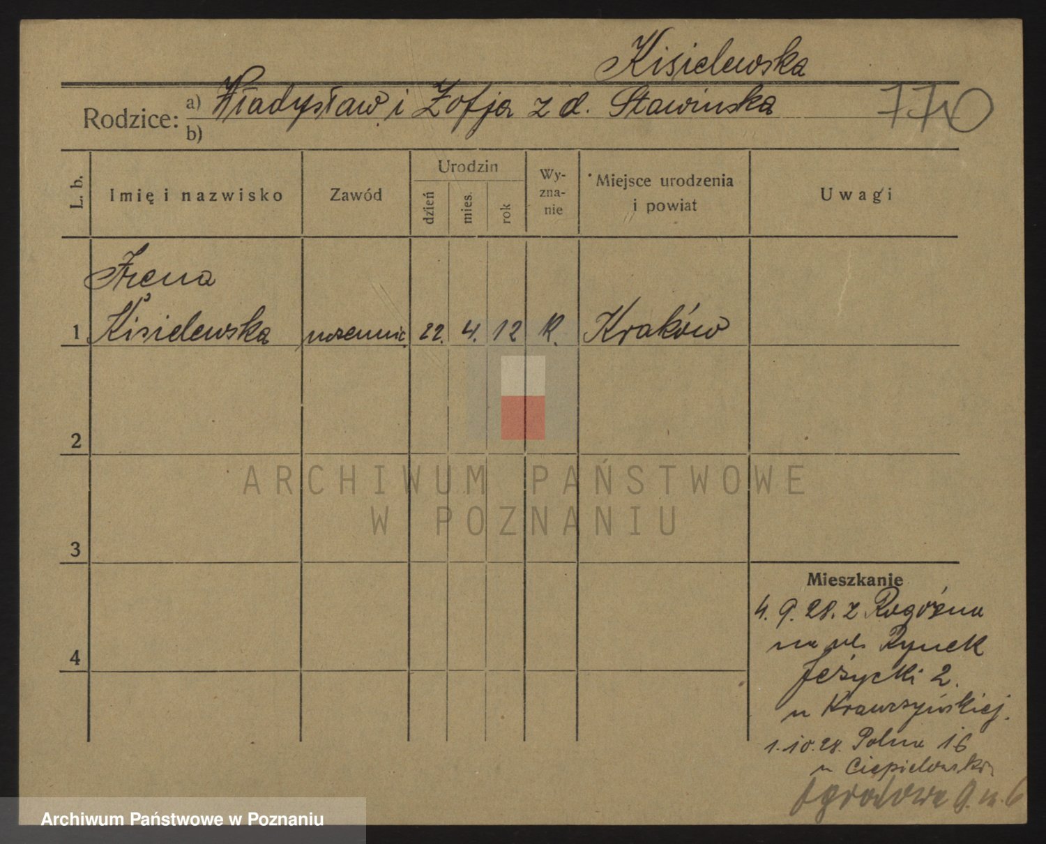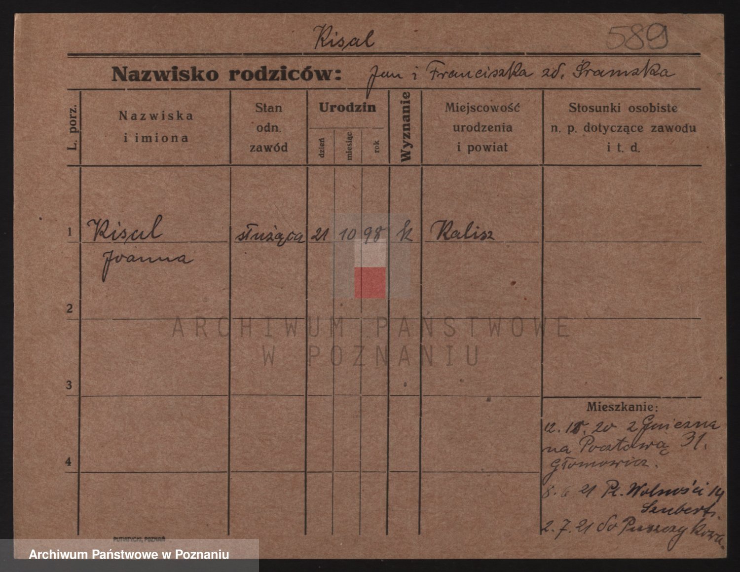 Podgląd karty osobowej dostępny jest po kliknięciu na nazwisko lub ikonkę karty. Można dokonywać powiększenia (ikony na górze) lub przechodzić między kolejnymi skanami (strzałki po bokach).