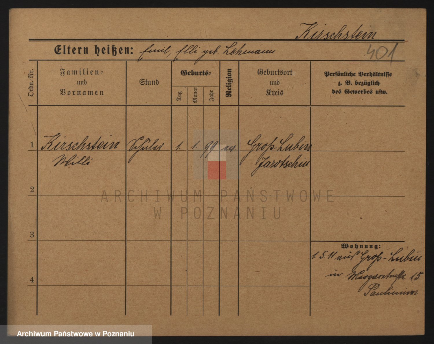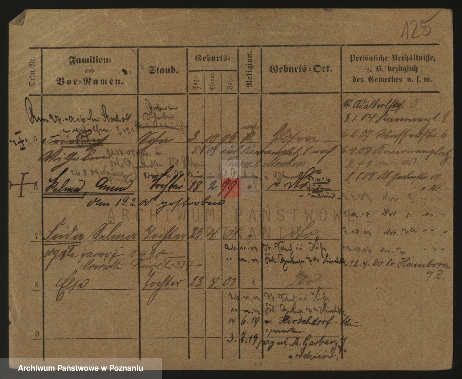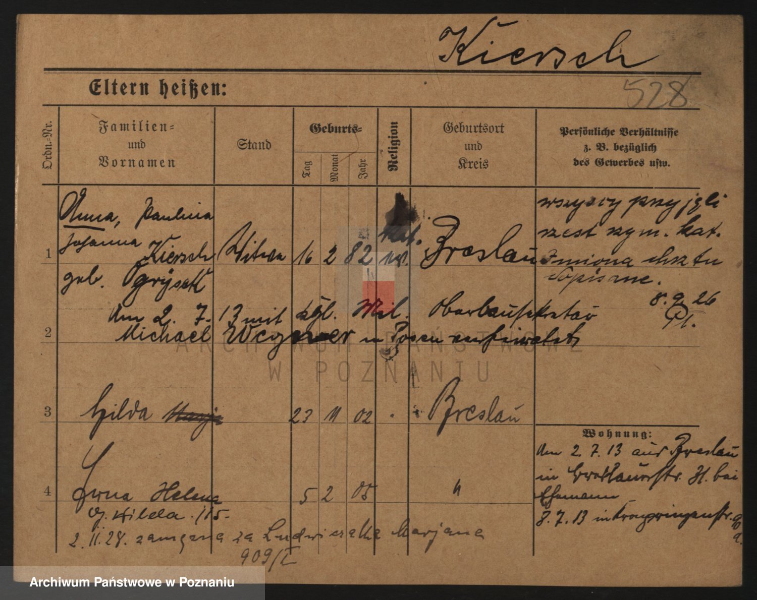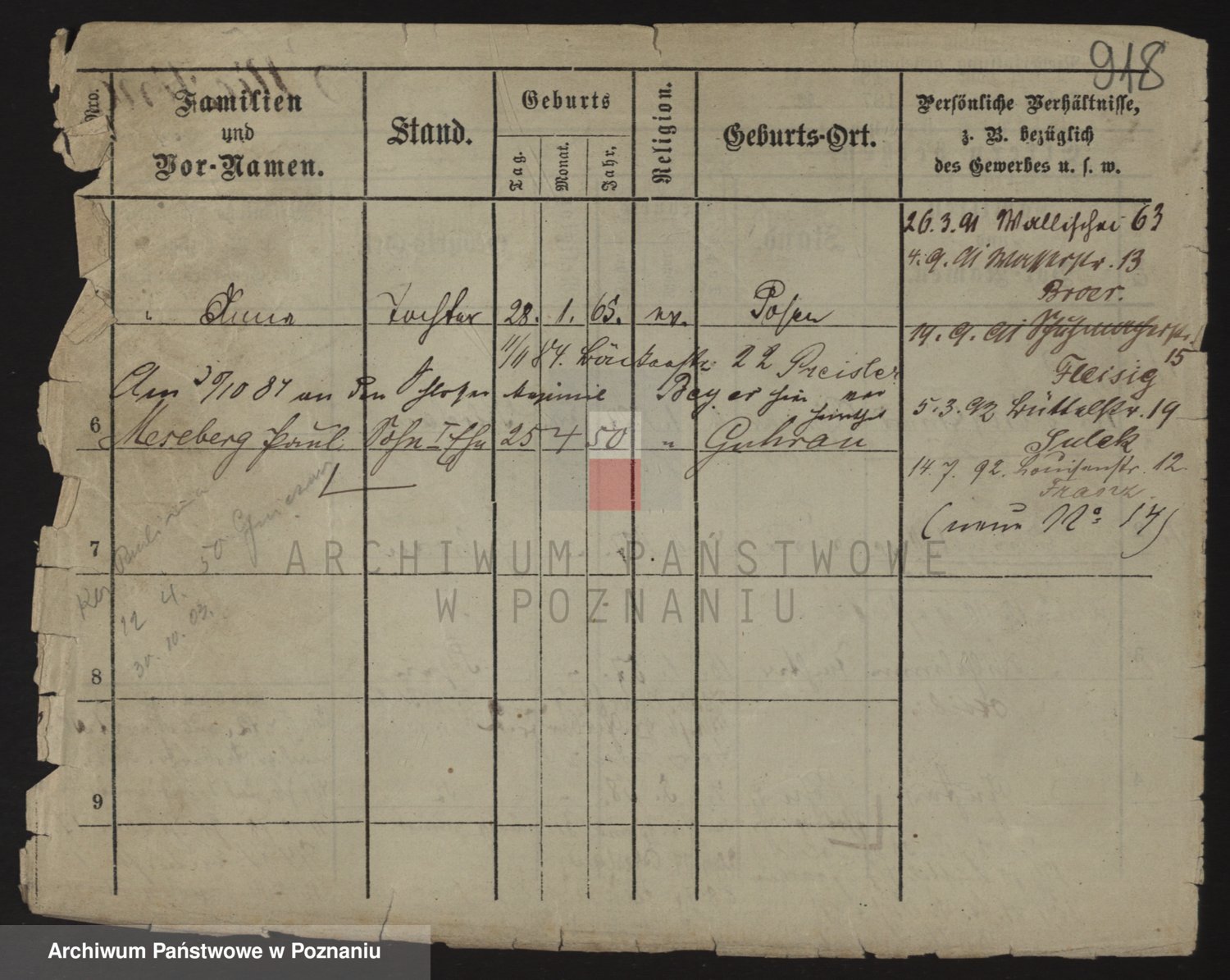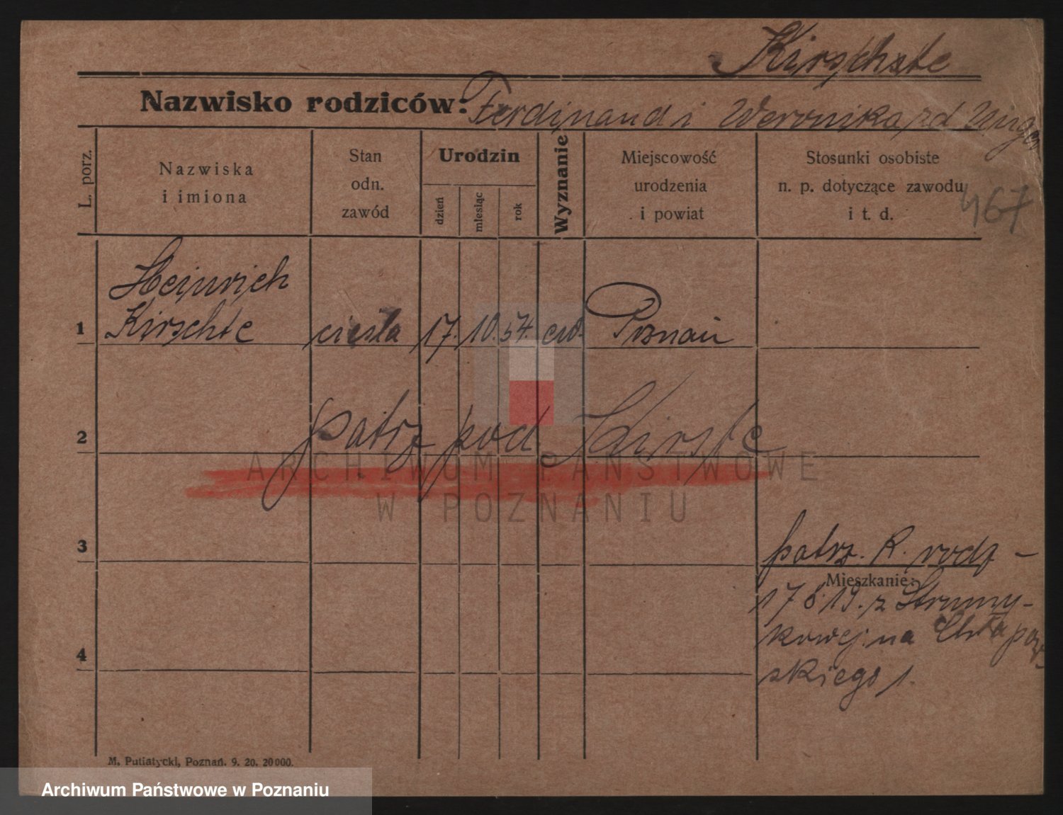 Podgląd karty osobowej dostępny jest po kliknięciu na nazwisko lub ikonkę karty. Można dokonywać powiększenia (ikony na górze) lub przechodzić między kolejnymi skanami (strzałki po bokach).