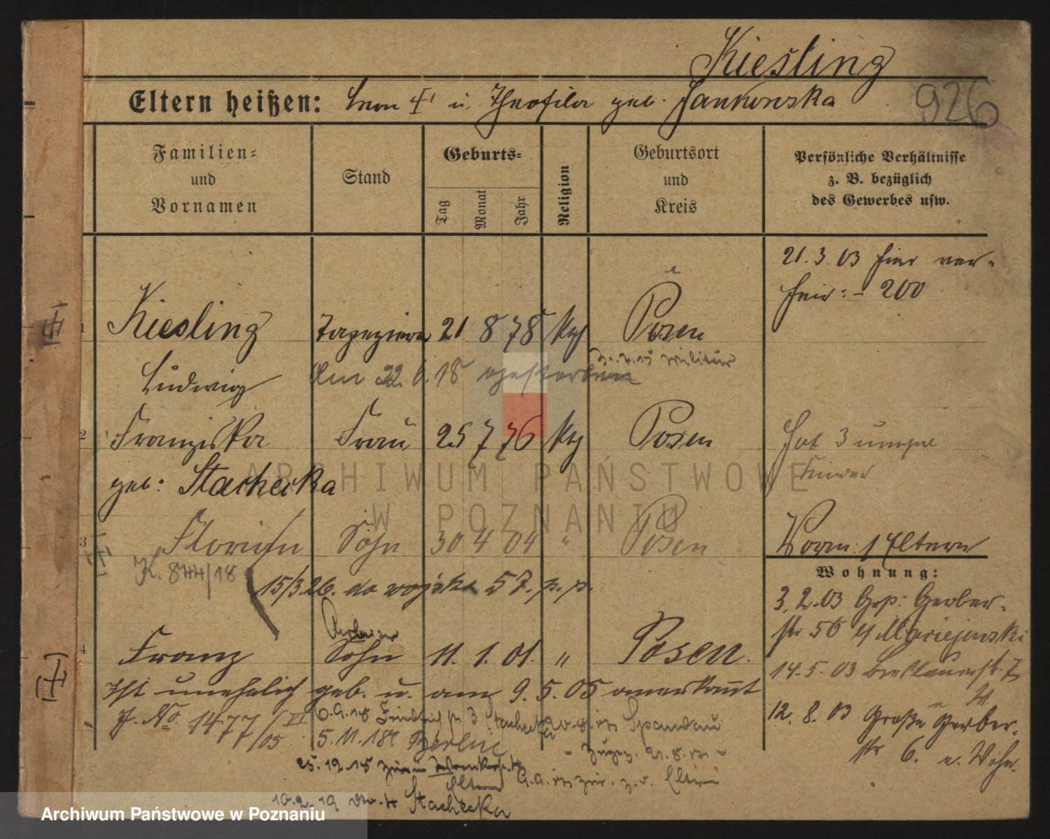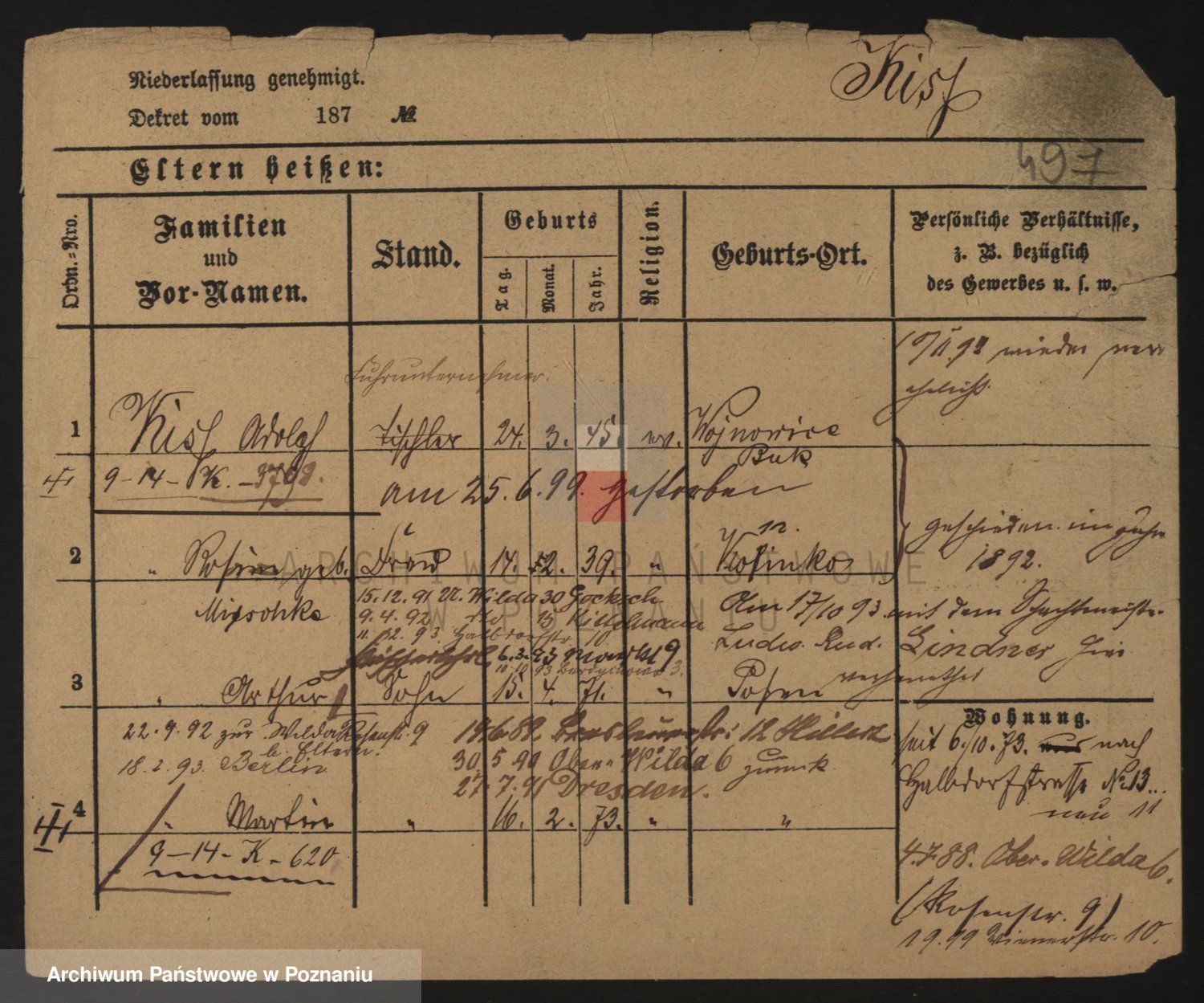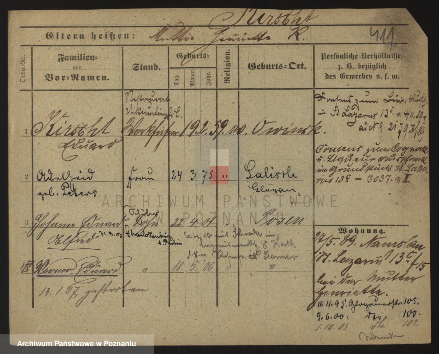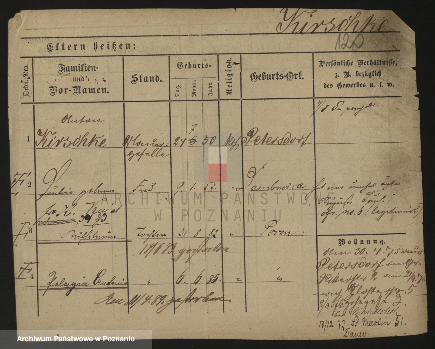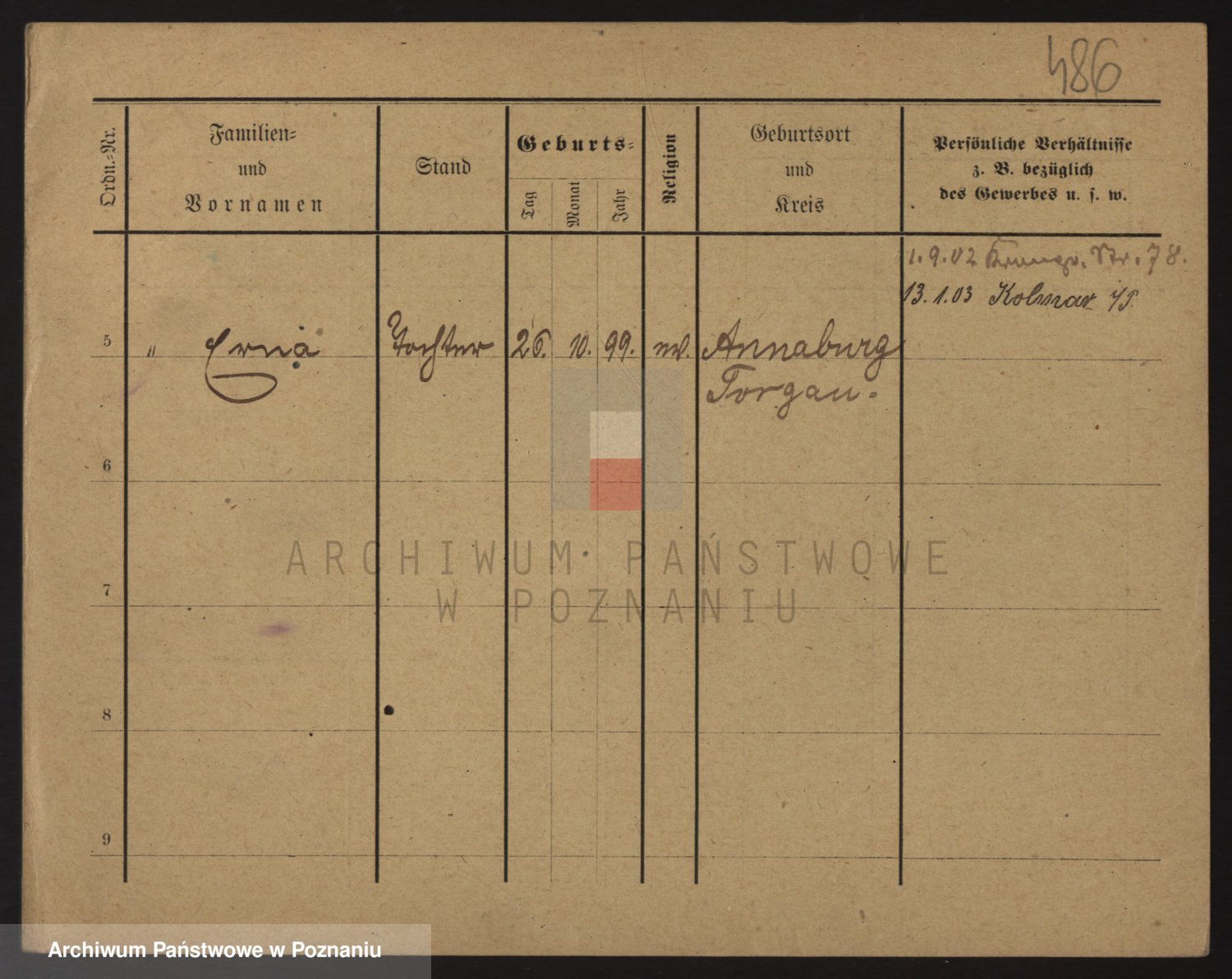 Podgląd karty osobowej dostępny jest po kliknięciu na nazwisko lub ikonkę karty. Można dokonywać powiększenia (ikony na górze) lub przechodzić między kolejnymi skanami (strzałki po bokach).