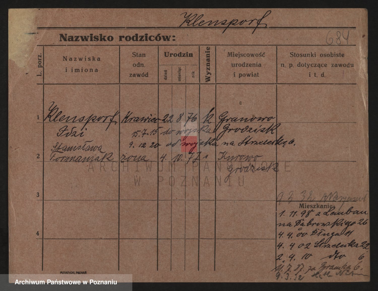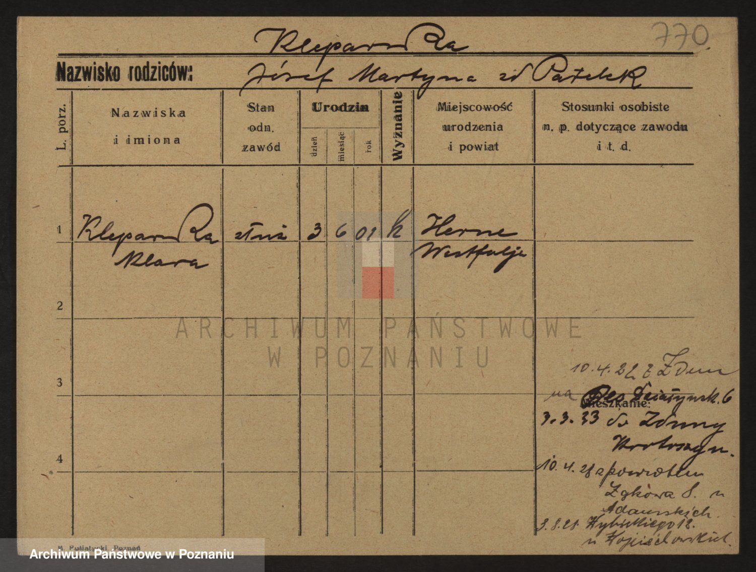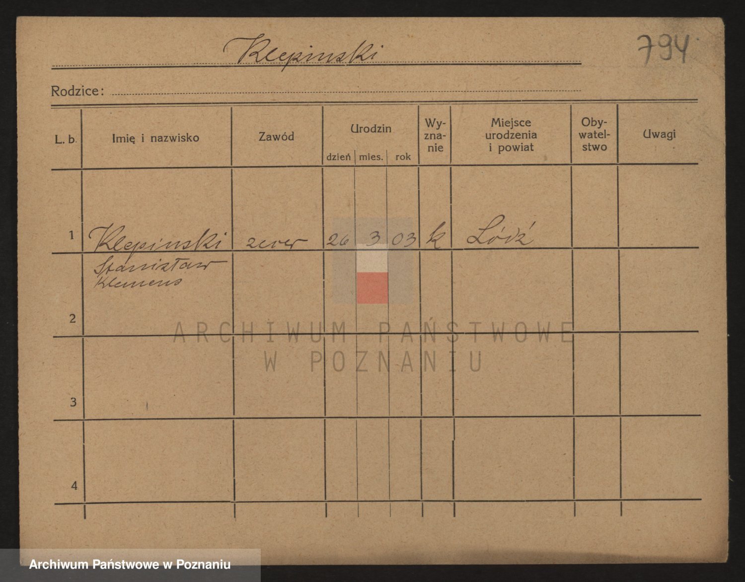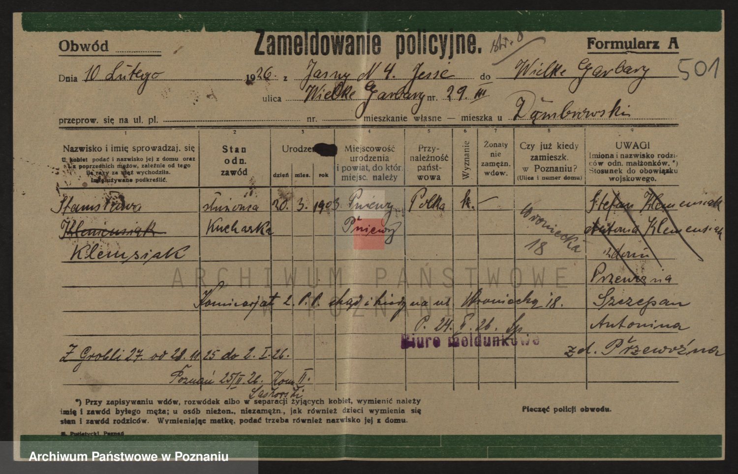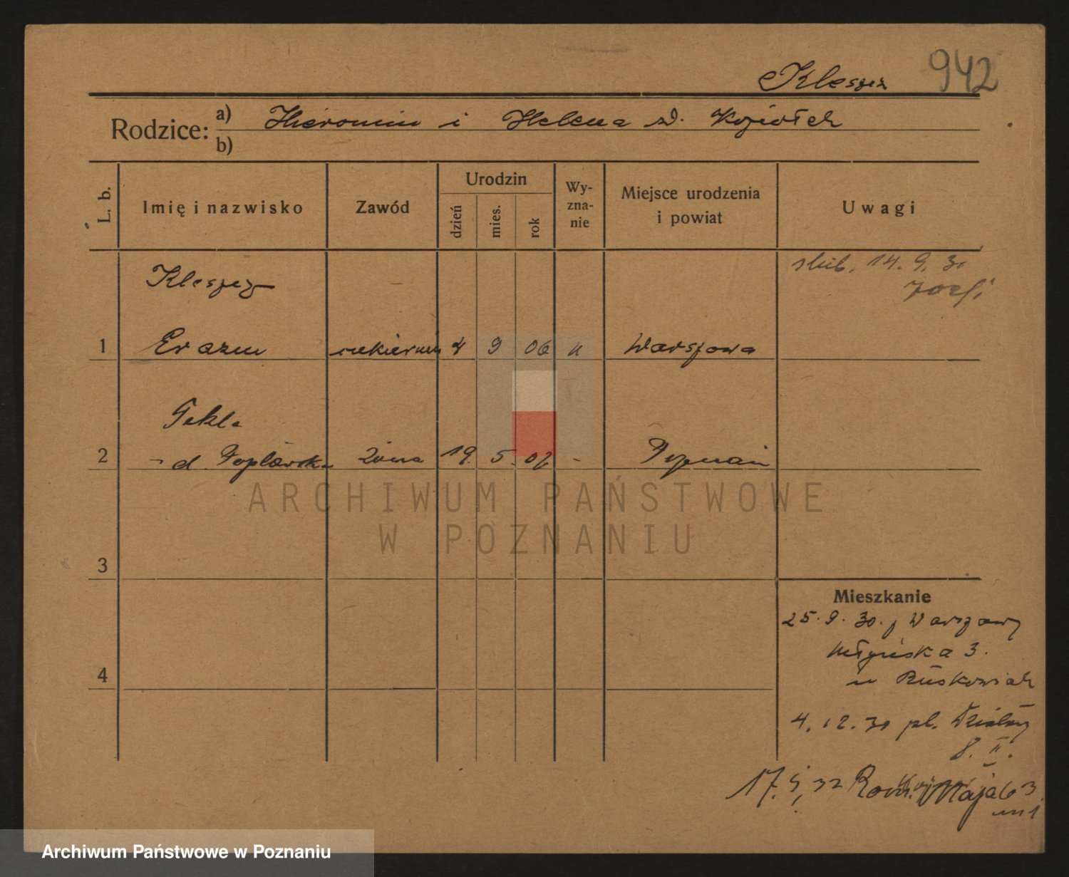Podgląd karty osobowej dostępny jest po kliknięciu na nazwisko lub ikonkę karty. Można dokonywać powiększenia (ikony na górze) lub przechodzić między kolejnymi skanami (strzałki po bokach).