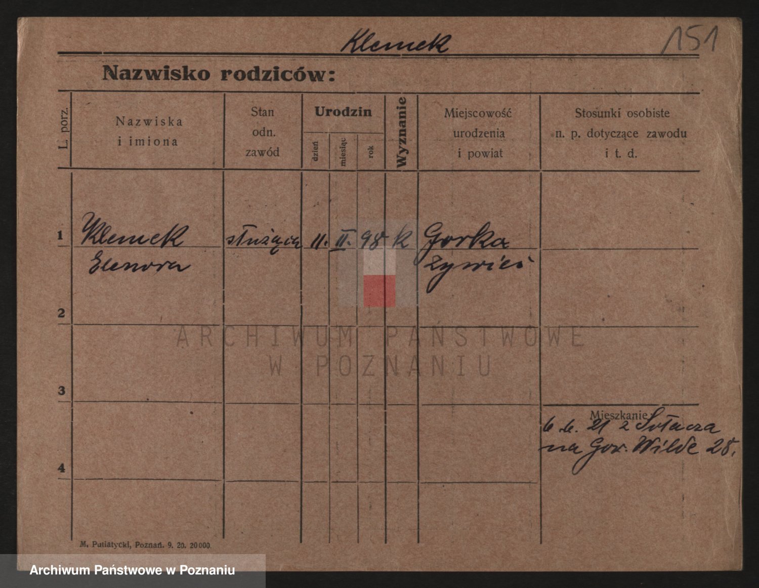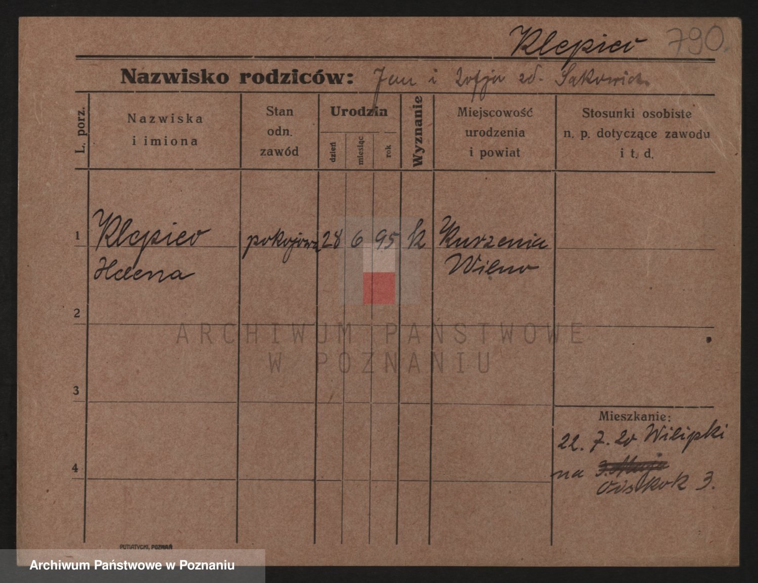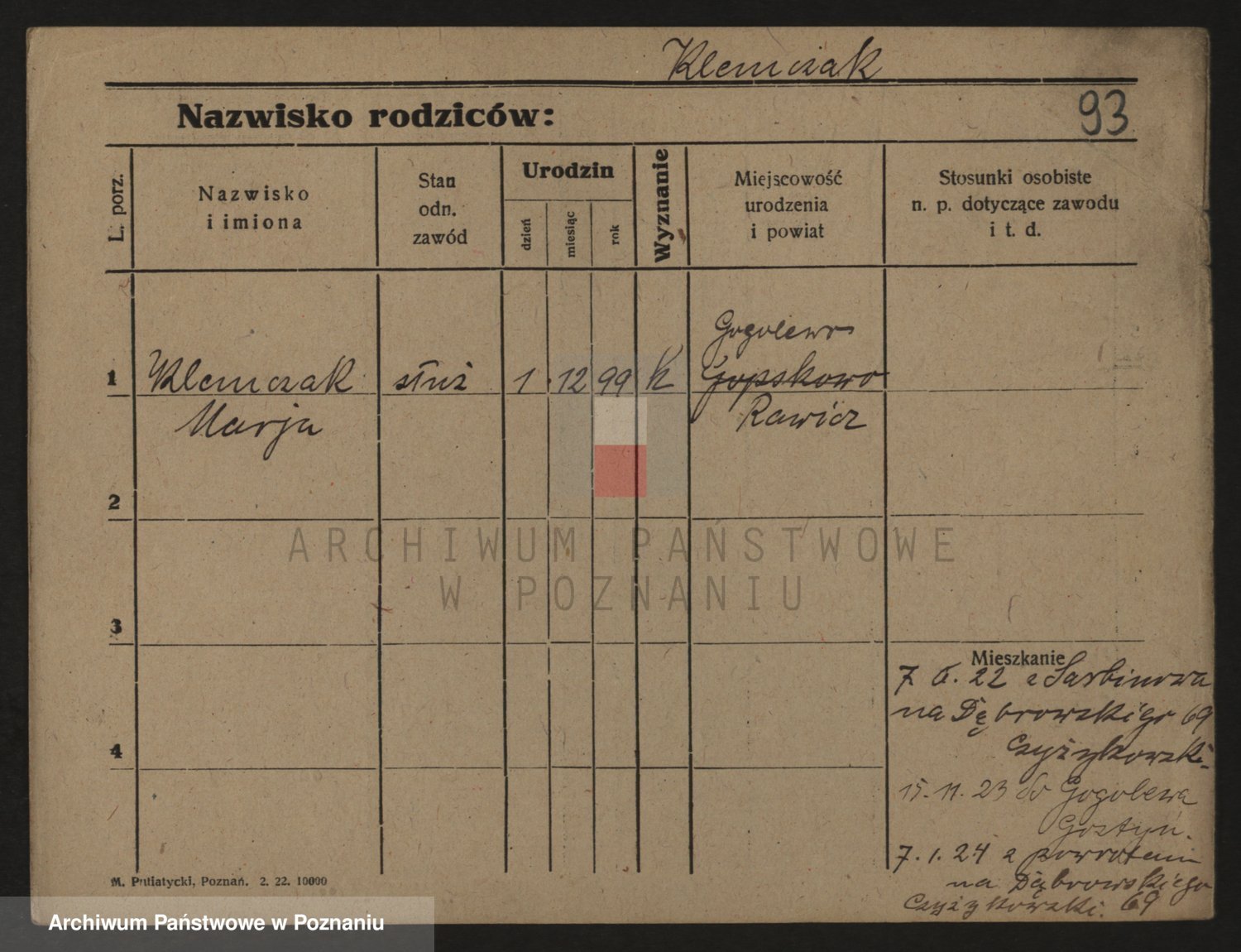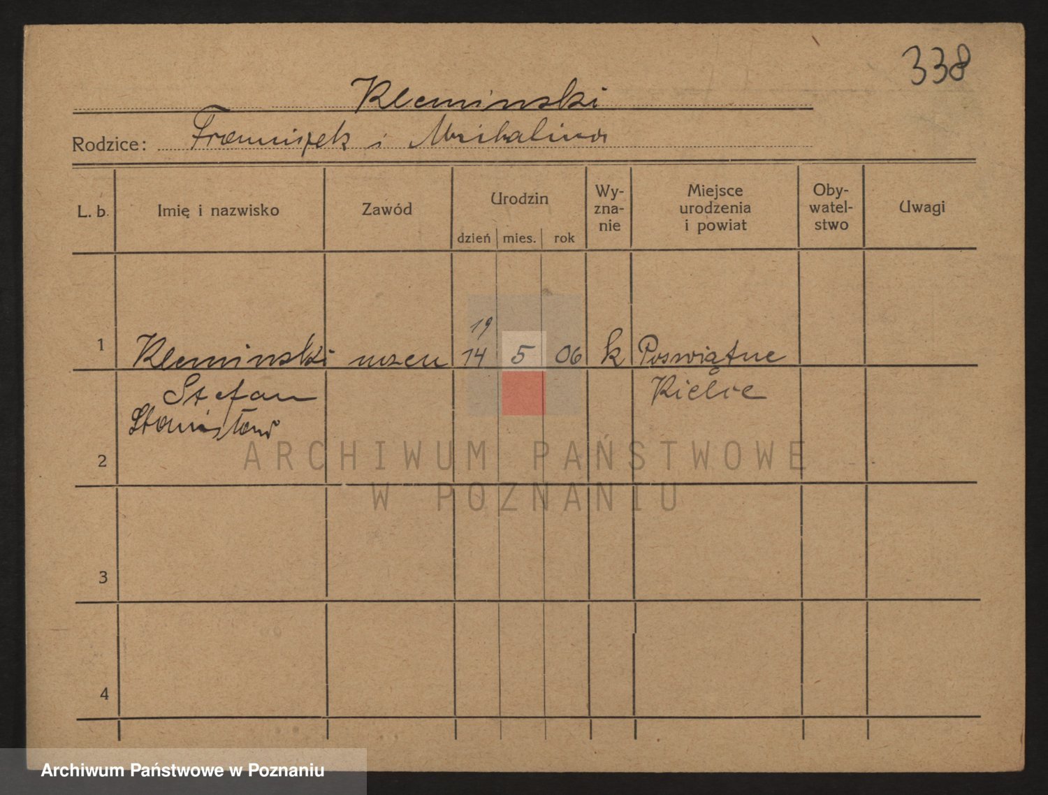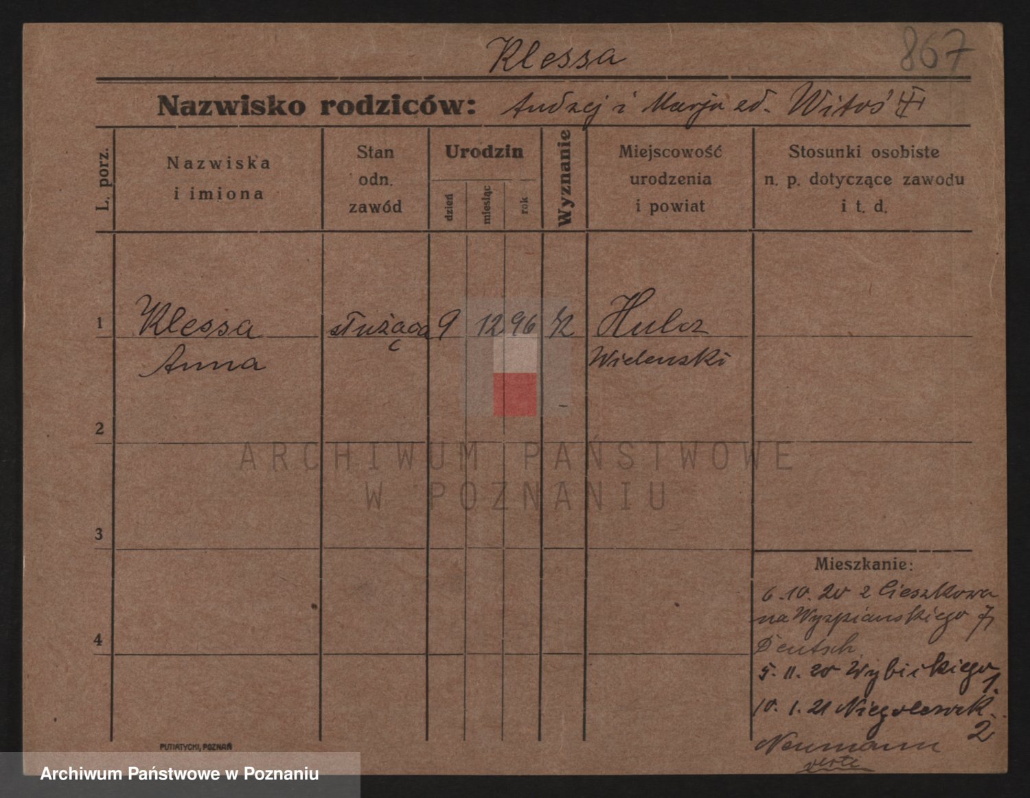 Podgląd karty osobowej dostępny jest po kliknięciu na nazwisko lub ikonkę karty. Można dokonywać powiększenia (ikony na górze) lub przechodzić między kolejnymi skanami (strzałki po bokach).