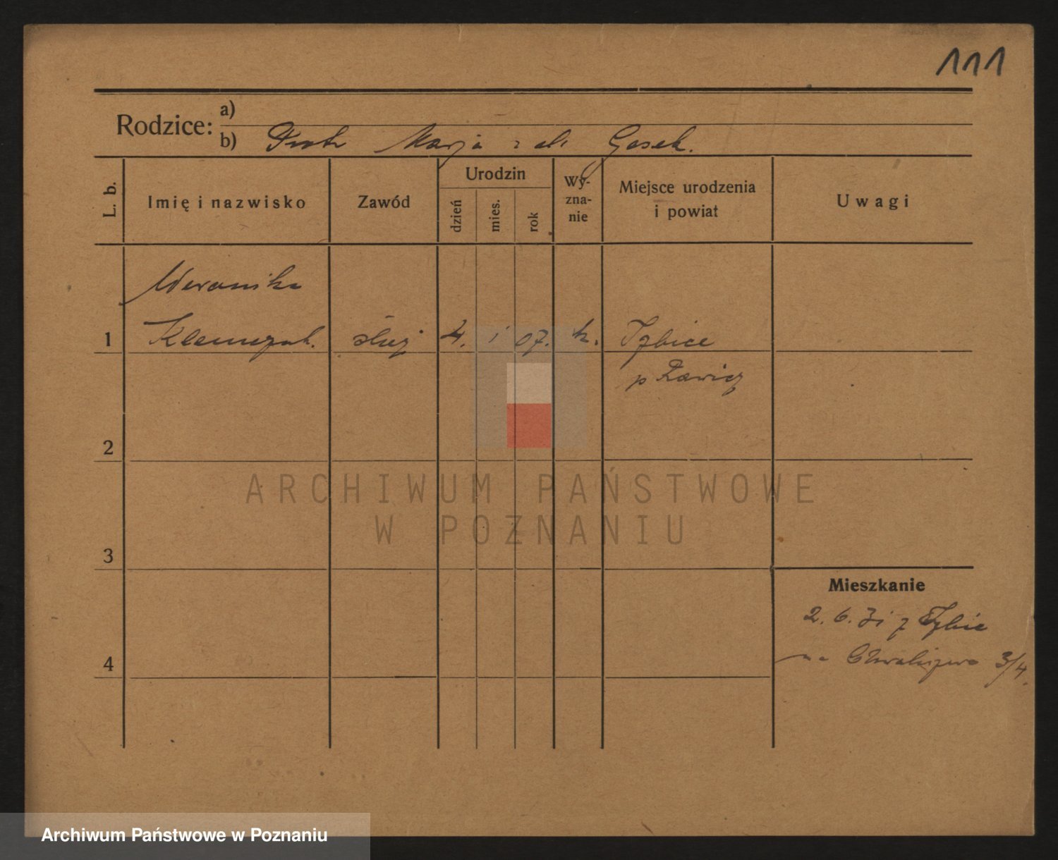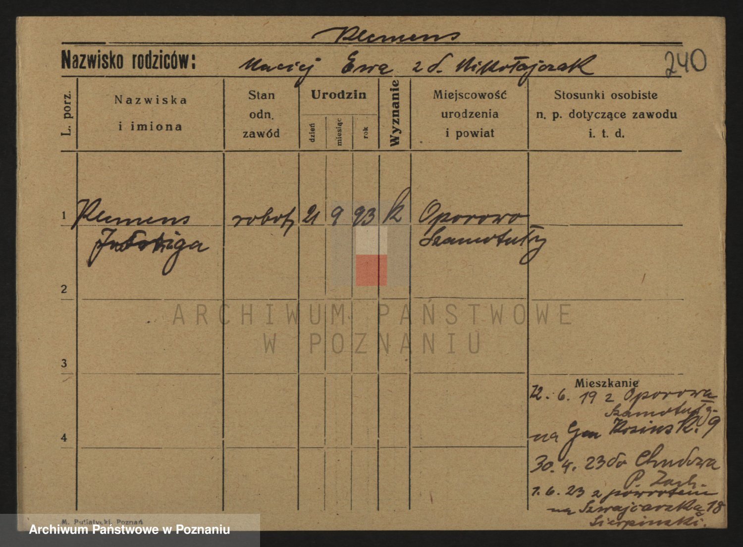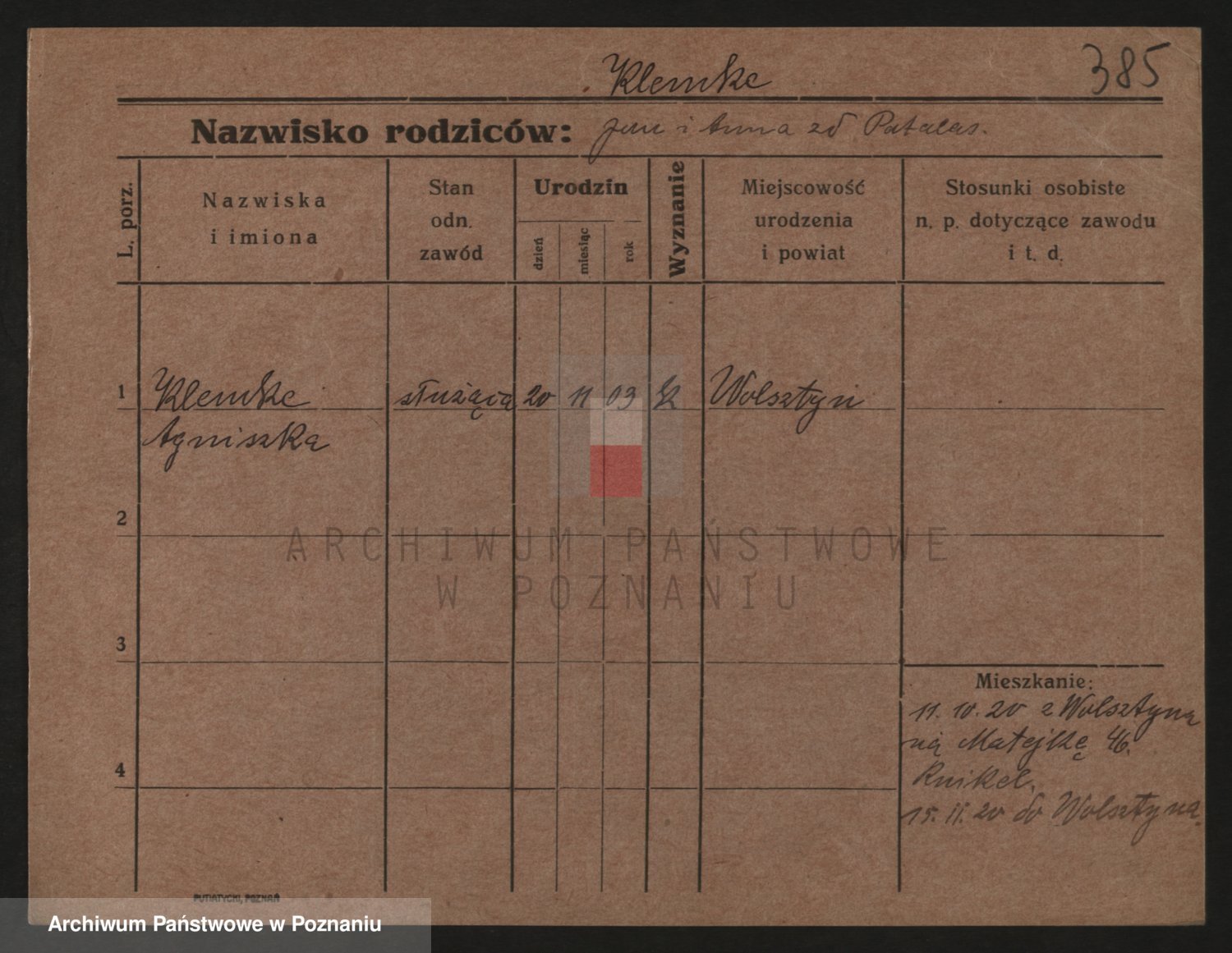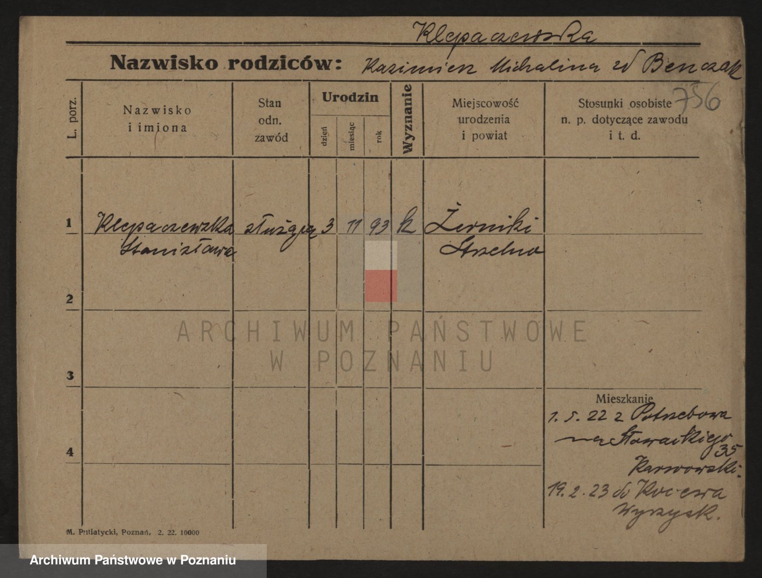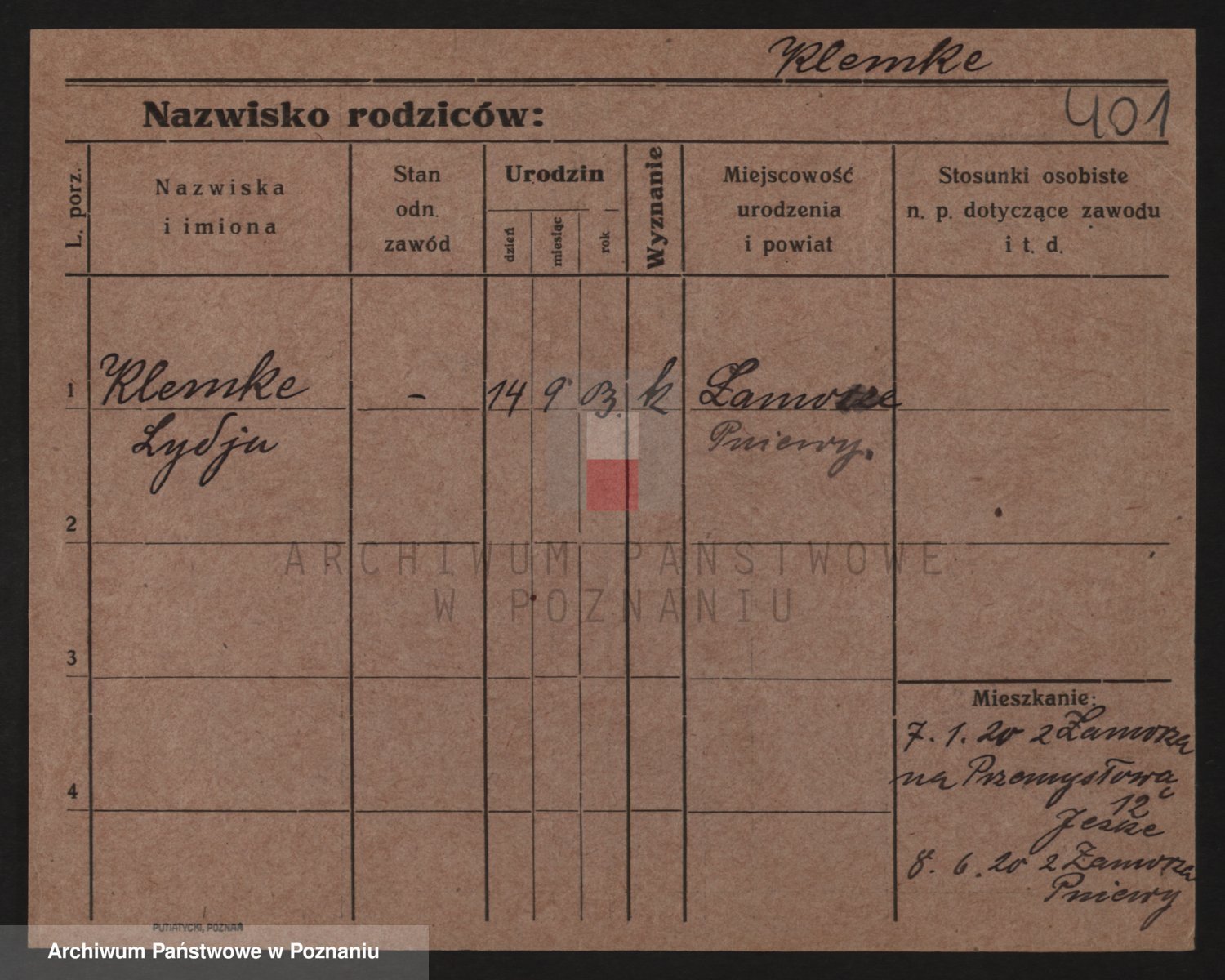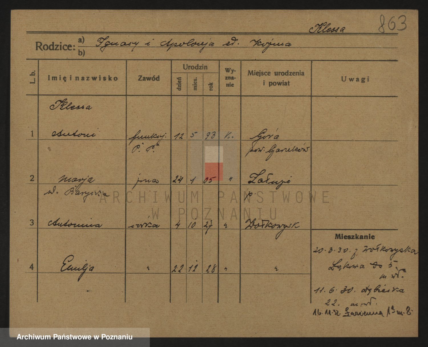 Podgląd karty osobowej dostępny jest po kliknięciu na nazwisko lub ikonkę karty. Można dokonywać powiększenia (ikony na górze) lub przechodzić między kolejnymi skanami (strzałki po bokach).