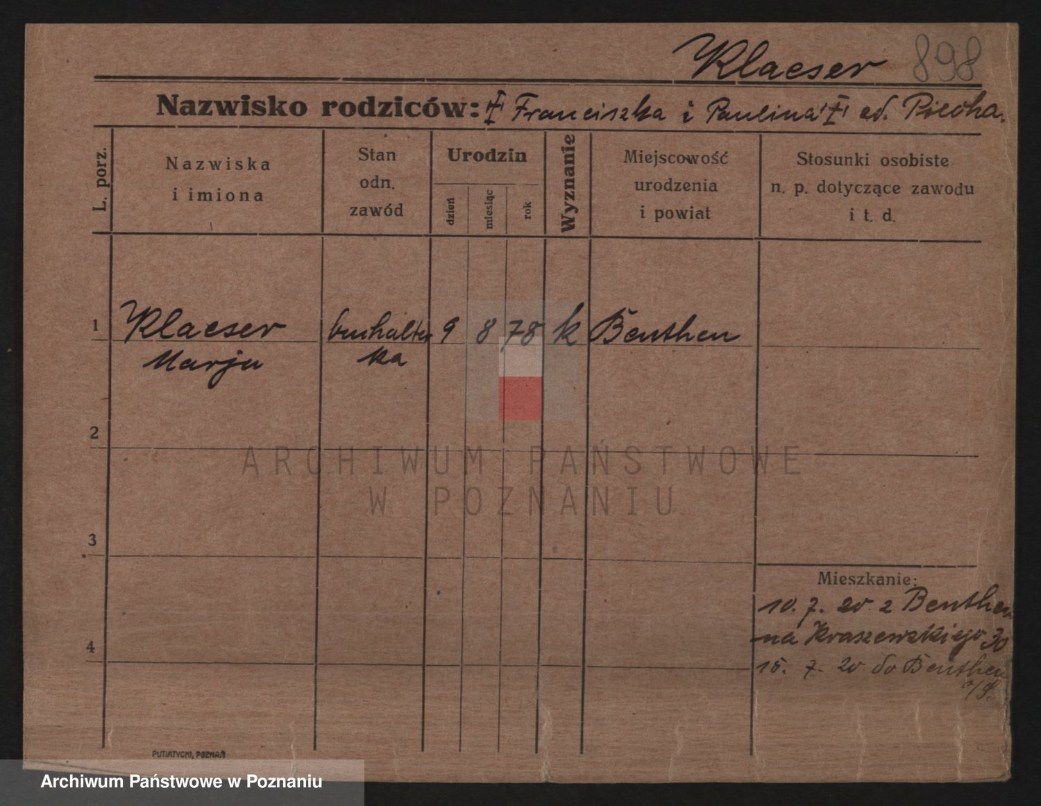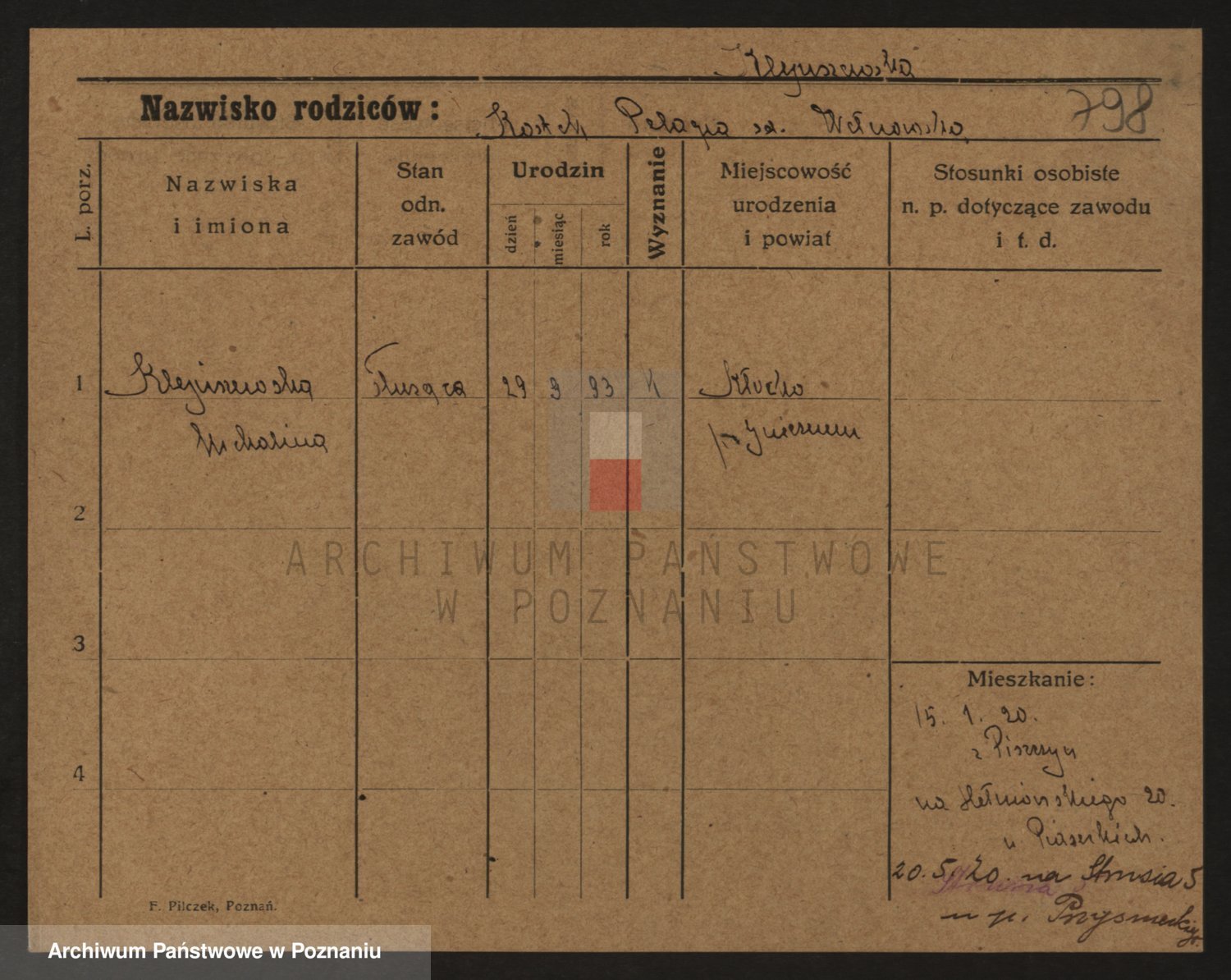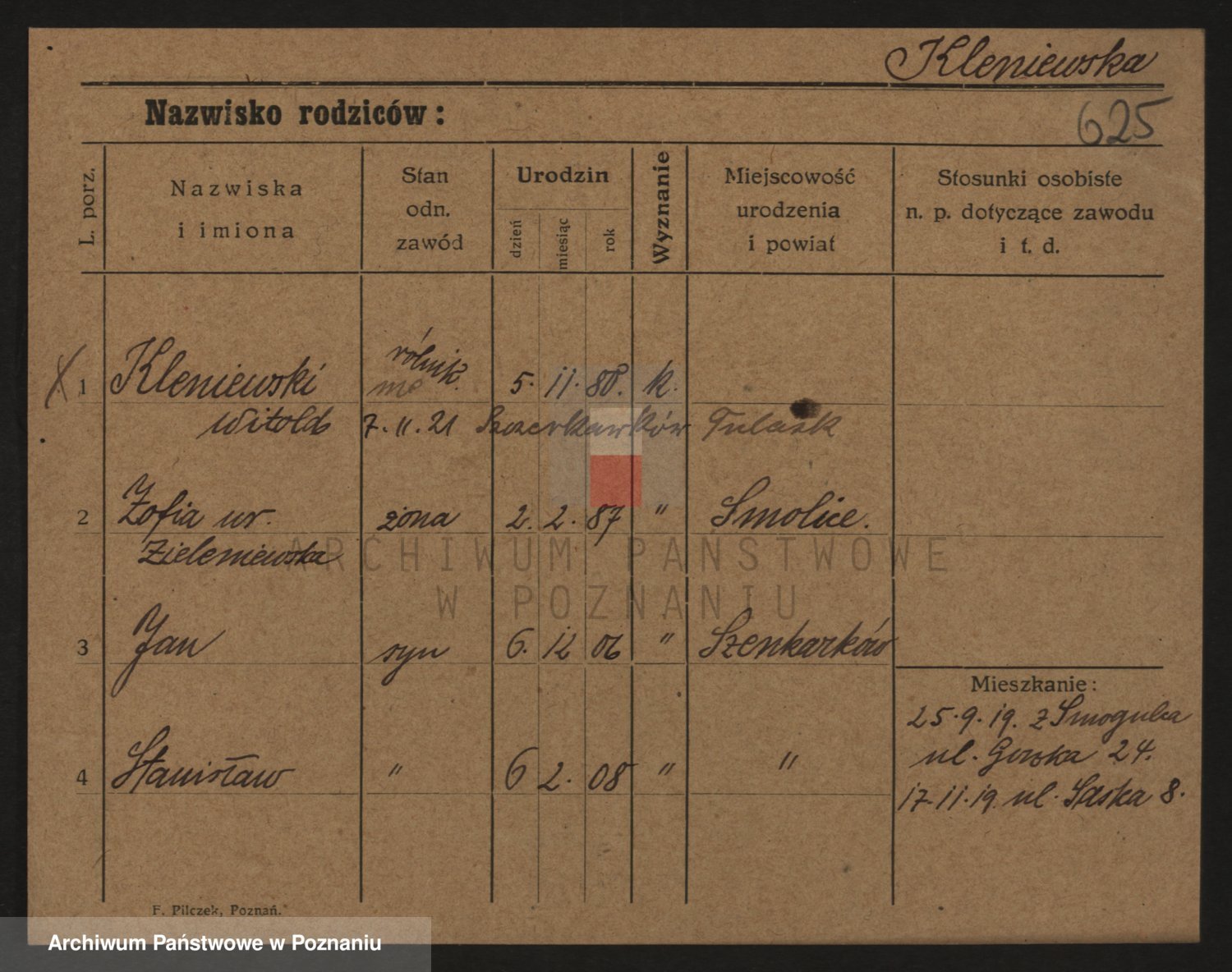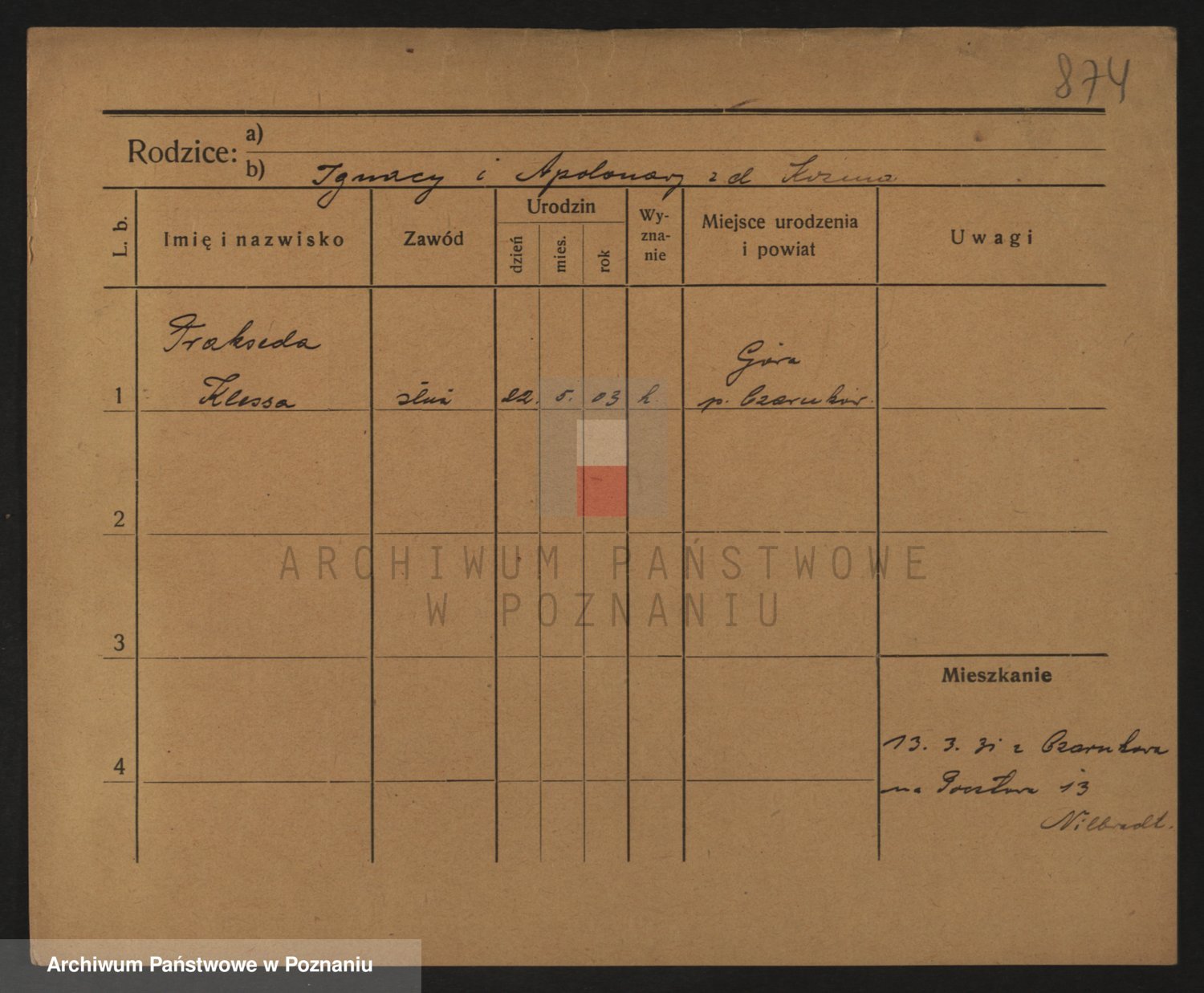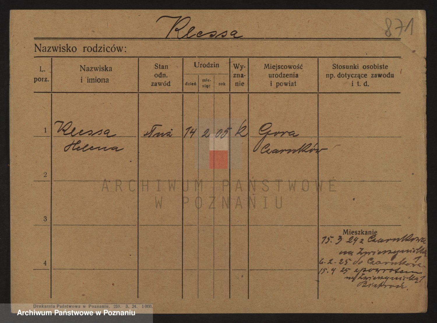 Podgląd karty osobowej dostępny jest po kliknięciu na nazwisko lub ikonkę karty. Można dokonywać powiększenia (ikony na górze) lub przechodzić między kolejnymi skanami (strzałki po bokach).
