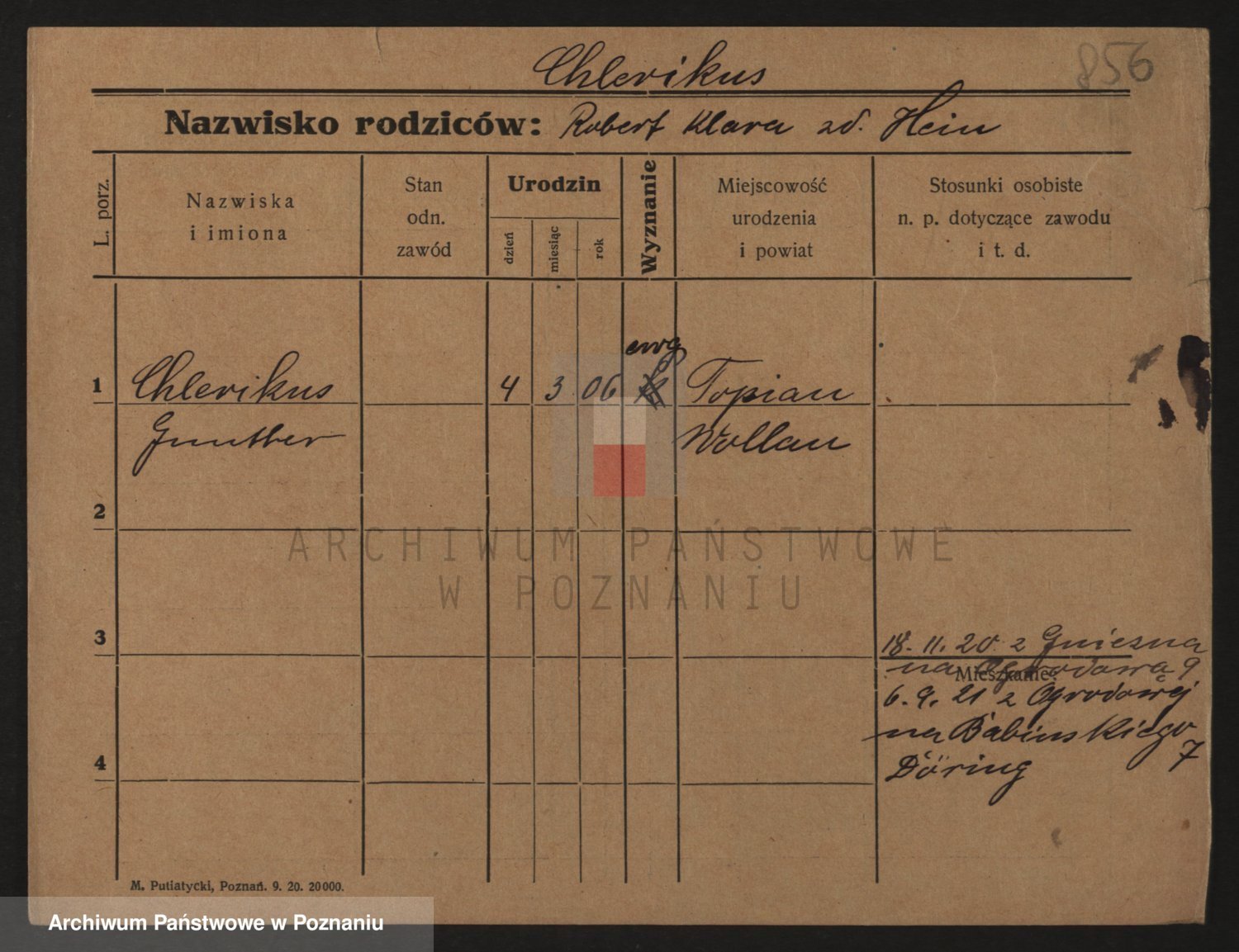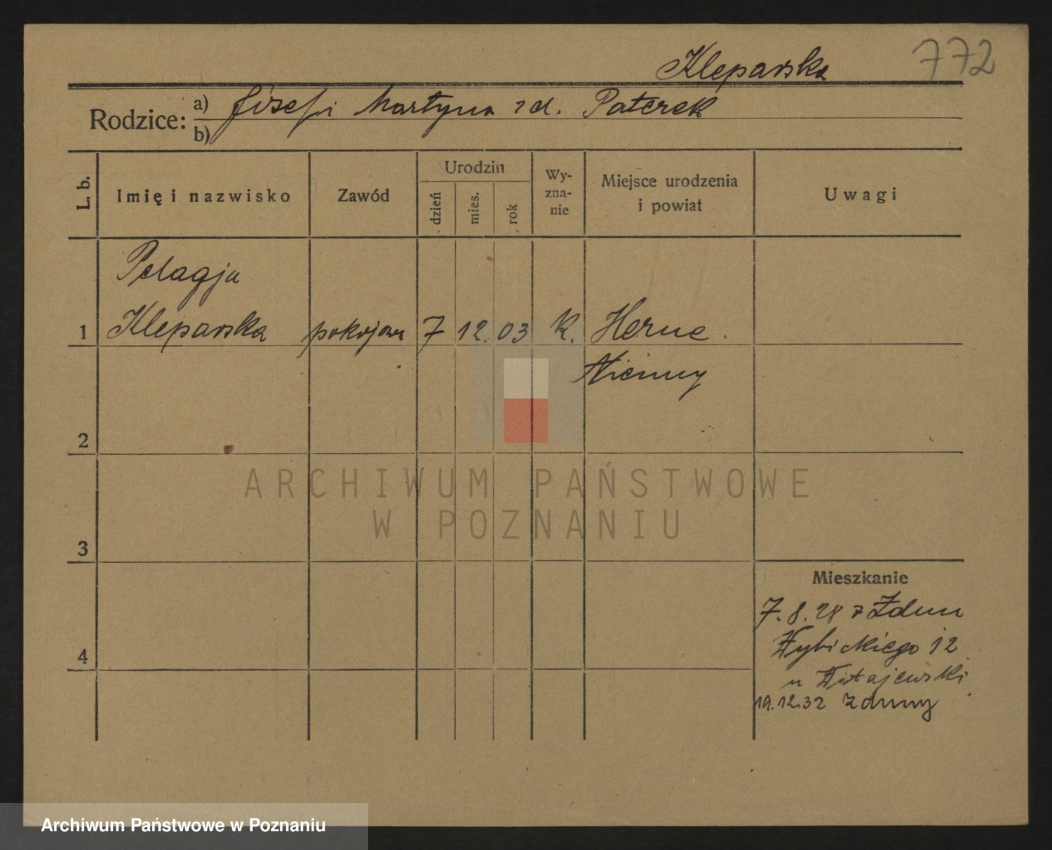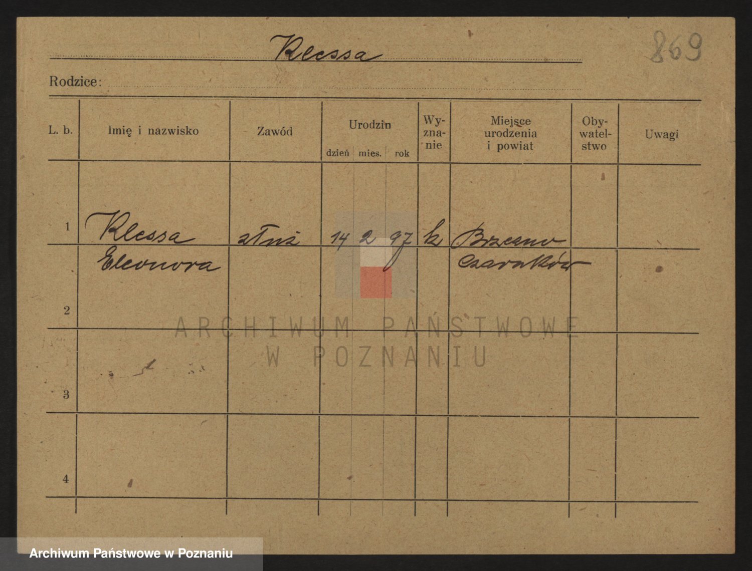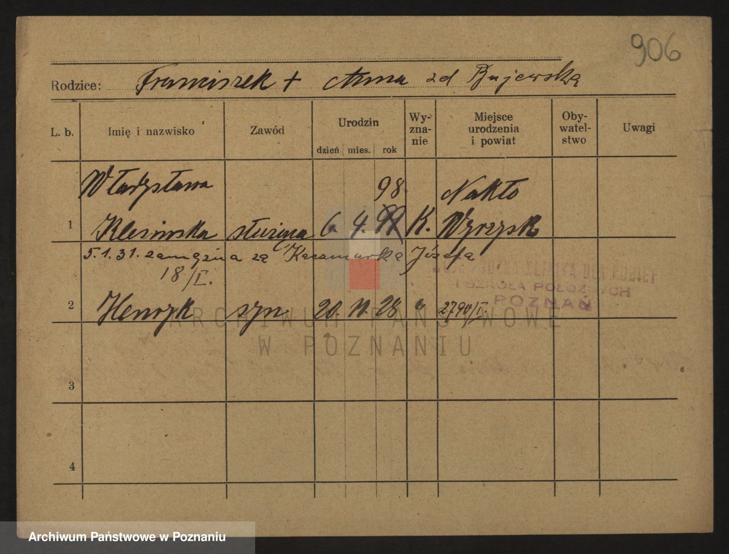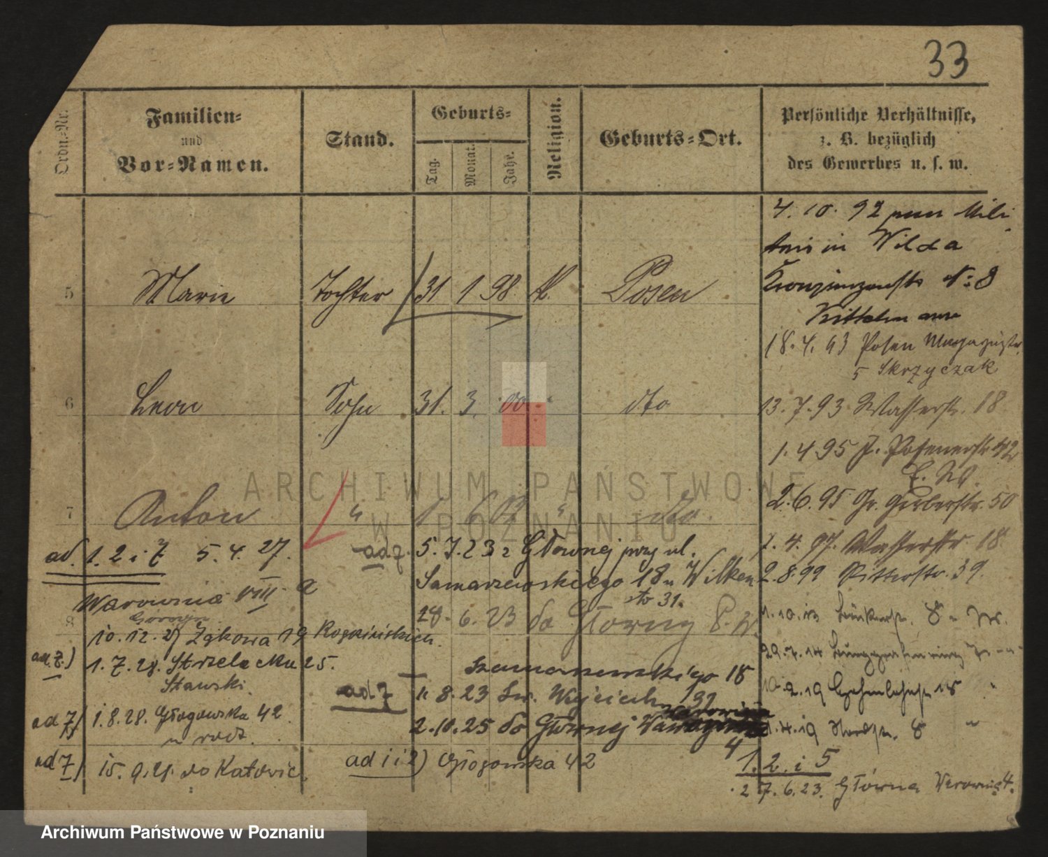 Podgląd karty osobowej dostępny jest po kliknięciu na nazwisko lub ikonkę karty. Można dokonywać powiększenia (ikony na górze) lub przechodzić między kolejnymi skanami (strzałki po bokach).