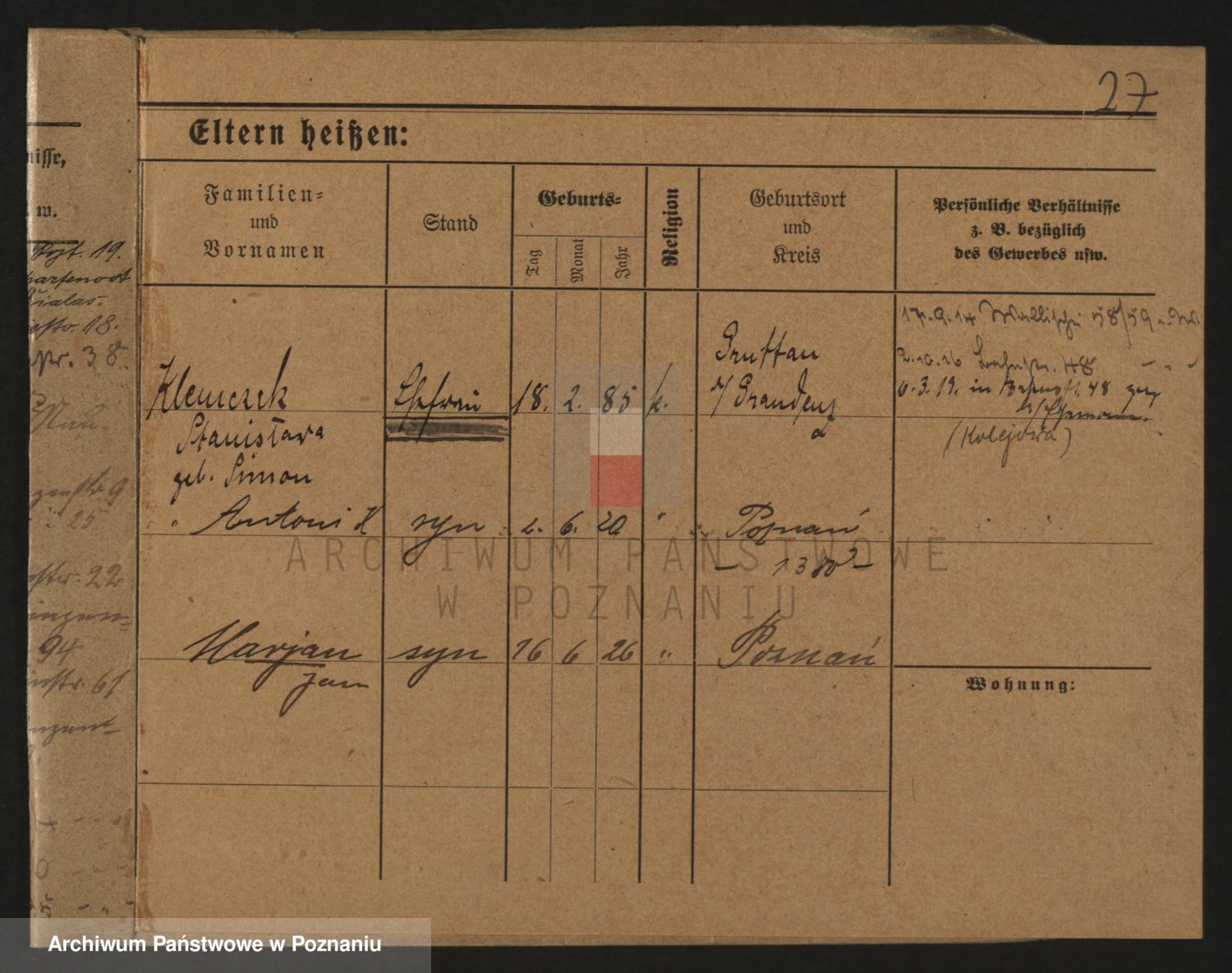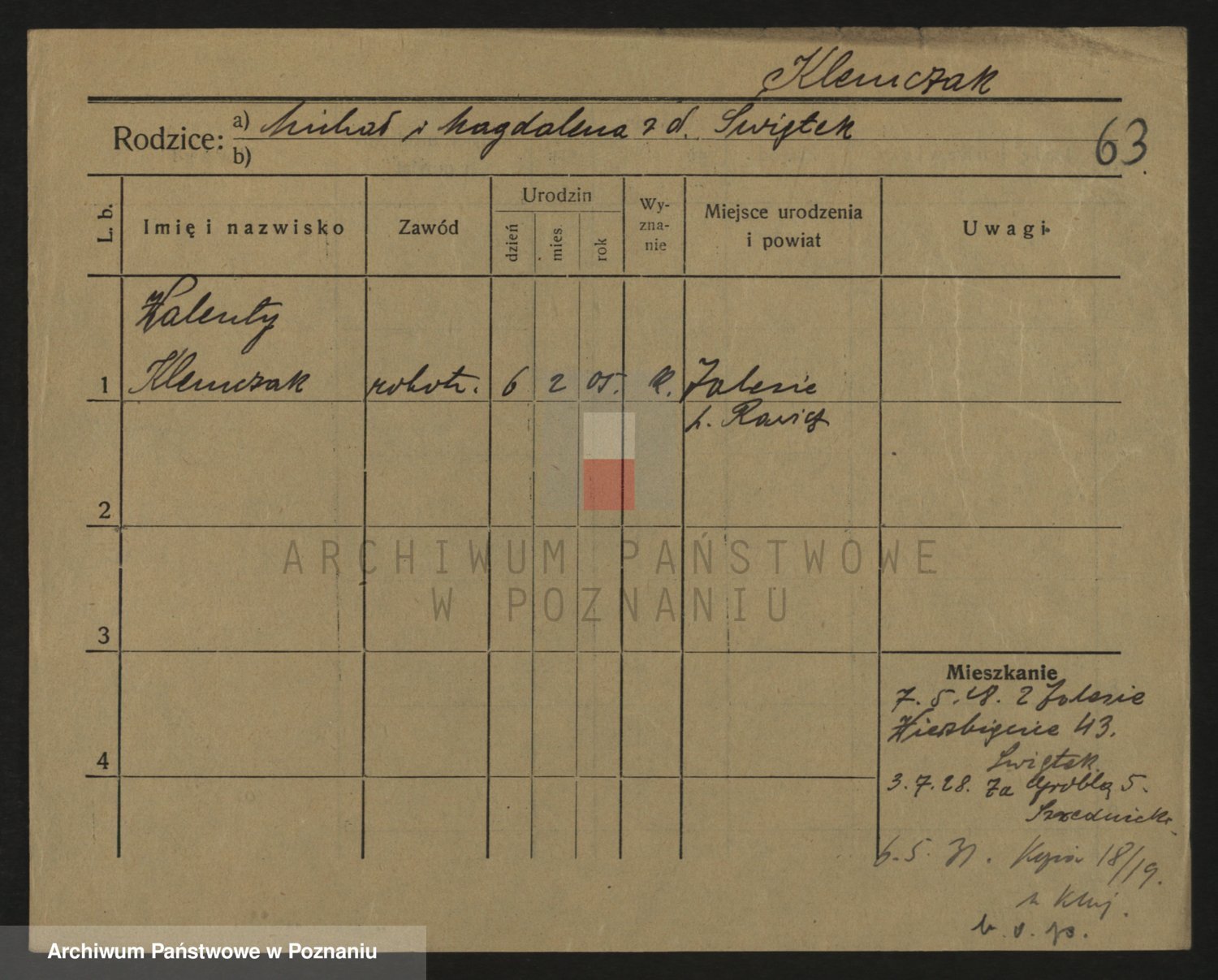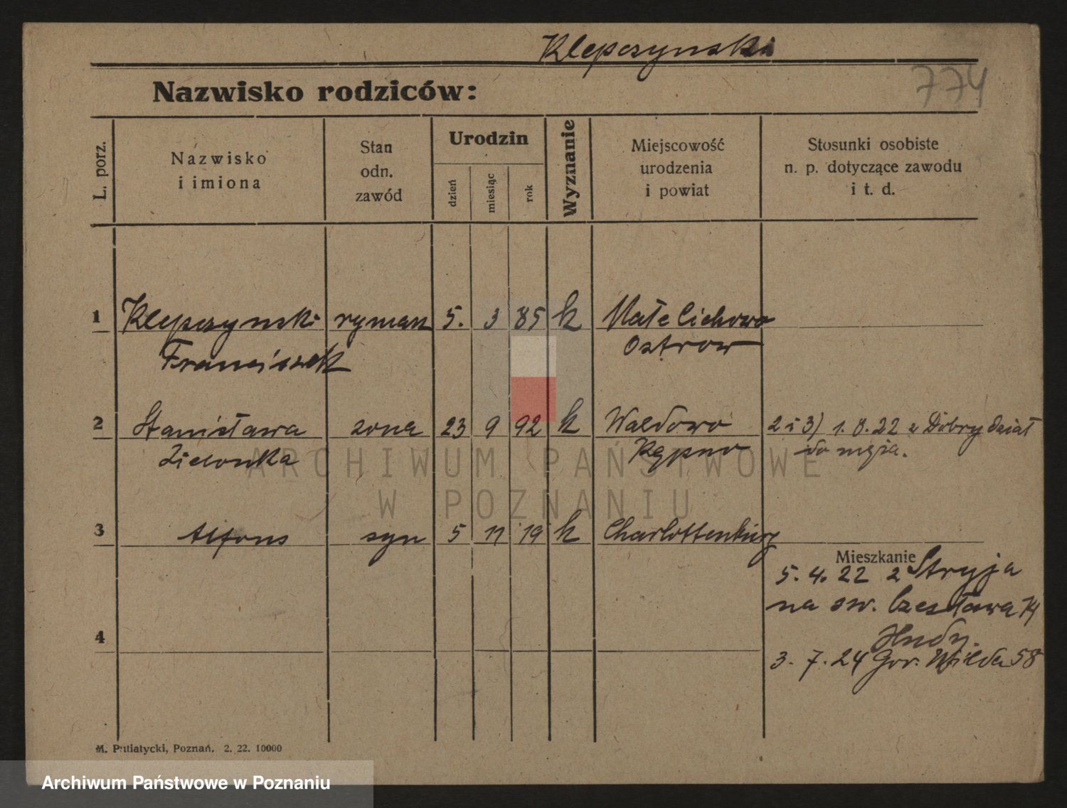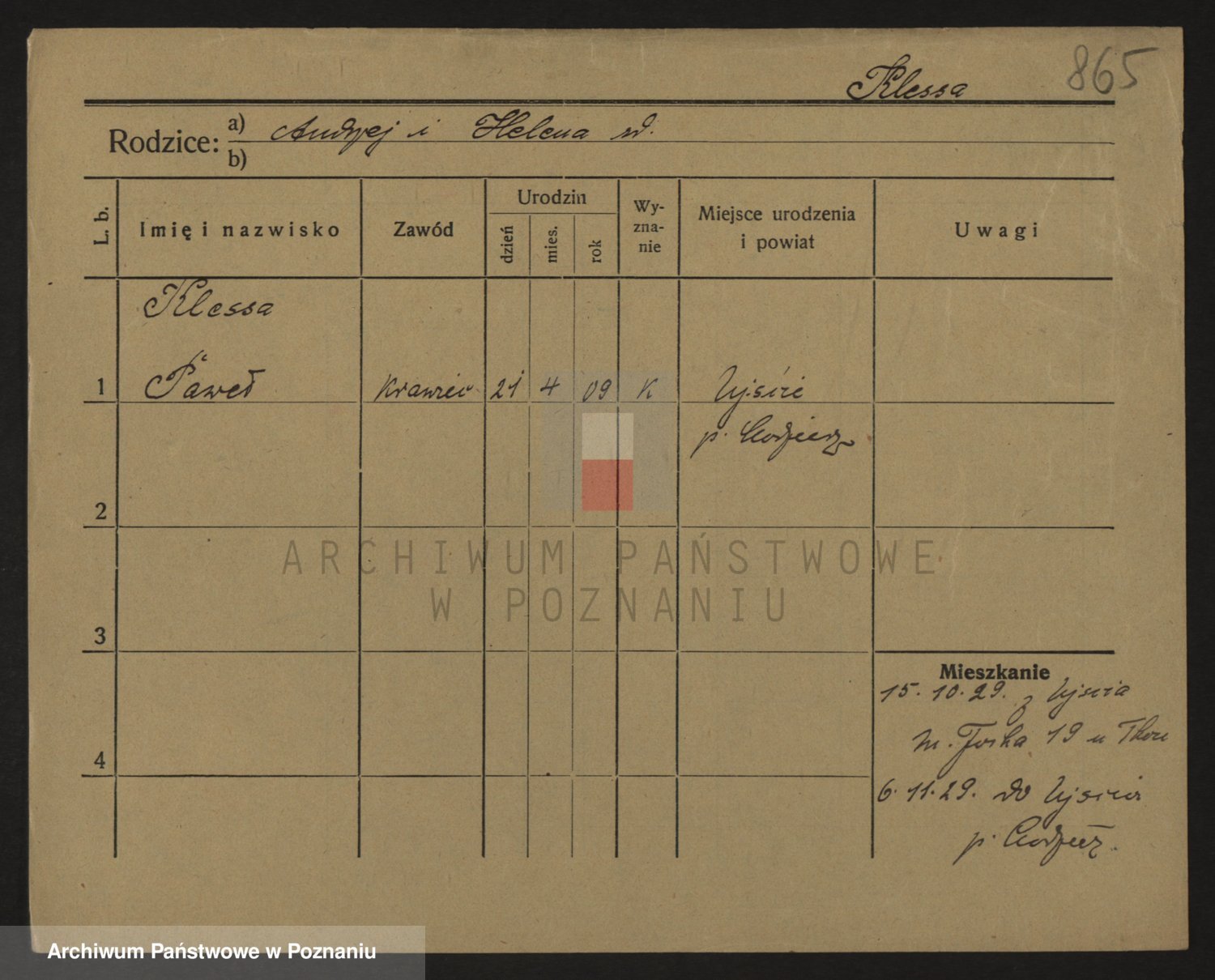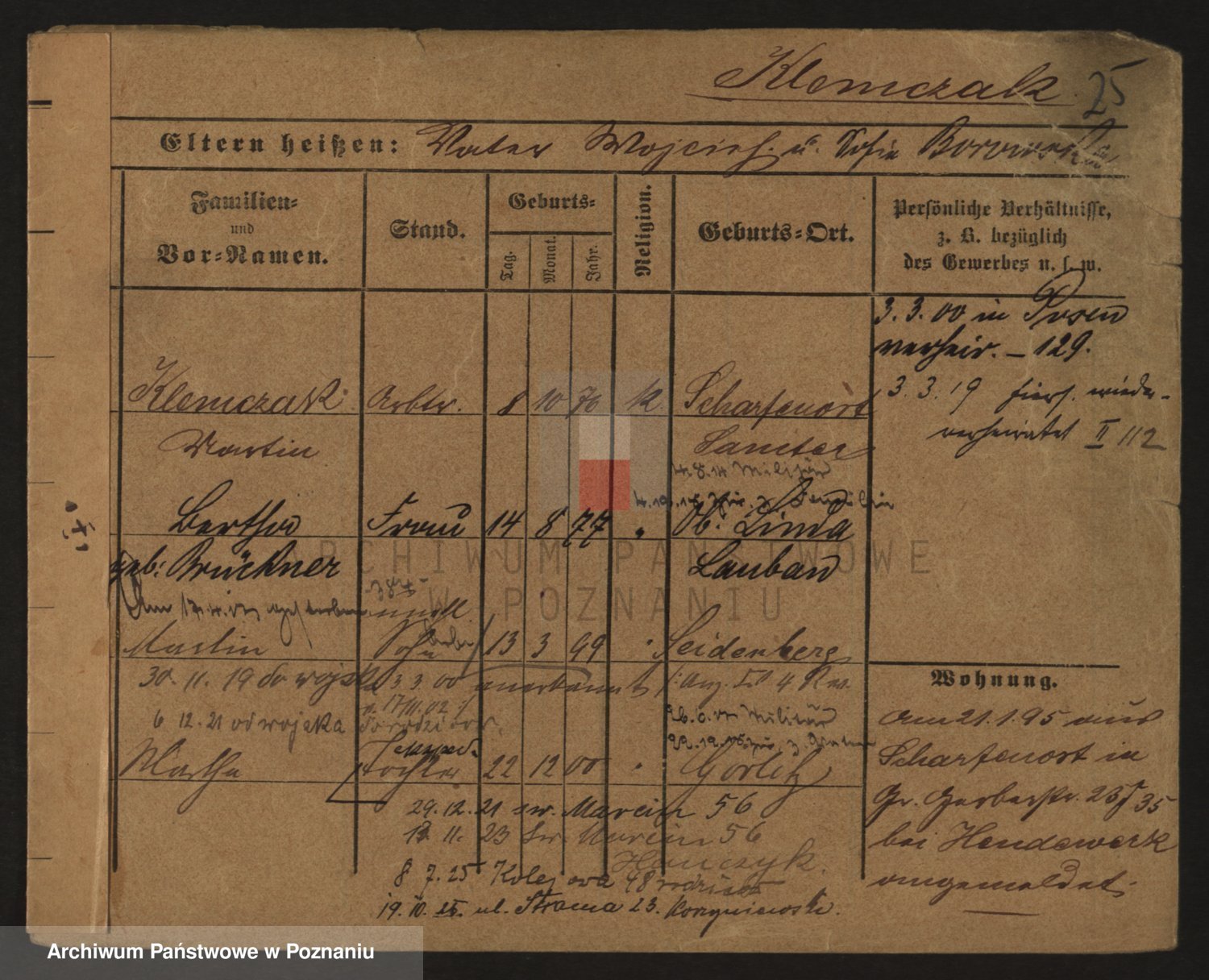 Podgląd karty osobowej dostępny jest po kliknięciu na nazwisko lub ikonkę karty. Można dokonywać powiększenia (ikony na górze) lub przechodzić między kolejnymi skanami (strzałki po bokach).