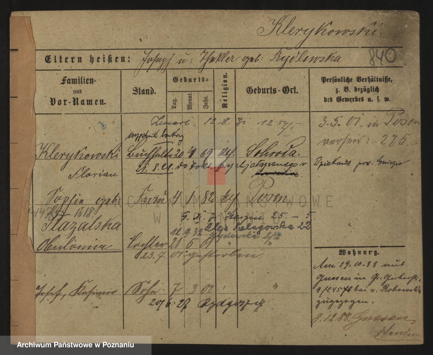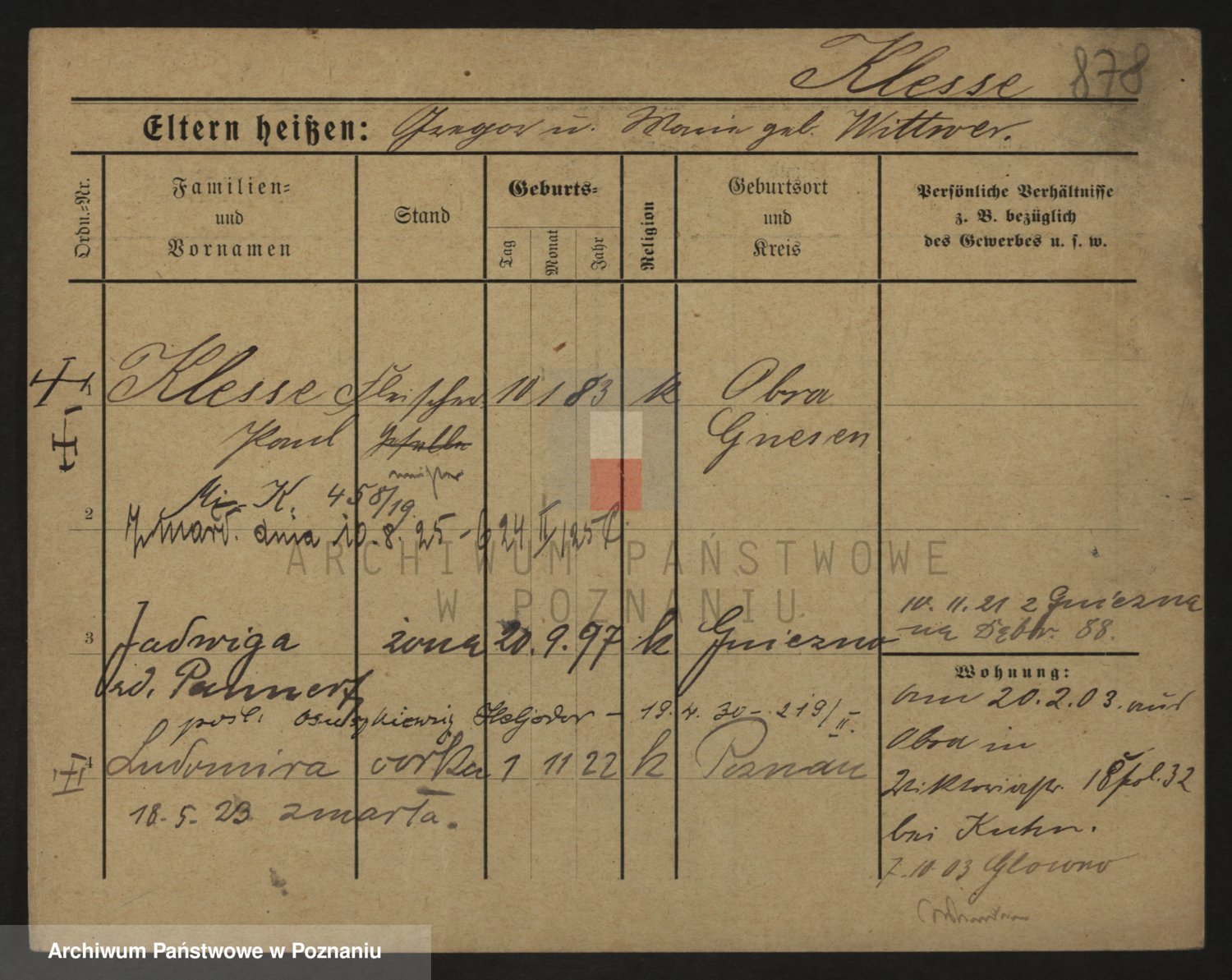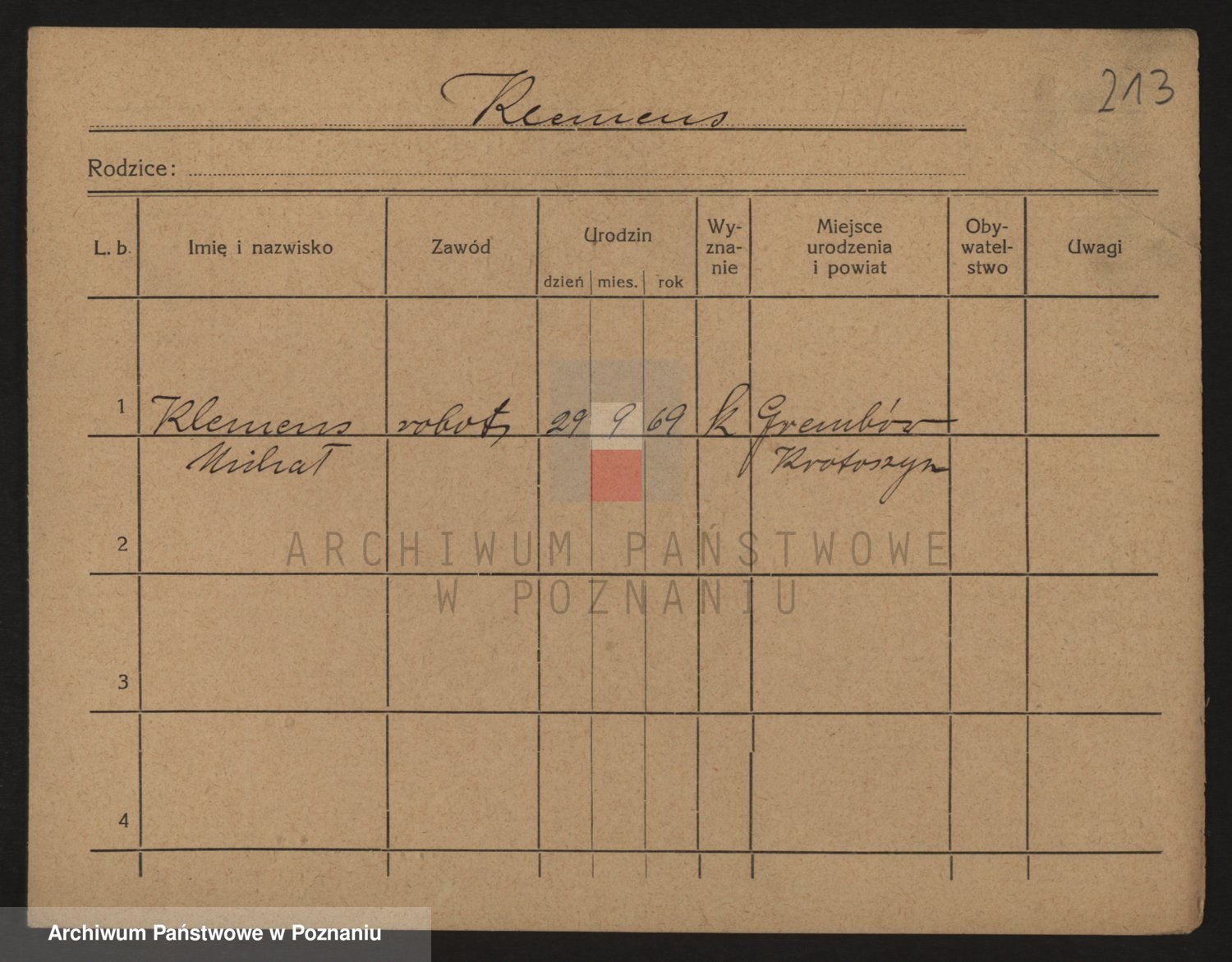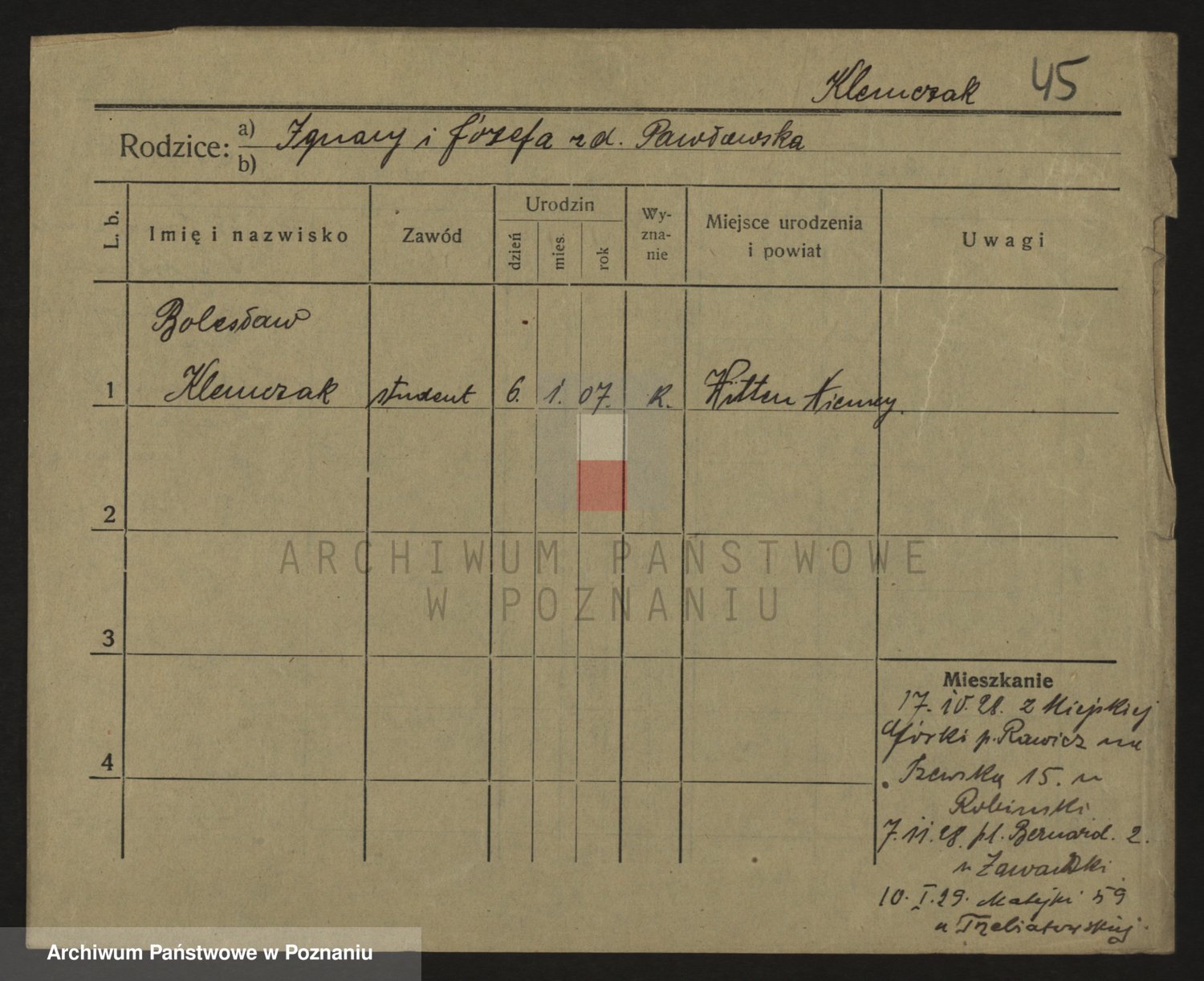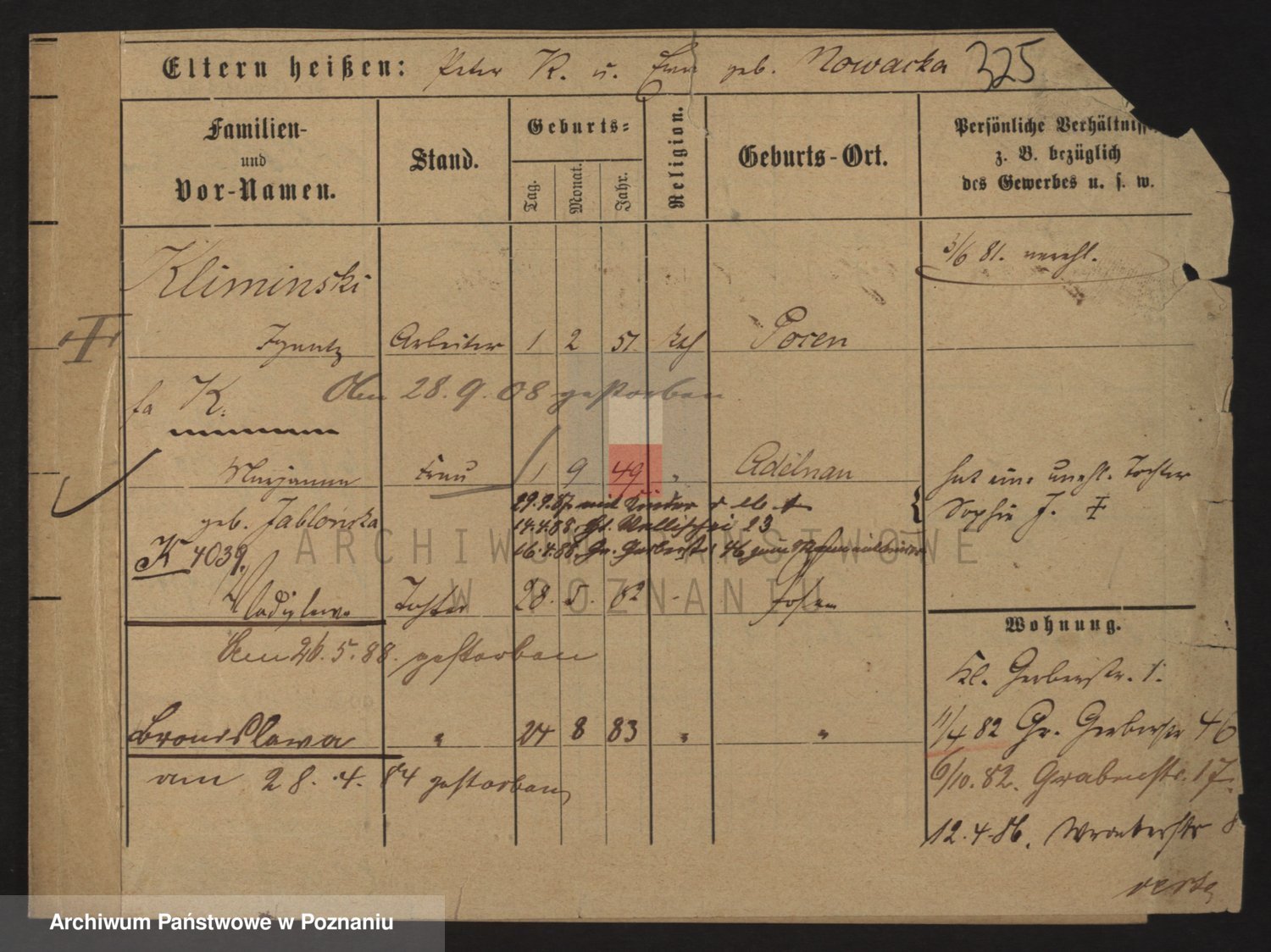 Podgląd karty osobowej dostępny jest po kliknięciu na nazwisko lub ikonkę karty. Można dokonywać powiększenia (ikony na górze) lub przechodzić między kolejnymi skanami (strzałki po bokach).