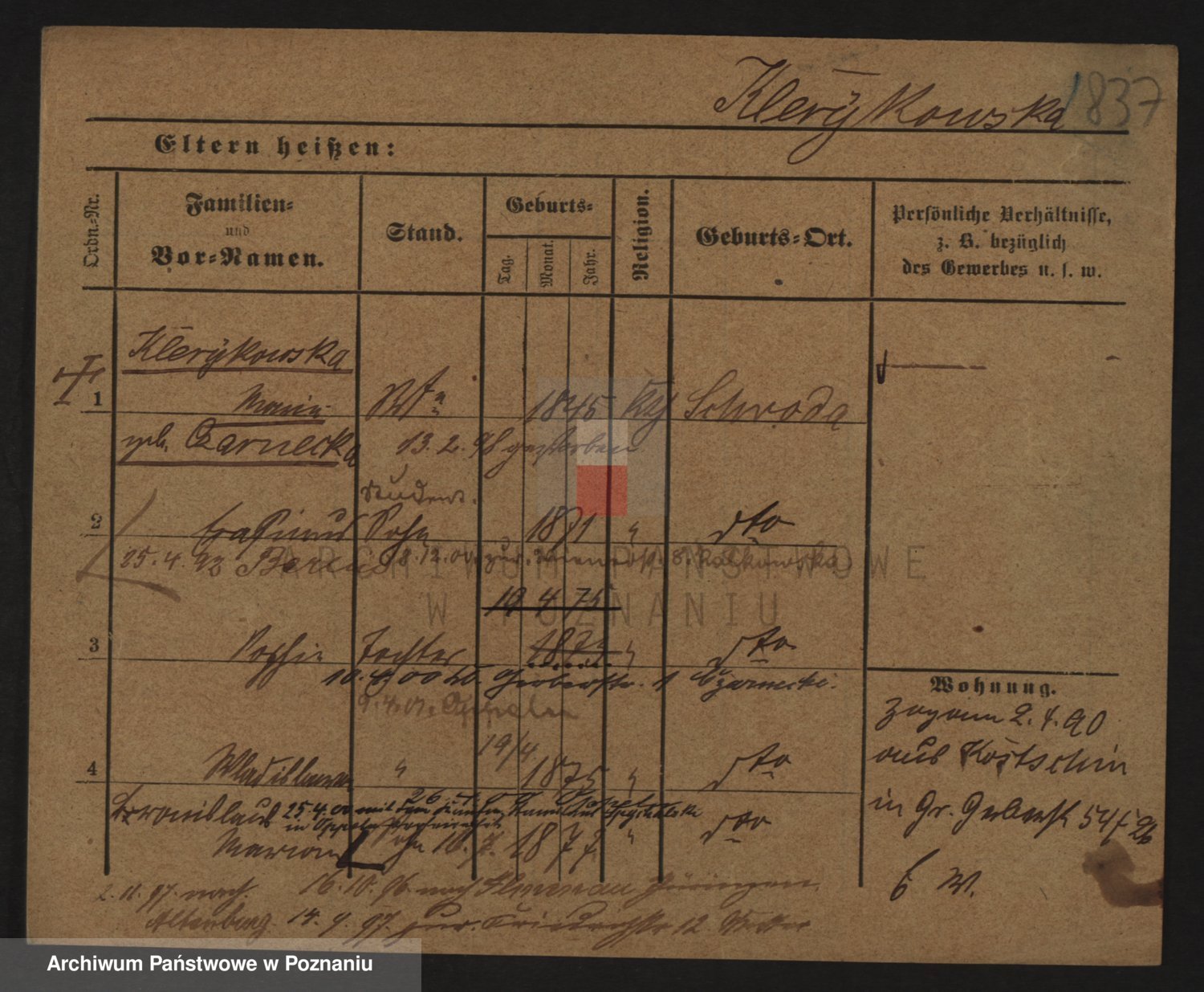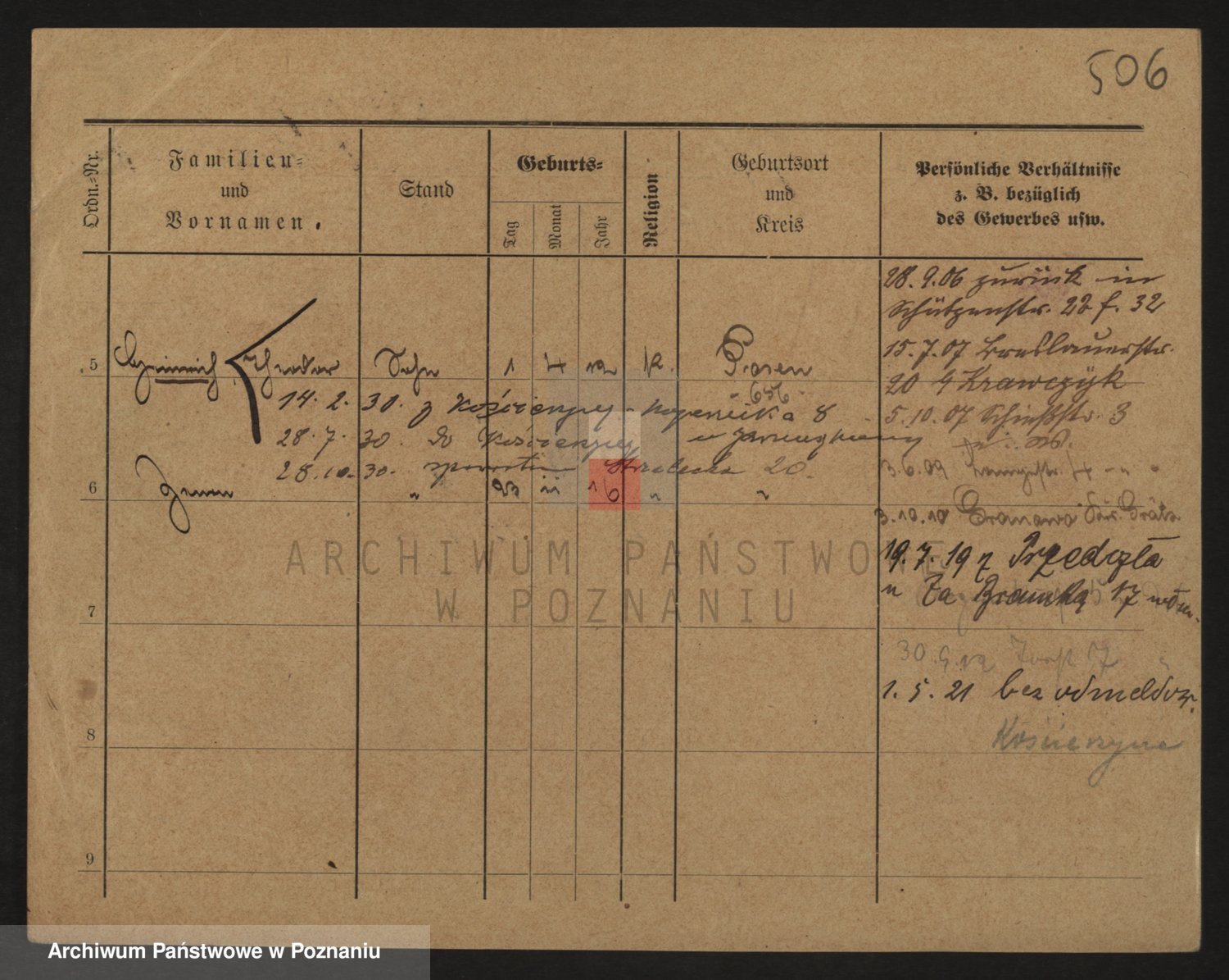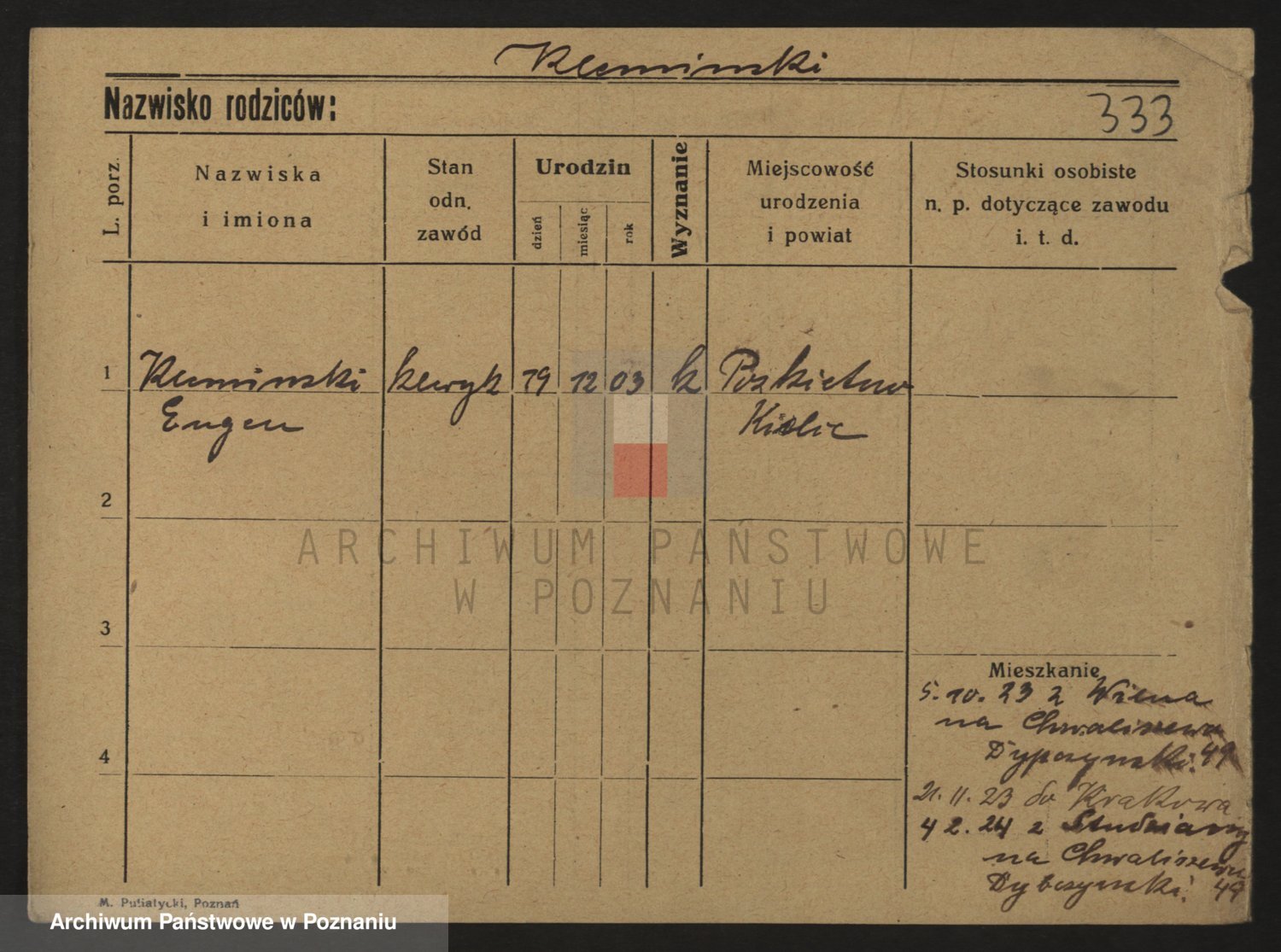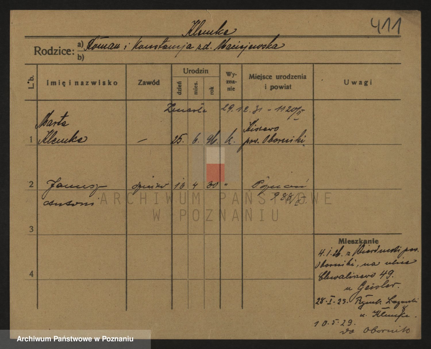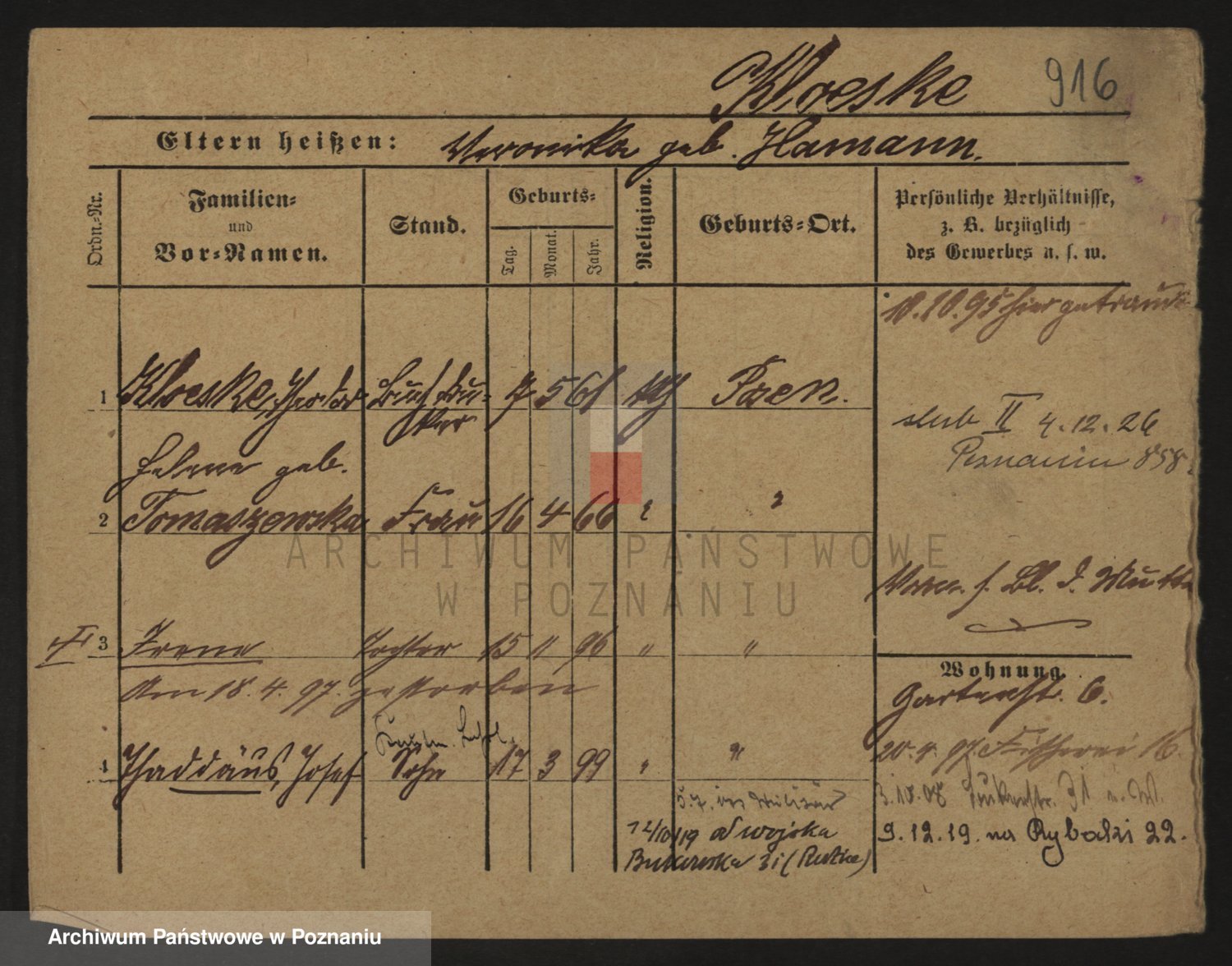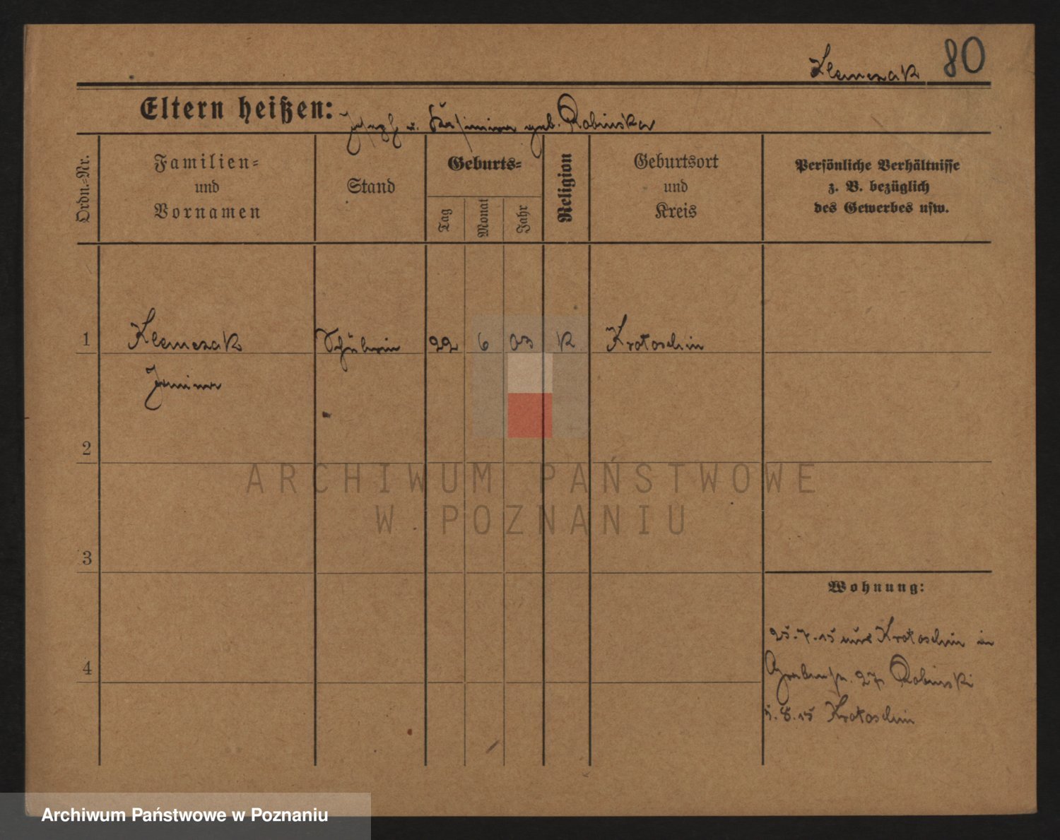 Podgląd karty osobowej dostępny jest po kliknięciu na nazwisko lub ikonkę karty. Można dokonywać powiększenia (ikony na górze) lub przechodzić między kolejnymi skanami (strzałki po bokach).