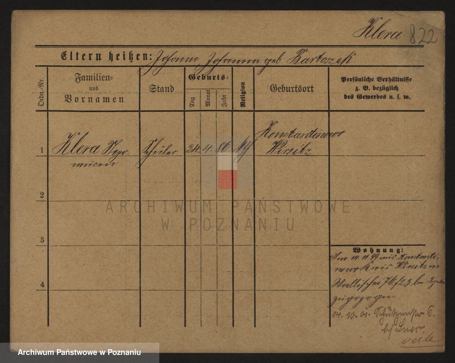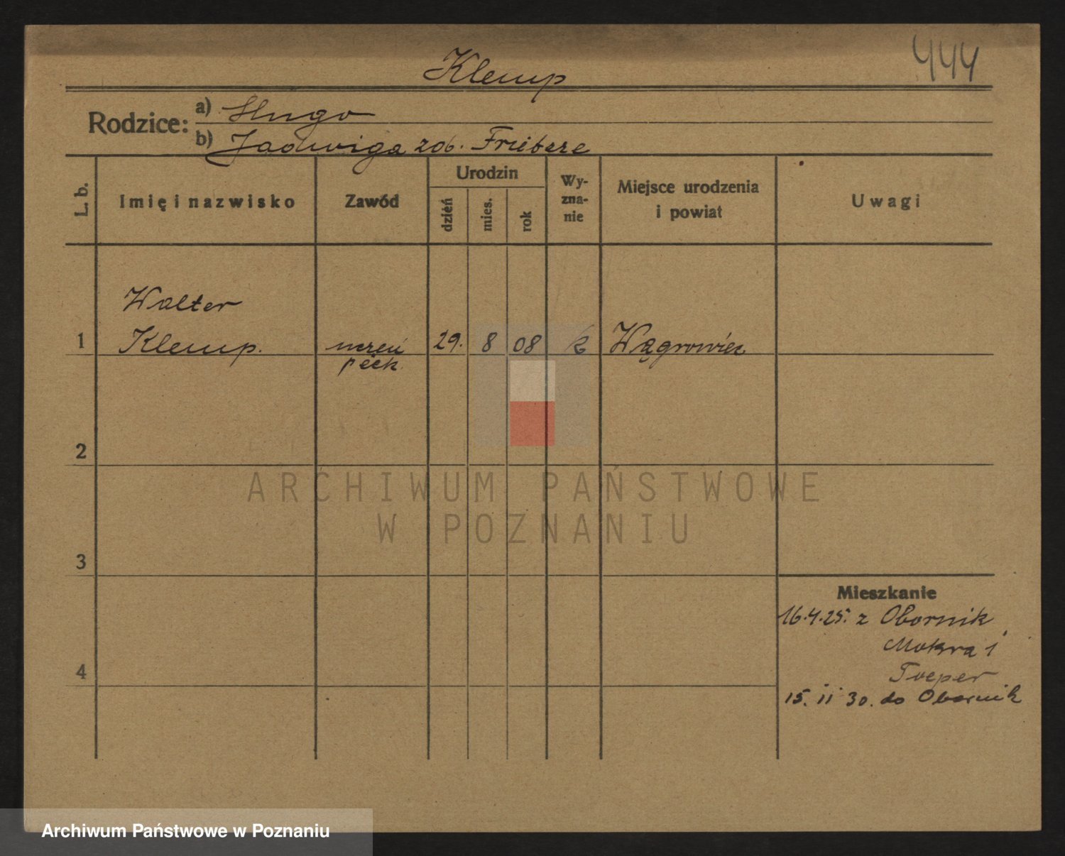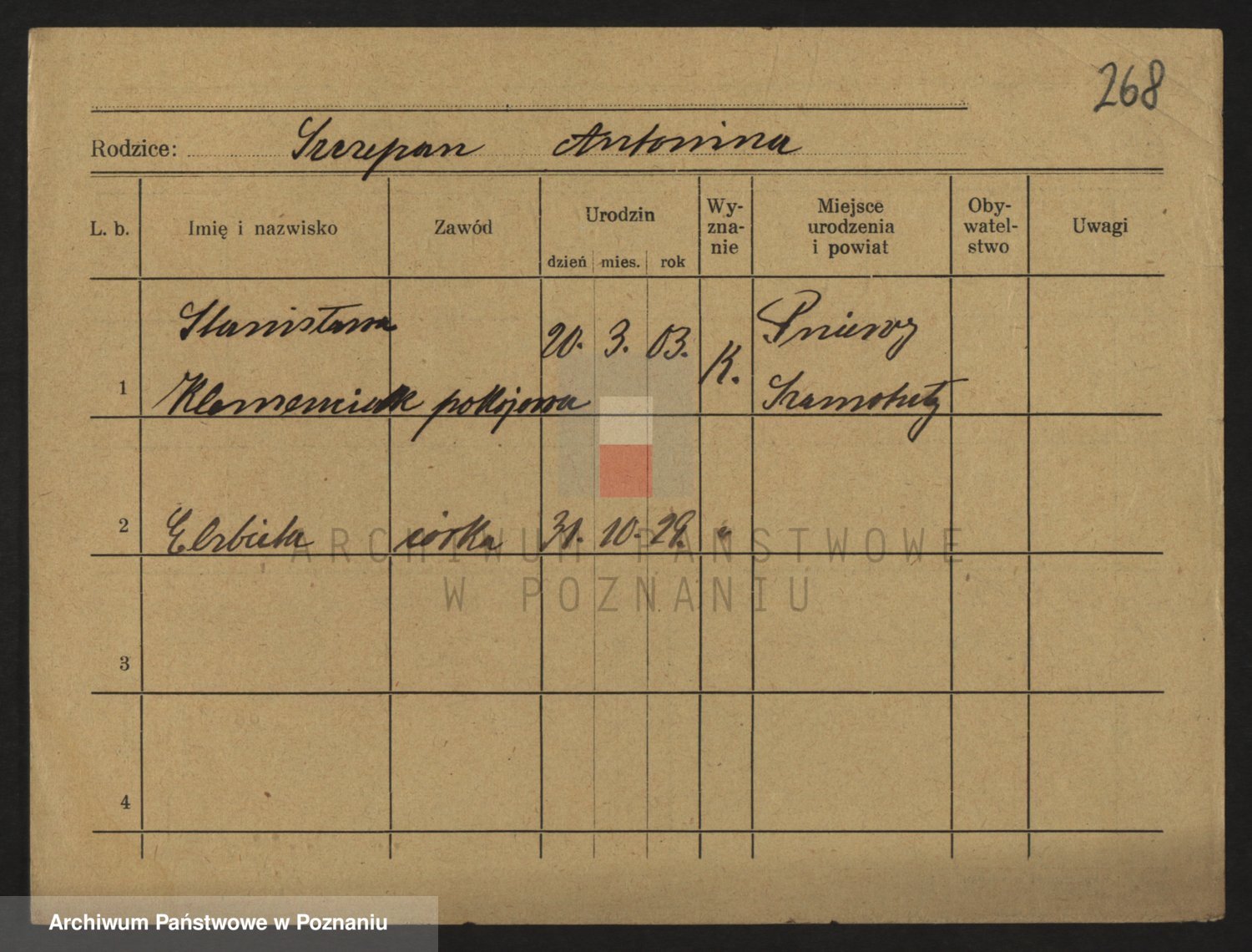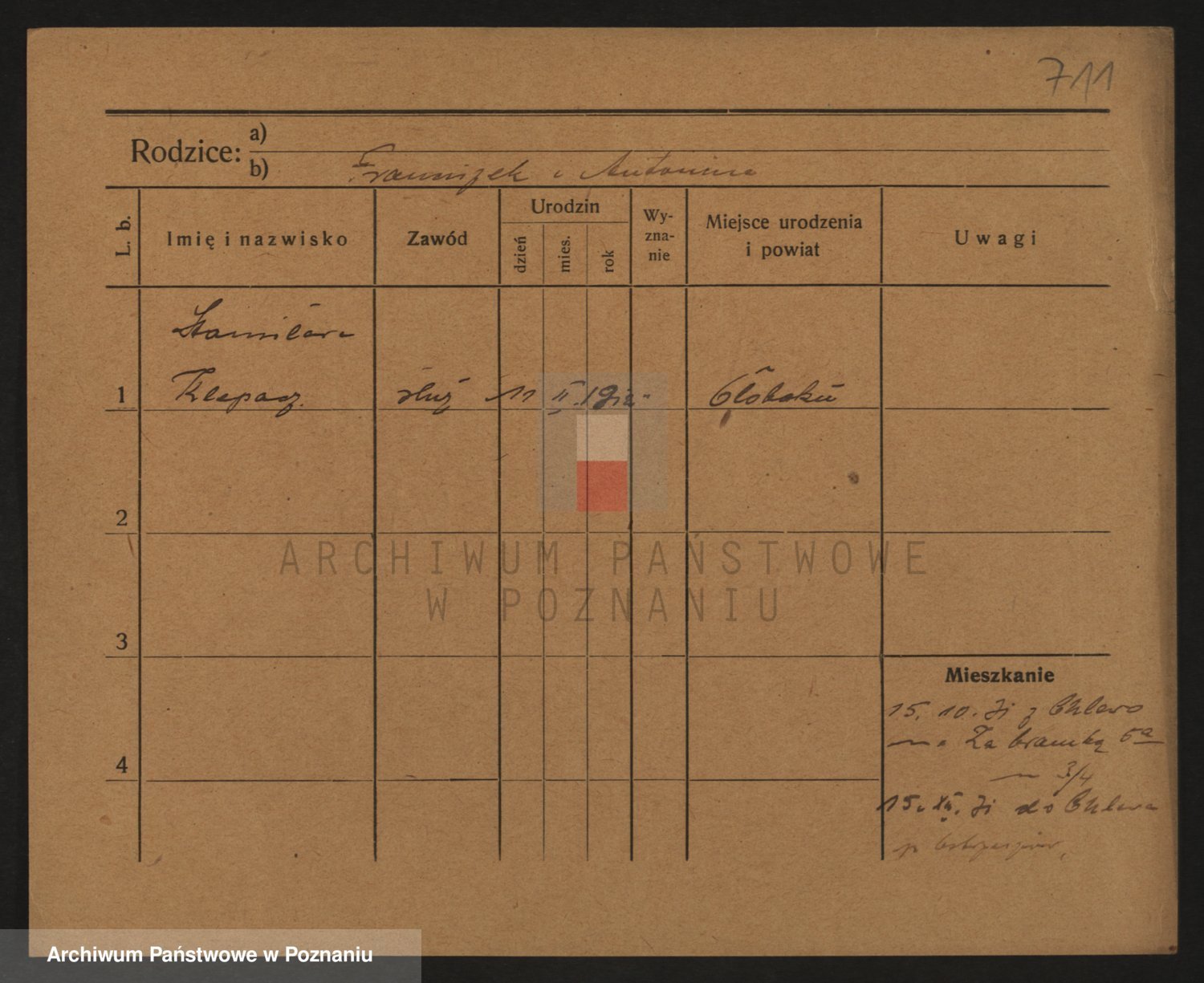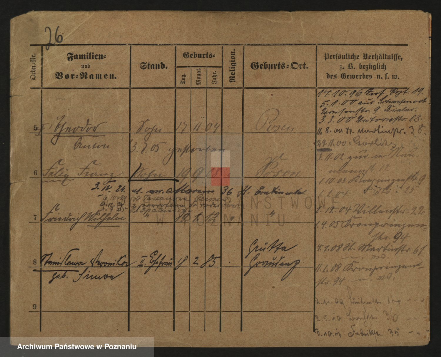 Podgląd karty osobowej dostępny jest po kliknięciu na nazwisko lub ikonkę karty. Można dokonywać powiększenia (ikony na górze) lub przechodzić między kolejnymi skanami (strzałki po bokach).