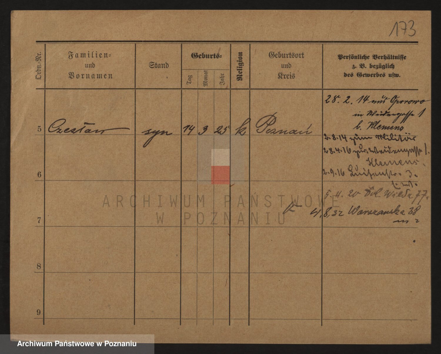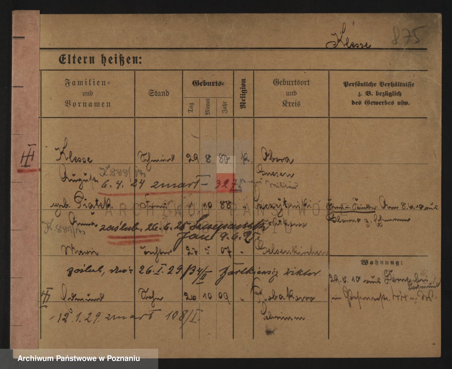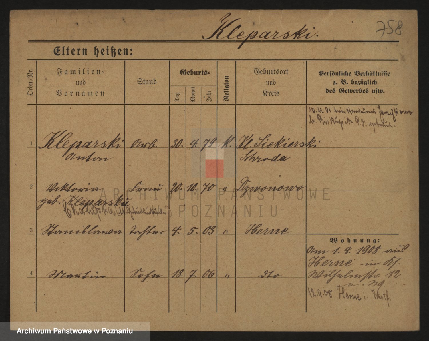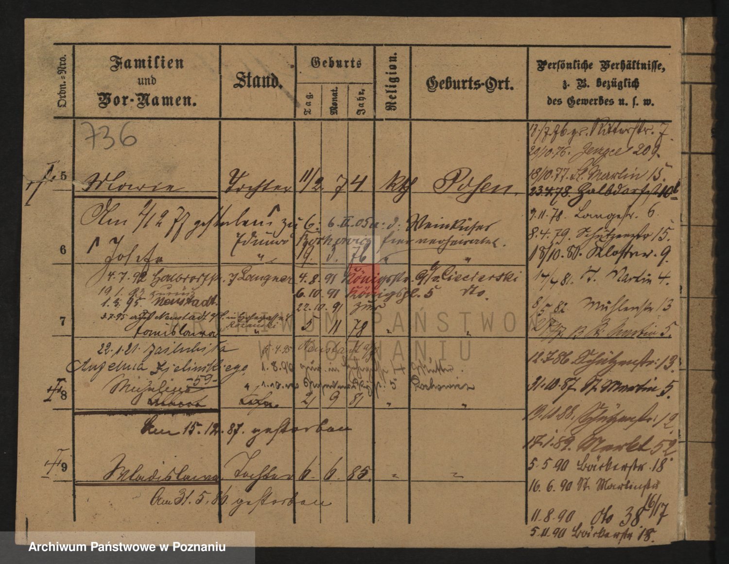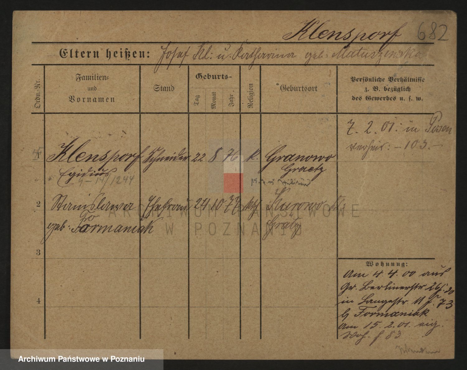 Podgląd karty osobowej dostępny jest po kliknięciu na nazwisko lub ikonkę karty. Można dokonywać powiększenia (ikony na górze) lub przechodzić między kolejnymi skanami (strzałki po bokach).