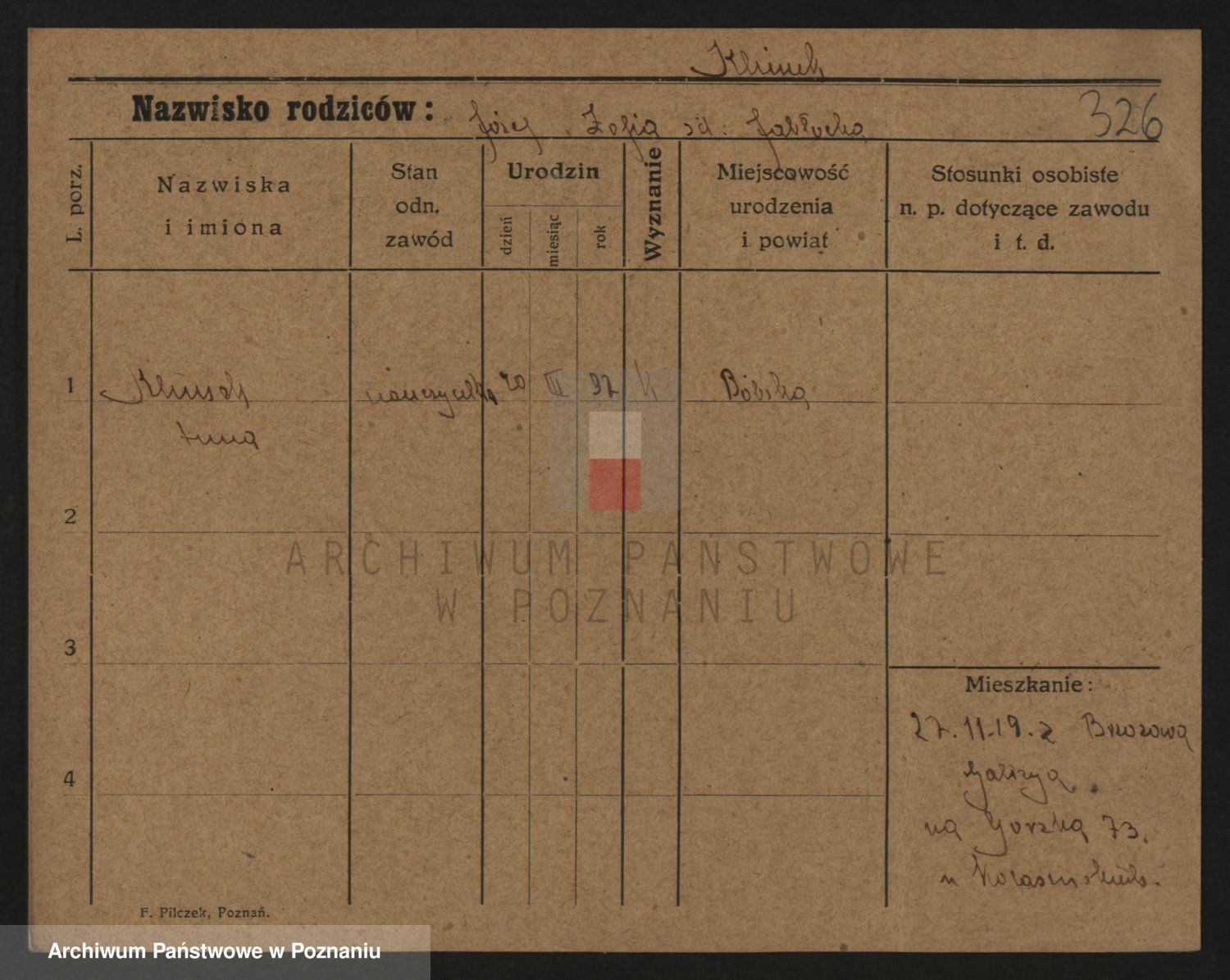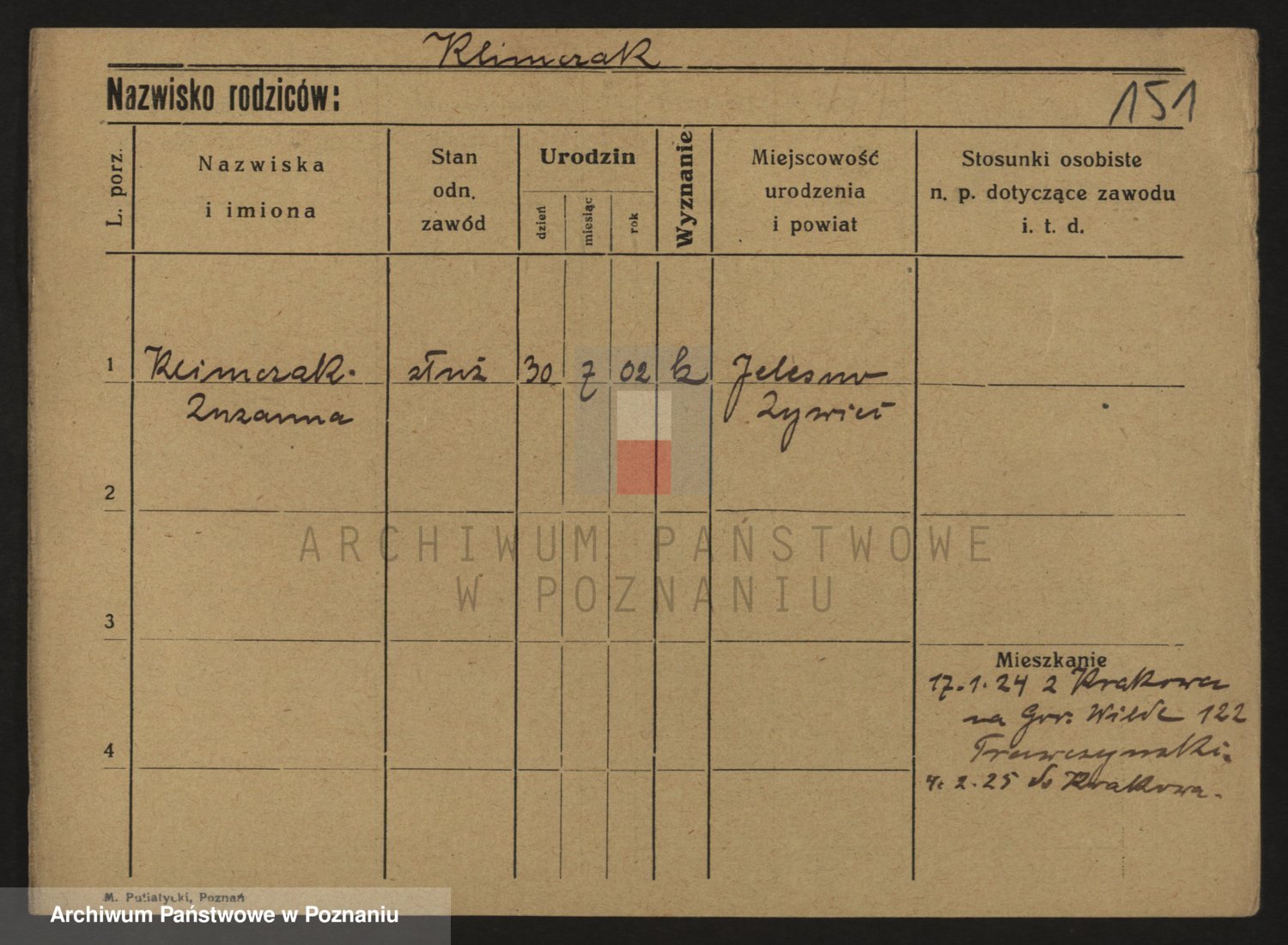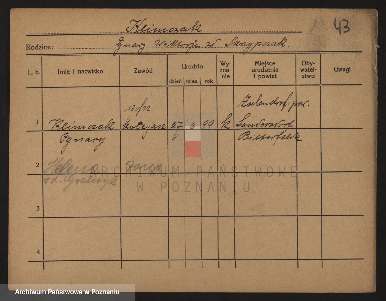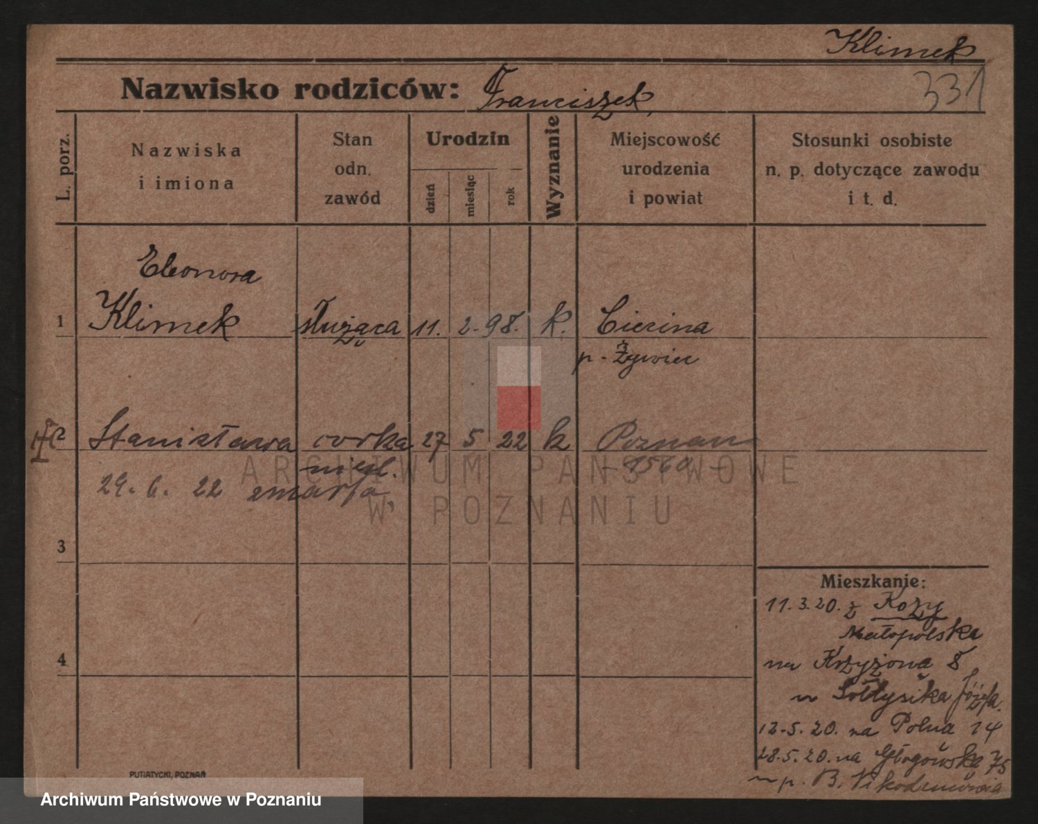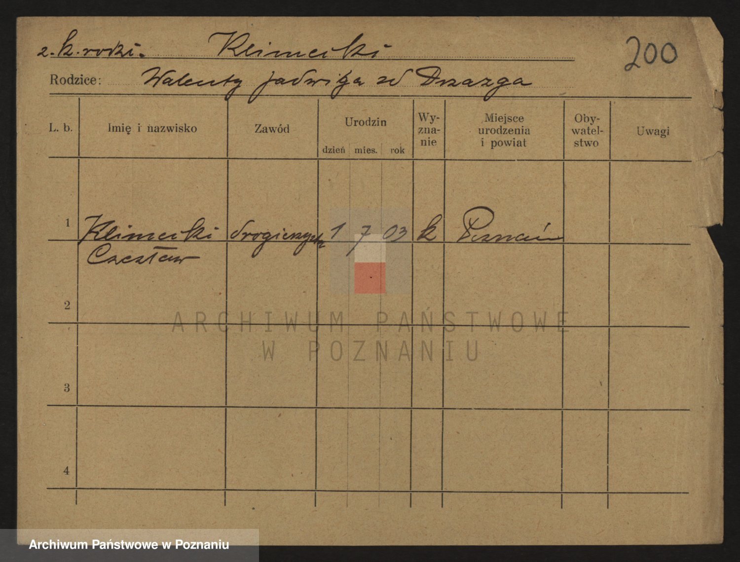 Podgląd karty osobowej dostępny jest po kliknięciu na nazwisko lub ikonkę karty. Można dokonywać powiększenia (ikony na górze) lub przechodzić między kolejnymi skanami (strzałki po bokach).