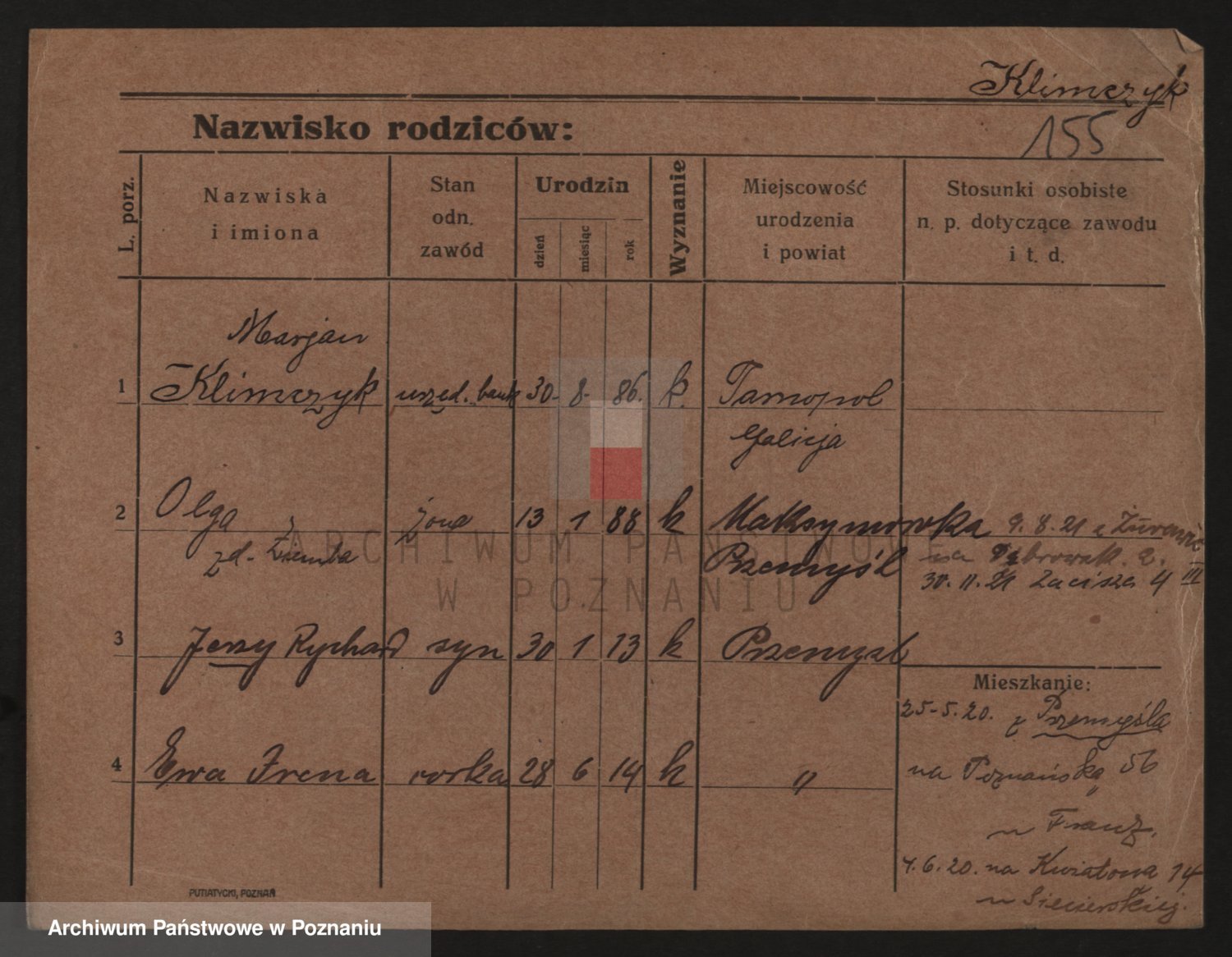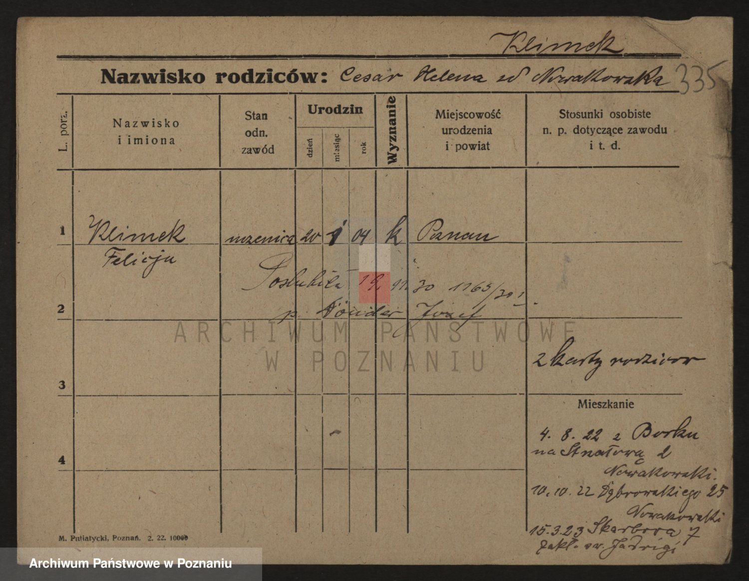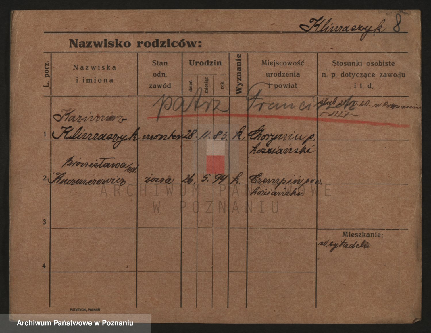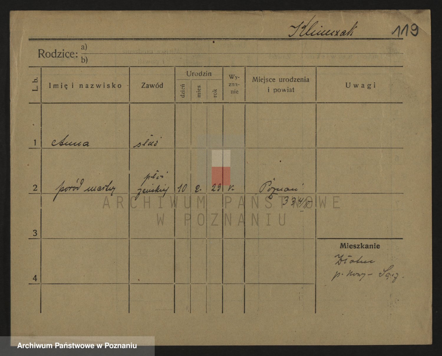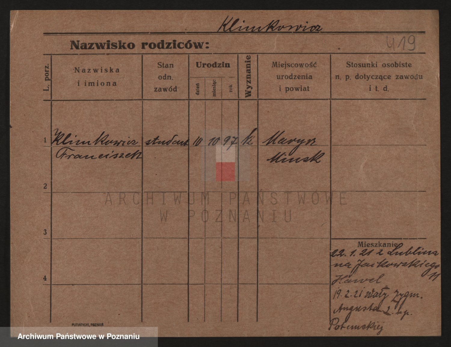 Podgląd karty osobowej dostępny jest po kliknięciu na nazwisko lub ikonkę karty. Można dokonywać powiększenia (ikony na górze) lub przechodzić między kolejnymi skanami (strzałki po bokach).