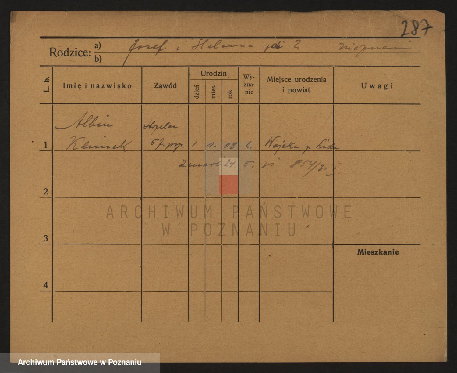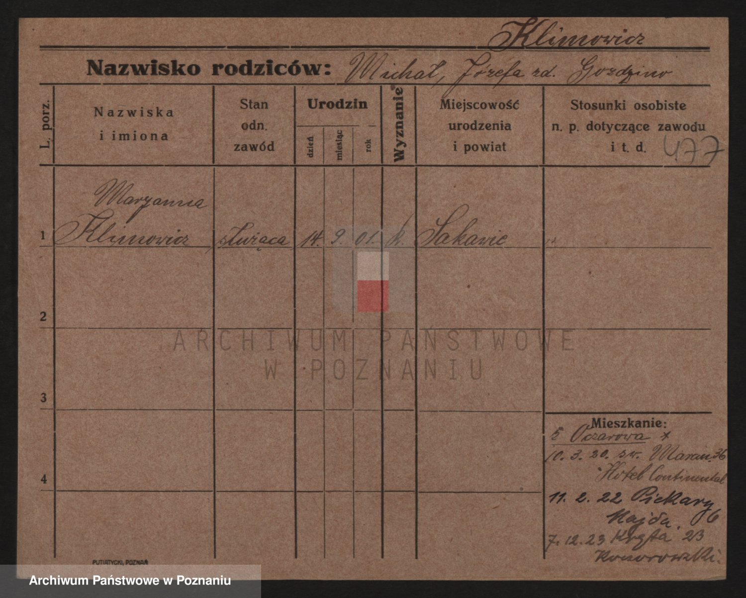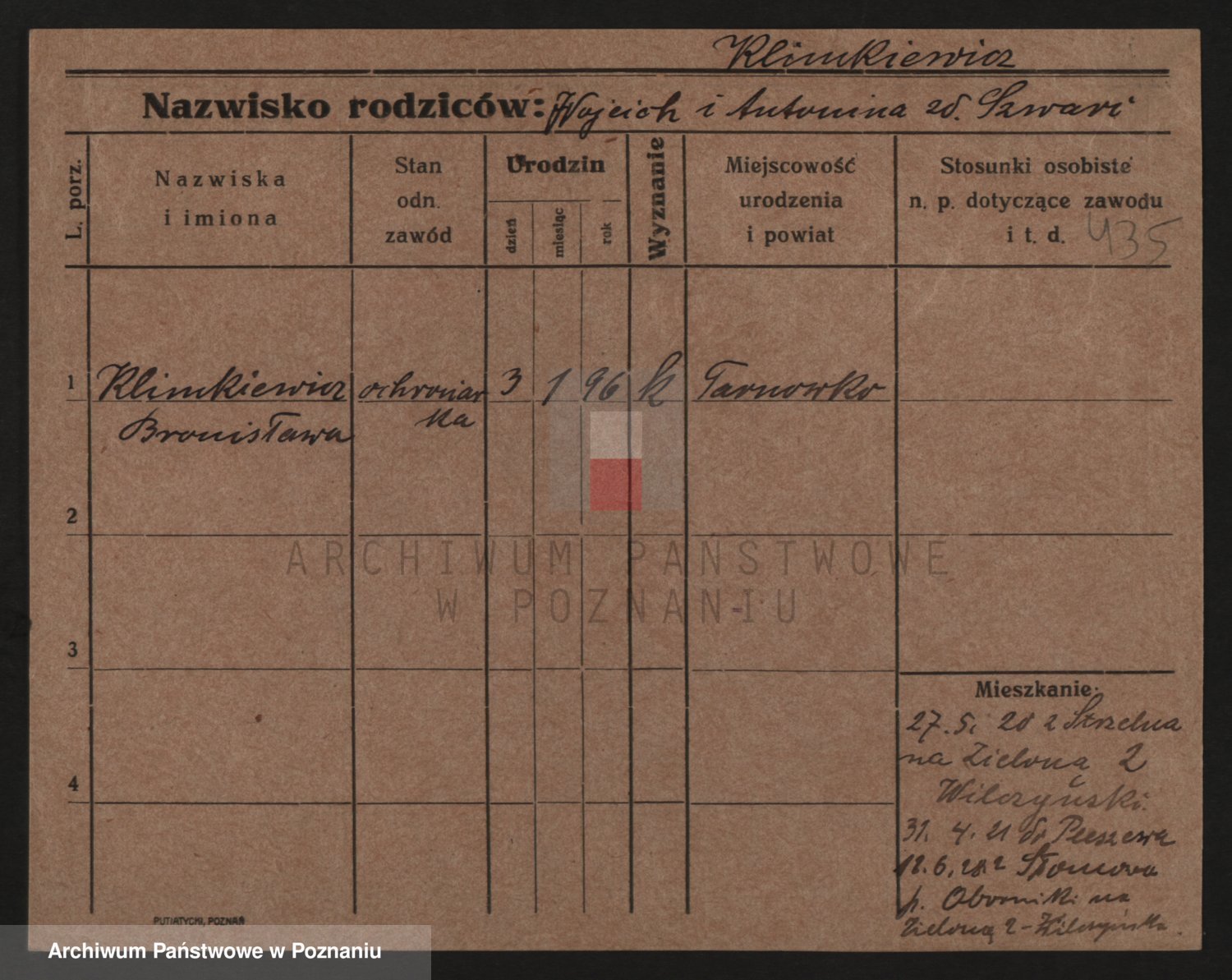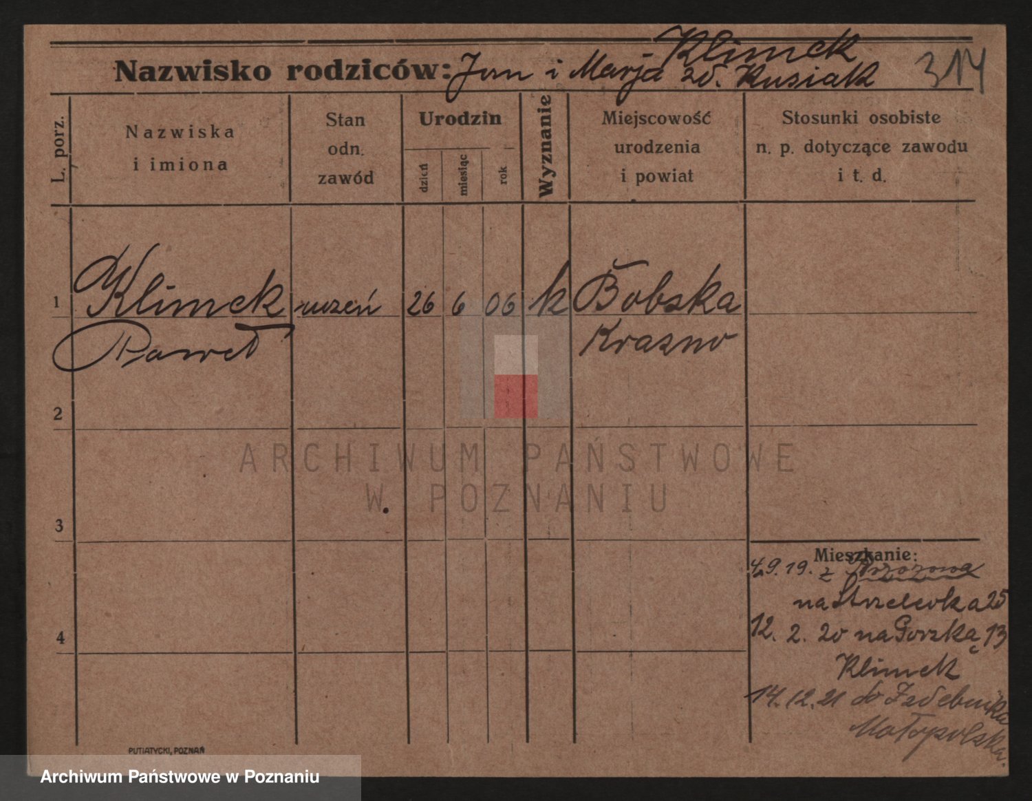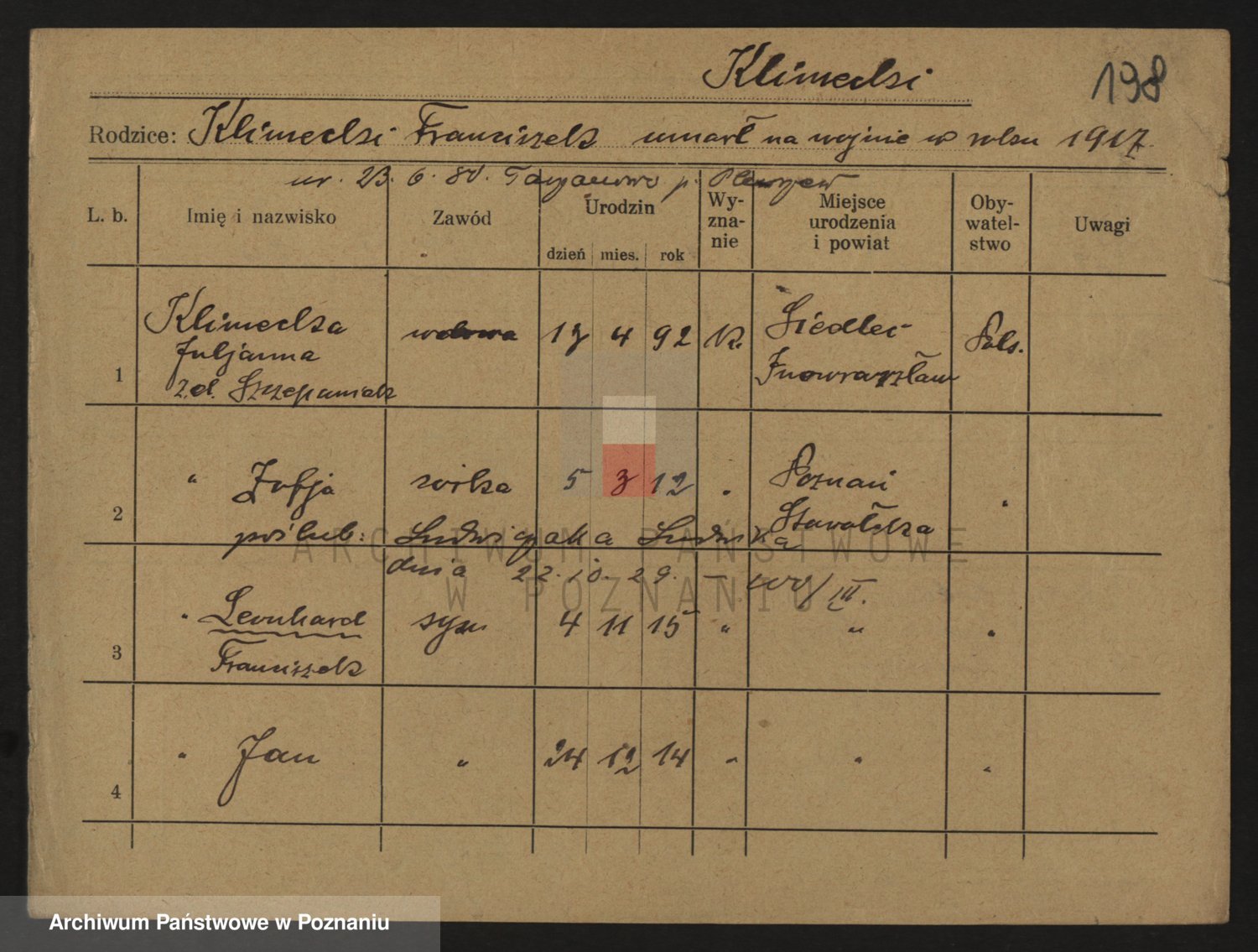 Podgląd karty osobowej dostępny jest po kliknięciu na nazwisko lub ikonkę karty. Można dokonywać powiększenia (ikony na górze) lub przechodzić między kolejnymi skanami (strzałki po bokach).