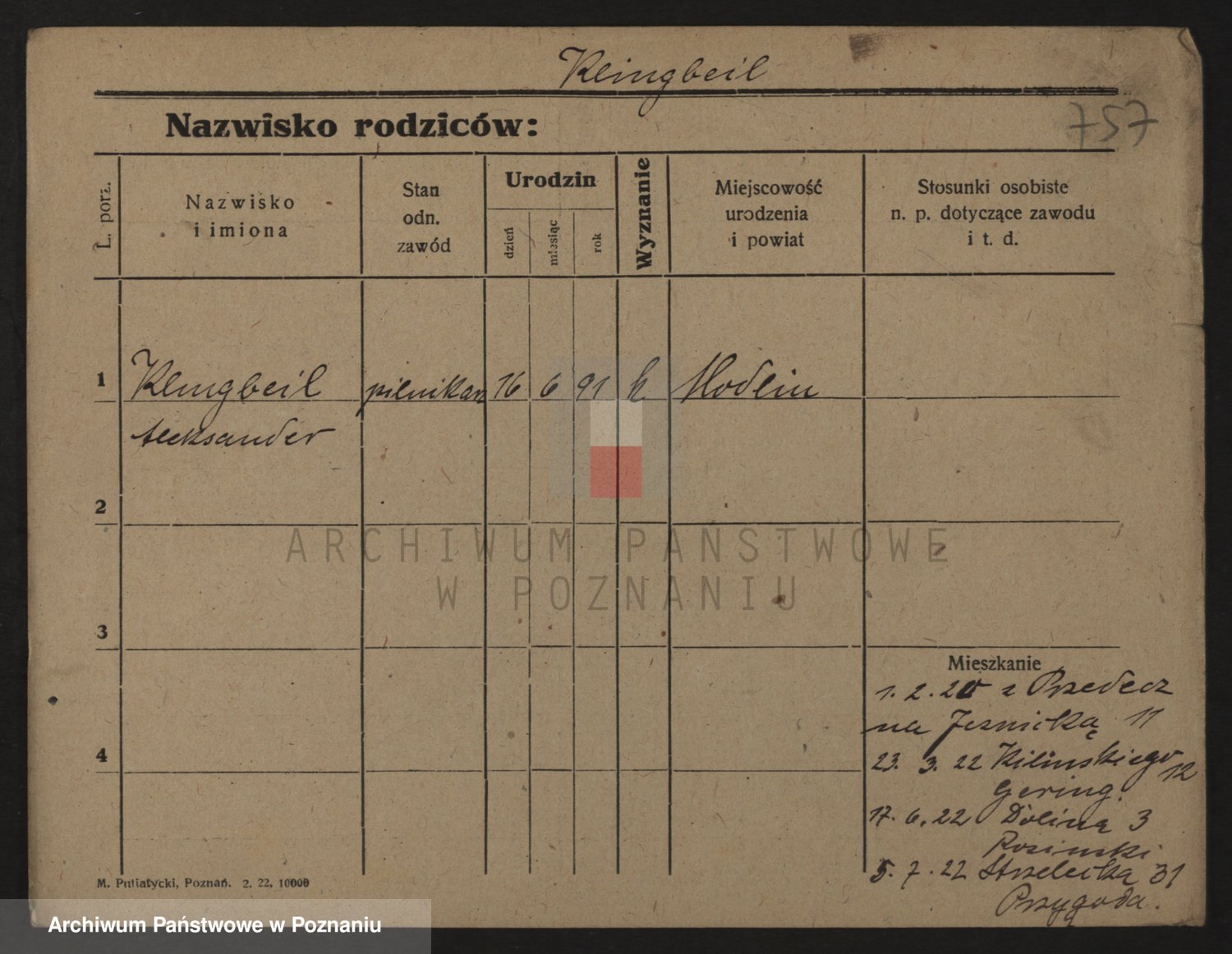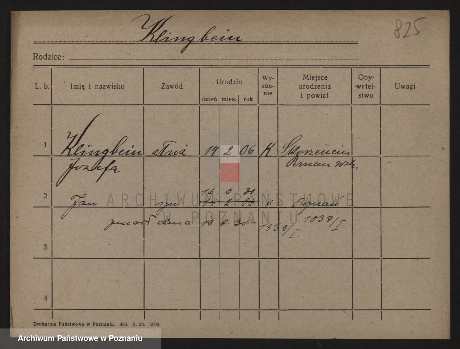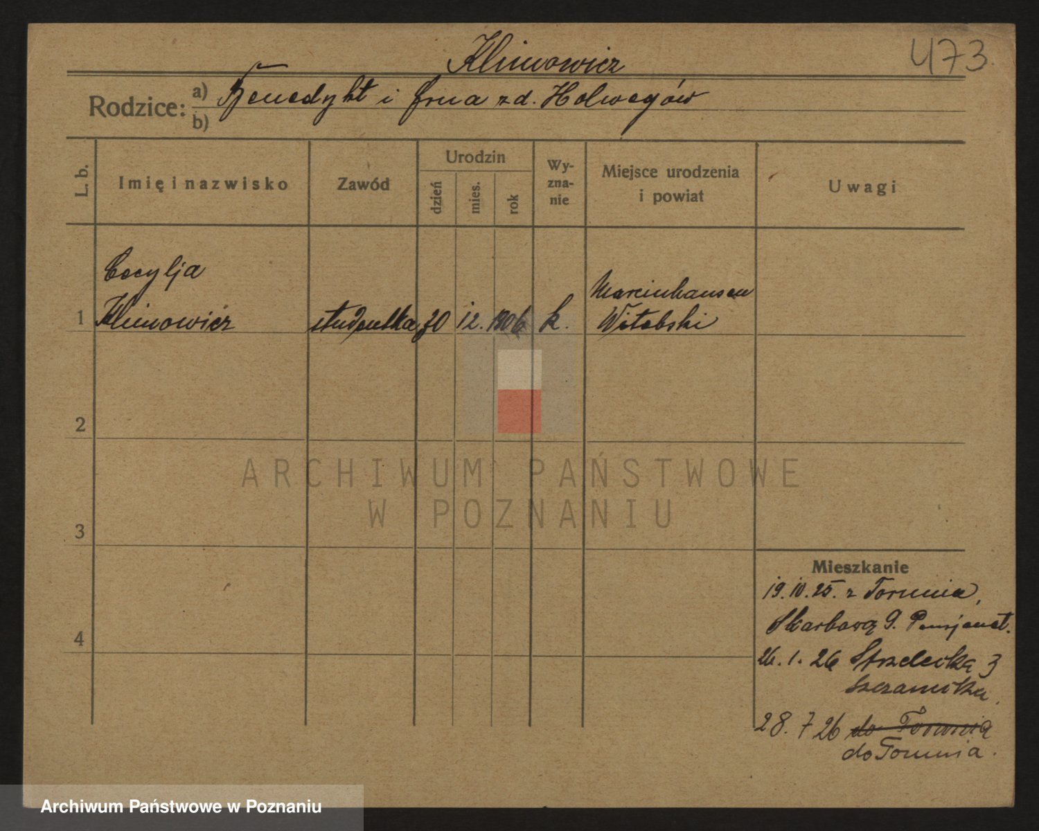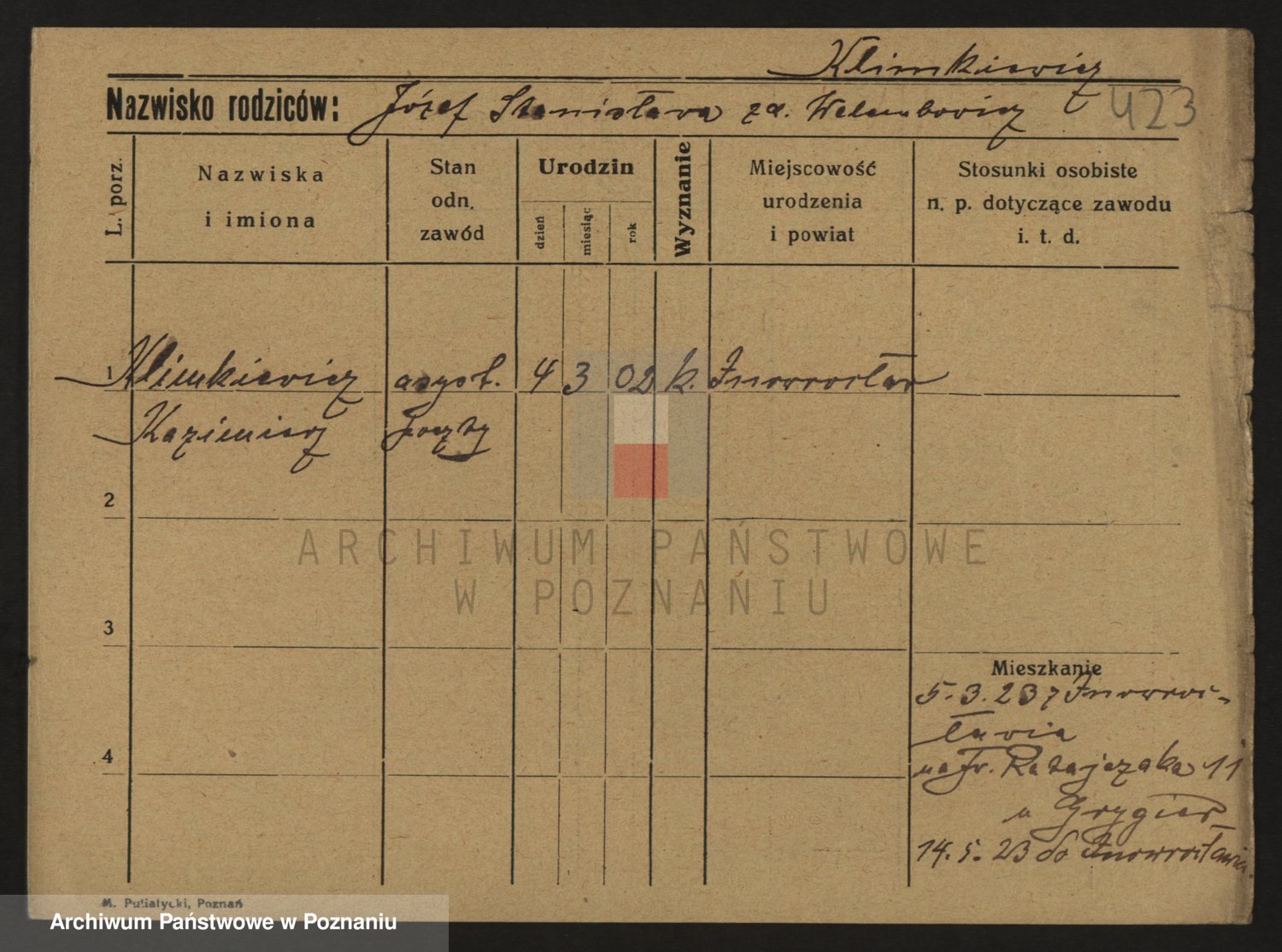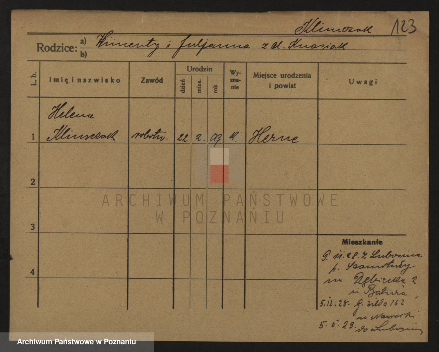 Podgląd karty osobowej dostępny jest po kliknięciu na nazwisko lub ikonkę karty. Można dokonywać powiększenia (ikony na górze) lub przechodzić między kolejnymi skanami (strzałki po bokach).