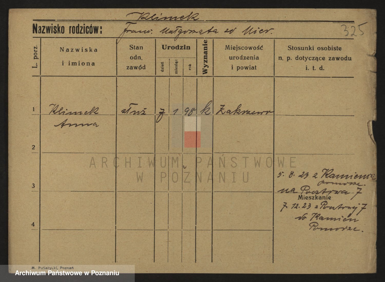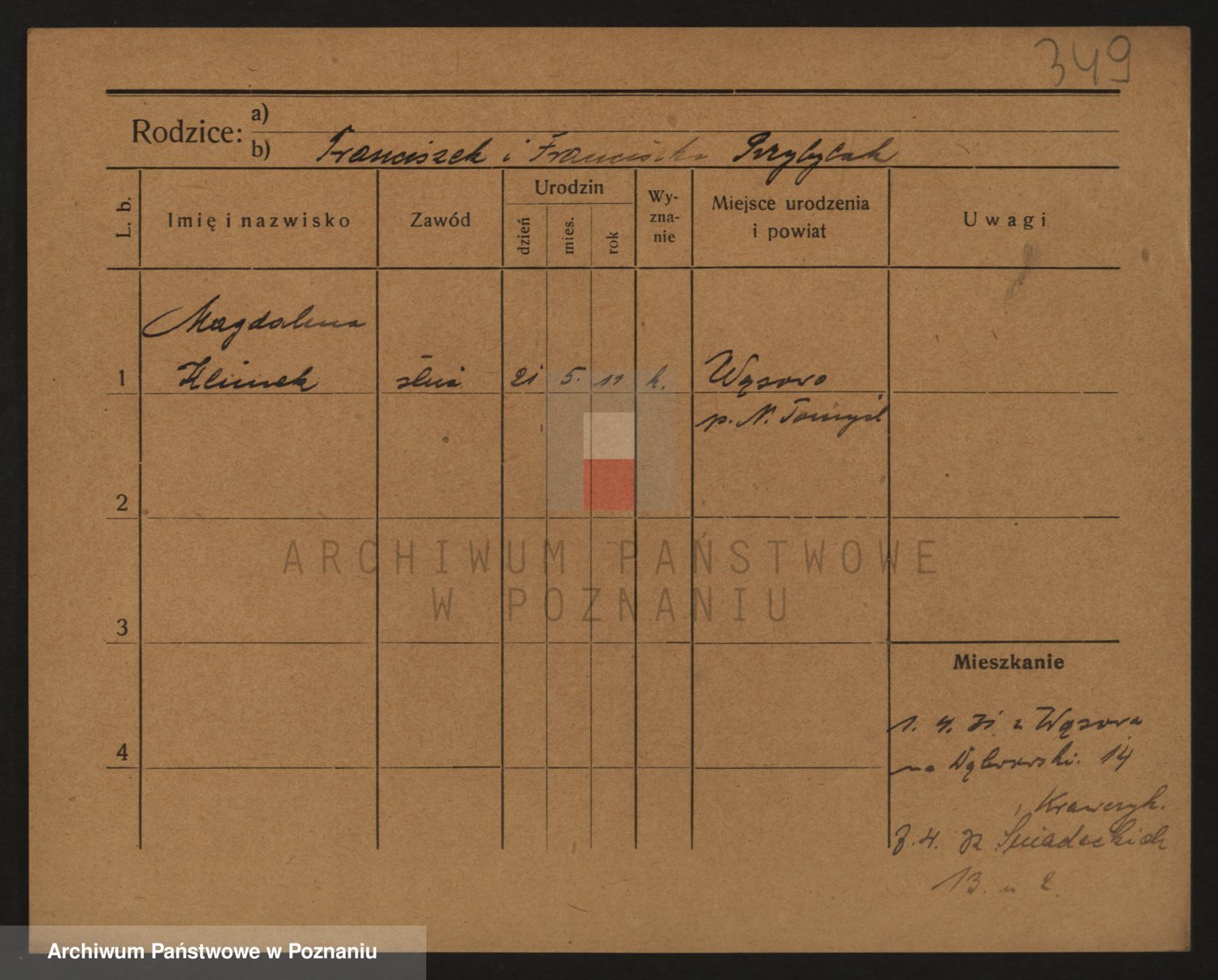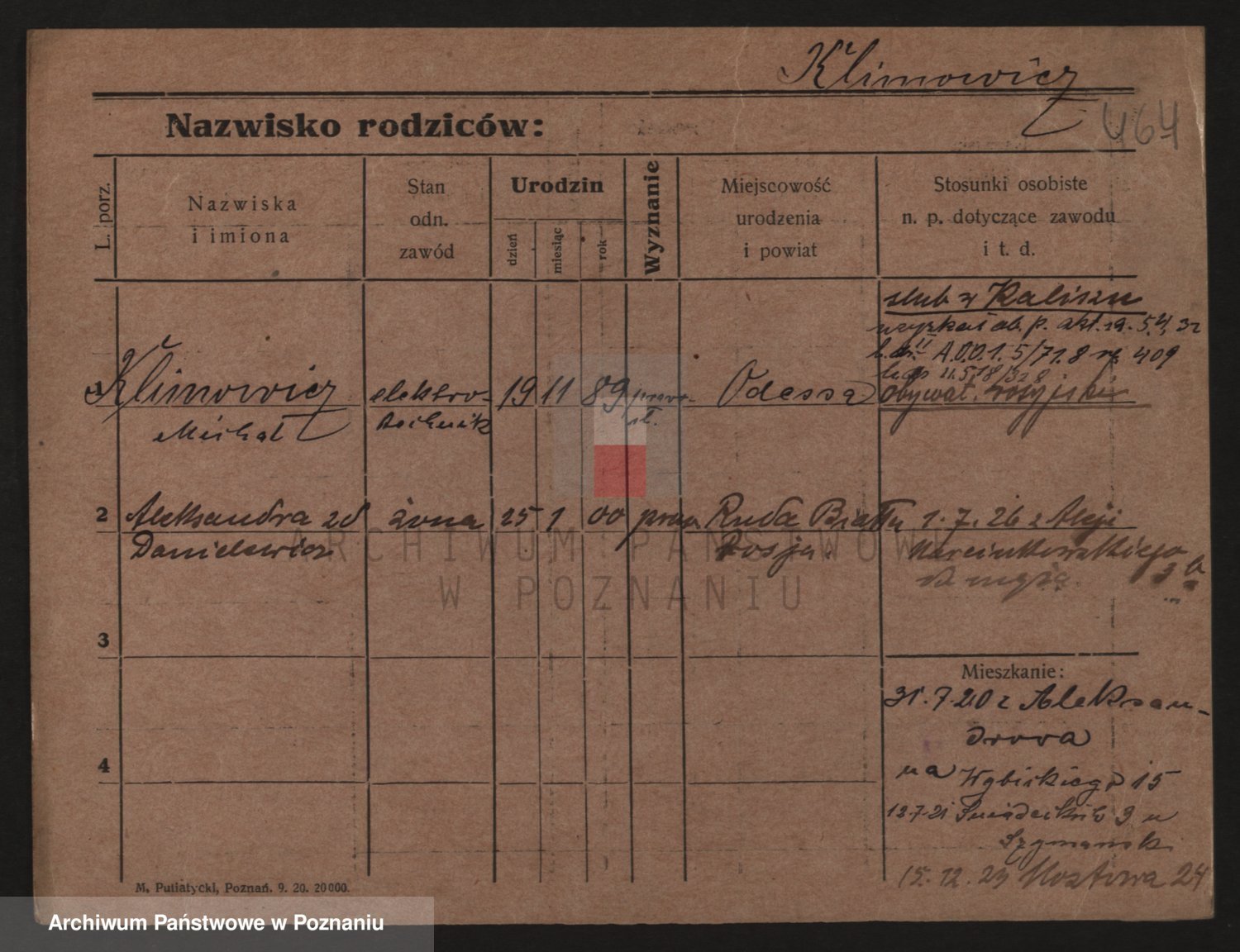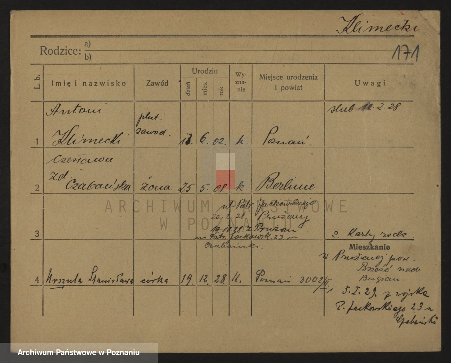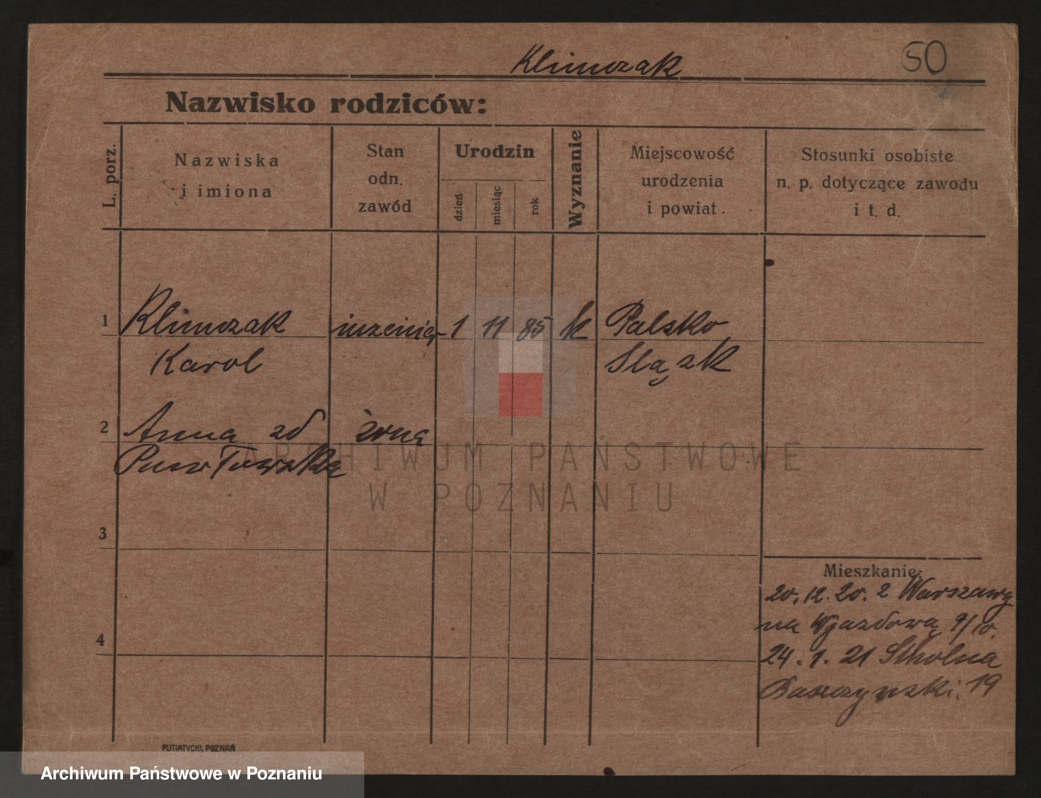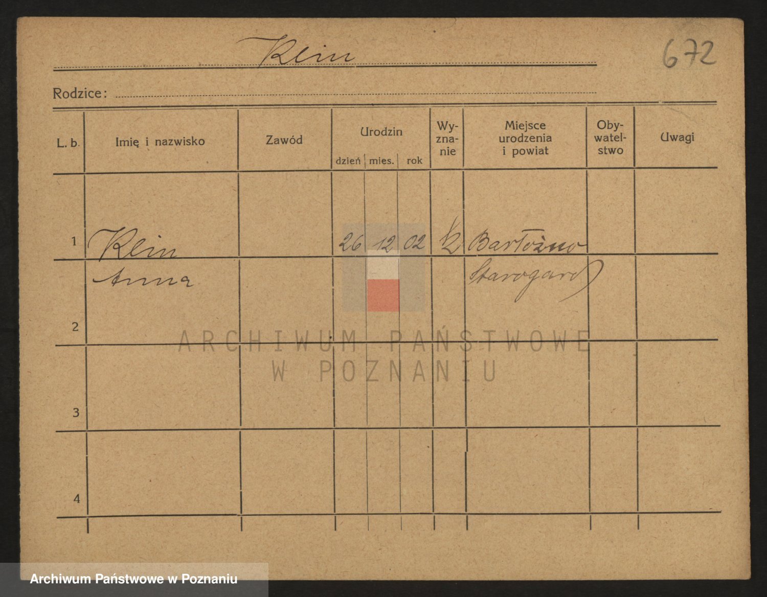 Podgląd karty osobowej dostępny jest po kliknięciu na nazwisko lub ikonkę karty. Można dokonywać powiększenia (ikony na górze) lub przechodzić między kolejnymi skanami (strzałki po bokach).