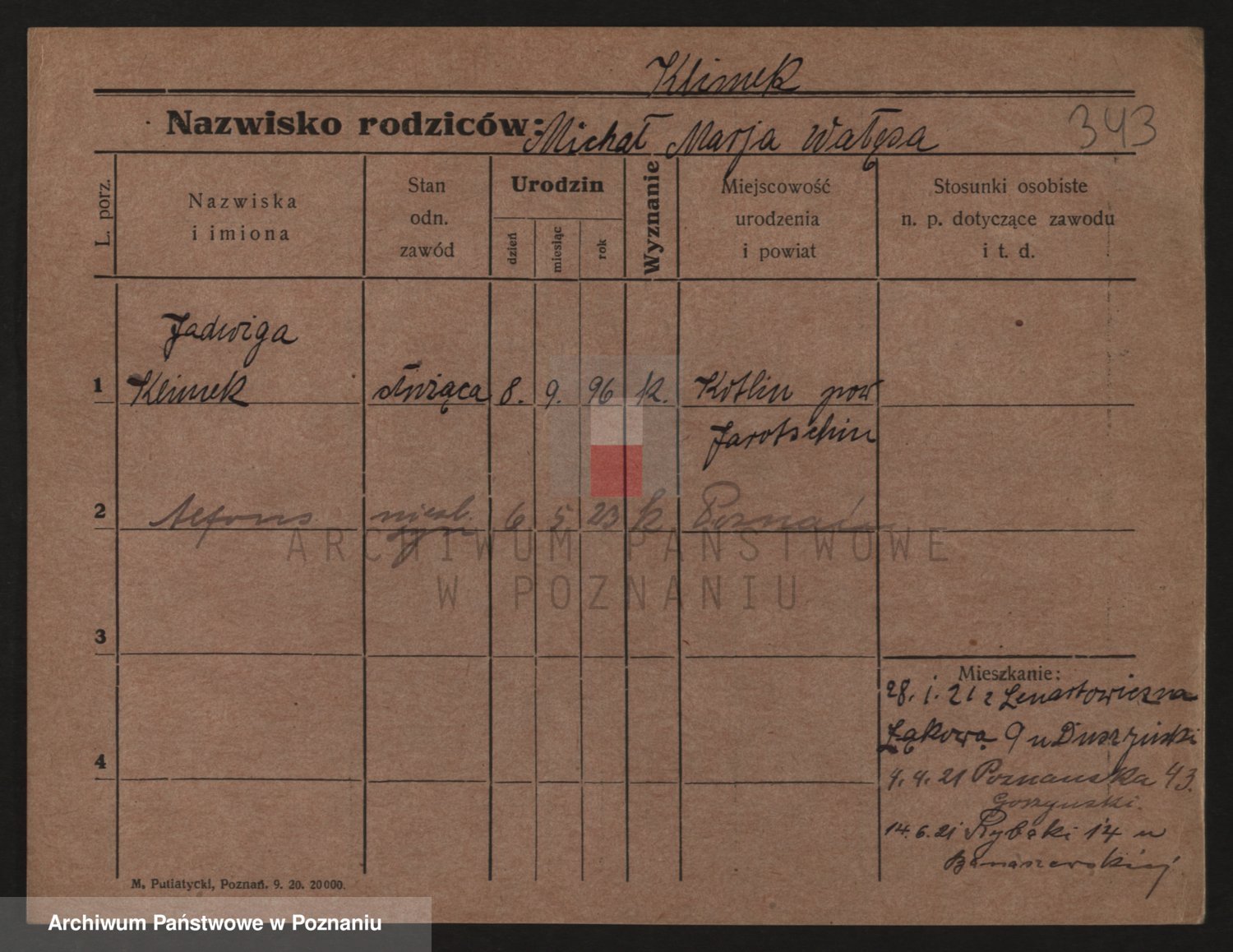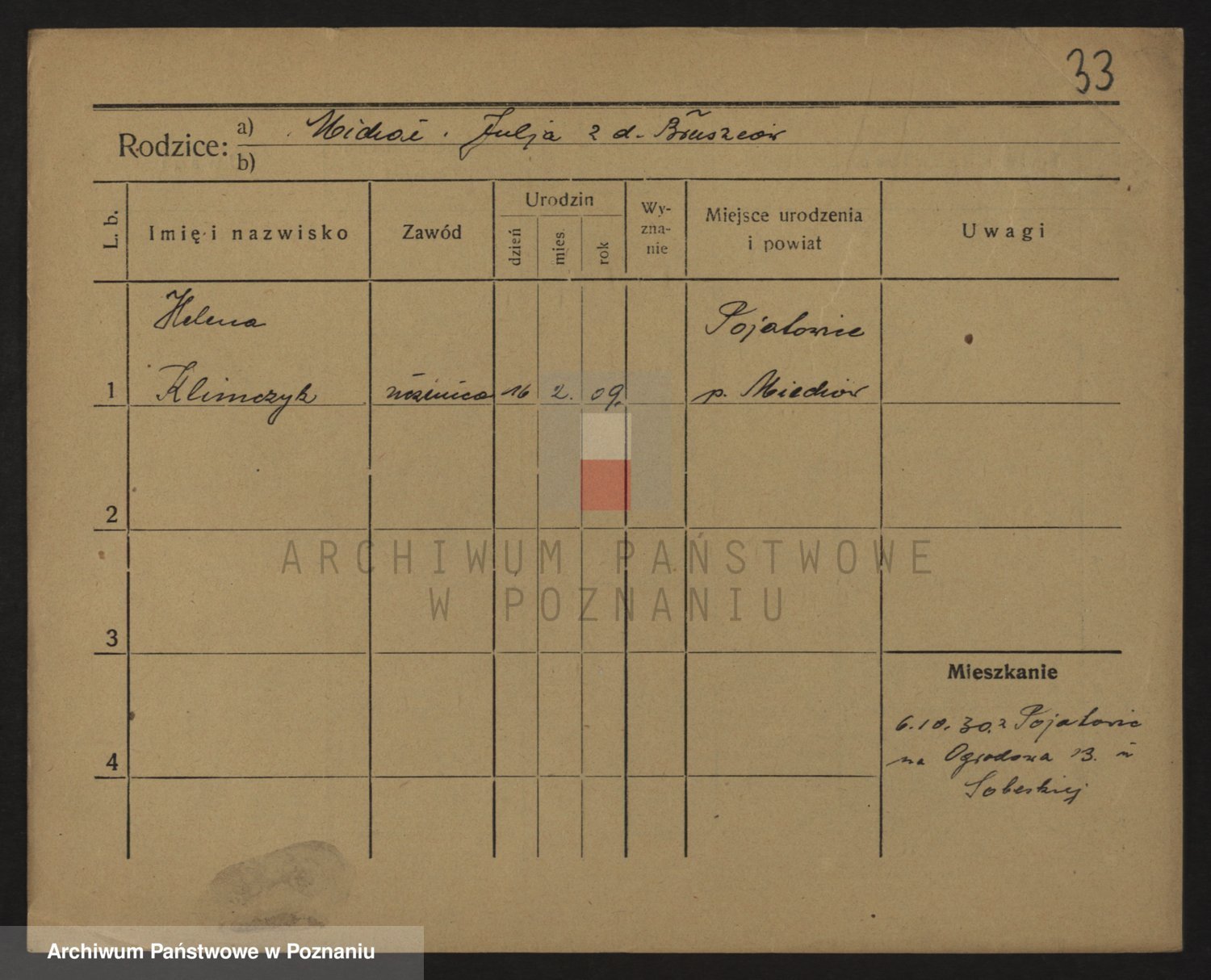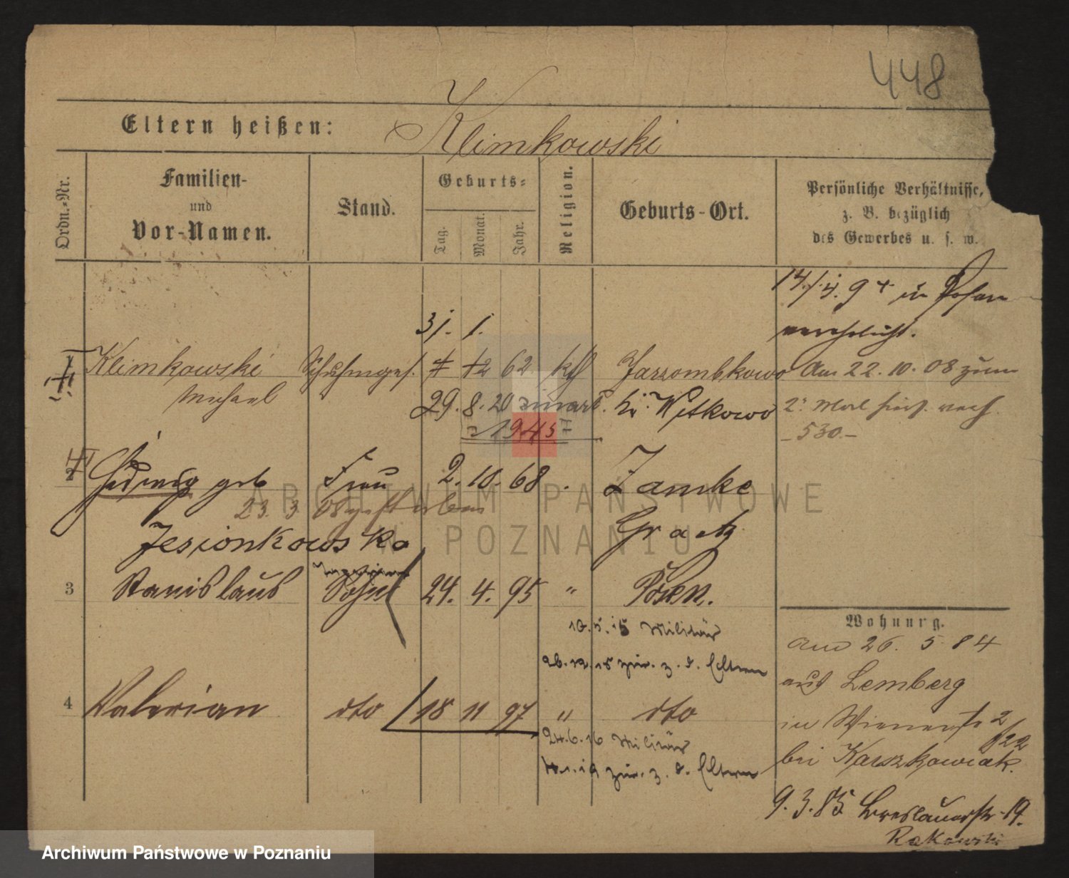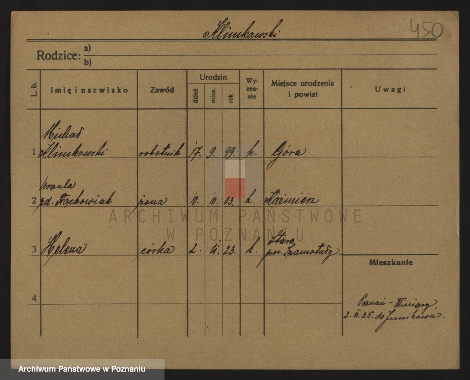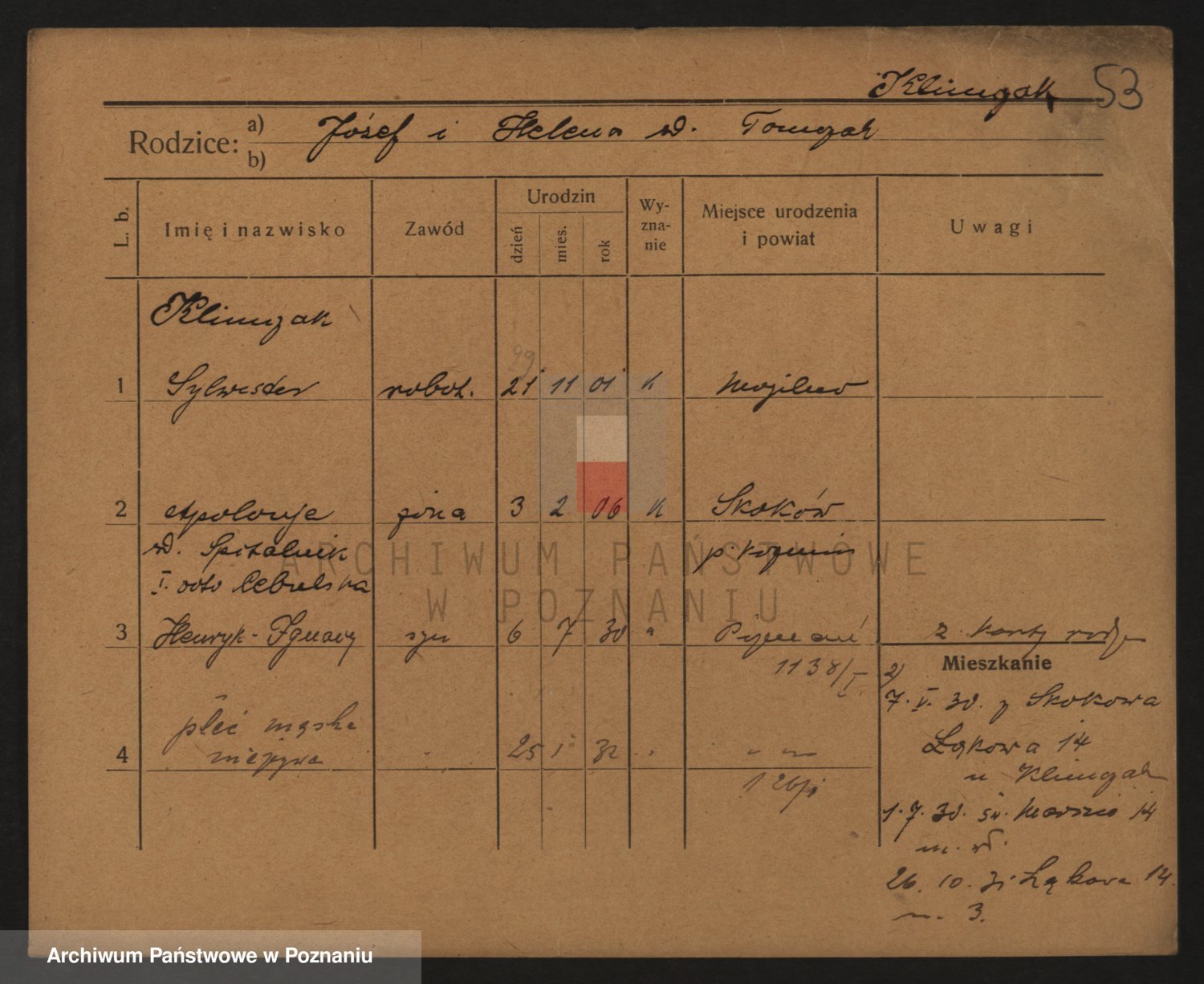 Podgląd karty osobowej dostępny jest po kliknięciu na nazwisko lub ikonkę karty. Można dokonywać powiększenia (ikony na górze) lub przechodzić między kolejnymi skanami (strzałki po bokach).