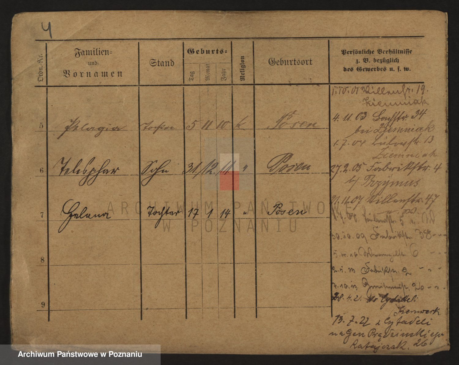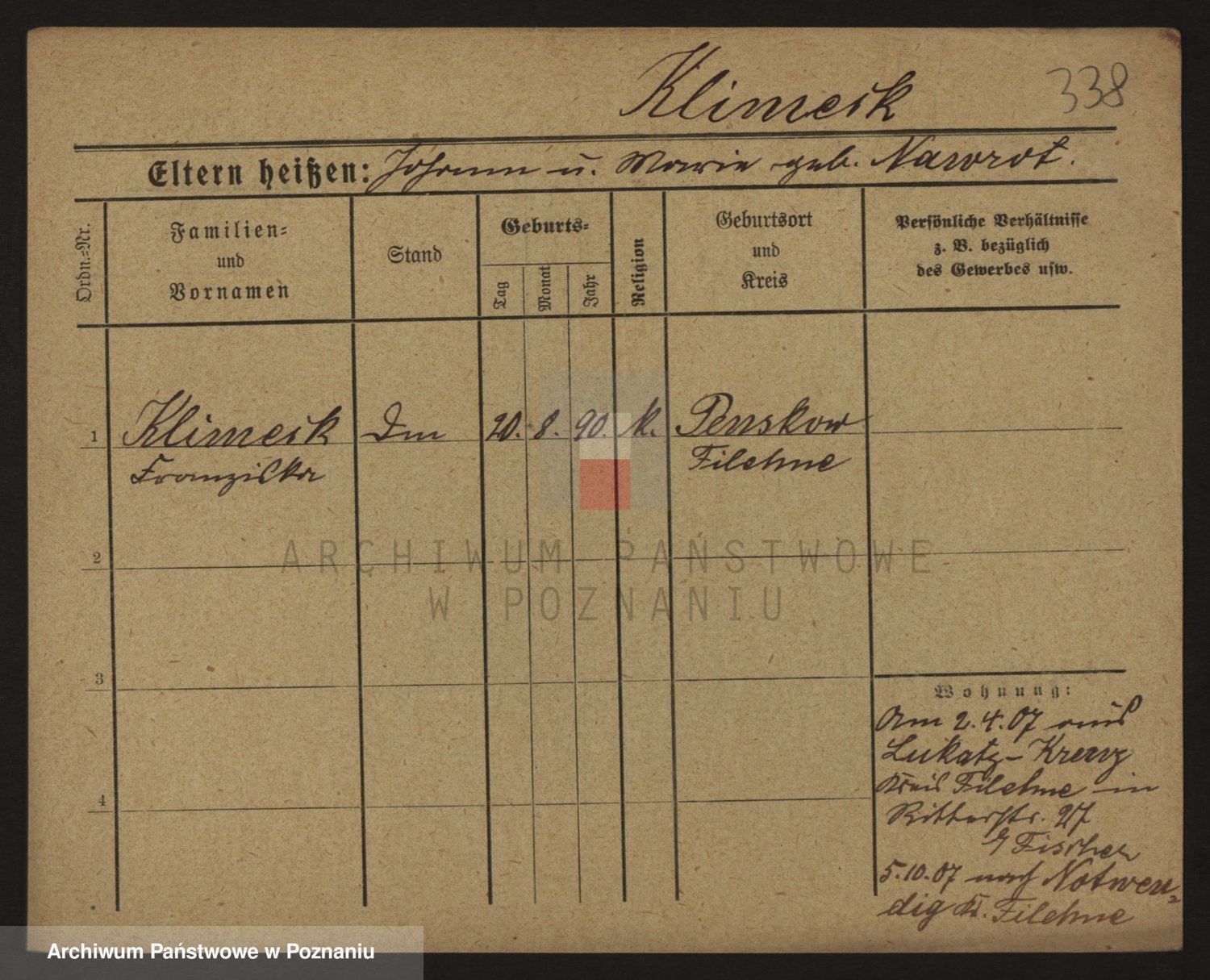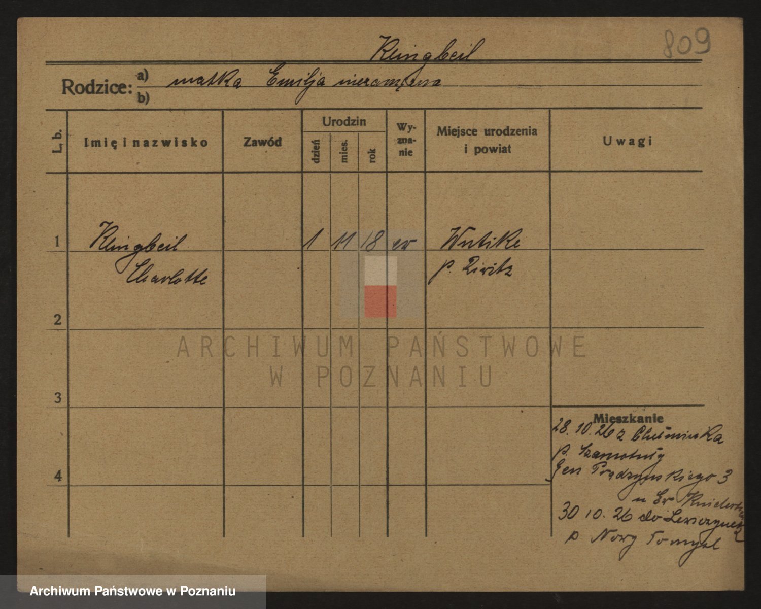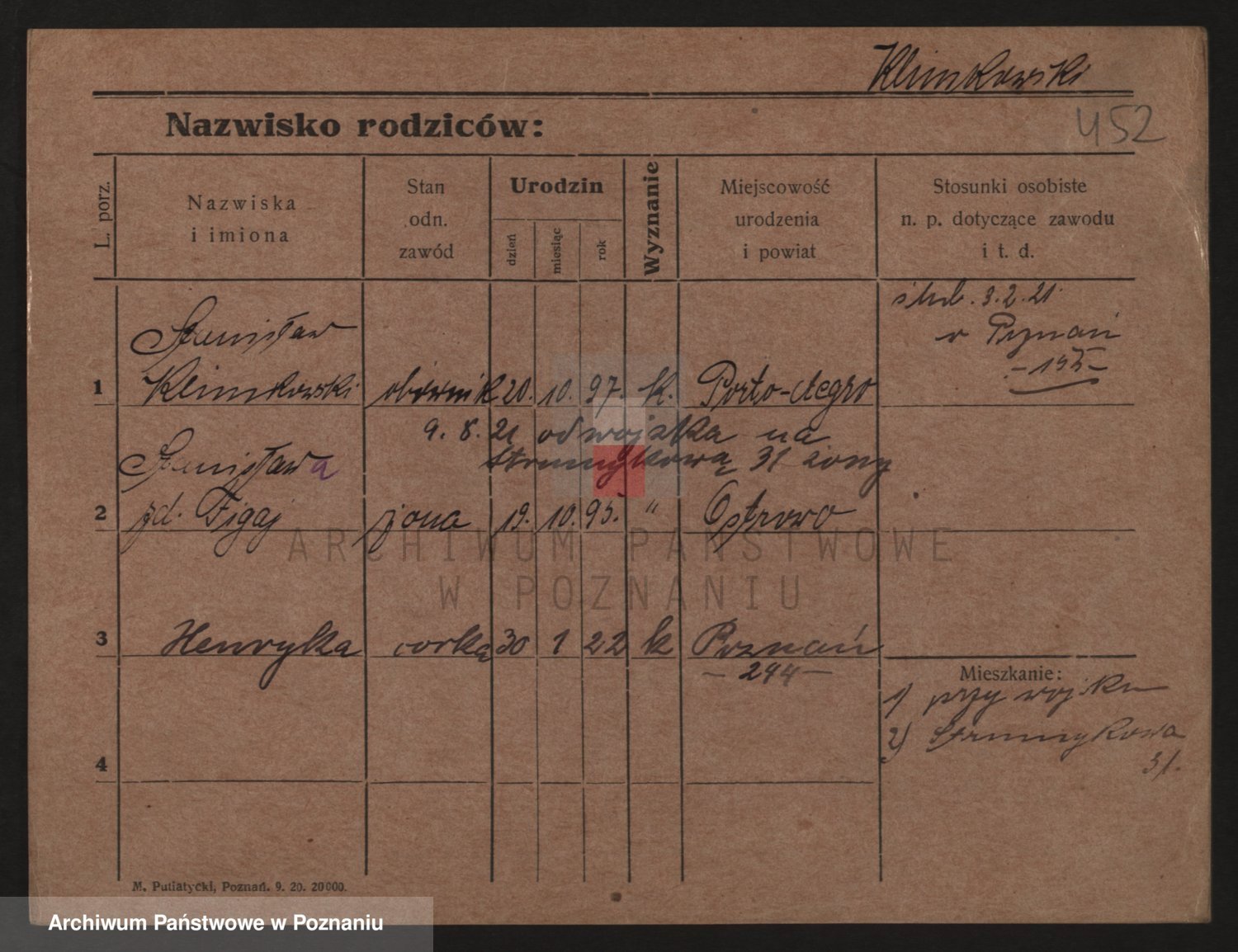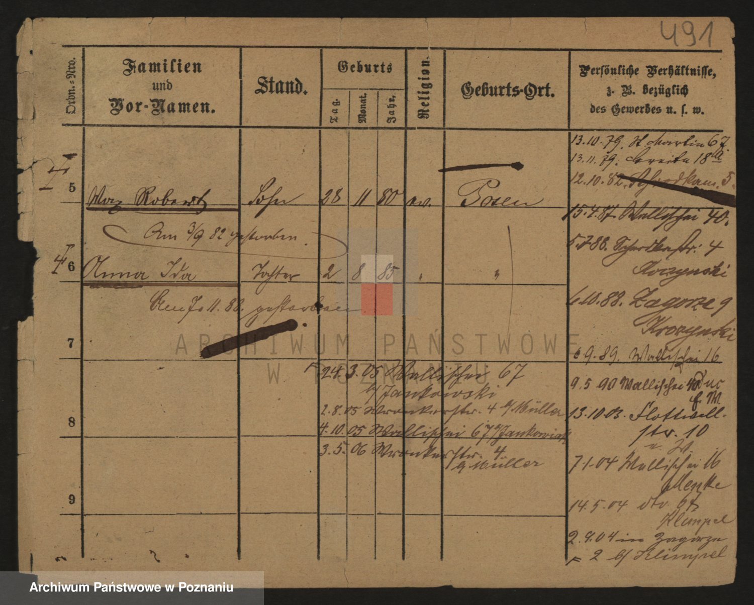 Podgląd karty osobowej dostępny jest po kliknięciu na nazwisko lub ikonkę karty. Można dokonywać powiększenia (ikony na górze) lub przechodzić między kolejnymi skanami (strzałki po bokach).