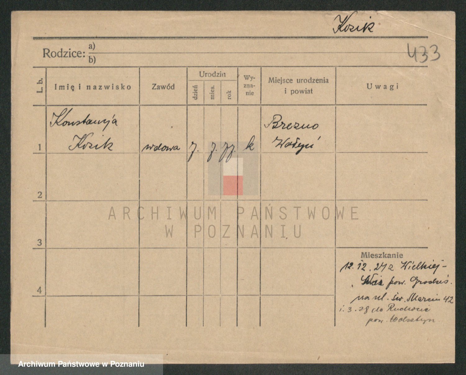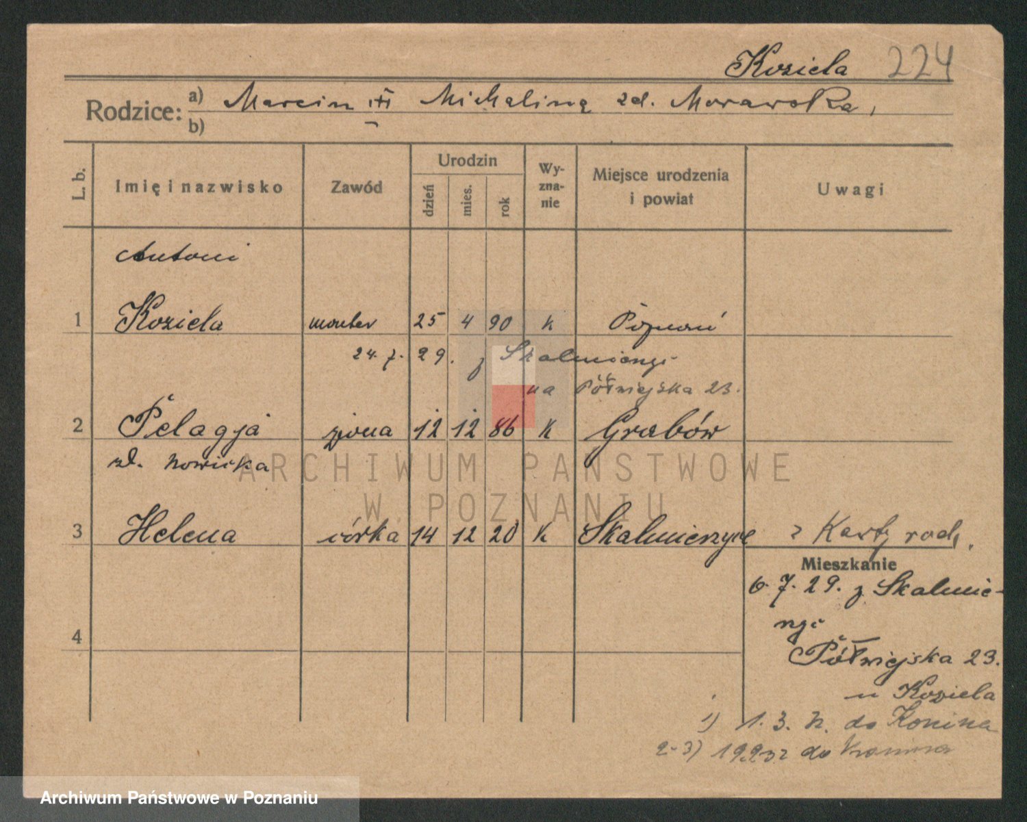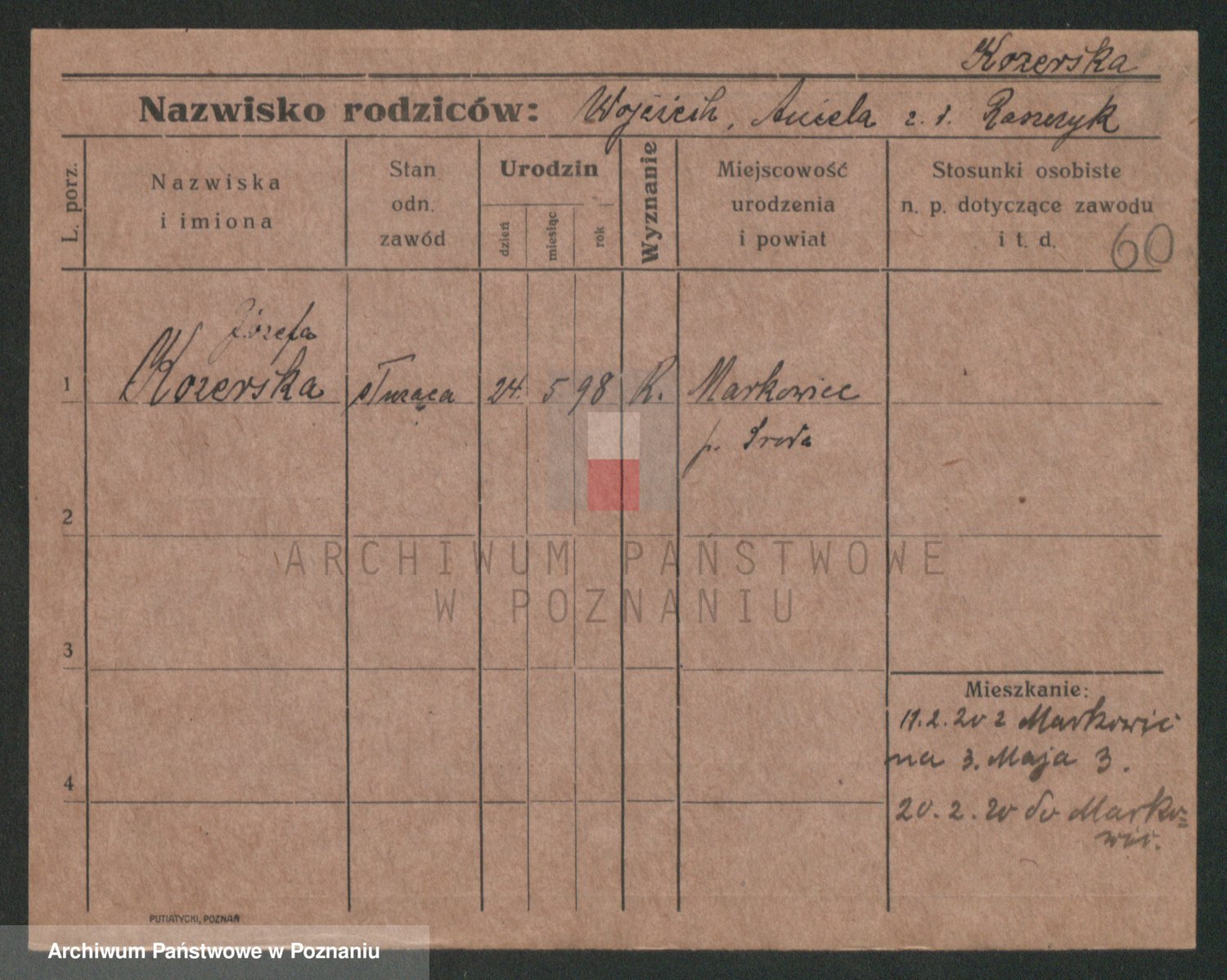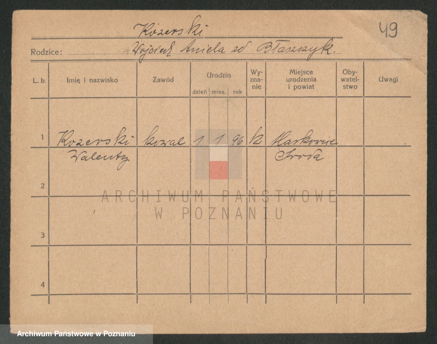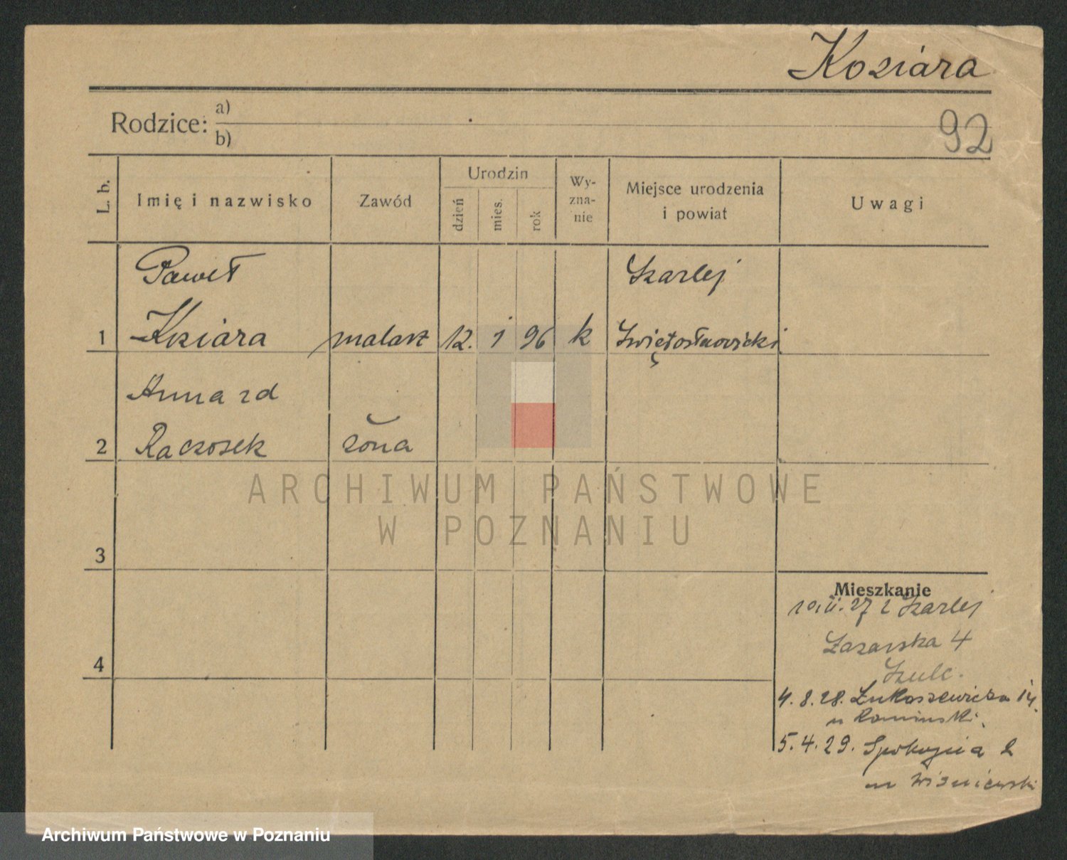 Podgląd karty osobowej dostępny jest po kliknięciu na nazwisko lub ikonkę karty. Można dokonywać powiększenia (ikony na górze) lub przechodzić między kolejnymi skanami (strzałki po bokach).