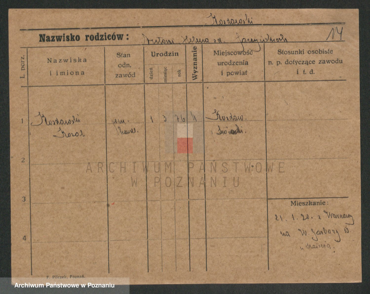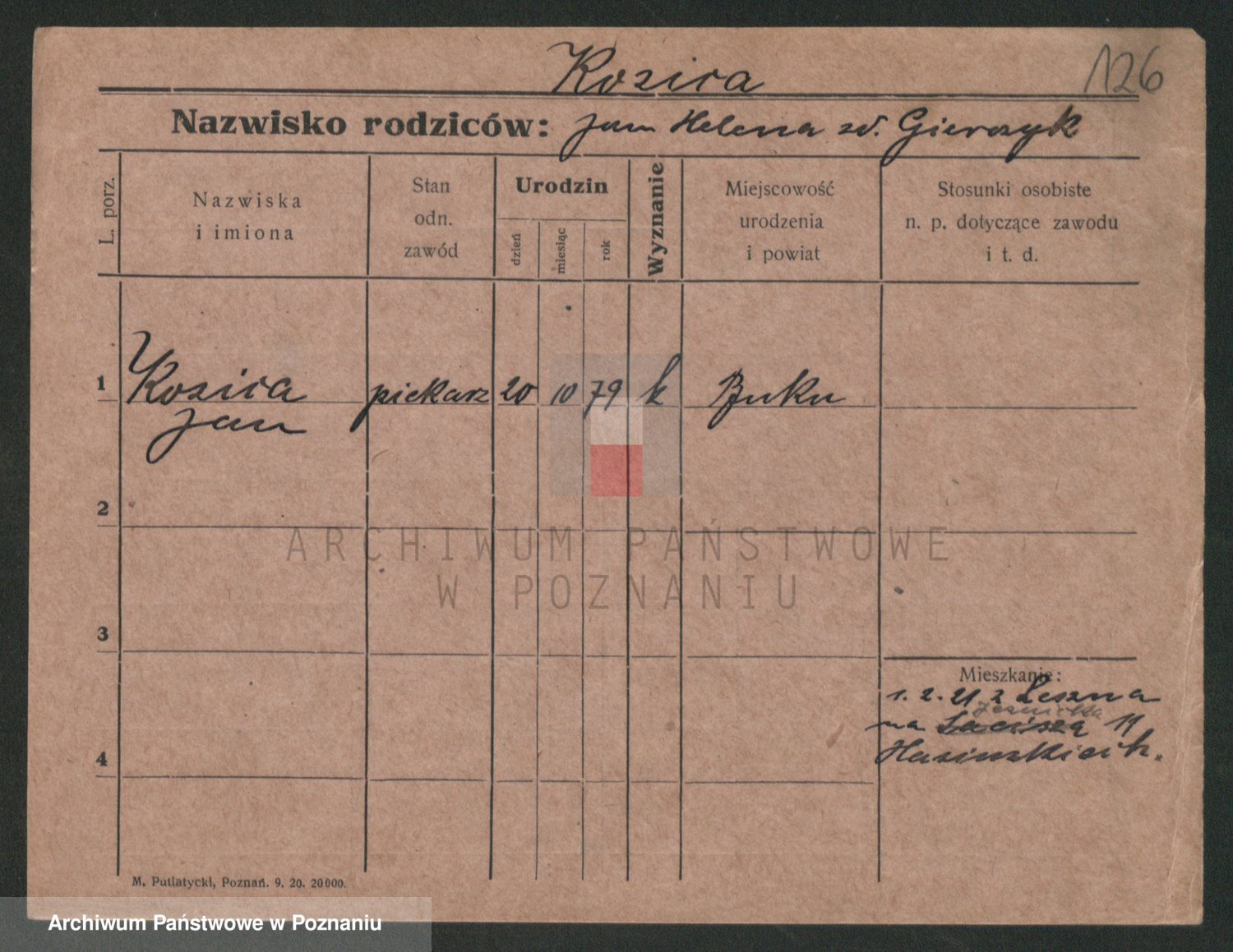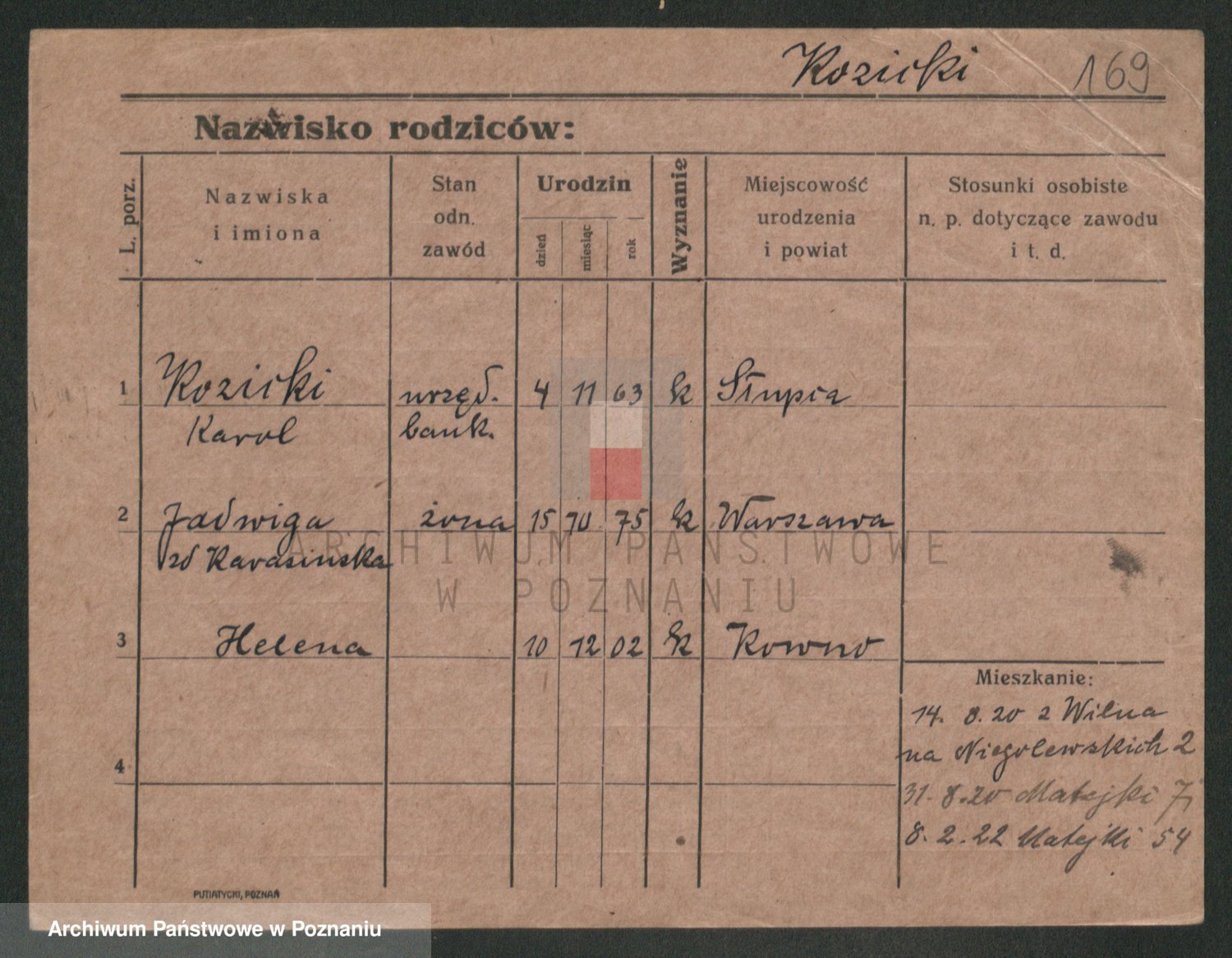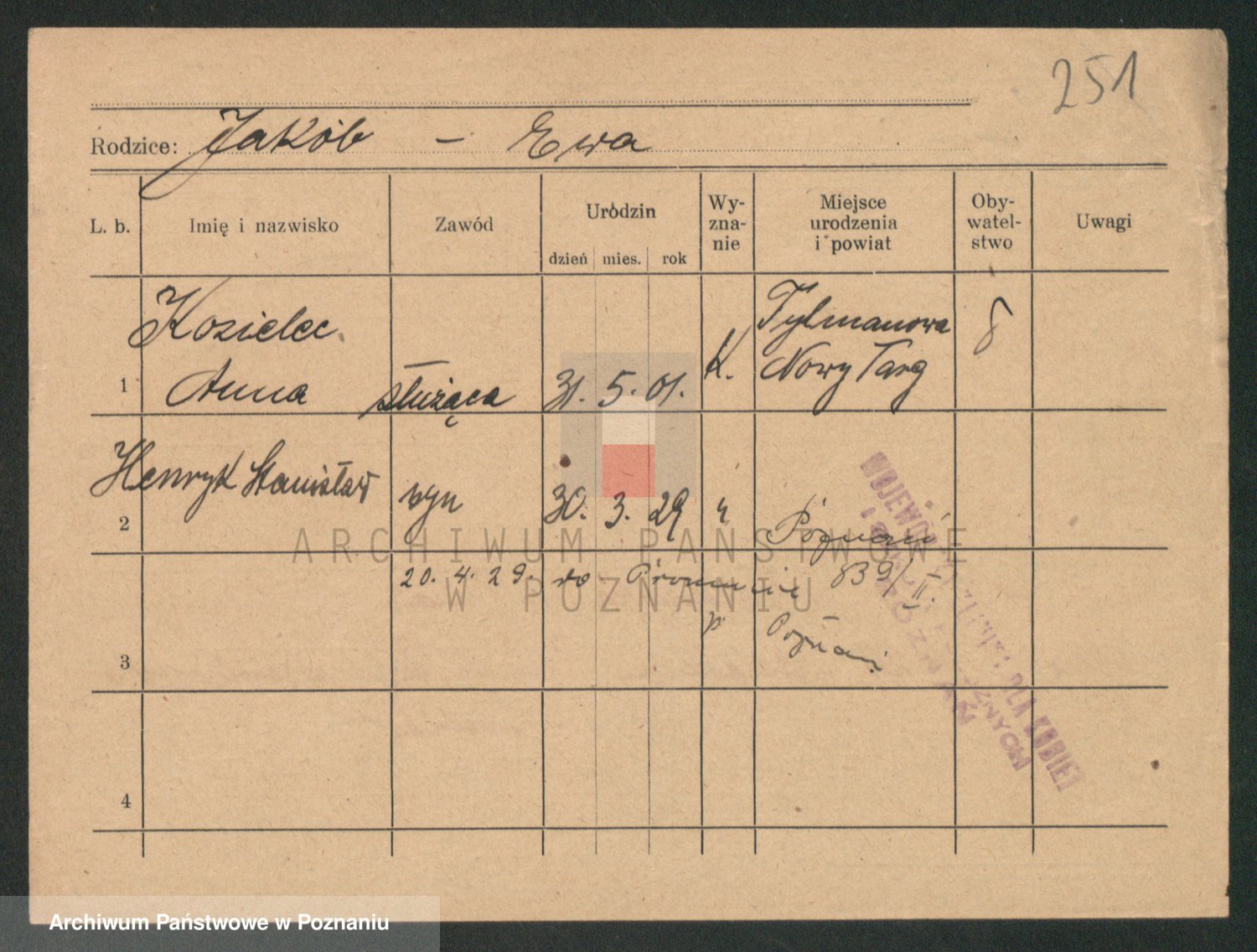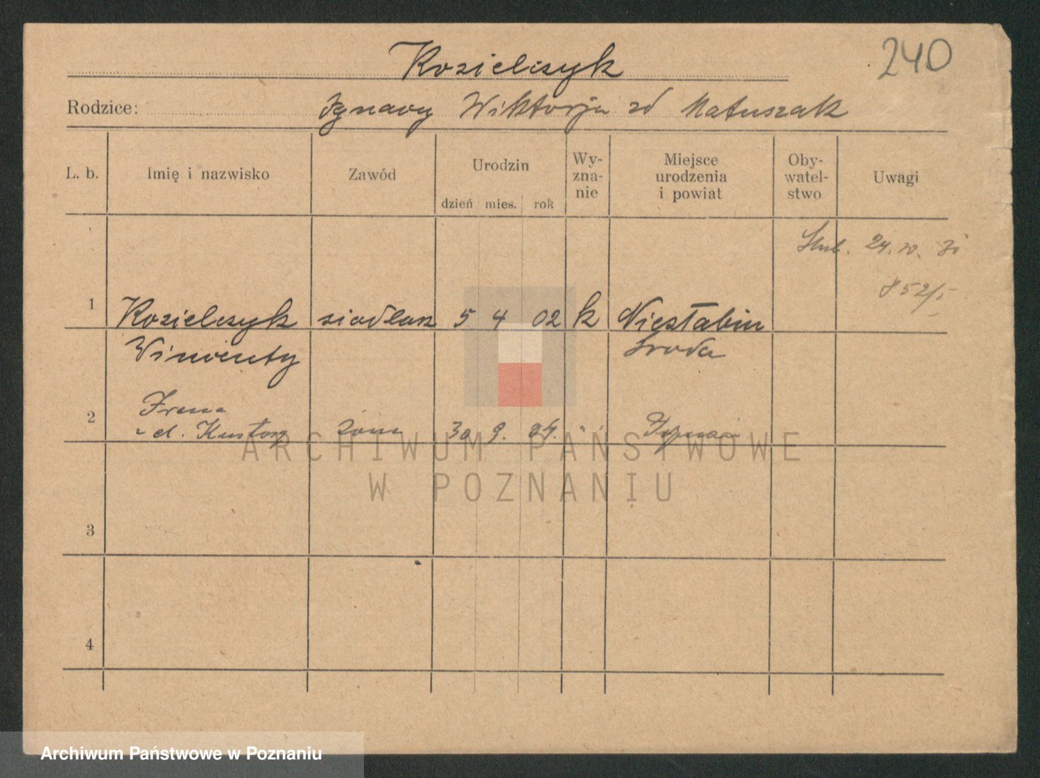 Podgląd karty osobowej dostępny jest po kliknięciu na nazwisko lub ikonkę karty. Można dokonywać powiększenia (ikony na górze) lub przechodzić między kolejnymi skanami (strzałki po bokach).