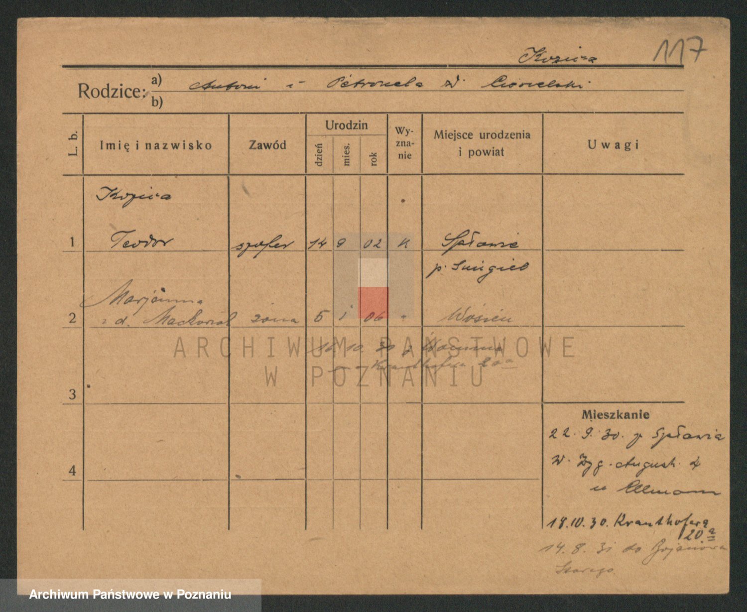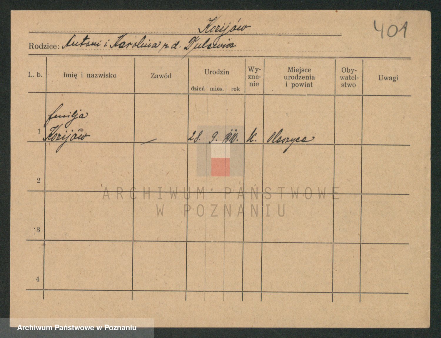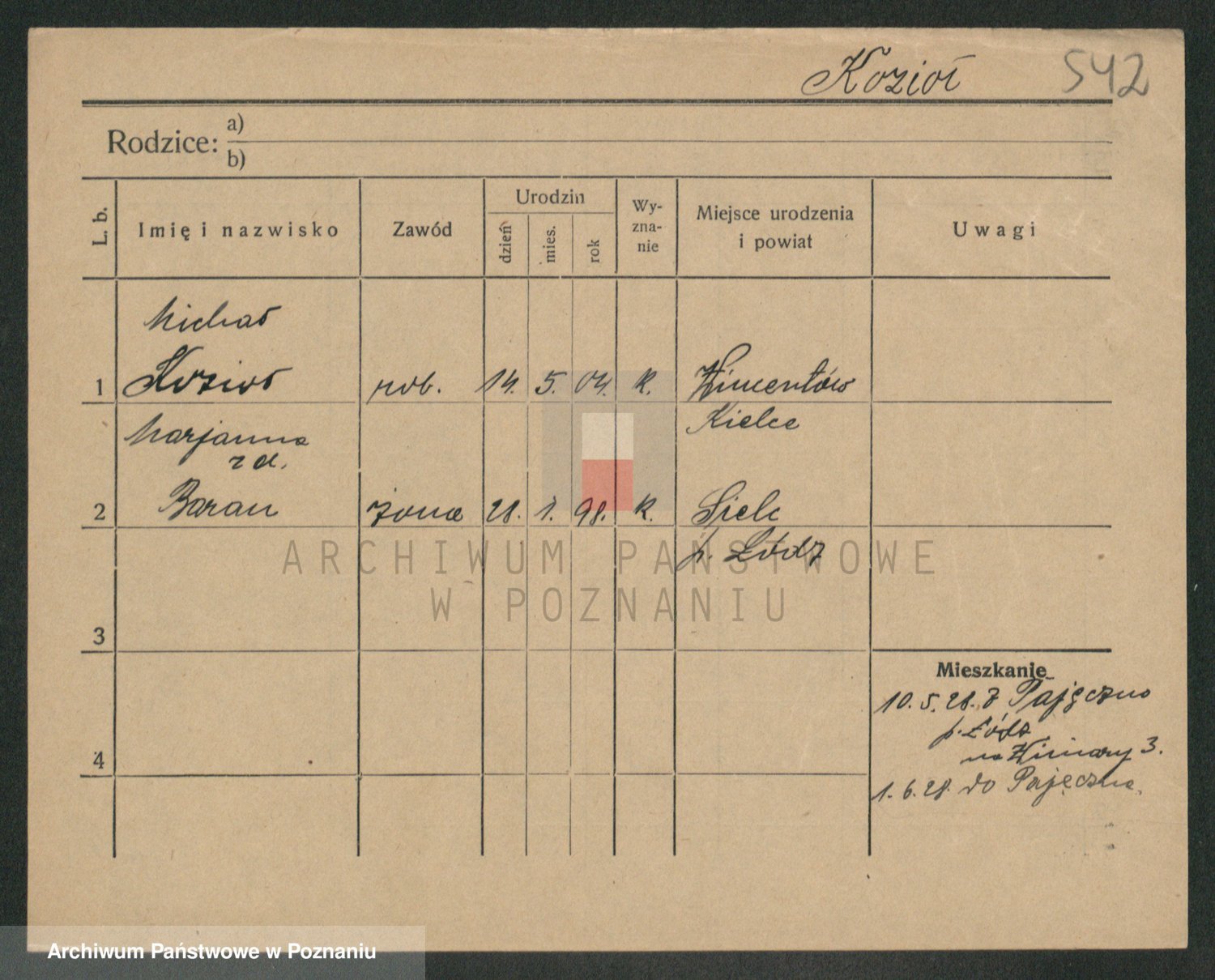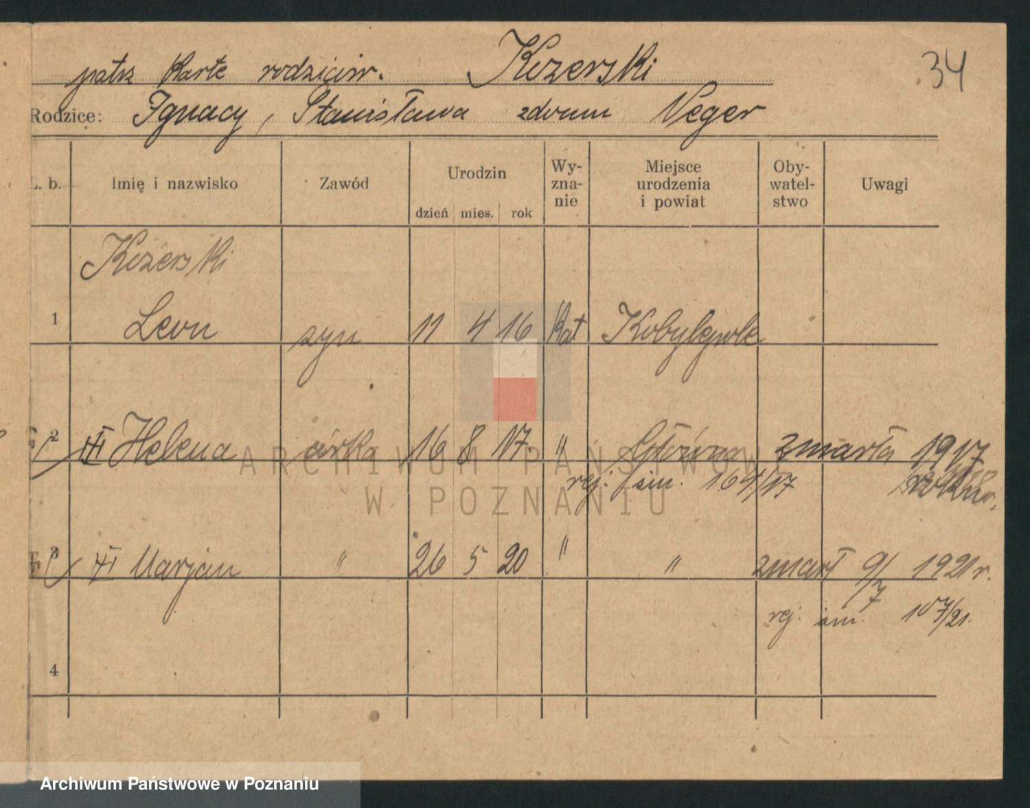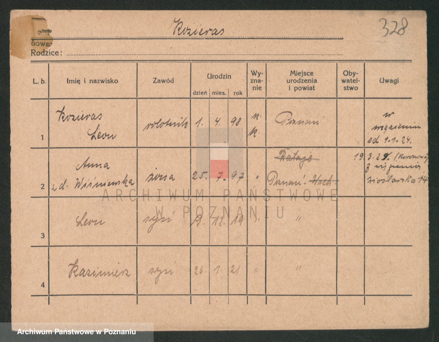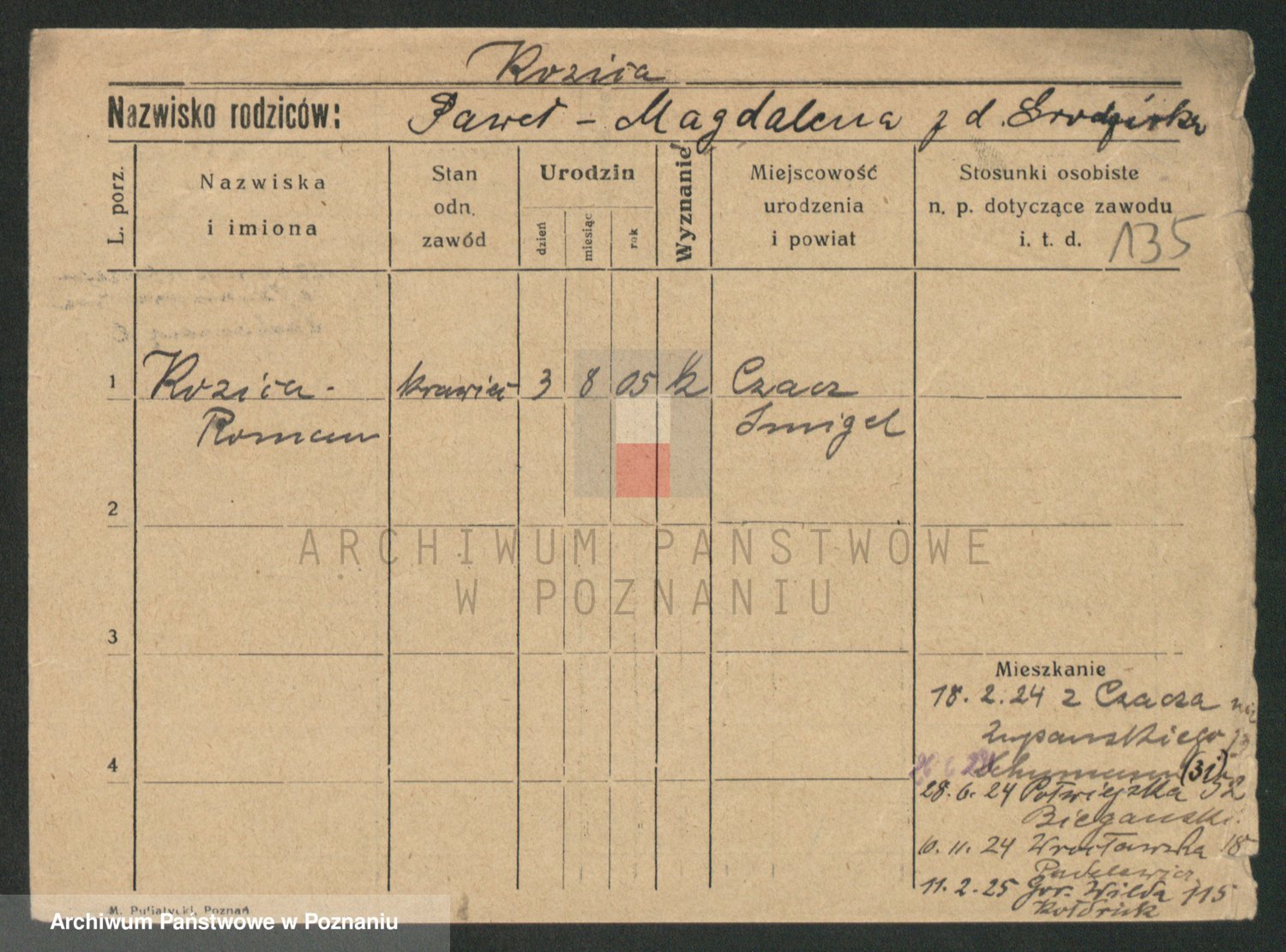 Podgląd karty osobowej dostępny jest po kliknięciu na nazwisko lub ikonkę karty. Można dokonywać powiększenia (ikony na górze) lub przechodzić między kolejnymi skanami (strzałki po bokach).
