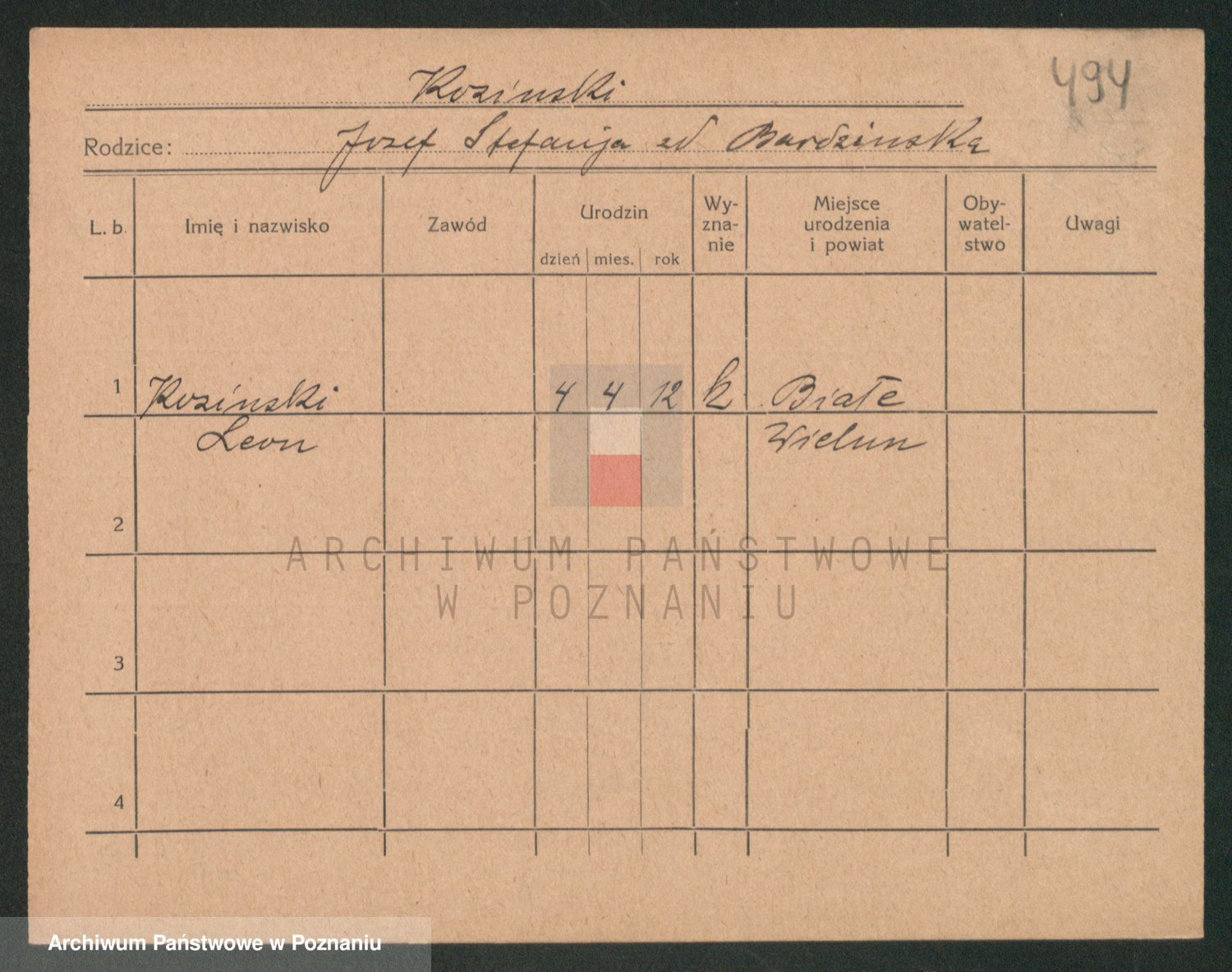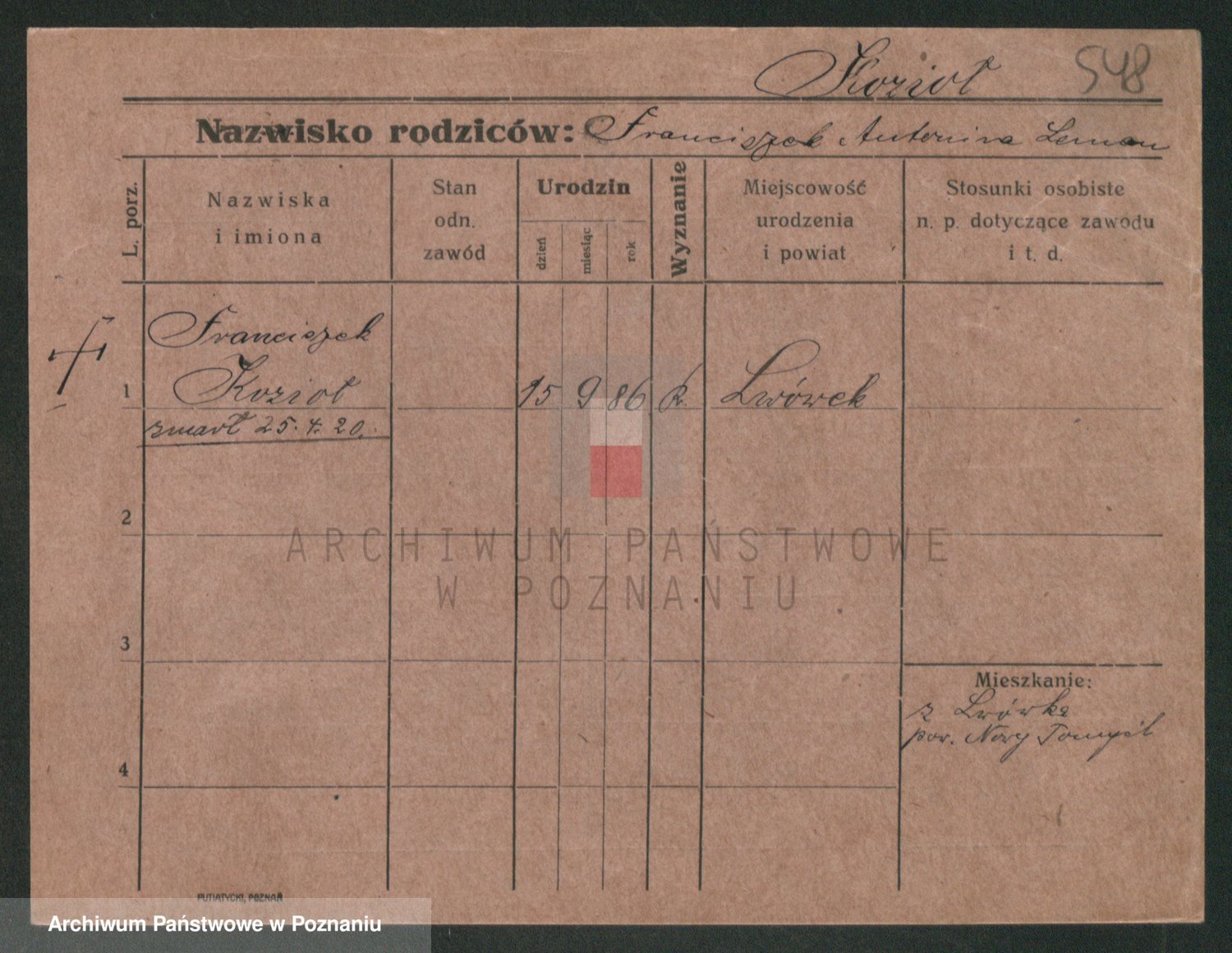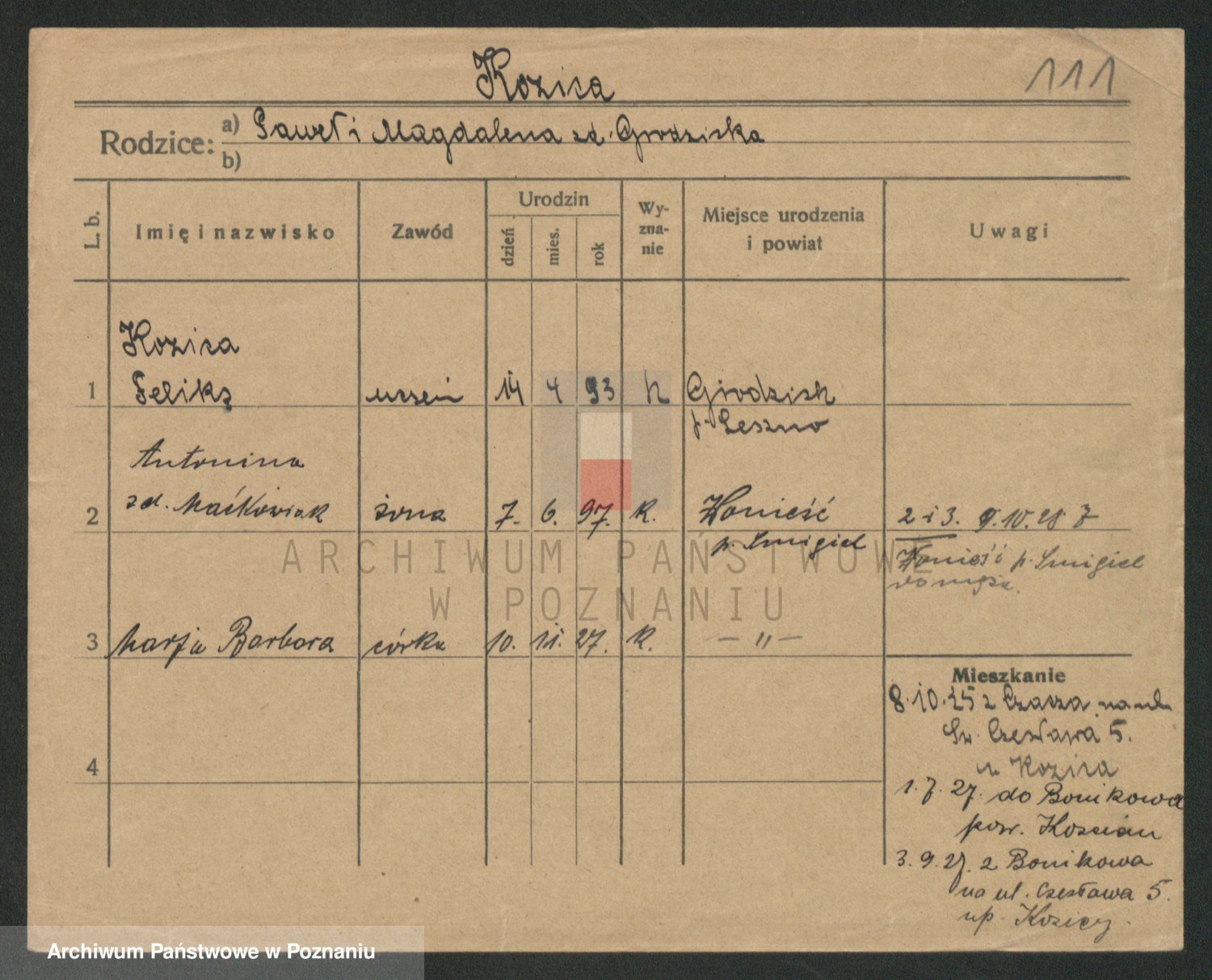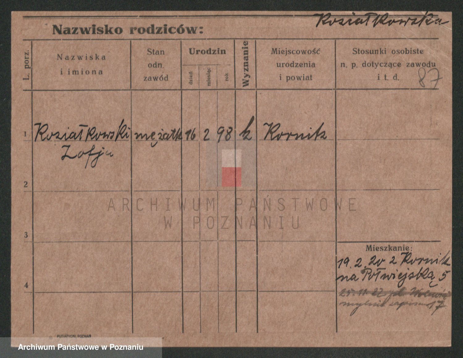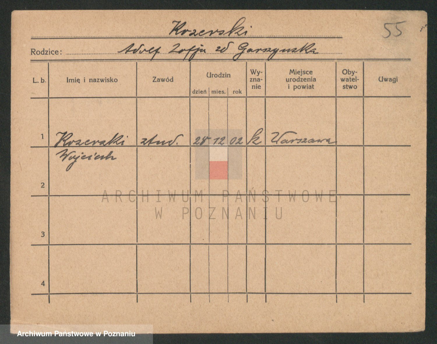 Podgląd karty osobowej dostępny jest po kliknięciu na nazwisko lub ikonkę karty. Można dokonywać powiększenia (ikony na górze) lub przechodzić między kolejnymi skanami (strzałki po bokach).