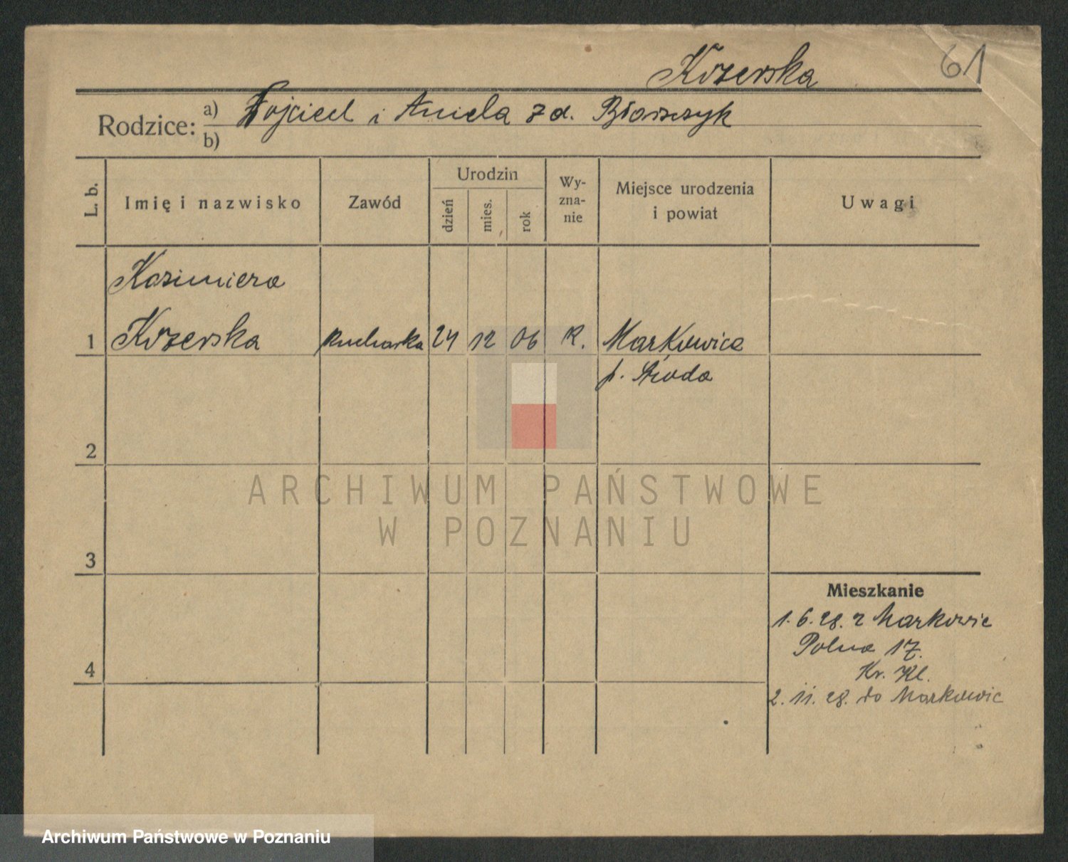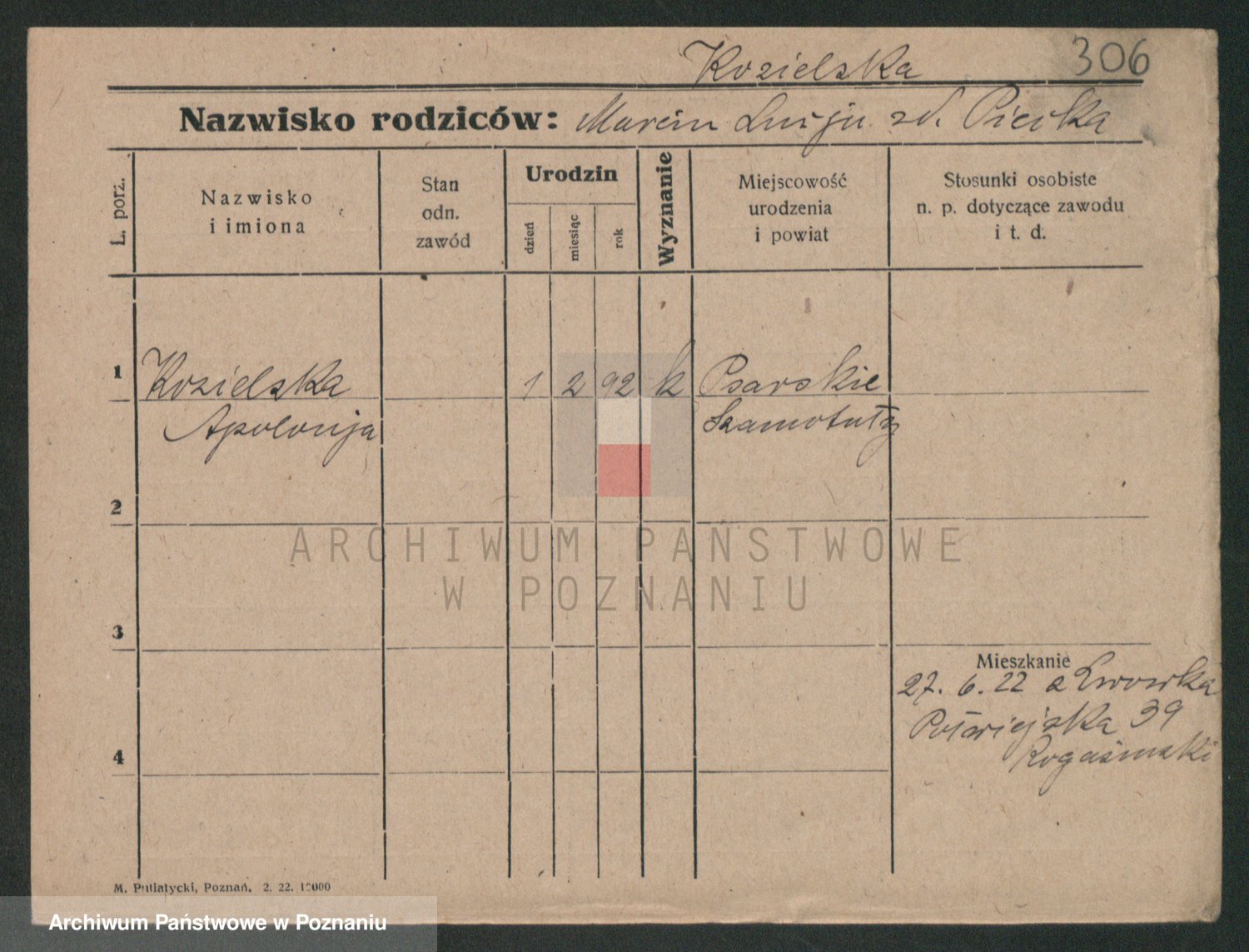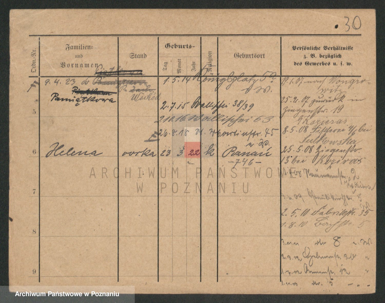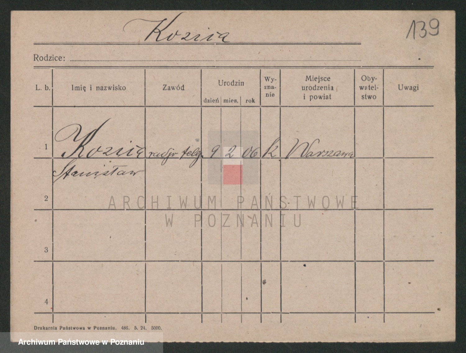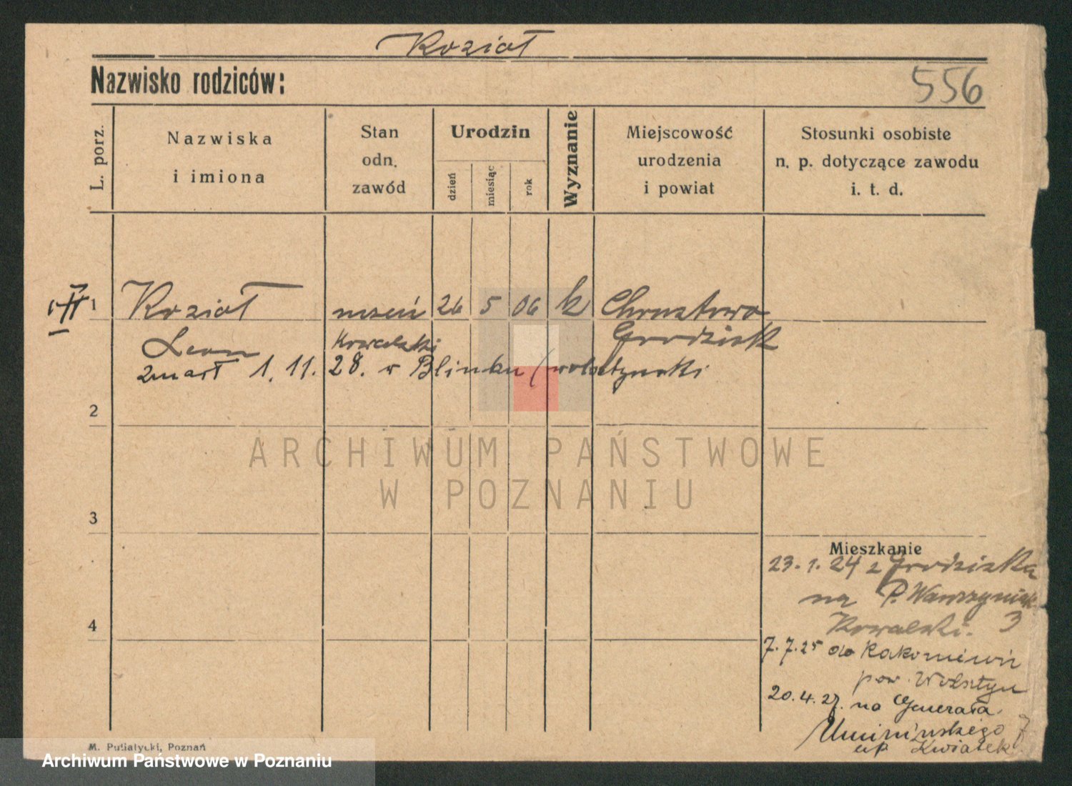 Podgląd karty osobowej dostępny jest po kliknięciu na nazwisko lub ikonkę karty. Można dokonywać powiększenia (ikony na górze) lub przechodzić między kolejnymi skanami (strzałki po bokach).