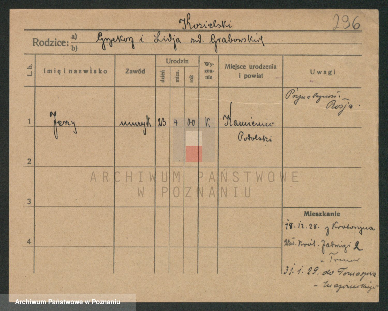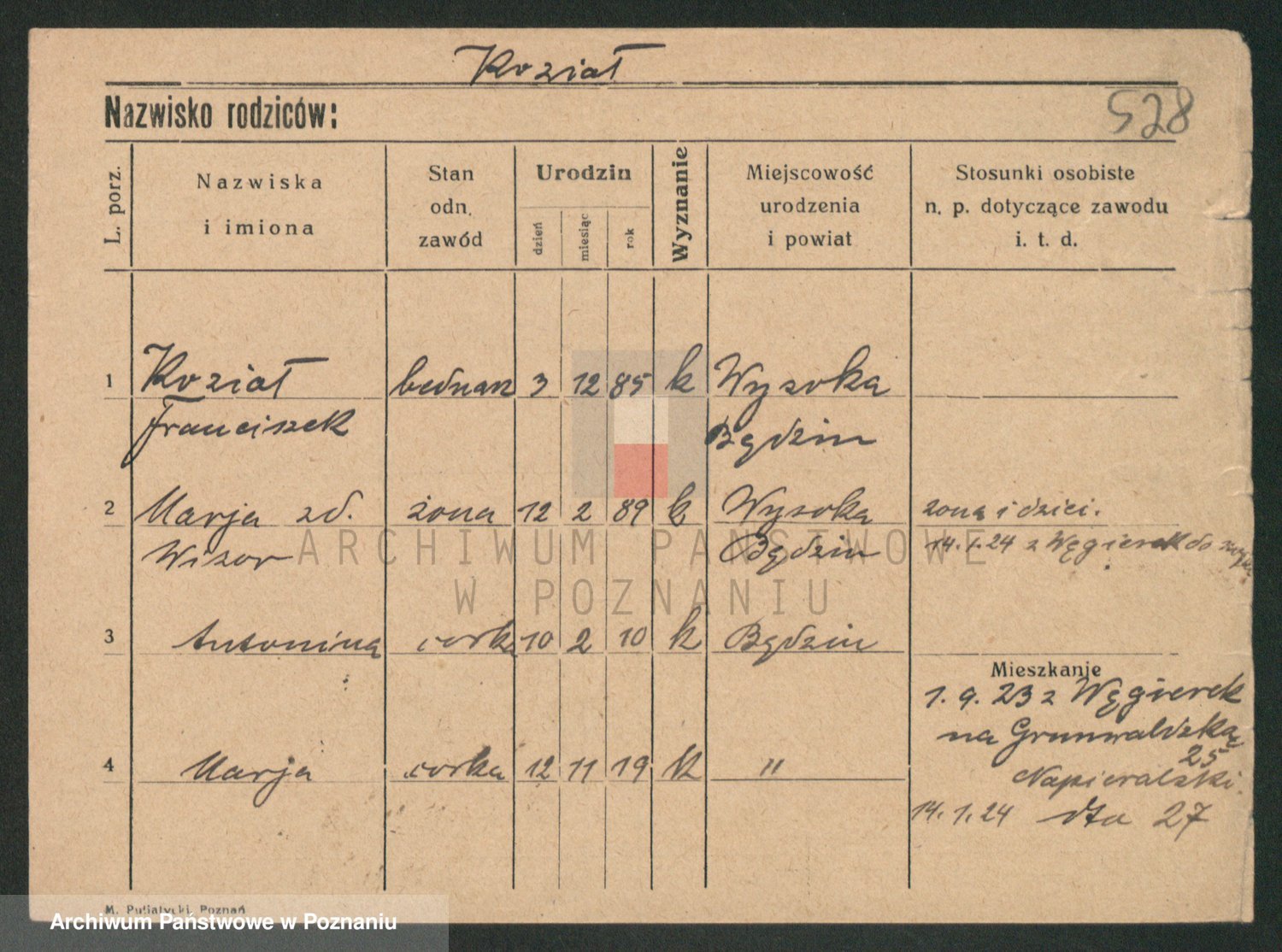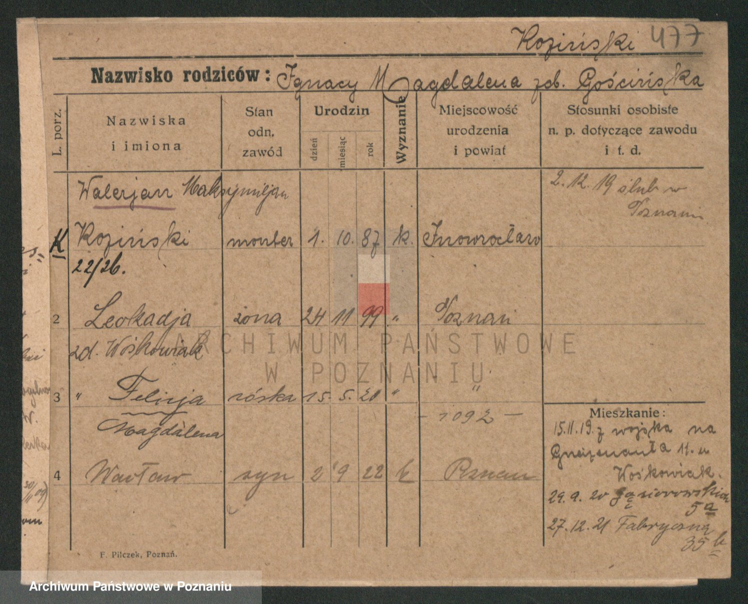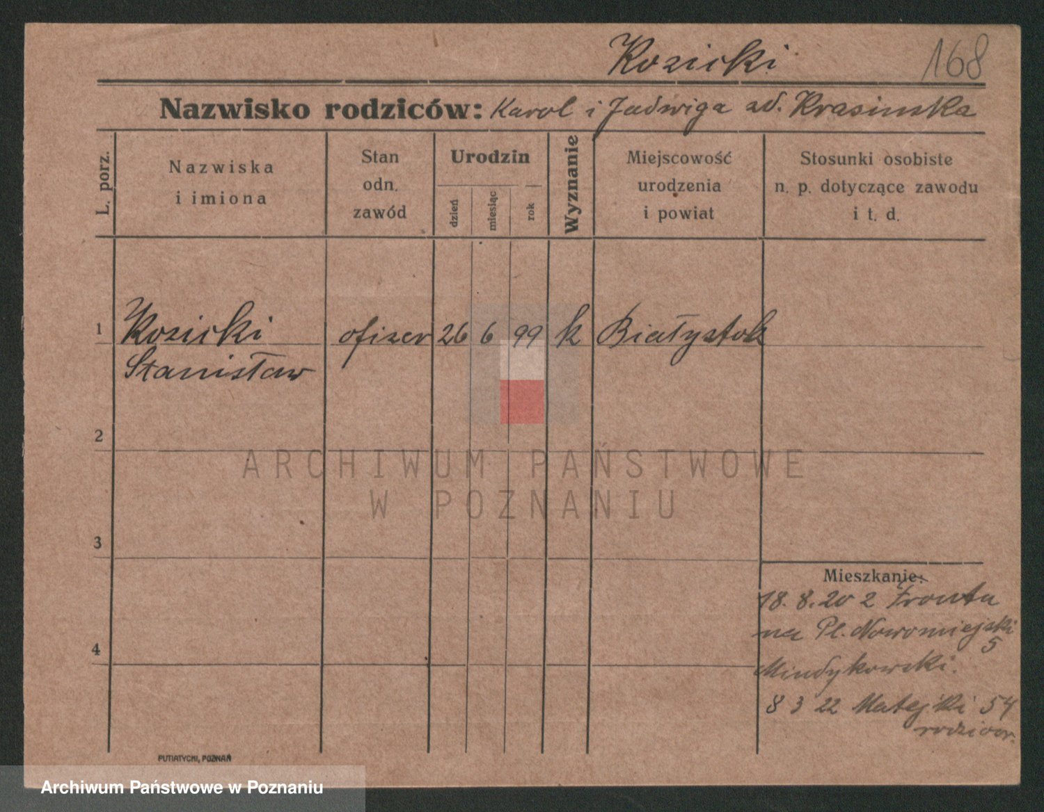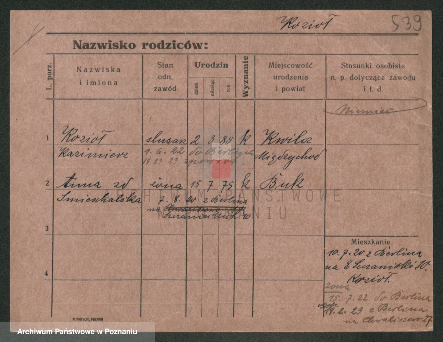 Podgląd karty osobowej dostępny jest po kliknięciu na nazwisko lub ikonkę karty. Można dokonywać powiększenia (ikony na górze) lub przechodzić między kolejnymi skanami (strzałki po bokach).
