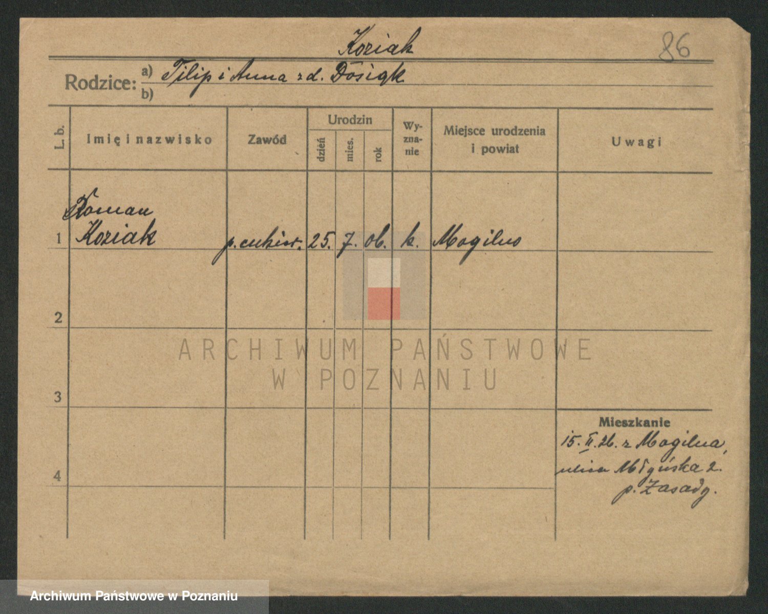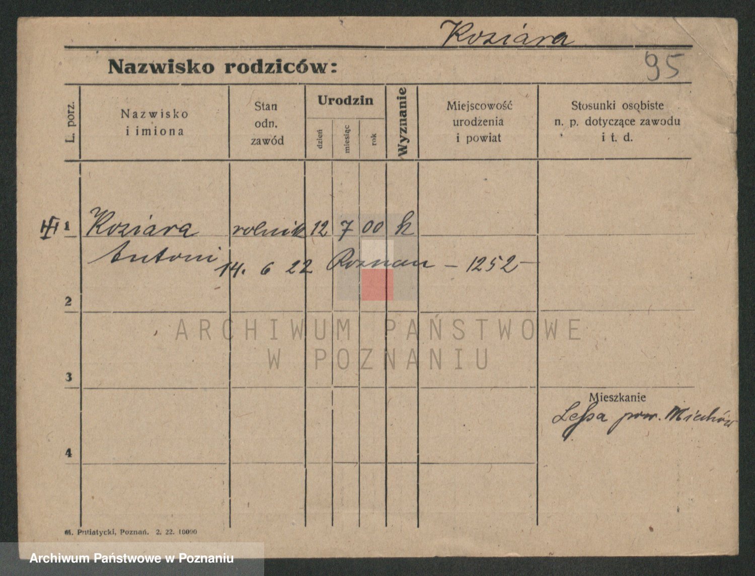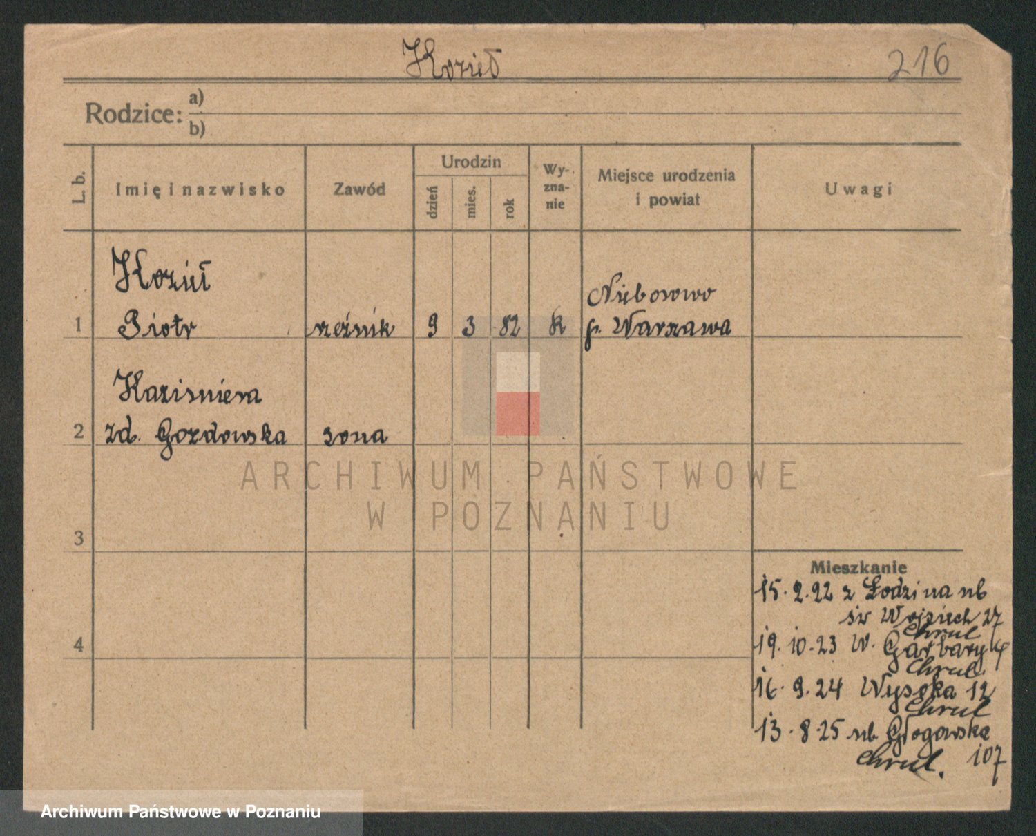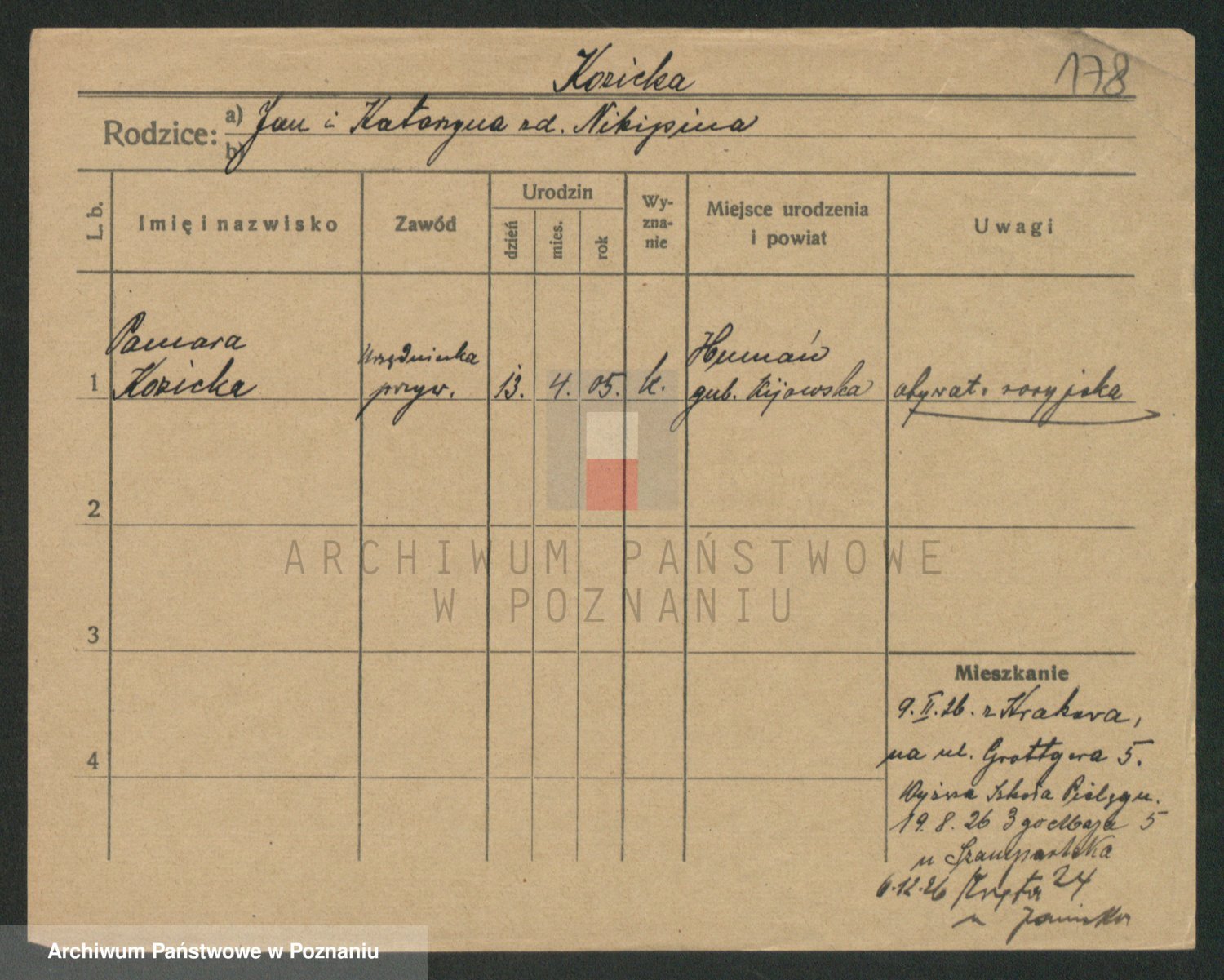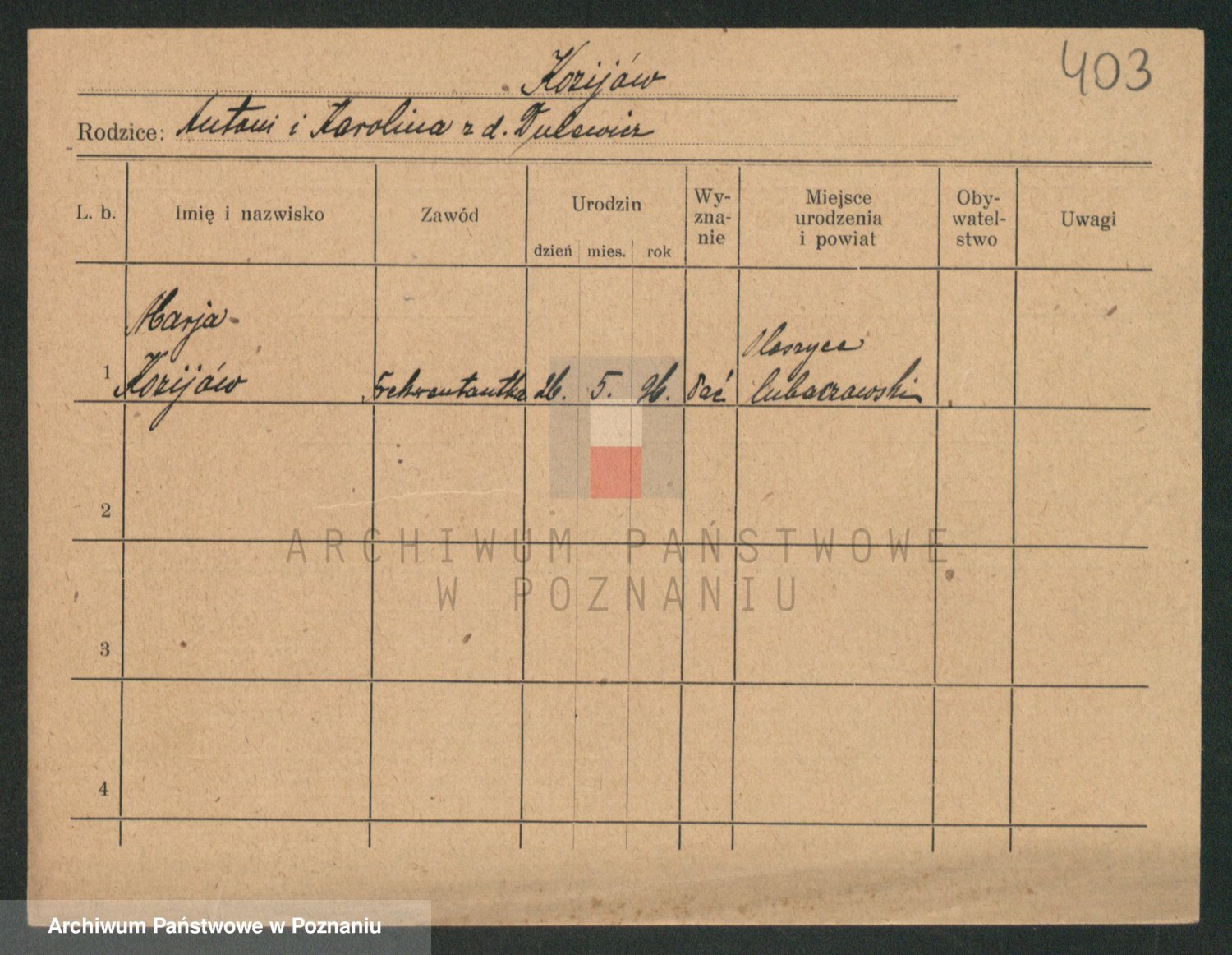 Podgląd karty osobowej dostępny jest po kliknięciu na nazwisko lub ikonkę karty. Można dokonywać powiększenia (ikony na górze) lub przechodzić między kolejnymi skanami (strzałki po bokach).