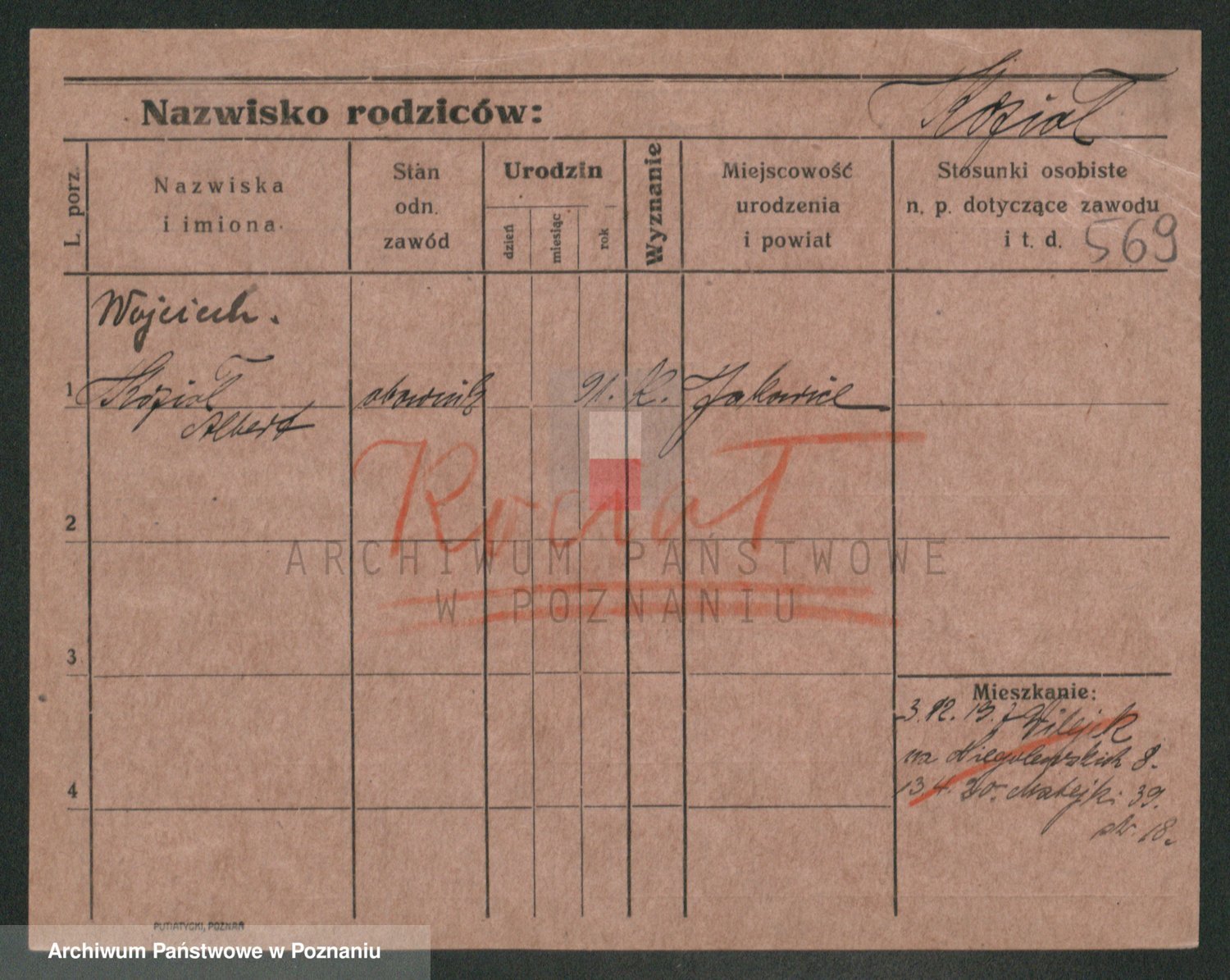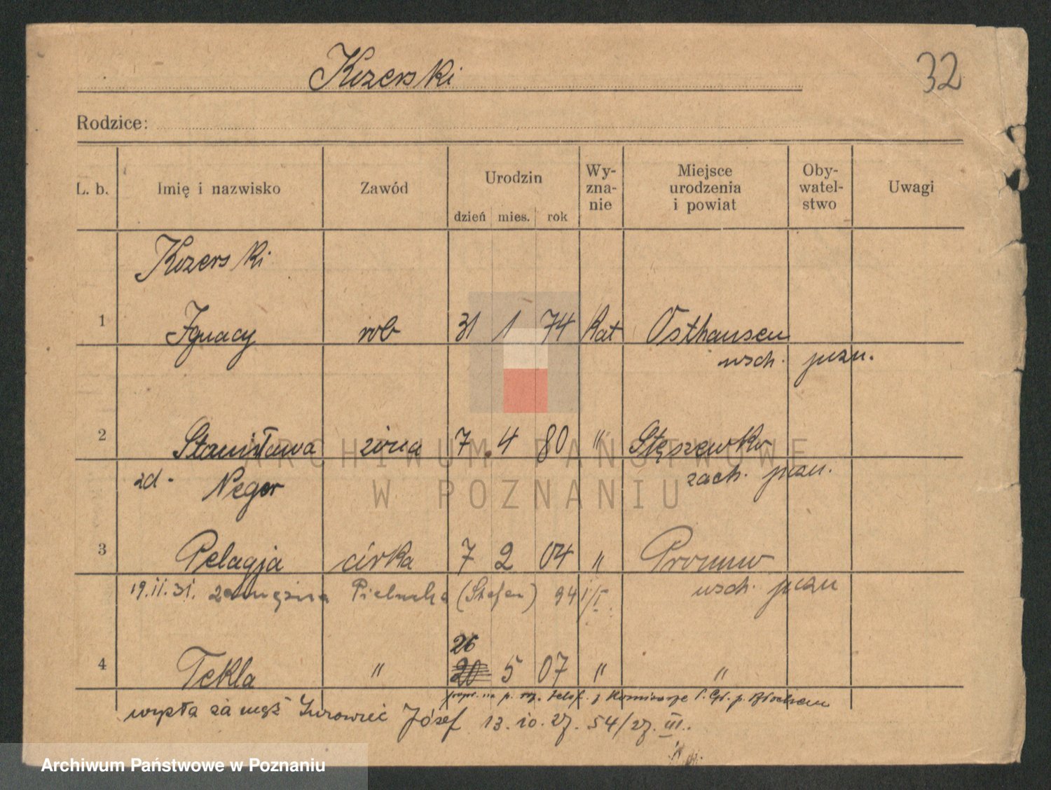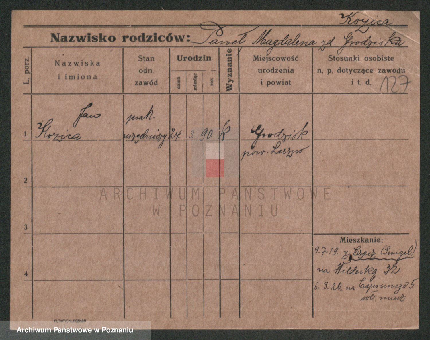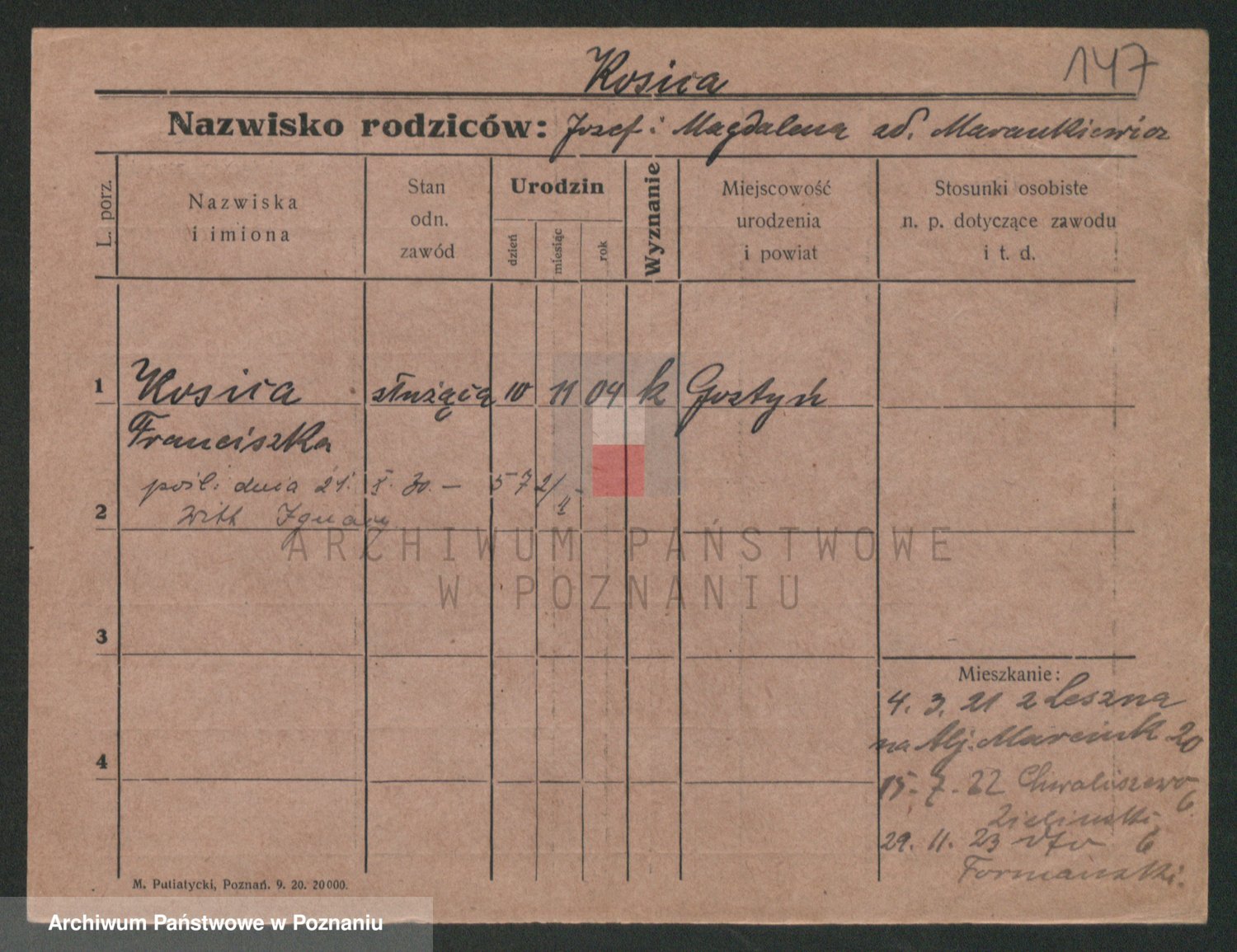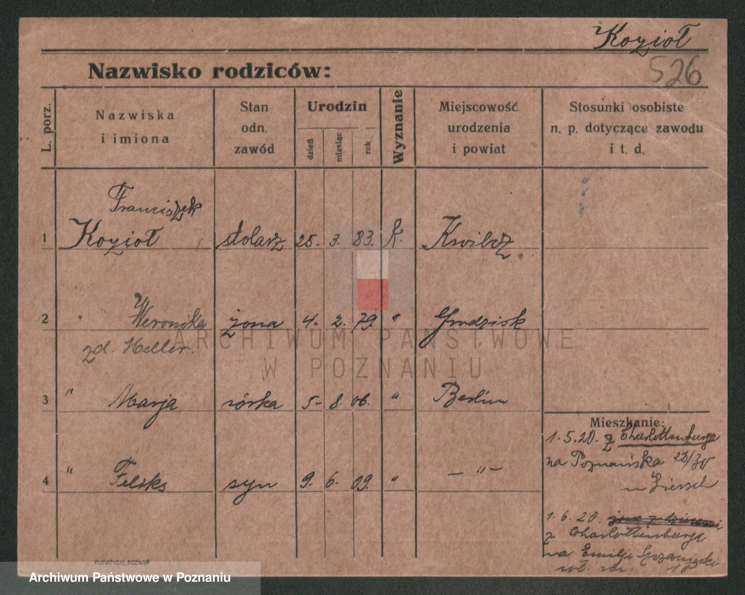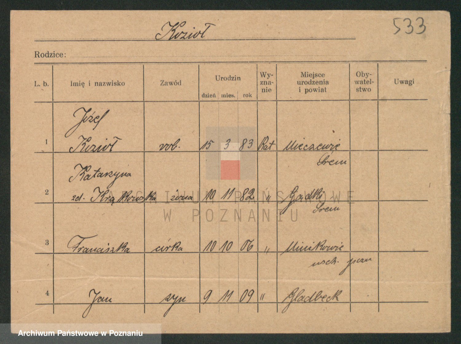 Podgląd karty osobowej dostępny jest po kliknięciu na nazwisko lub ikonkę karty. Można dokonywać powiększenia (ikony na górze) lub przechodzić między kolejnymi skanami (strzałki po bokach).