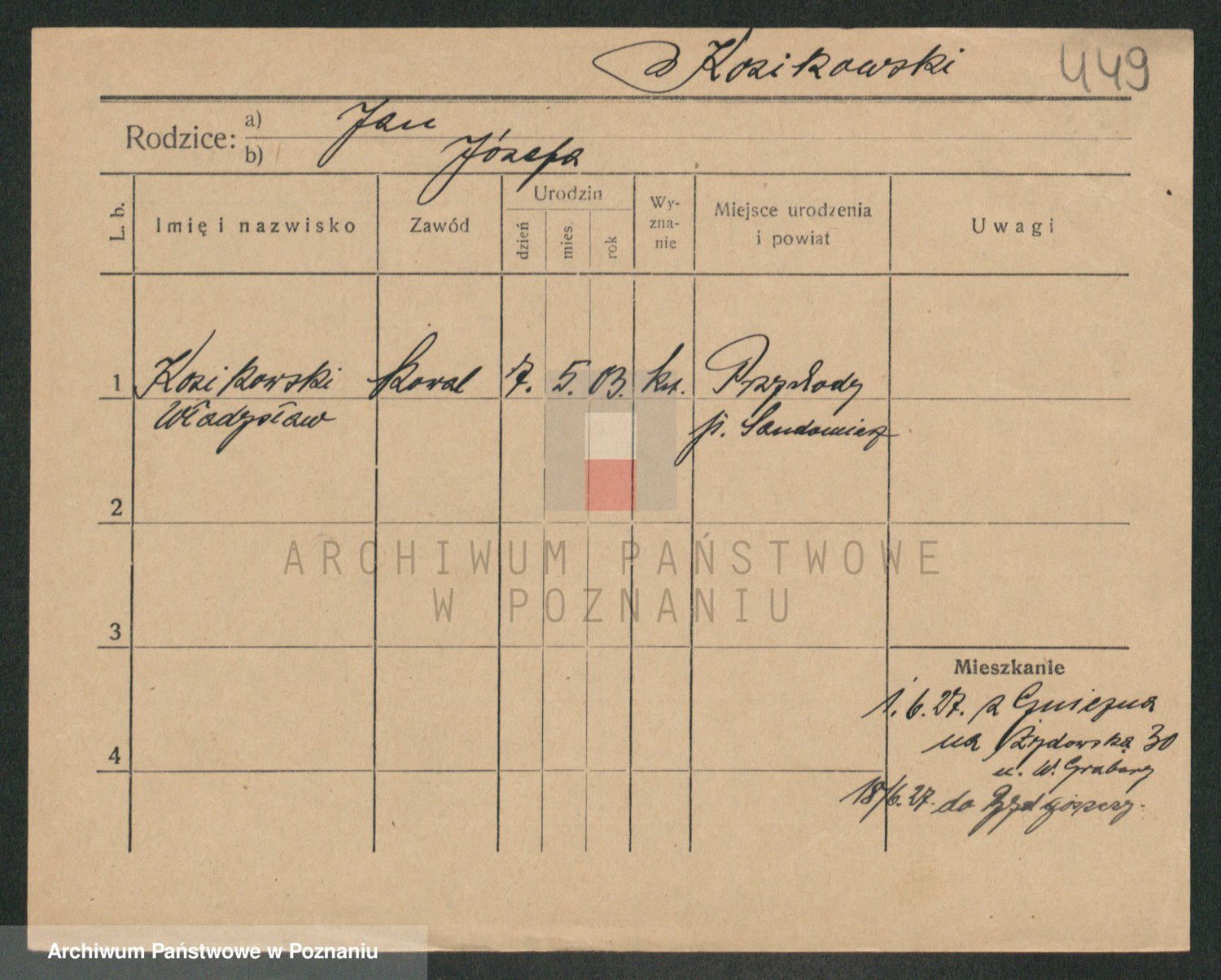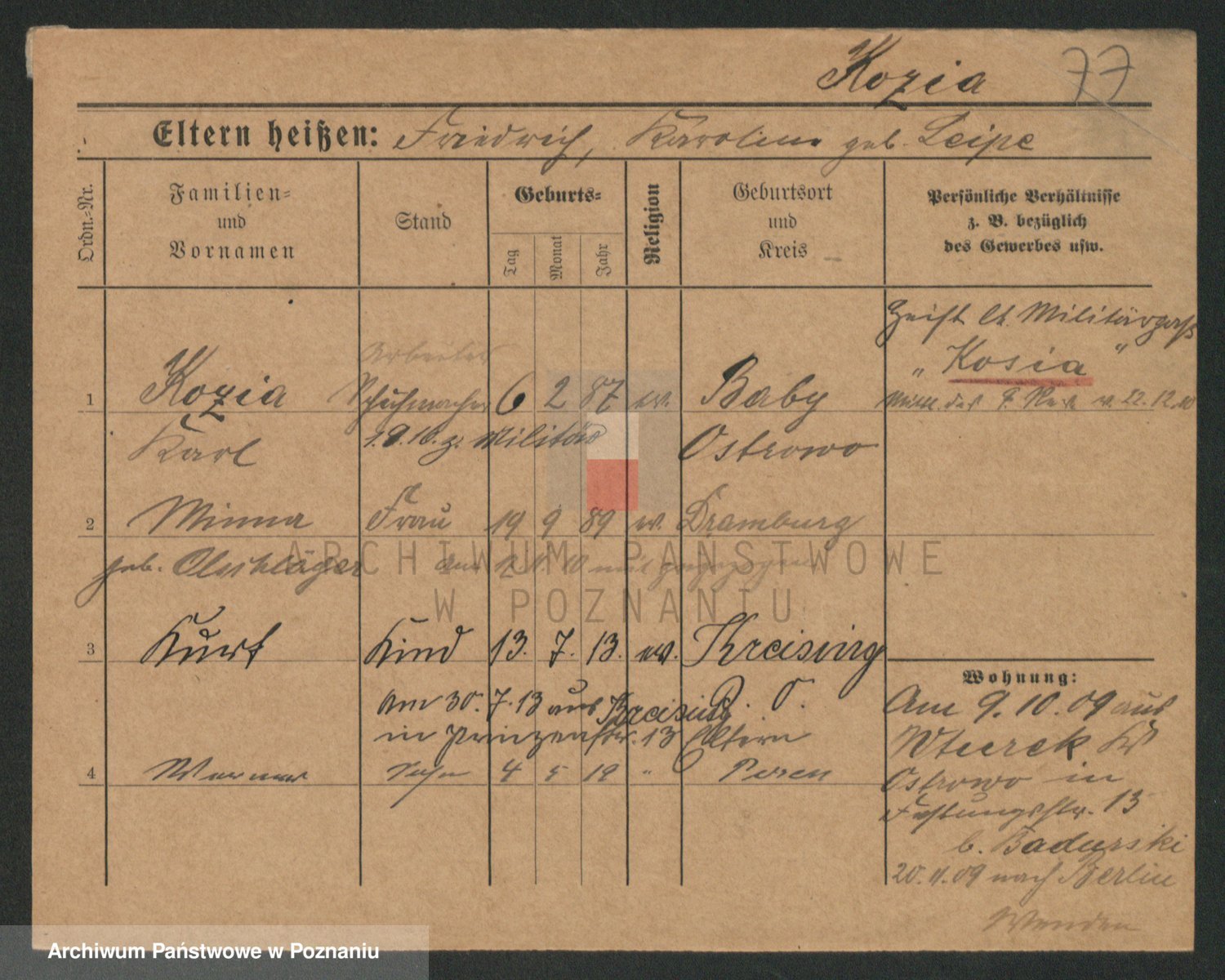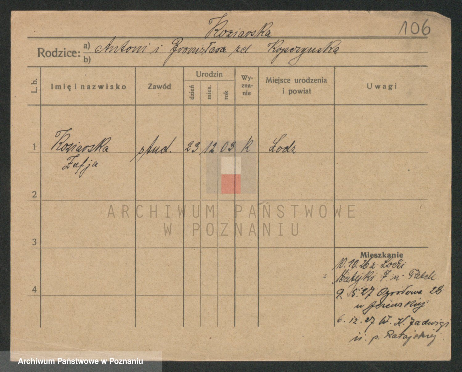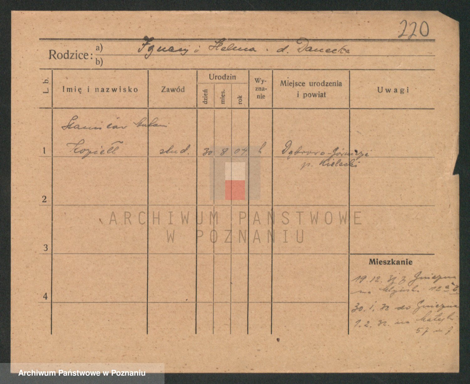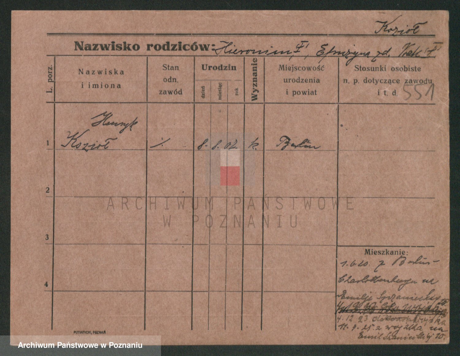 Podgląd karty osobowej dostępny jest po kliknięciu na nazwisko lub ikonkę karty. Można dokonywać powiększenia (ikony na górze) lub przechodzić między kolejnymi skanami (strzałki po bokach).