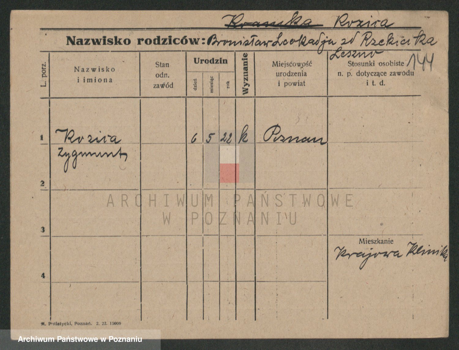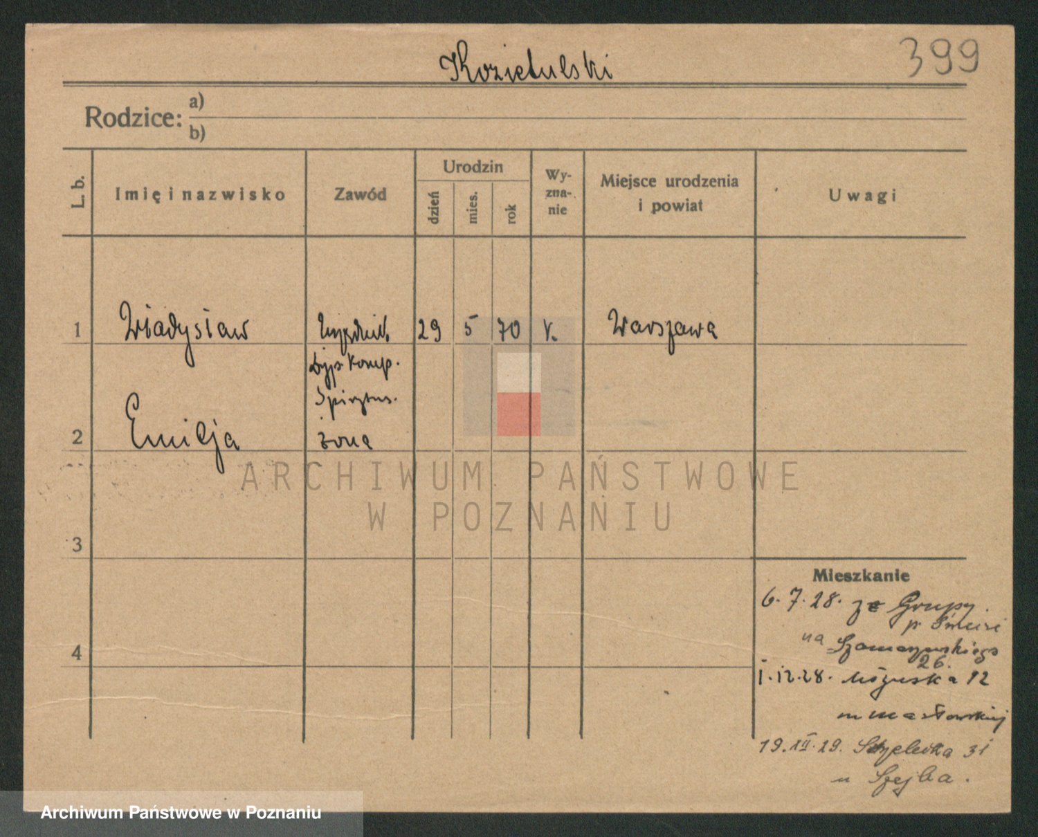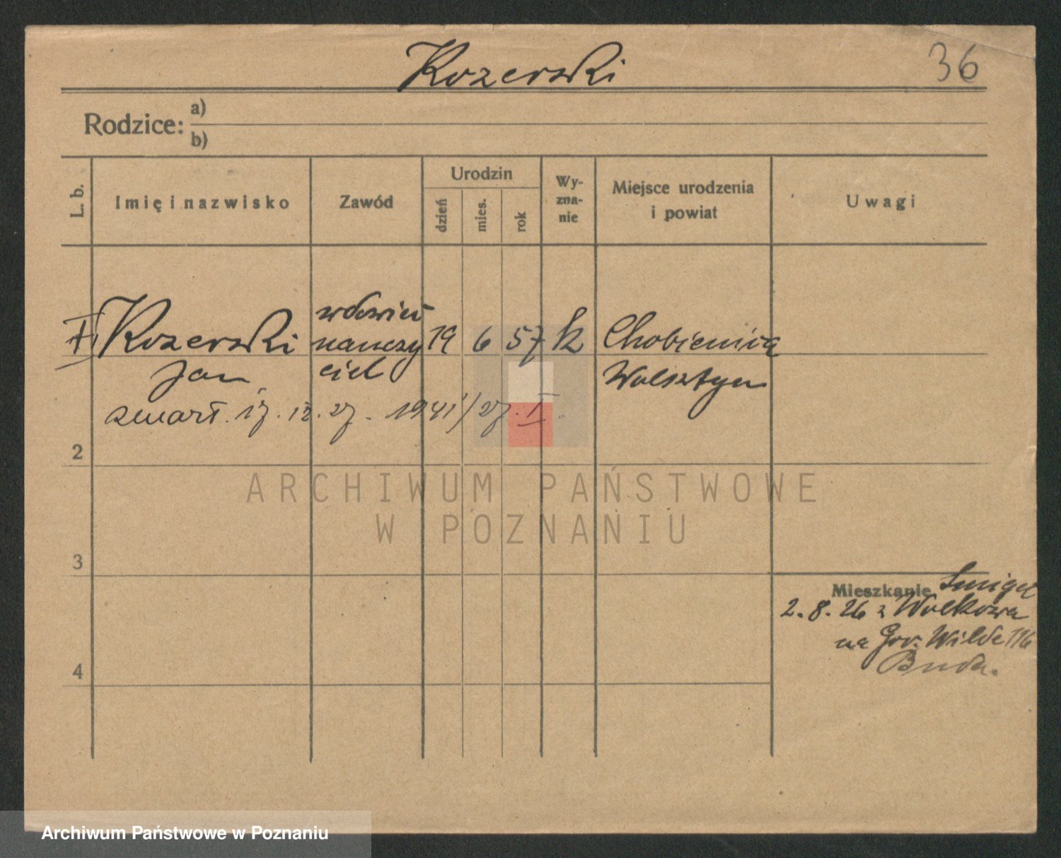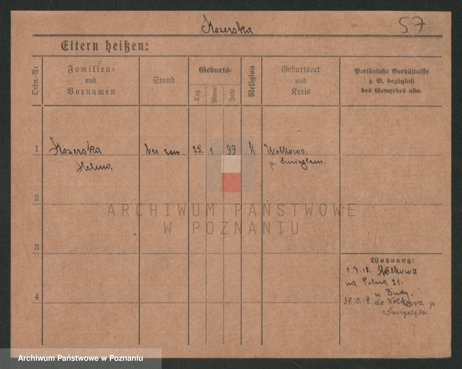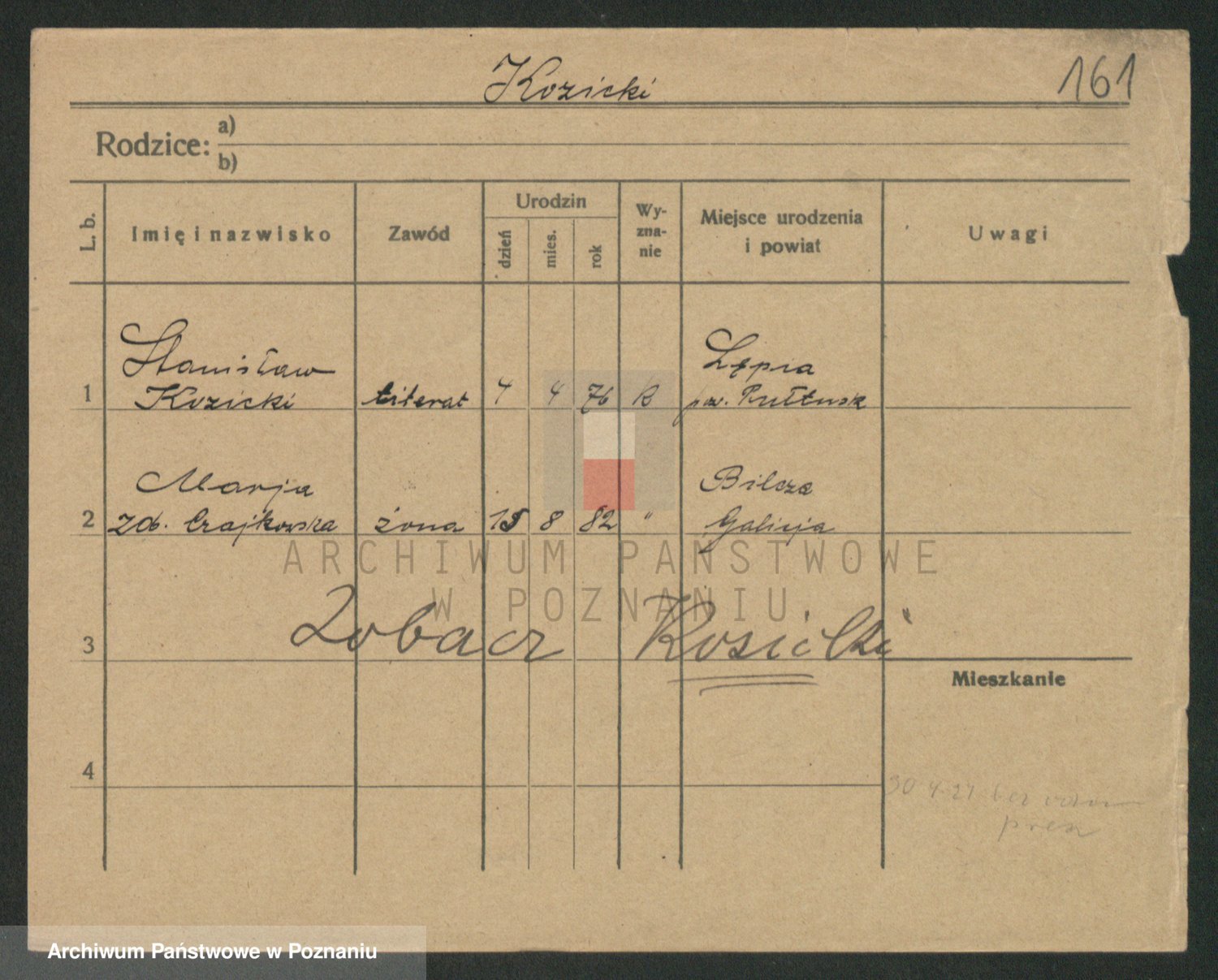 Podgląd karty osobowej dostępny jest po kliknięciu na nazwisko lub ikonkę karty. Można dokonywać powiększenia (ikony na górze) lub przechodzić między kolejnymi skanami (strzałki po bokach).