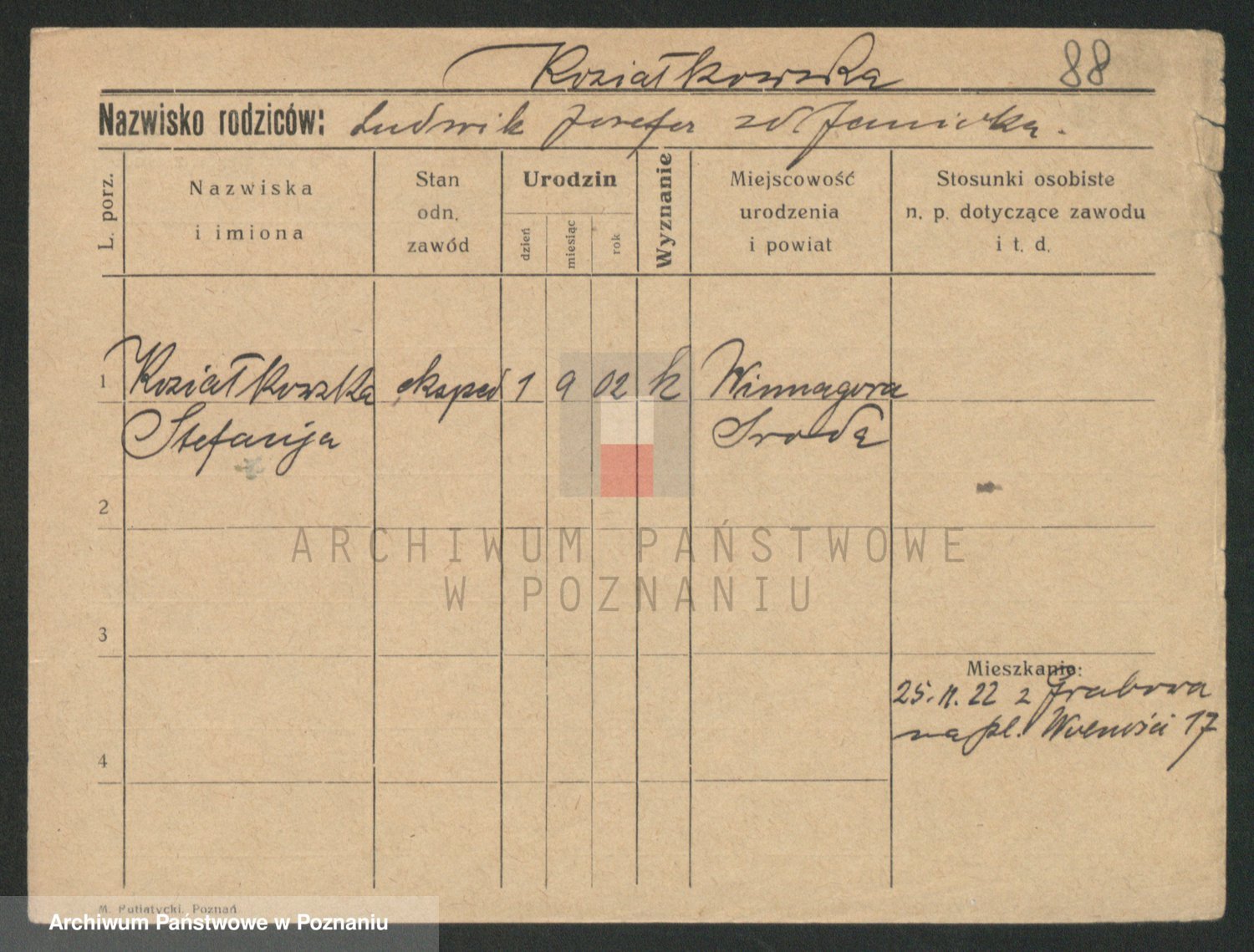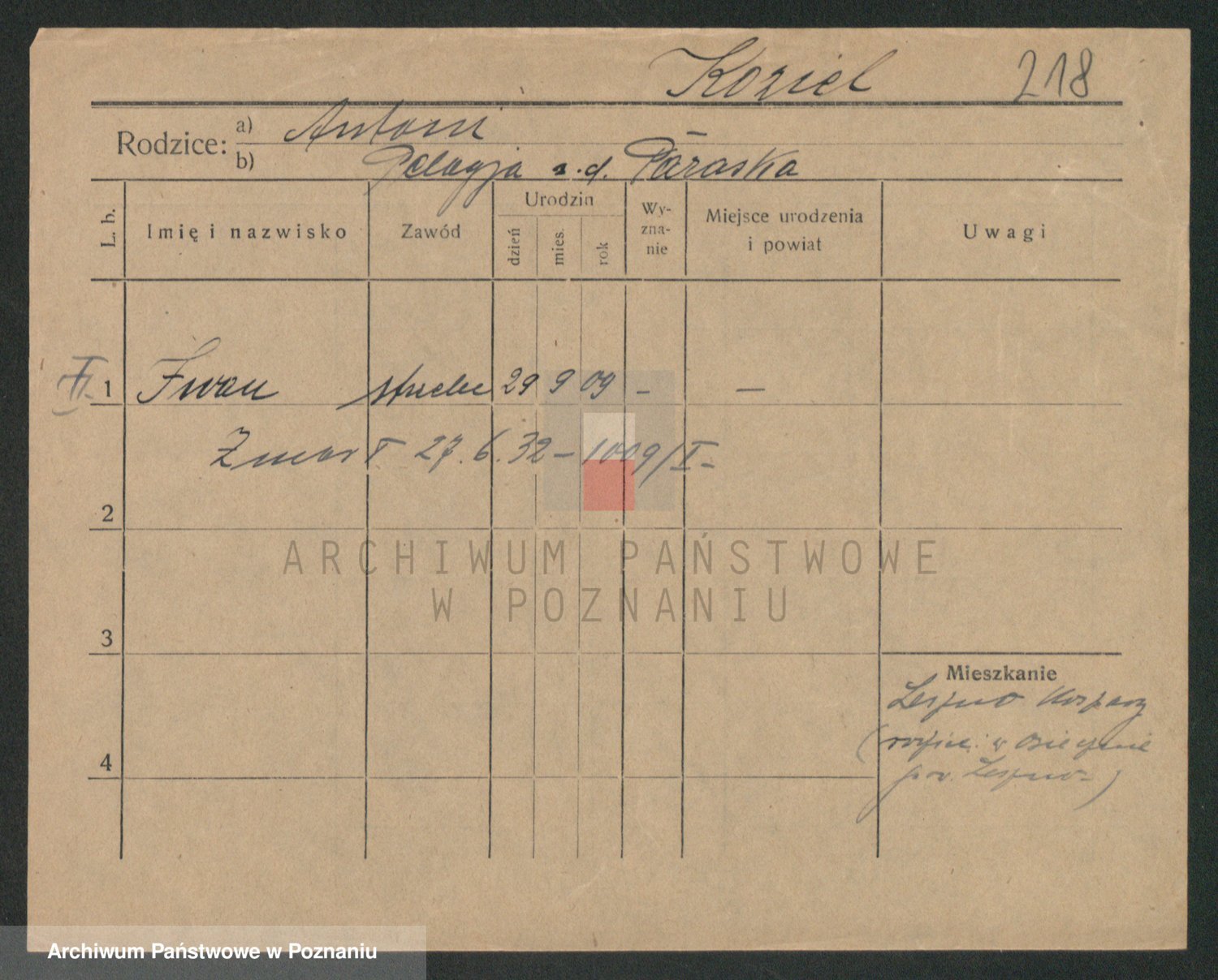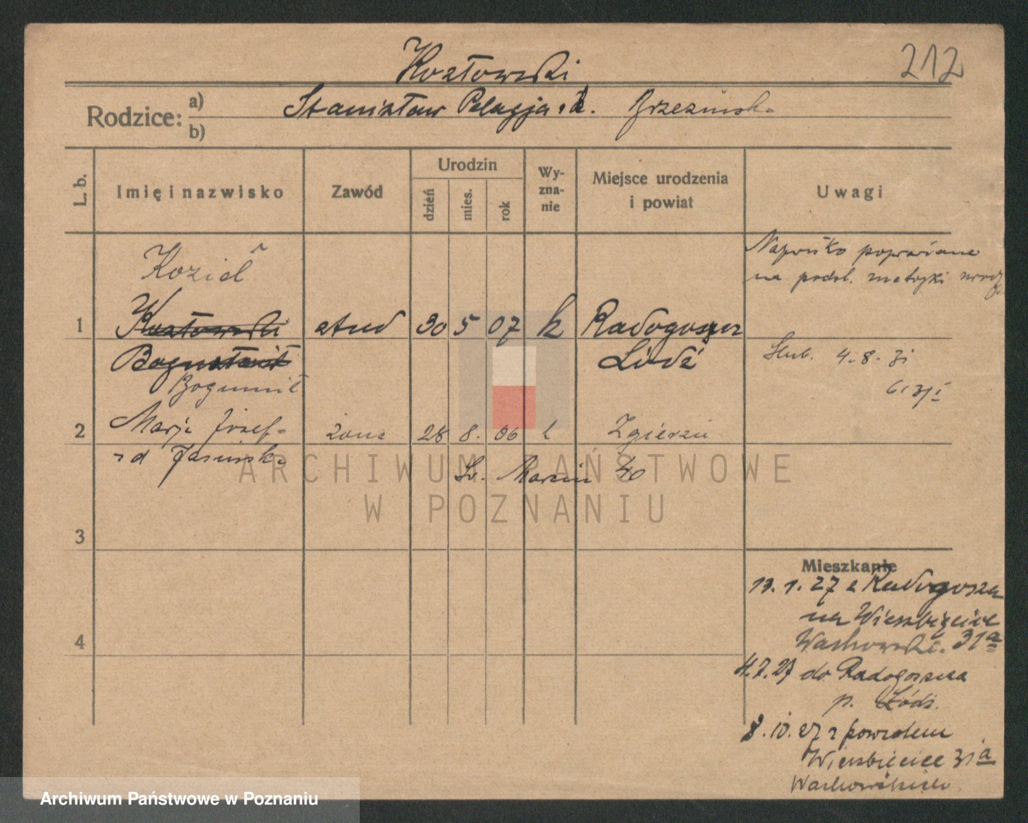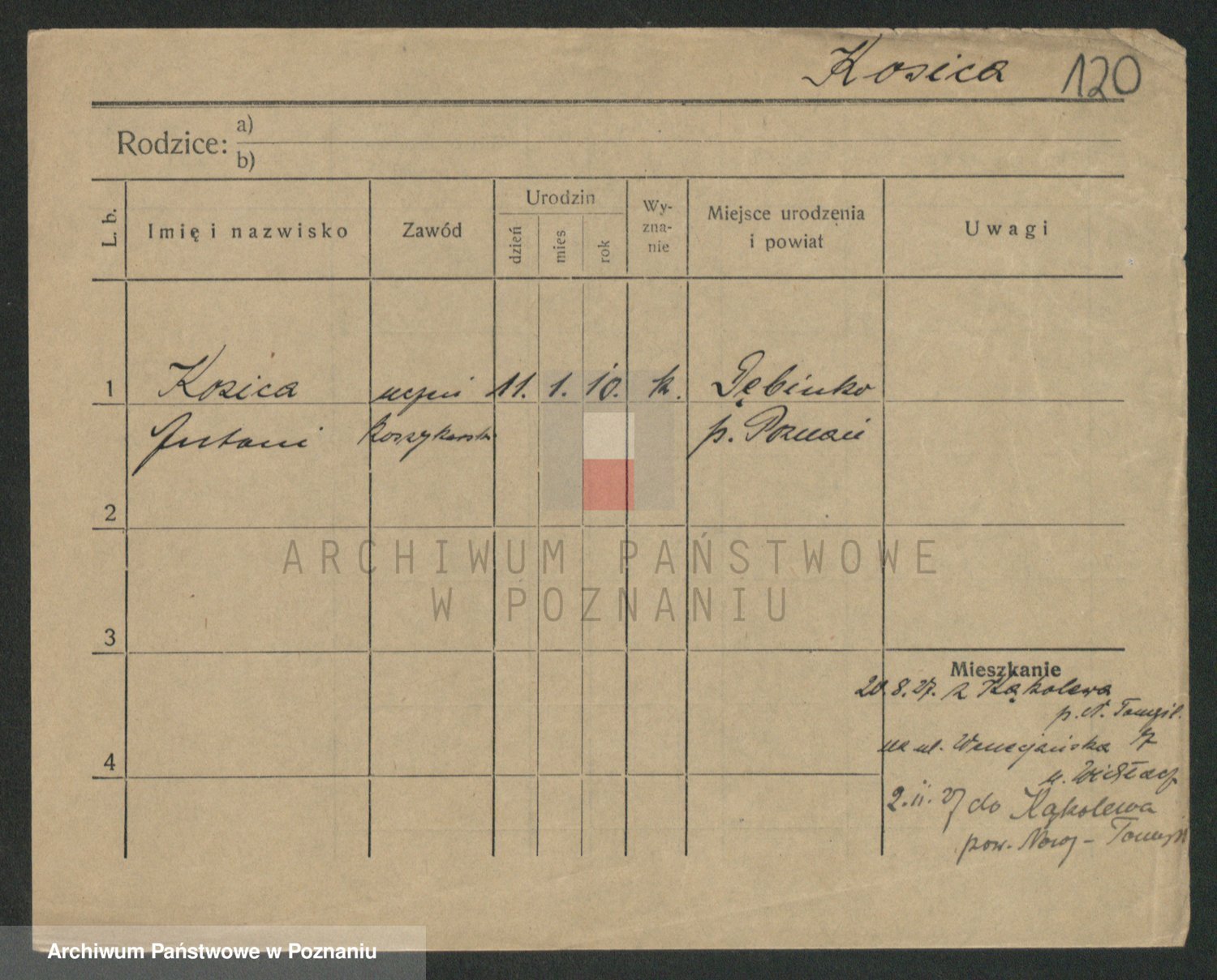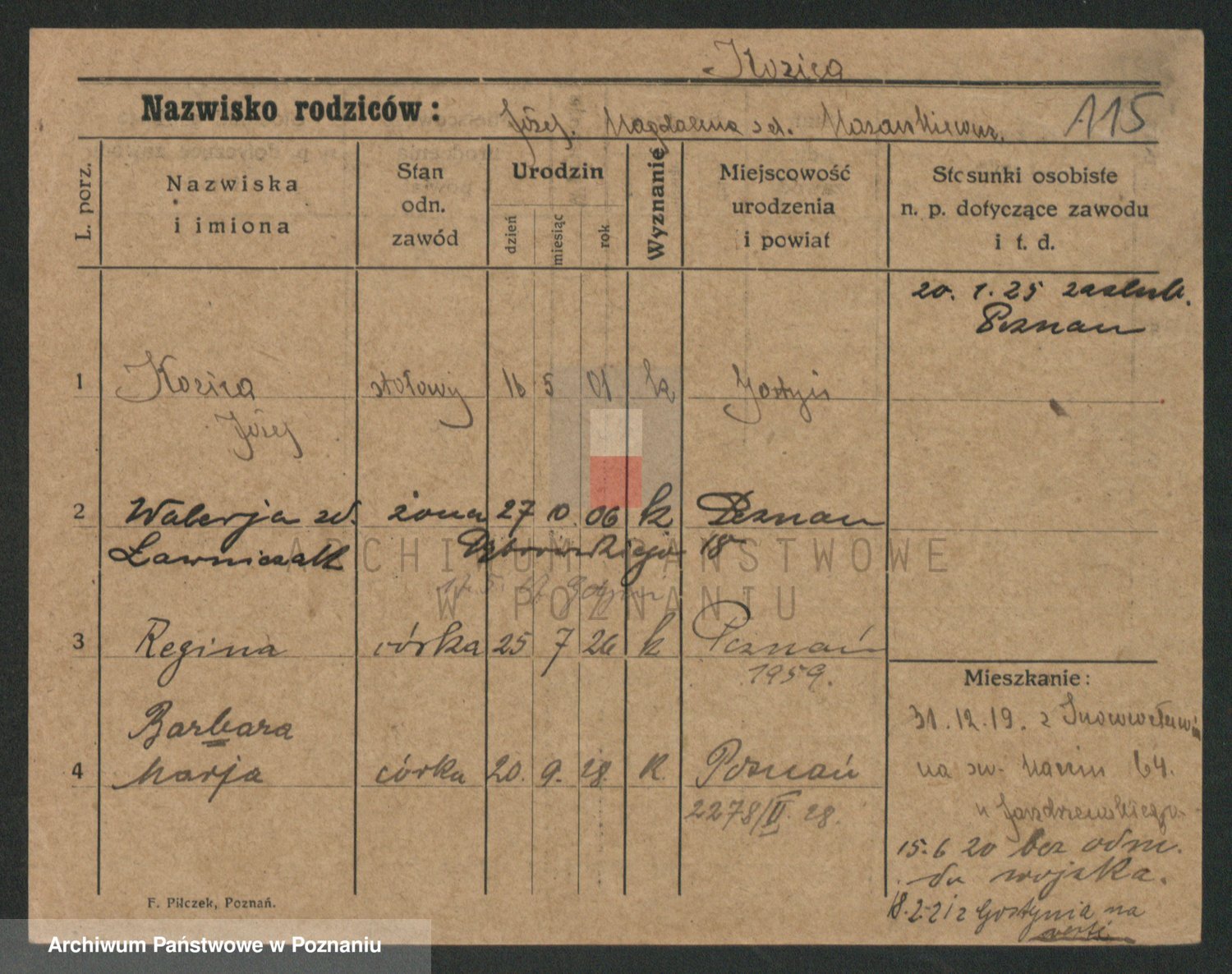 Podgląd karty osobowej dostępny jest po kliknięciu na nazwisko lub ikonkę karty. Można dokonywać powiększenia (ikony na górze) lub przechodzić między kolejnymi skanami (strzałki po bokach).