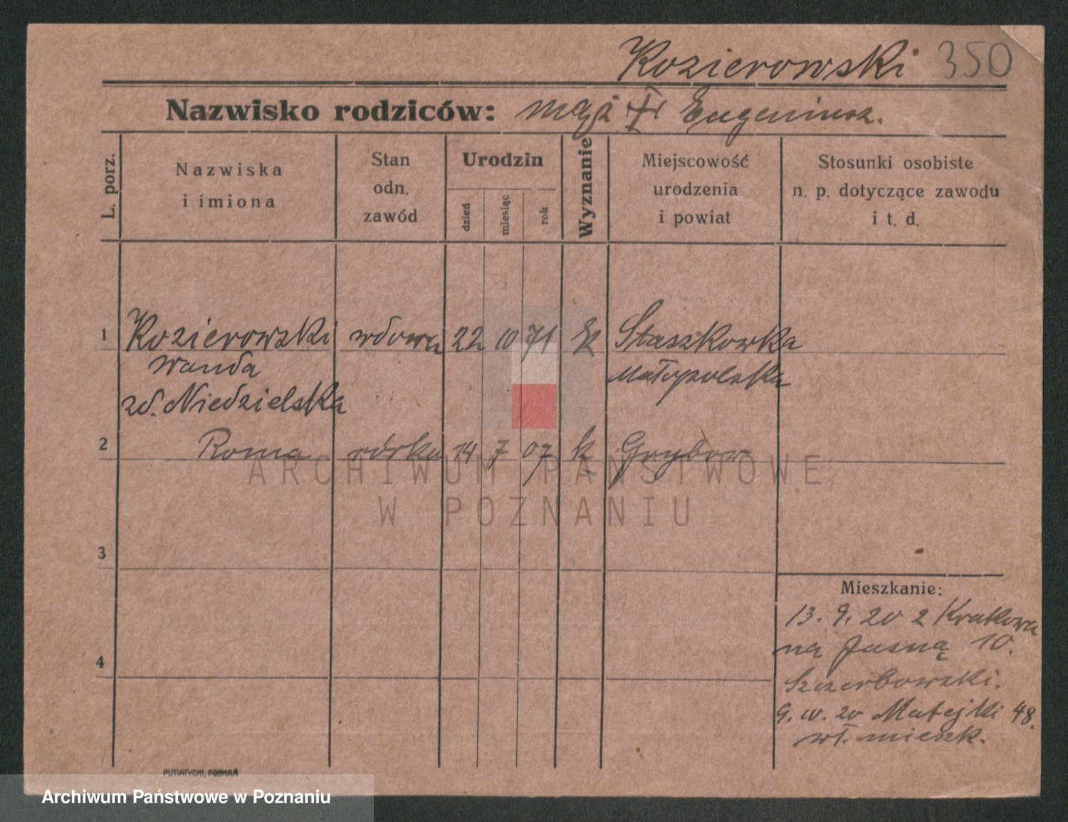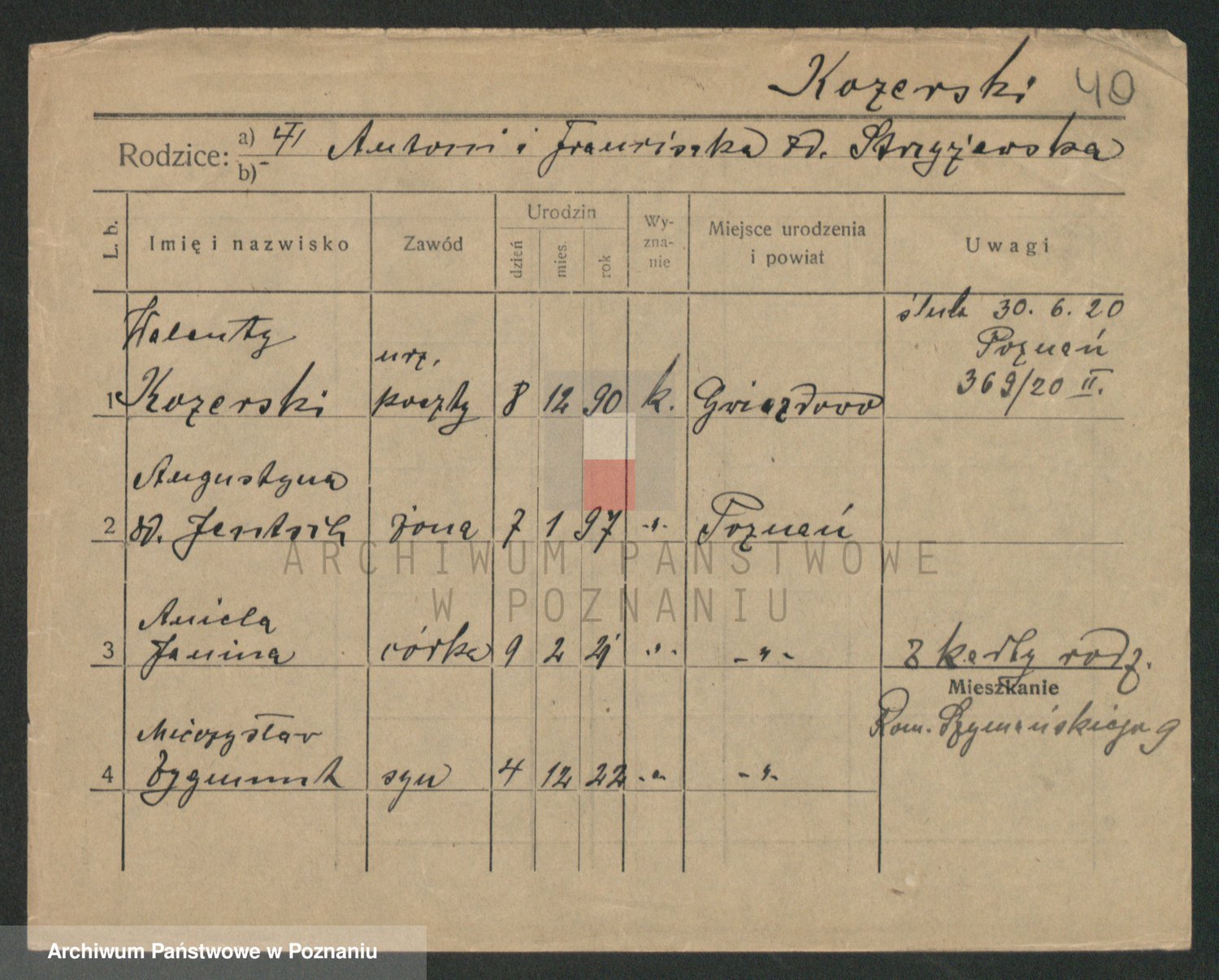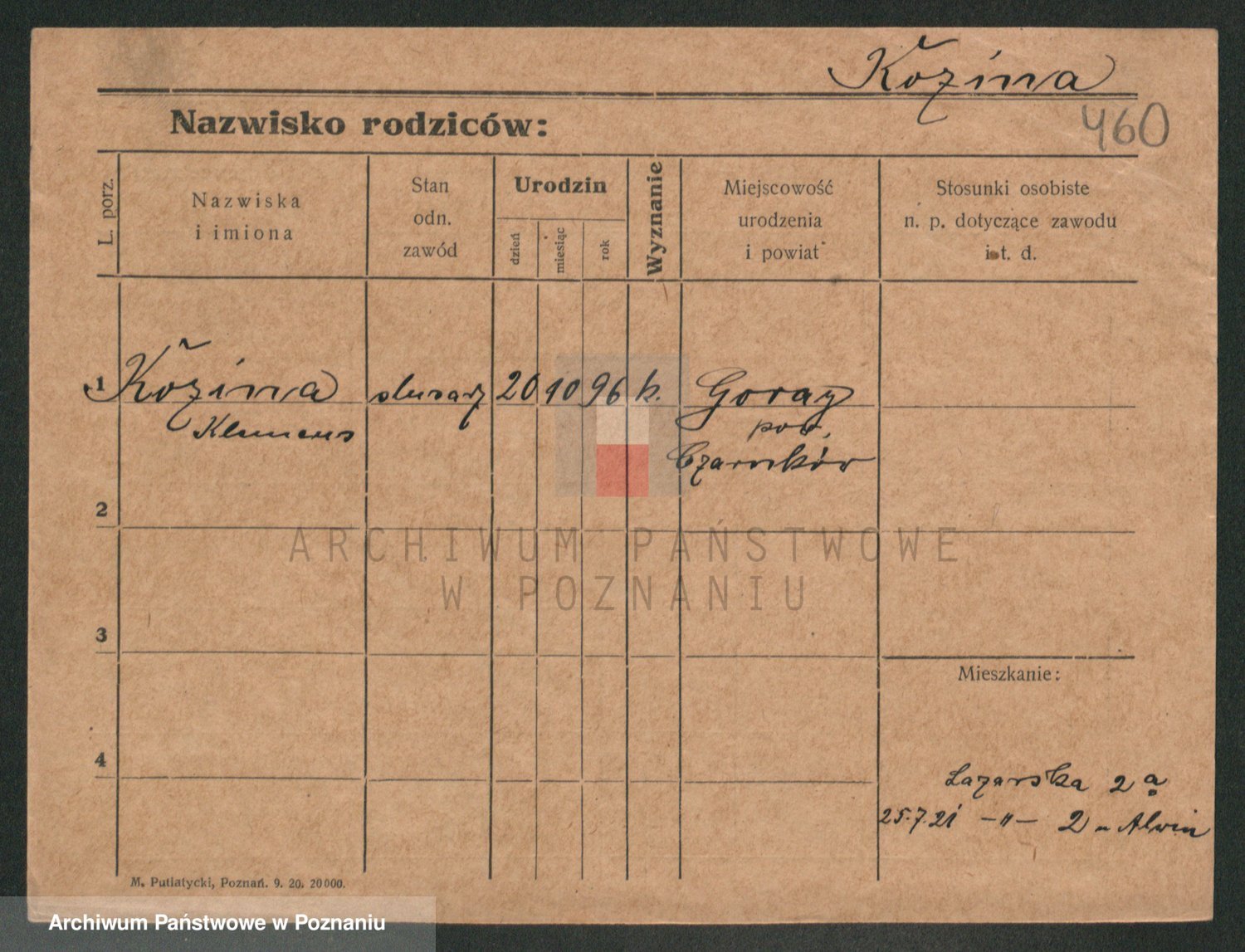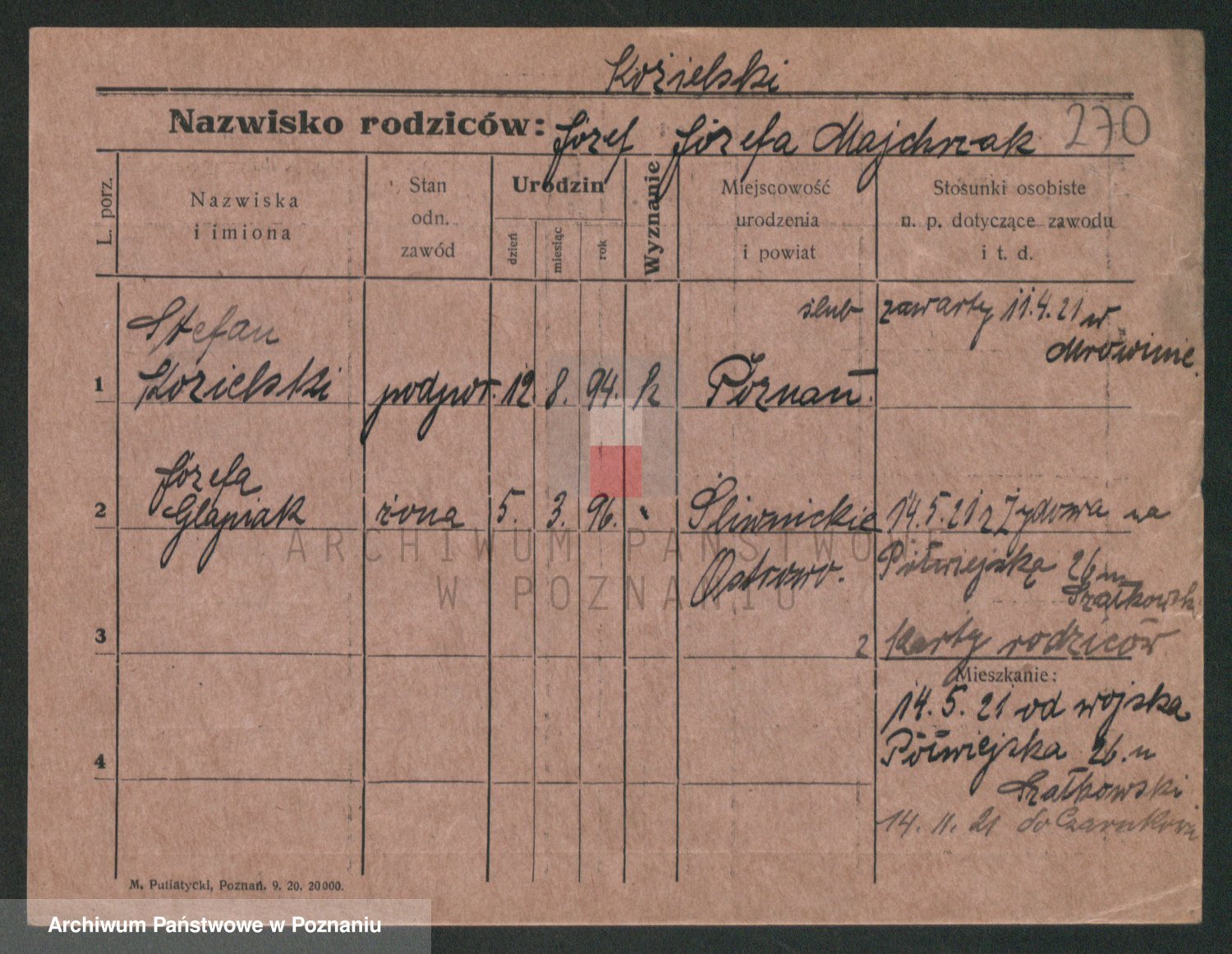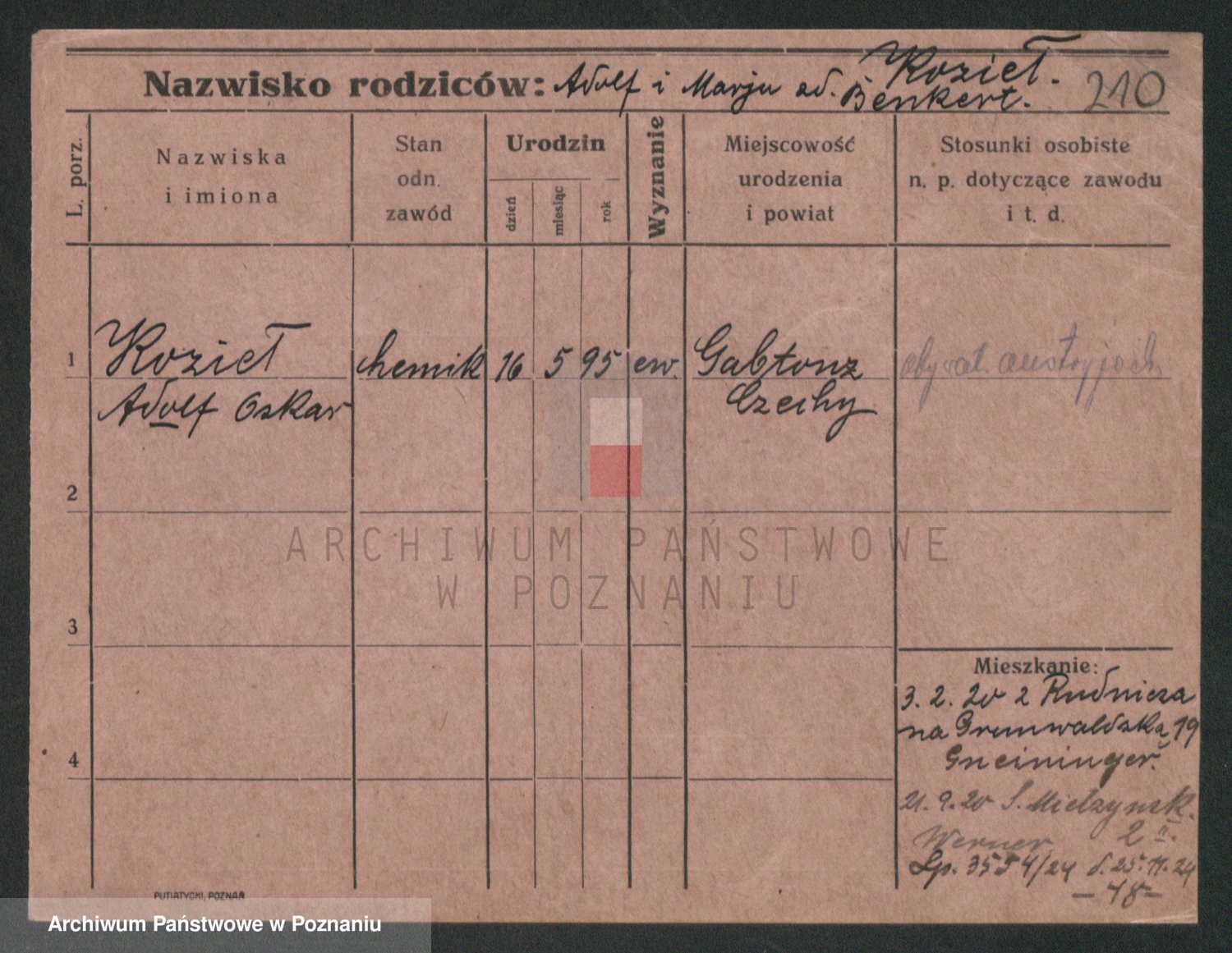 Podgląd karty osobowej dostępny jest po kliknięciu na nazwisko lub ikonkę karty. Można dokonywać powiększenia (ikony na górze) lub przechodzić między kolejnymi skanami (strzałki po bokach).