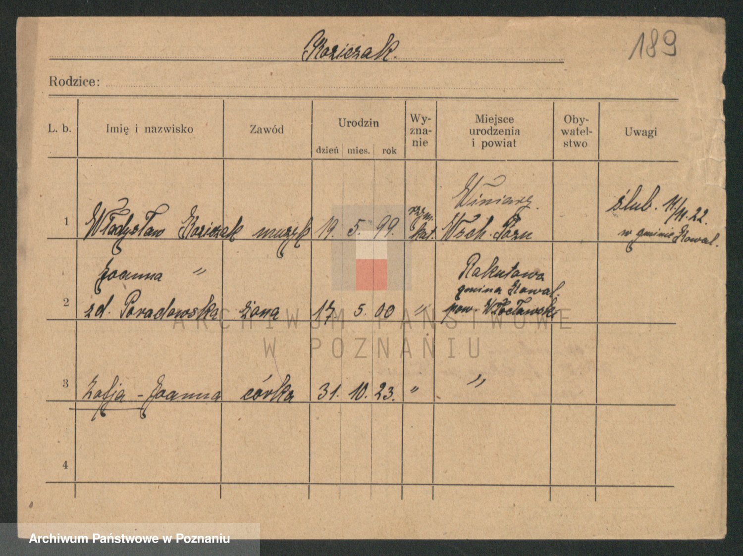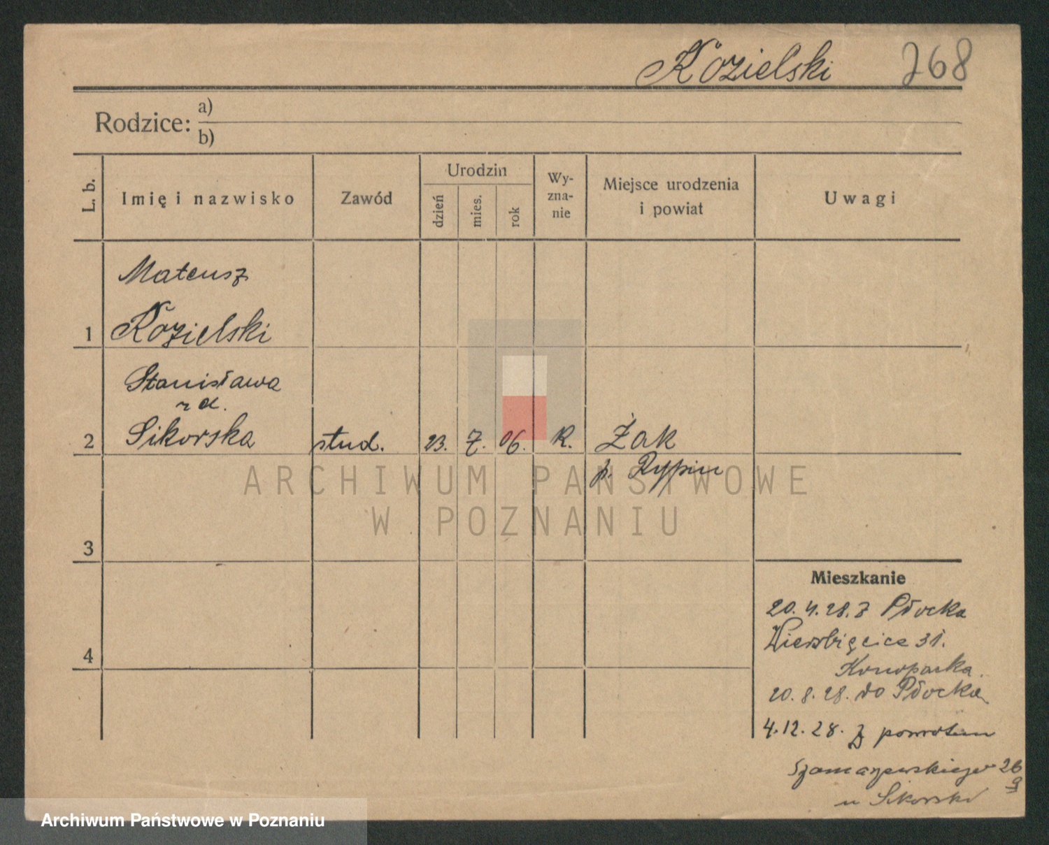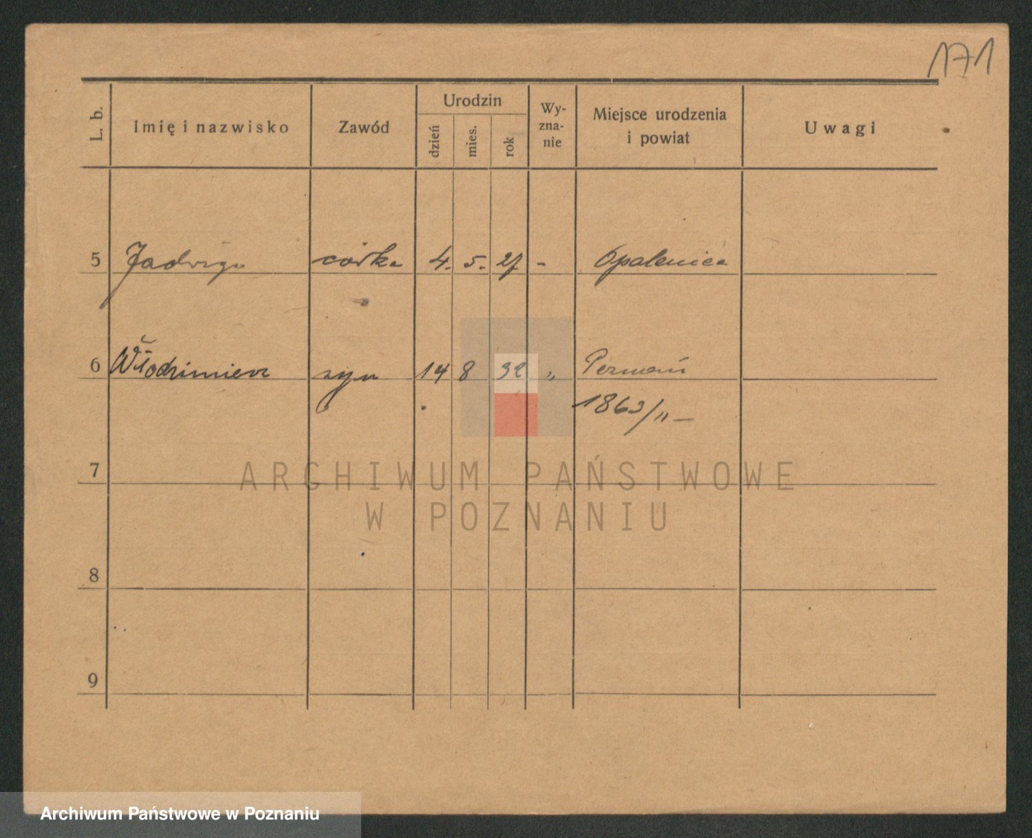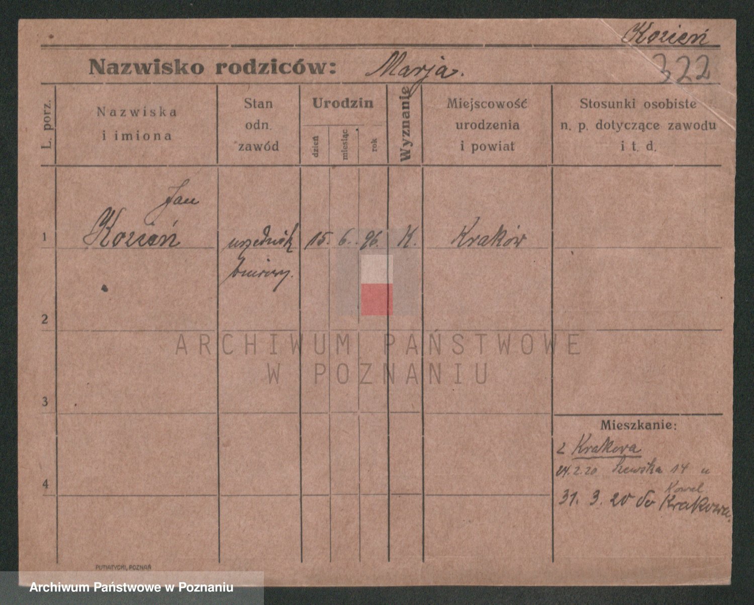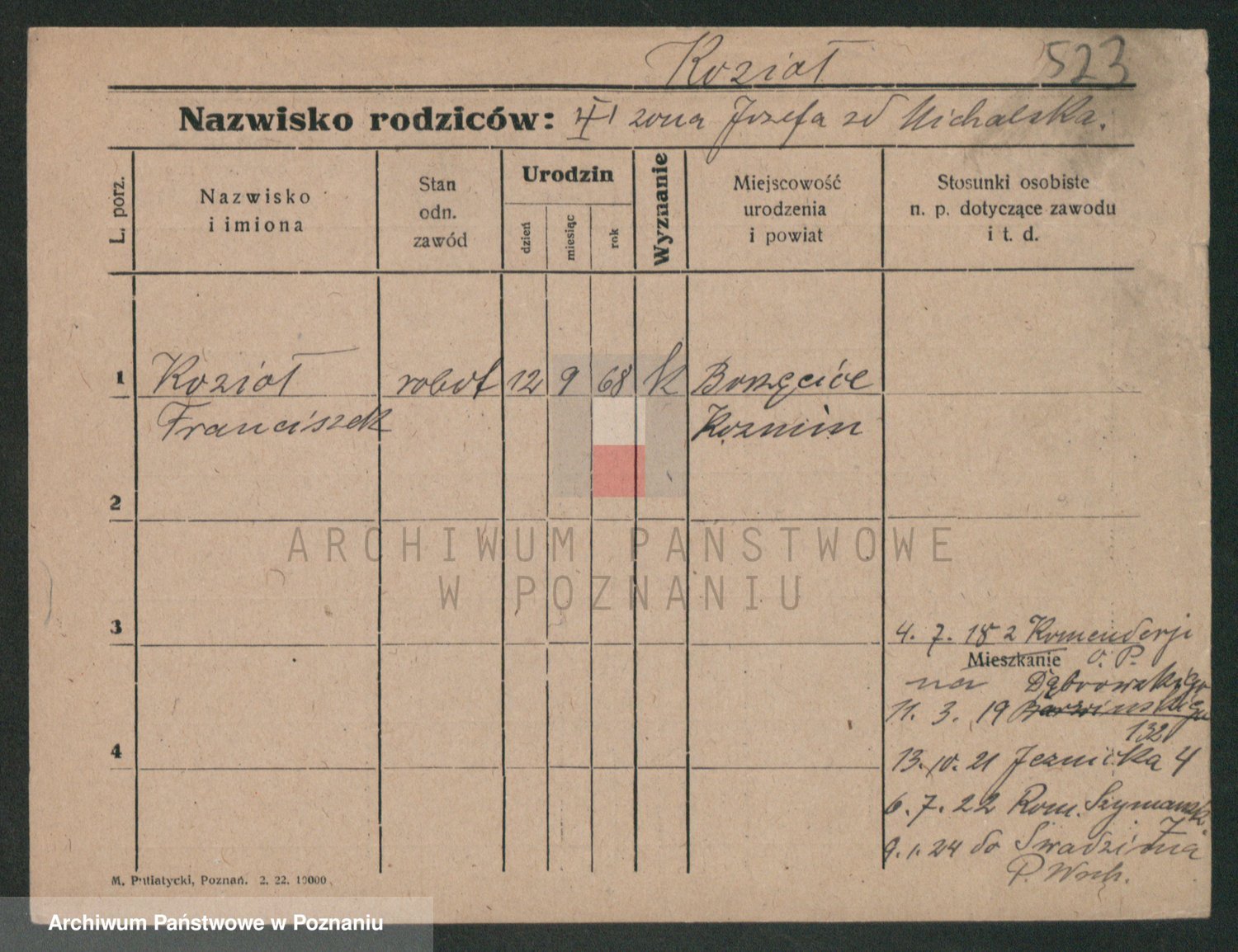 Podgląd karty osobowej dostępny jest po kliknięciu na nazwisko lub ikonkę karty. Można dokonywać powiększenia (ikony na górze) lub przechodzić między kolejnymi skanami (strzałki po bokach).