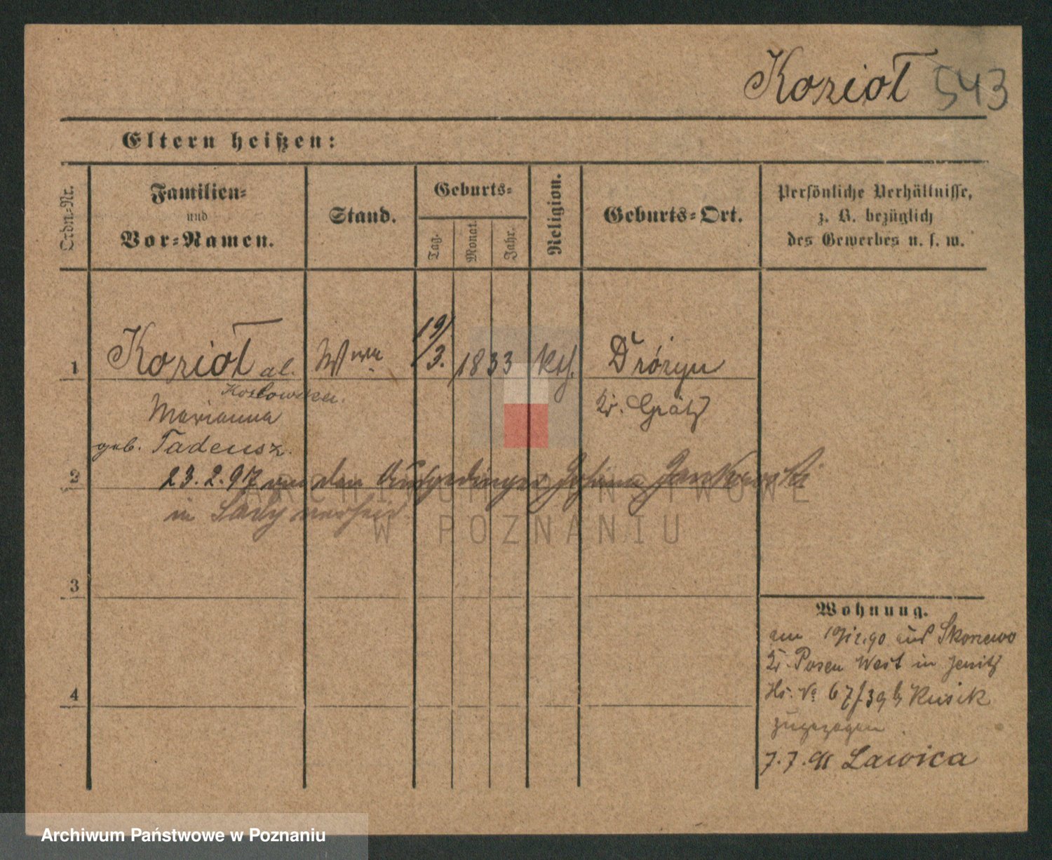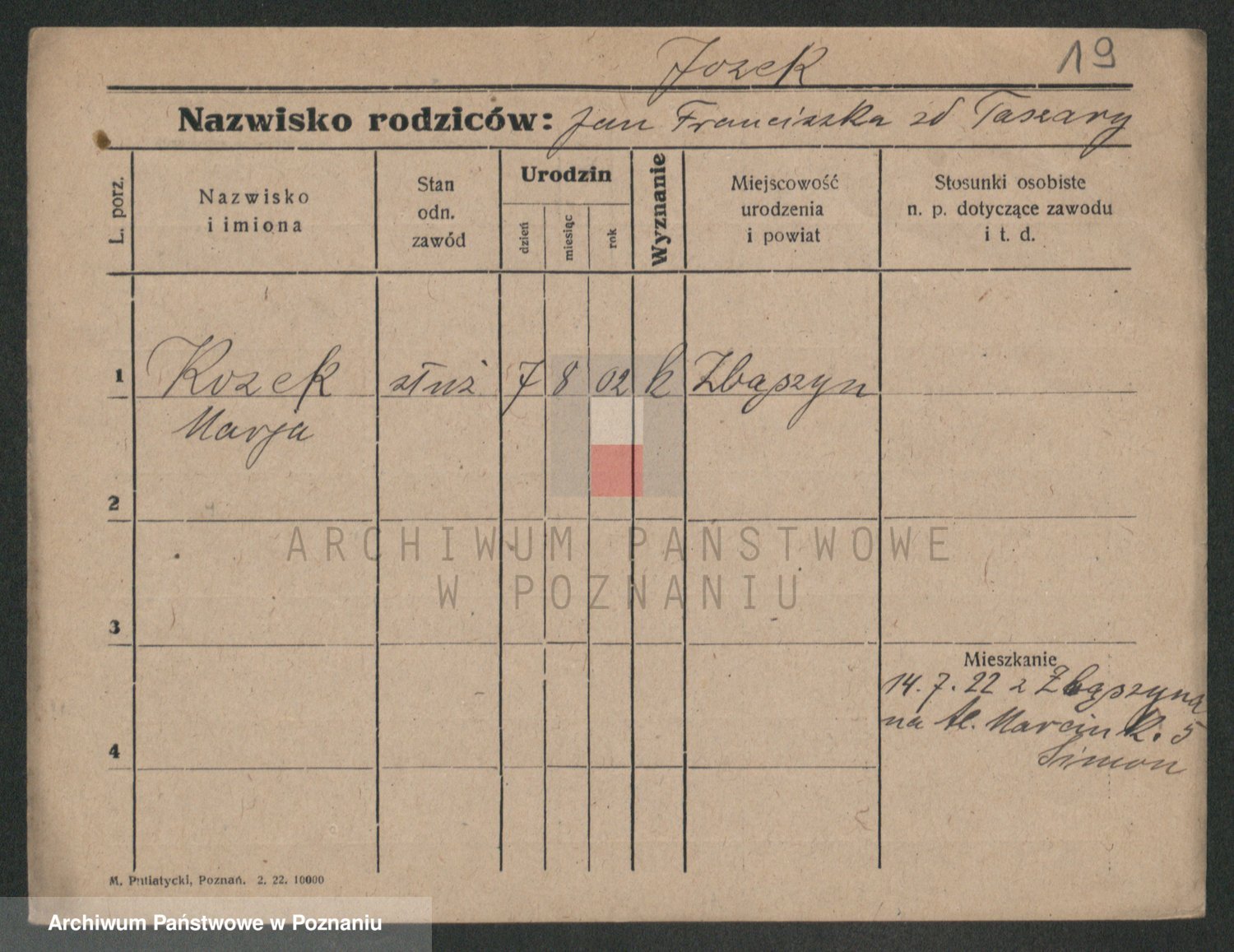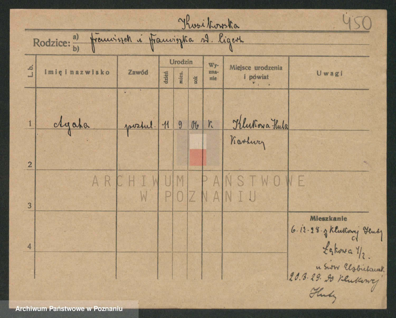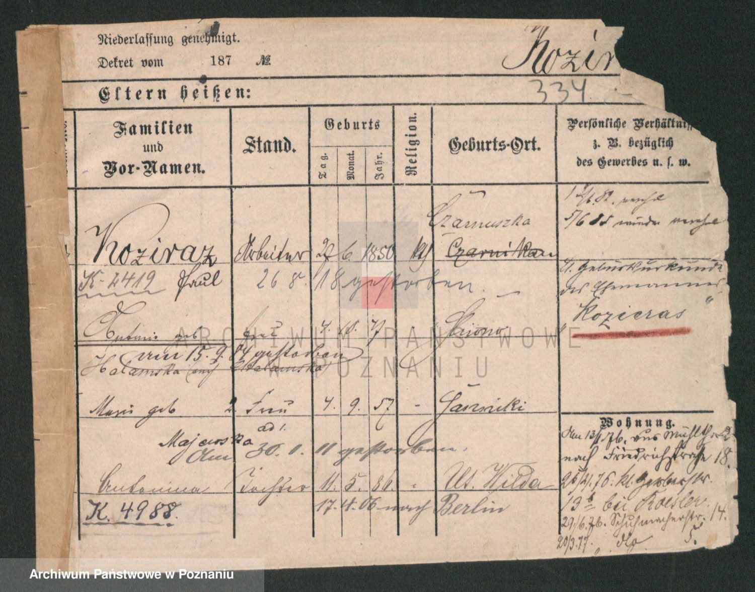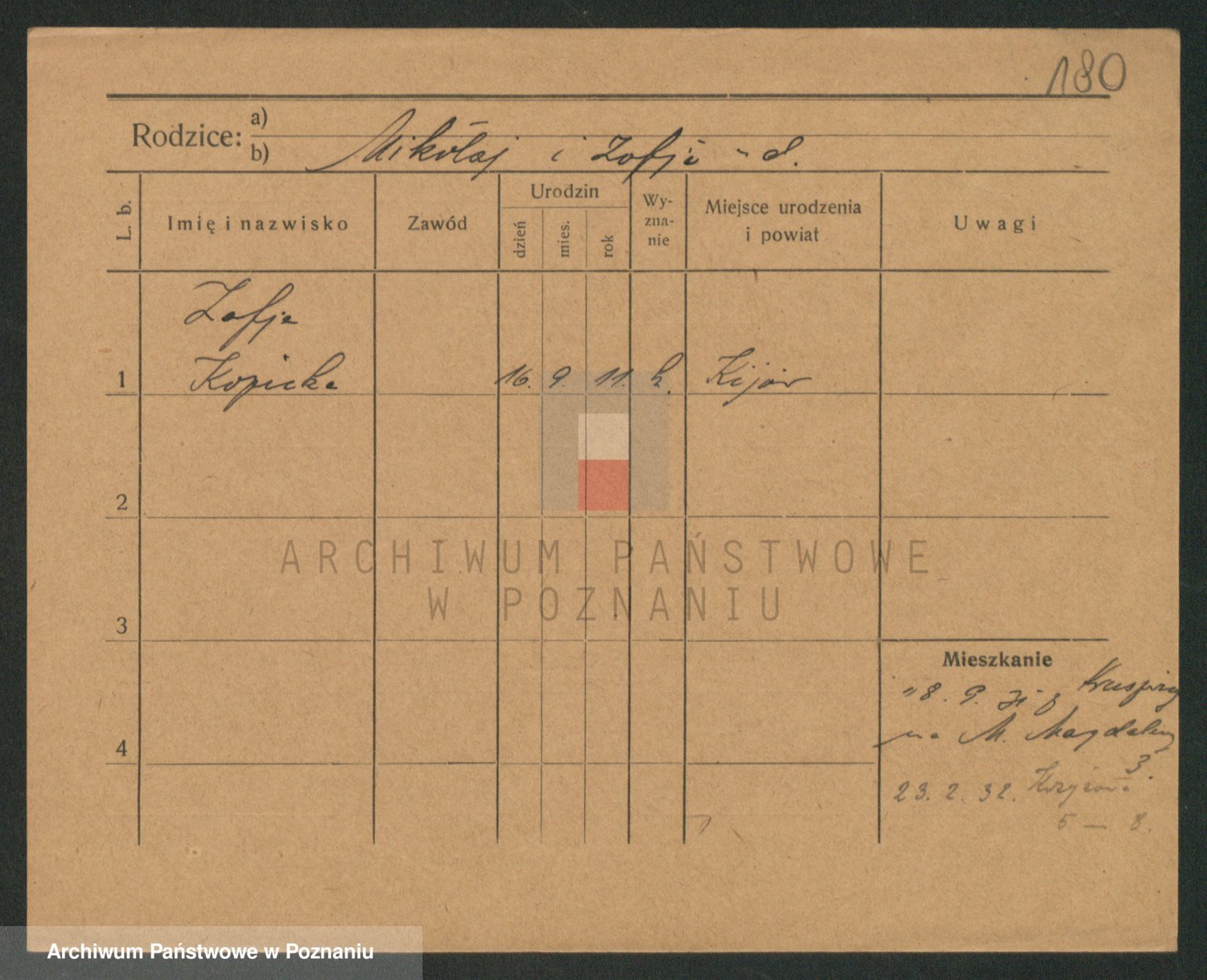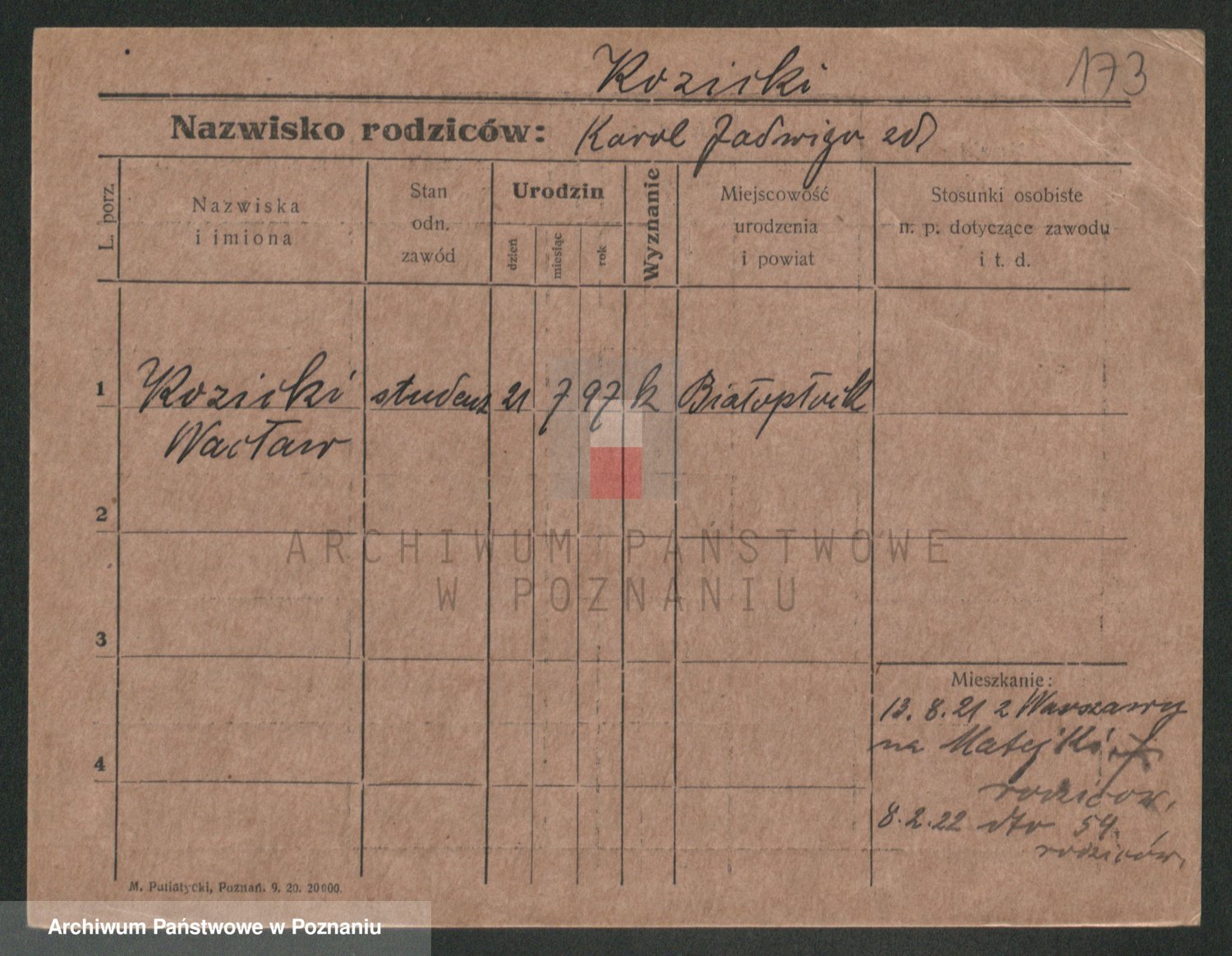 Podgląd karty osobowej dostępny jest po kliknięciu na nazwisko lub ikonkę karty. Można dokonywać powiększenia (ikony na górze) lub przechodzić między kolejnymi skanami (strzałki po bokach).