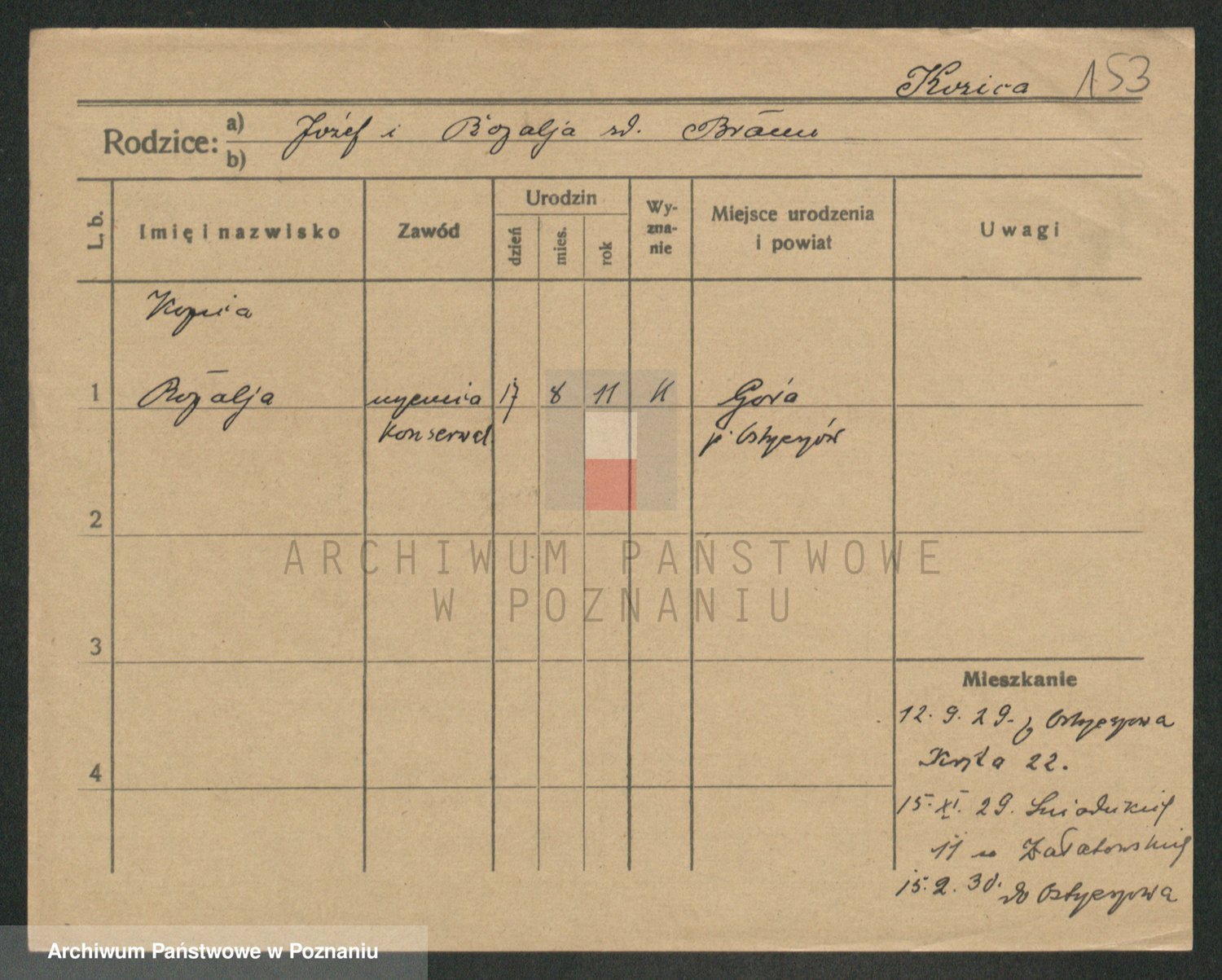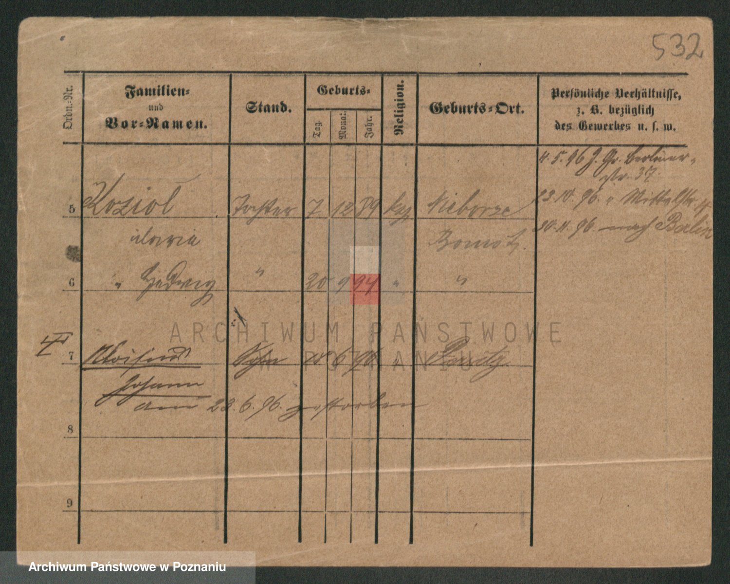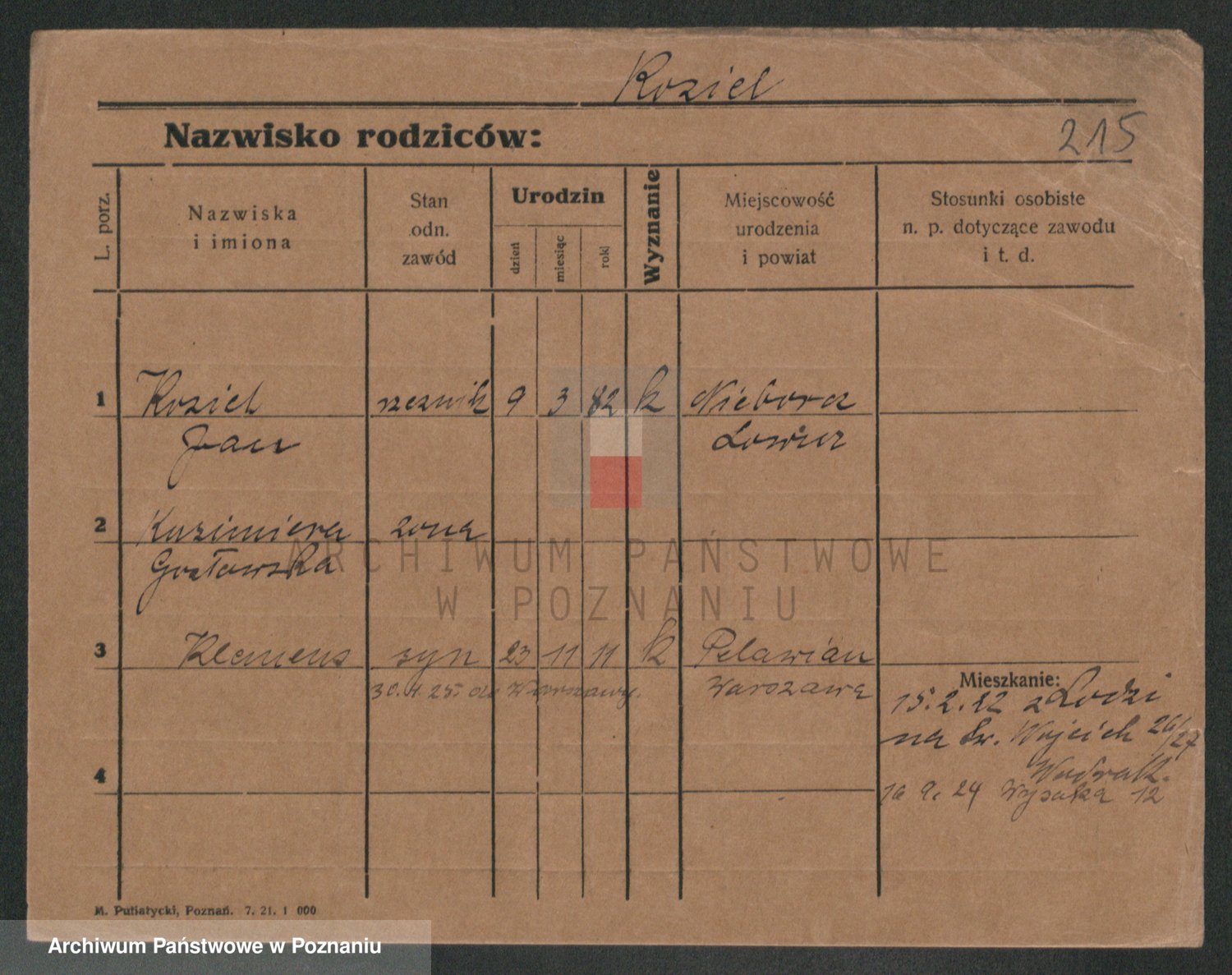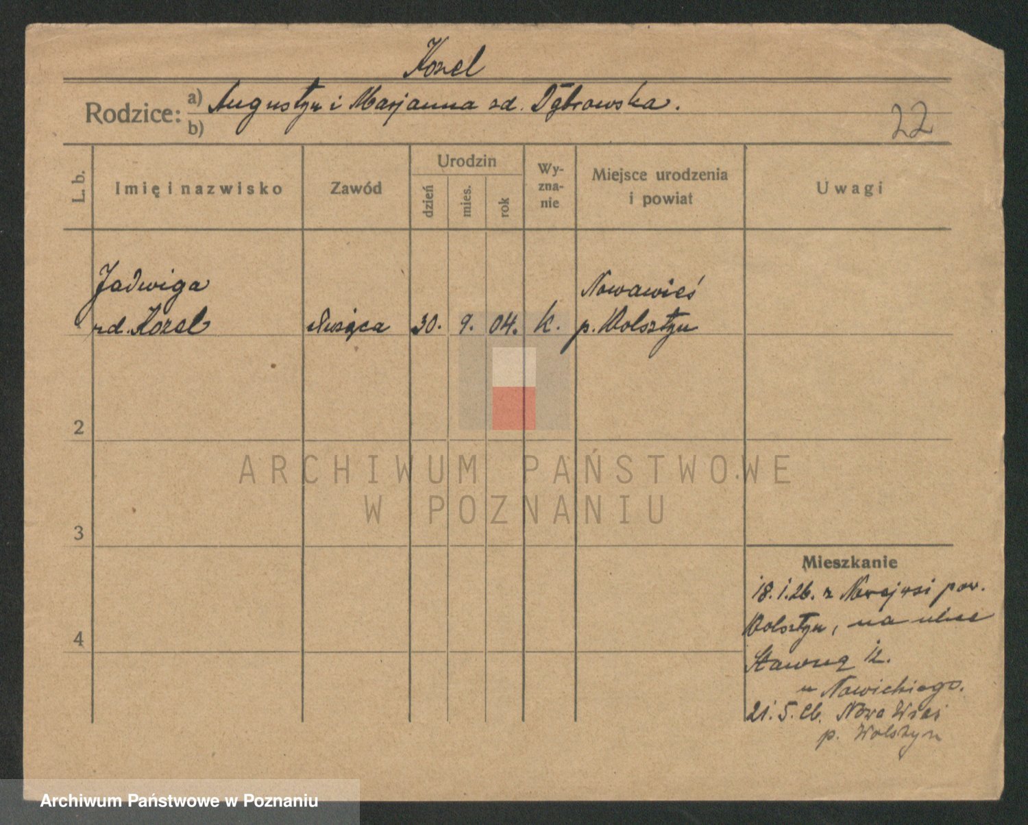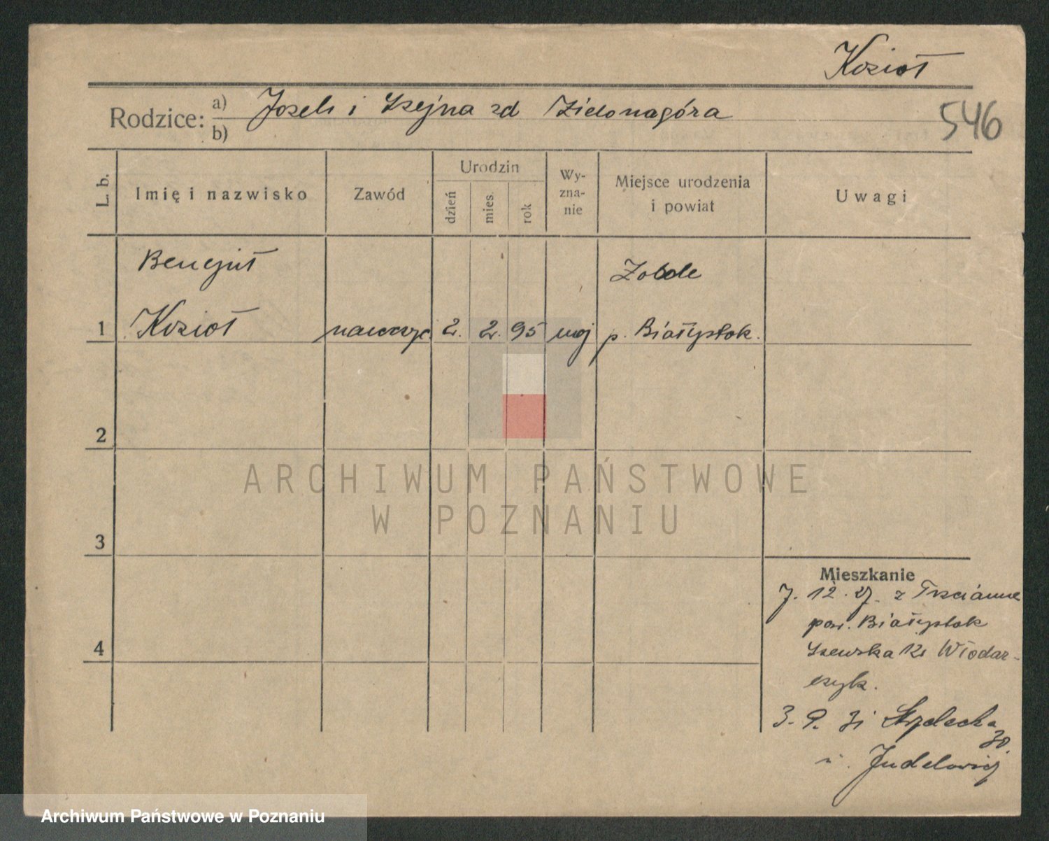 Podgląd karty osobowej dostępny jest po kliknięciu na nazwisko lub ikonkę karty. Można dokonywać powiększenia (ikony na górze) lub przechodzić między kolejnymi skanami (strzałki po bokach).