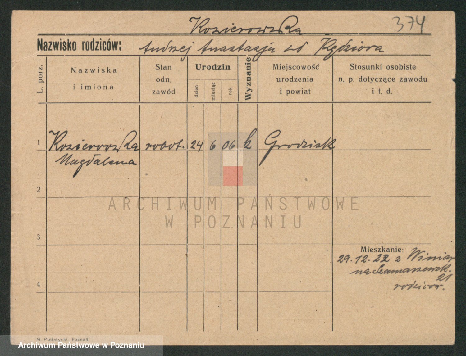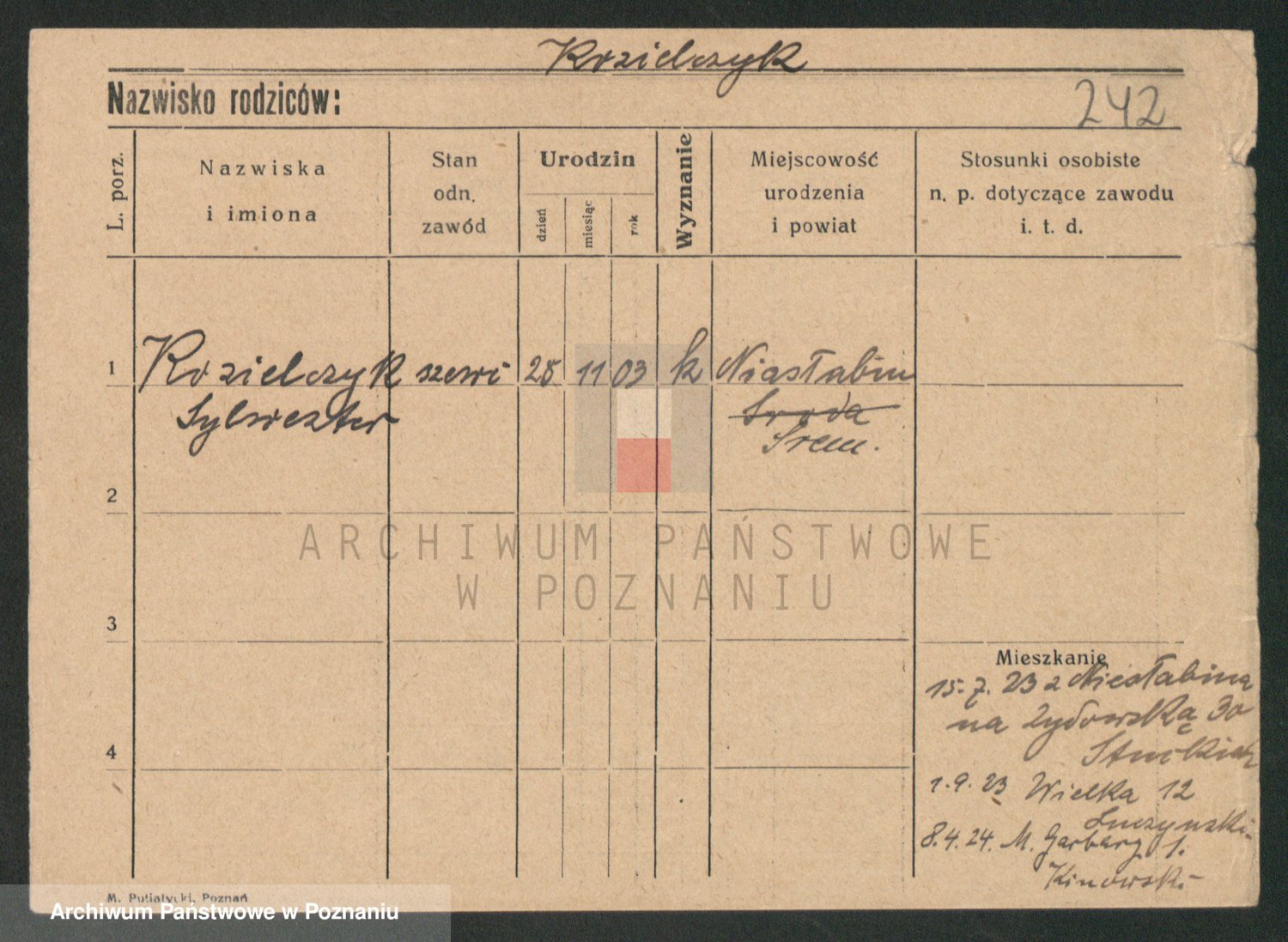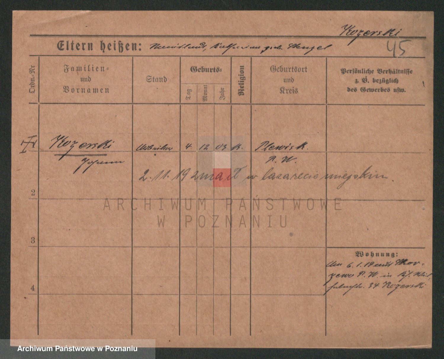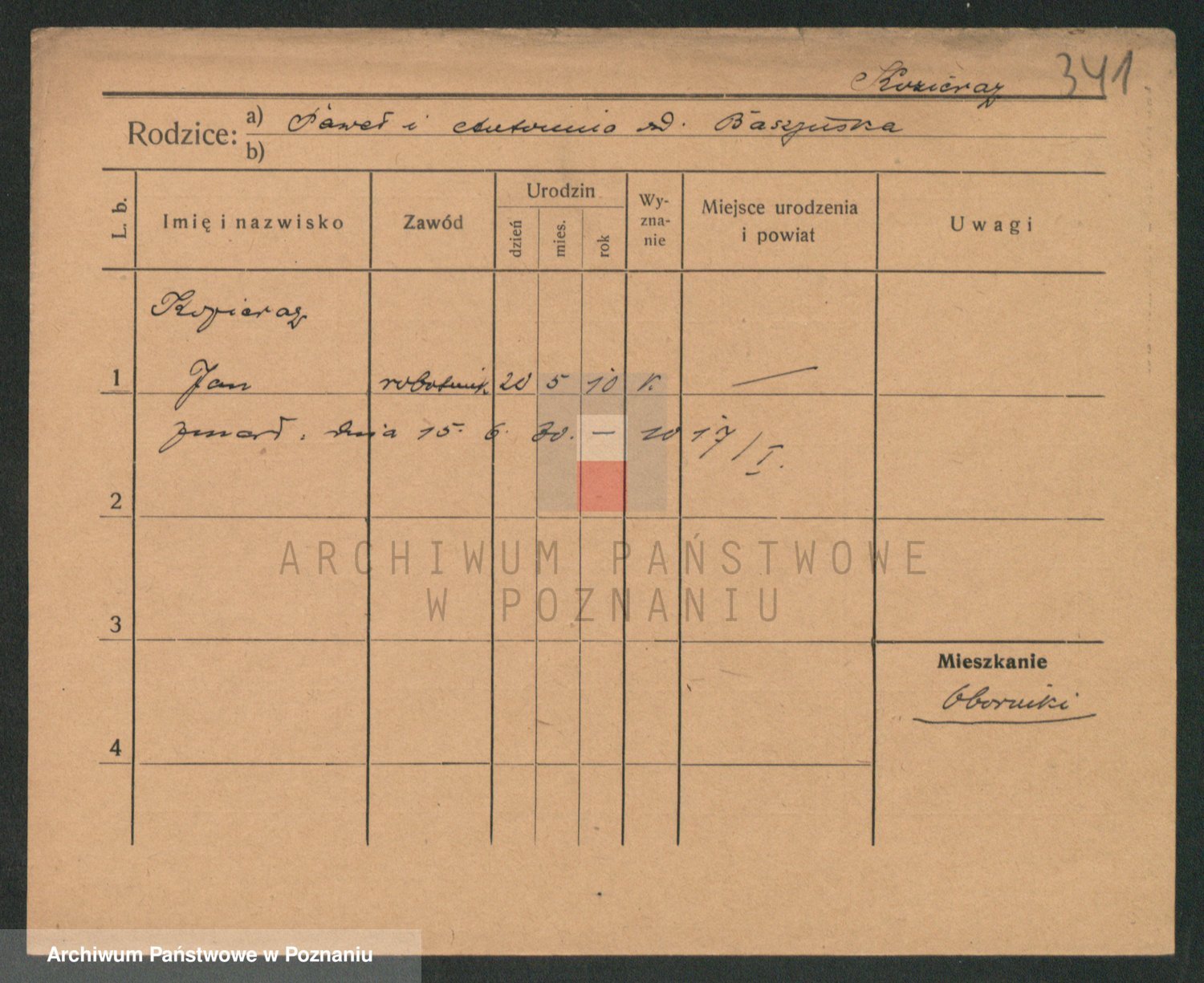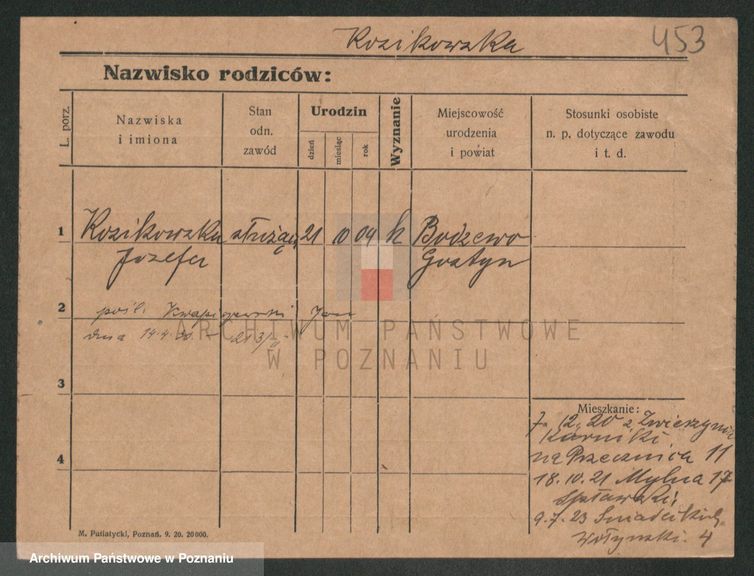 Podgląd karty osobowej dostępny jest po kliknięciu na nazwisko lub ikonkę karty. Można dokonywać powiększenia (ikony na górze) lub przechodzić między kolejnymi skanami (strzałki po bokach).