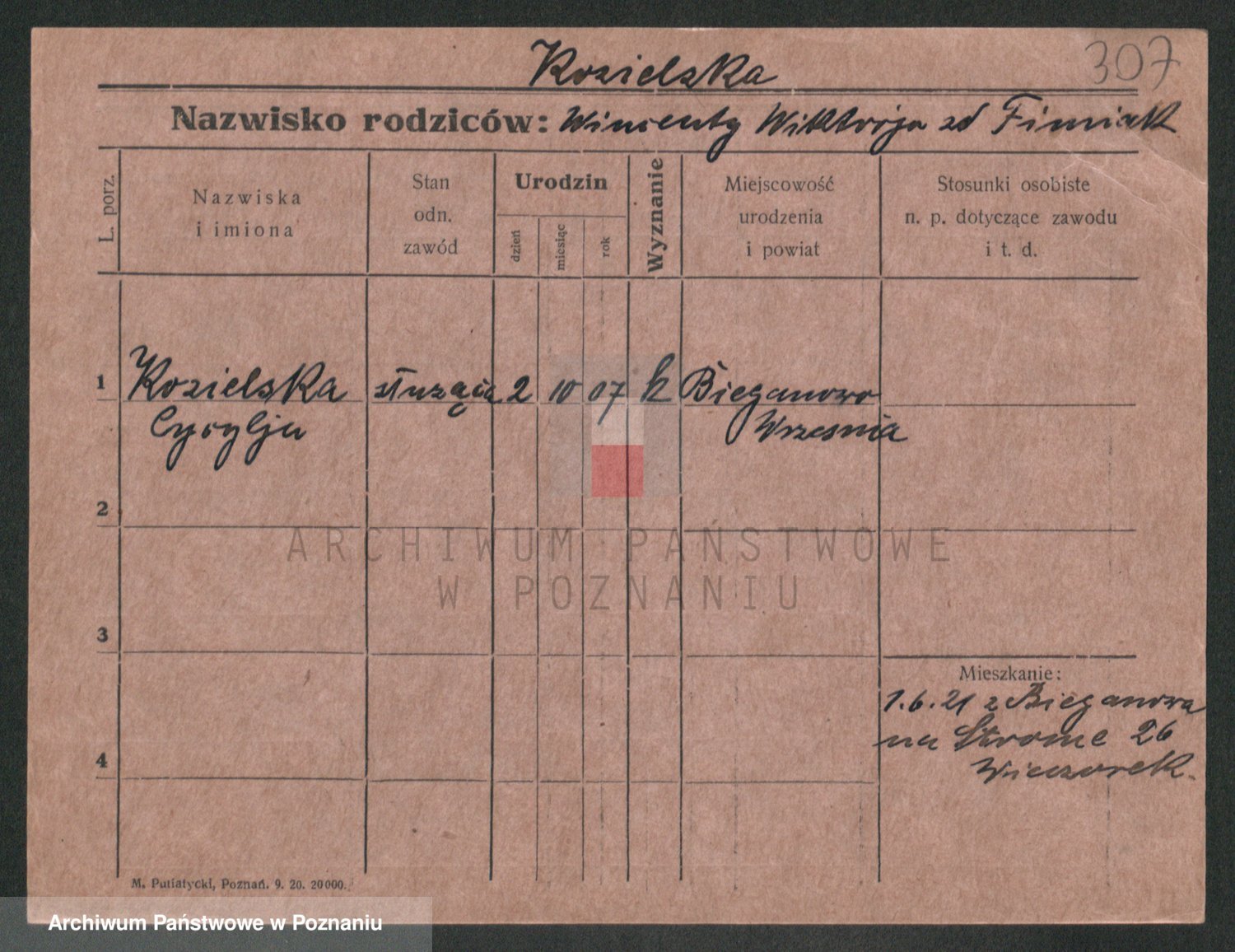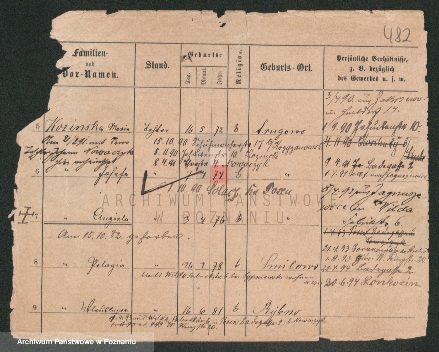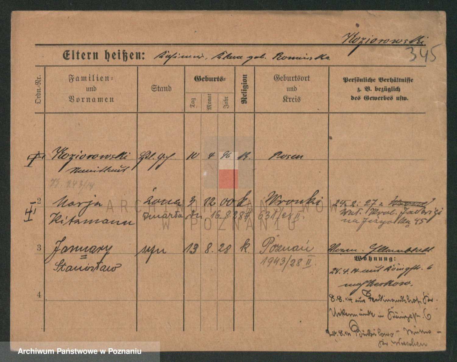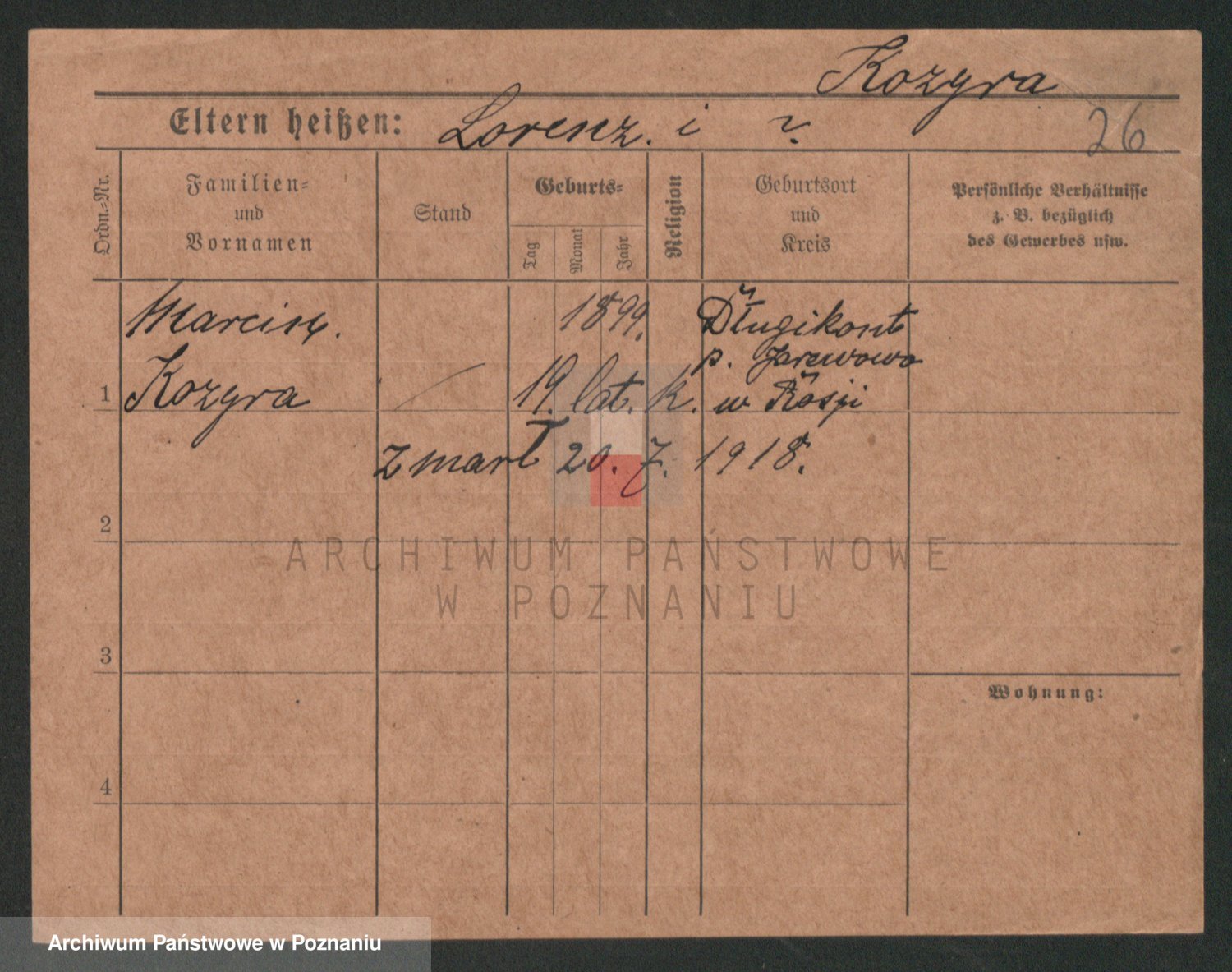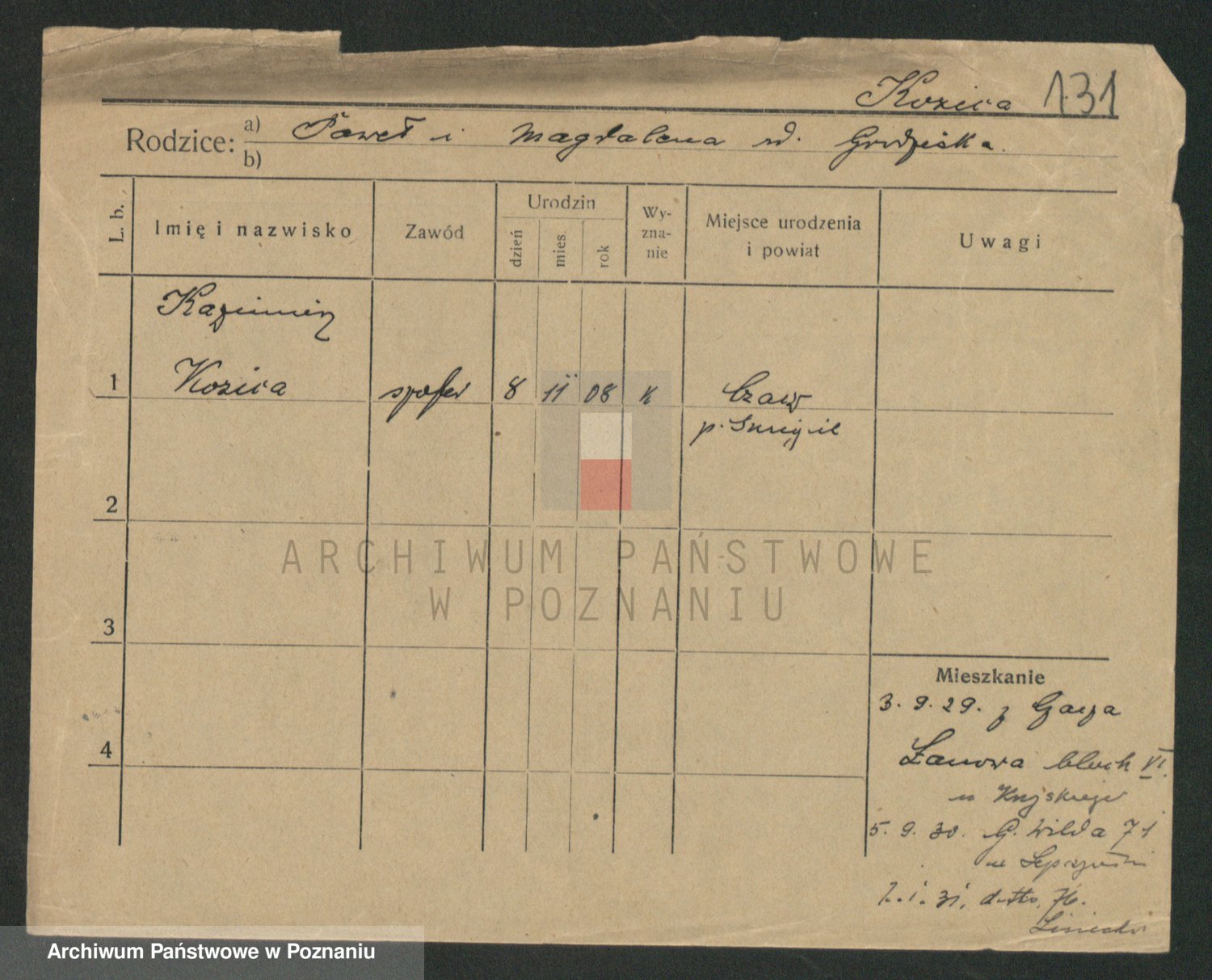 Podgląd karty osobowej dostępny jest po kliknięciu na nazwisko lub ikonkę karty. Można dokonywać powiększenia (ikony na górze) lub przechodzić między kolejnymi skanami (strzałki po bokach).
