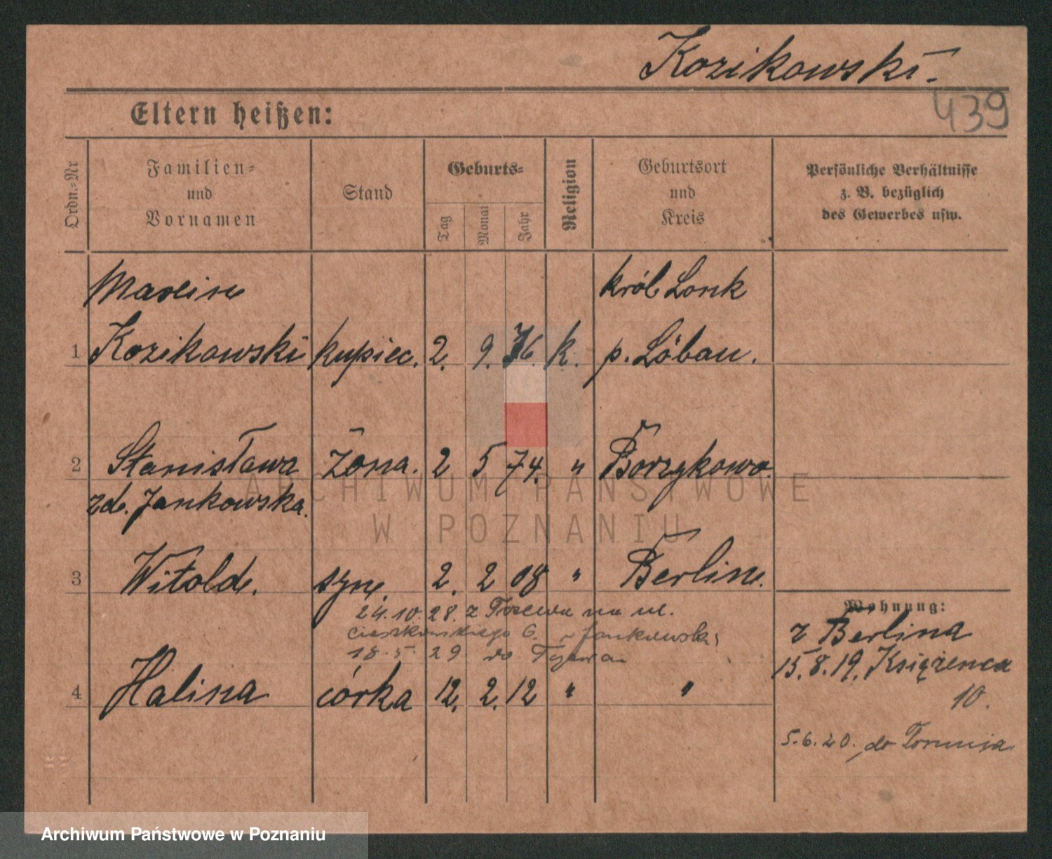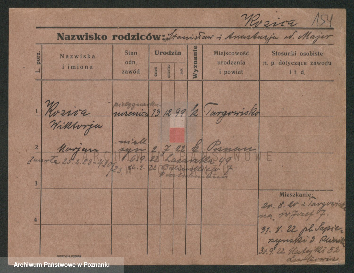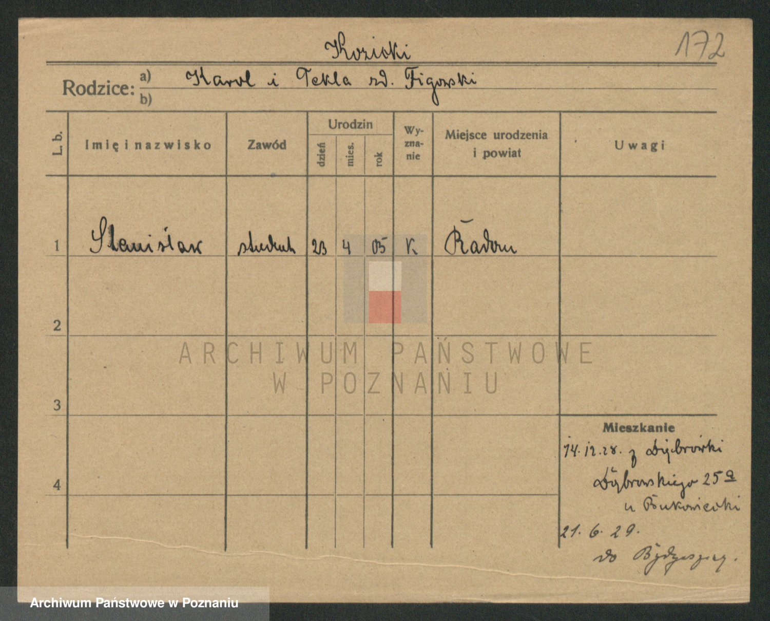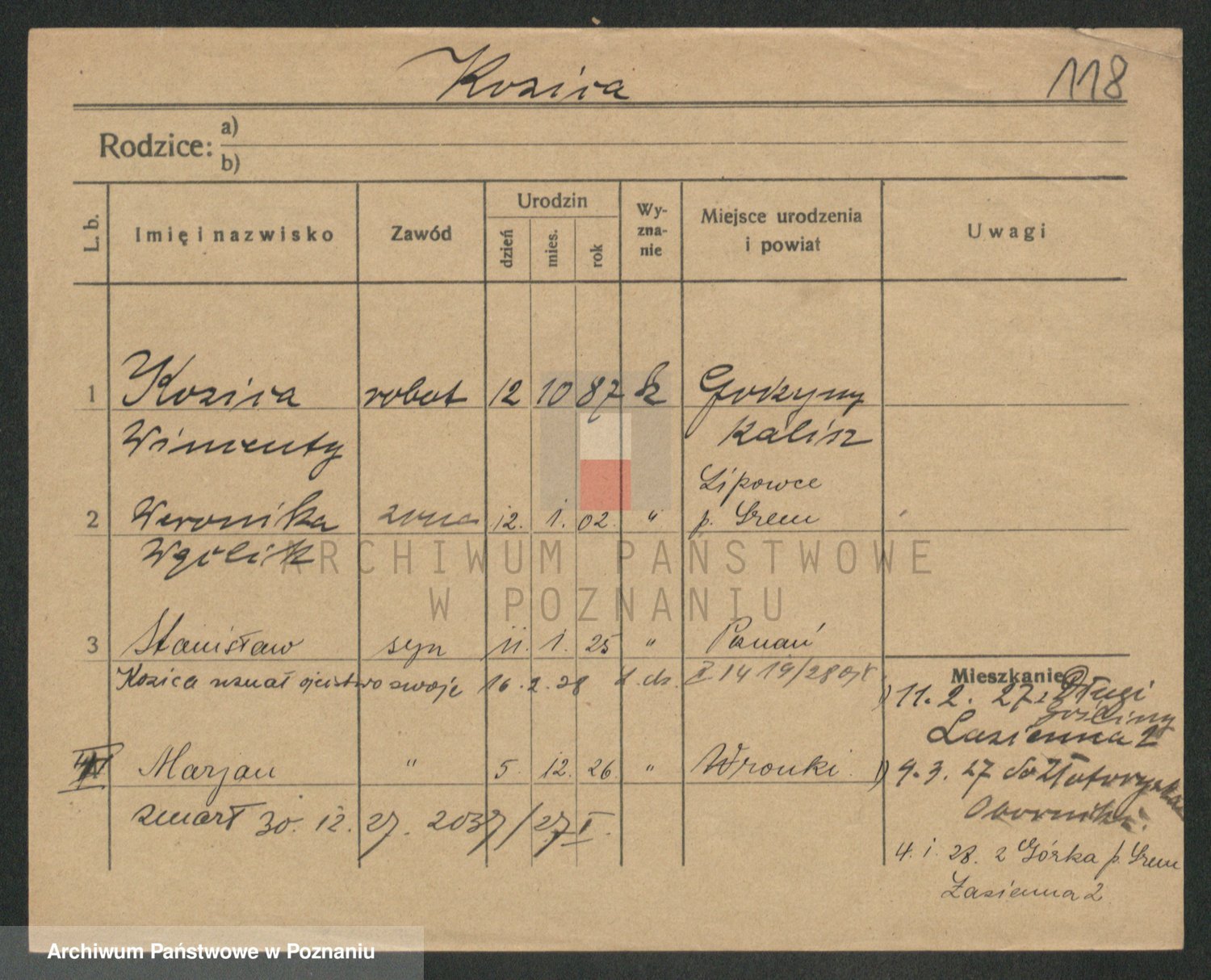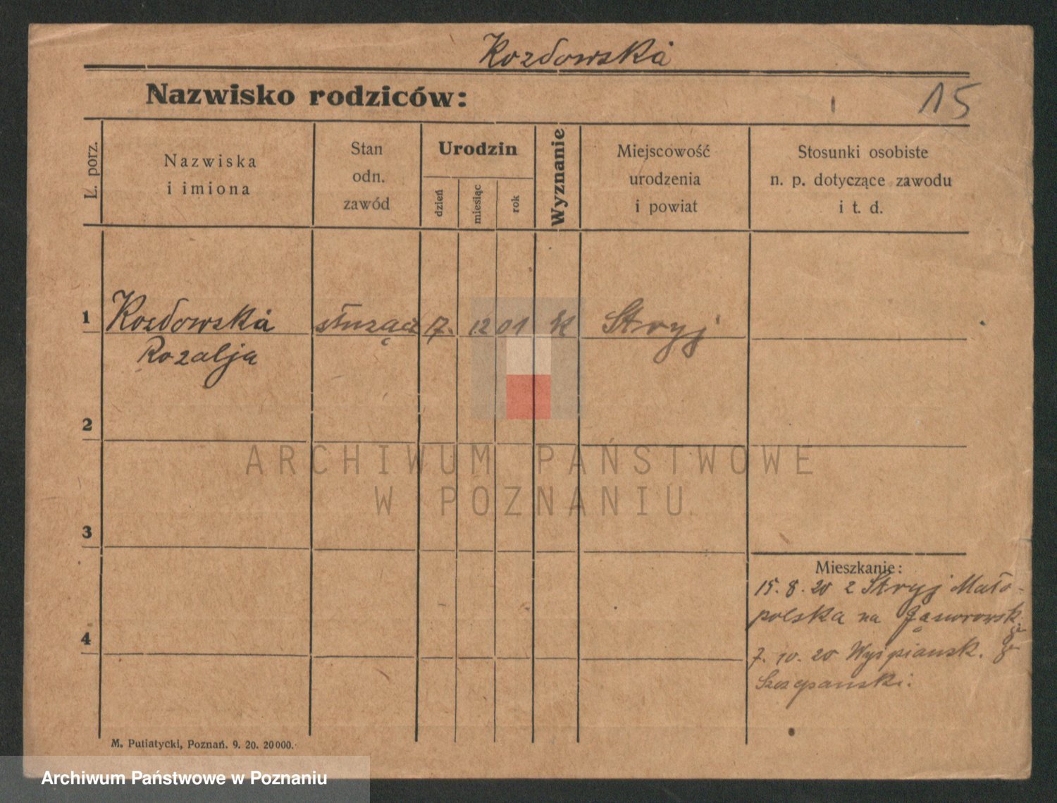 Podgląd karty osobowej dostępny jest po kliknięciu na nazwisko lub ikonkę karty. Można dokonywać powiększenia (ikony na górze) lub przechodzić między kolejnymi skanami (strzałki po bokach).