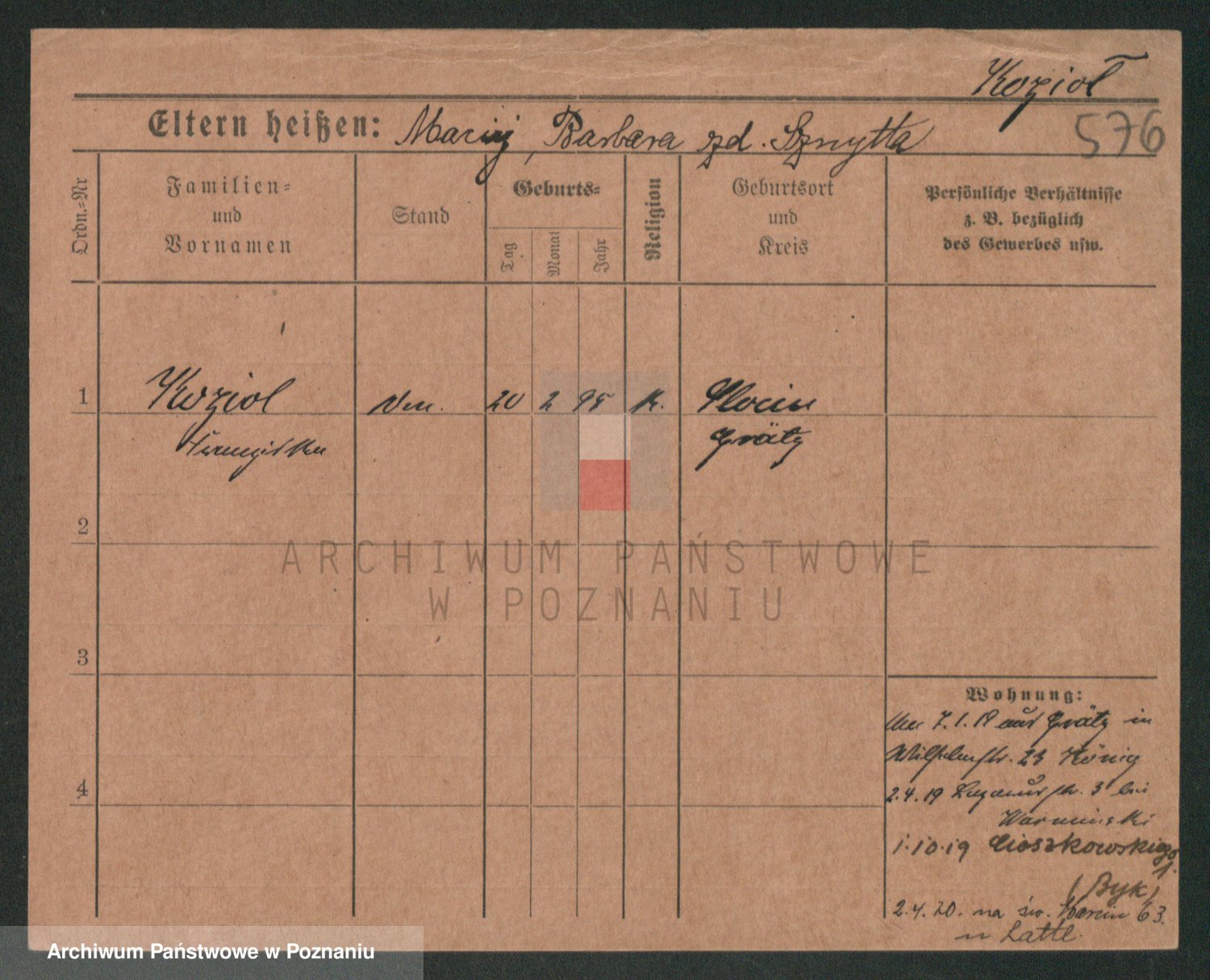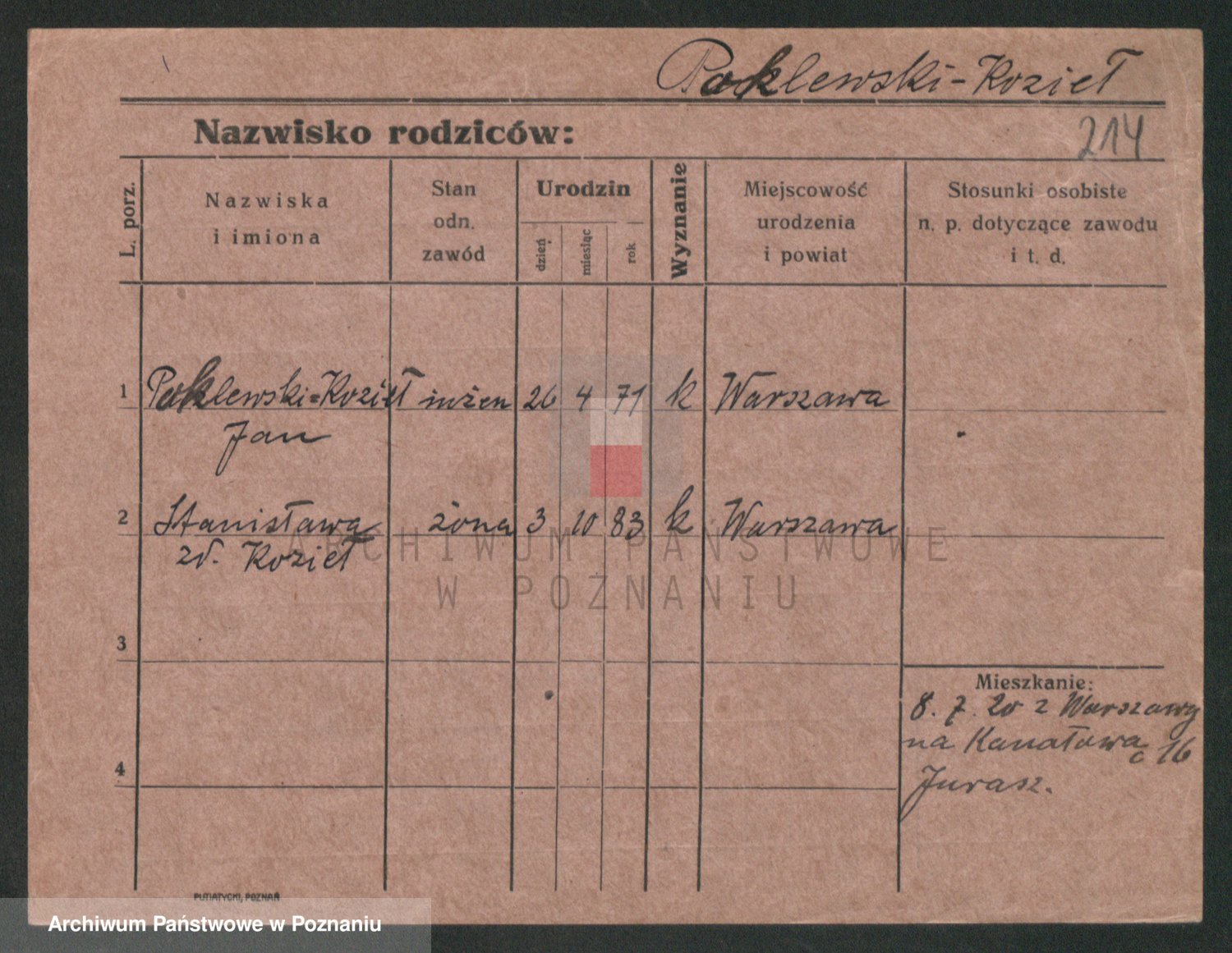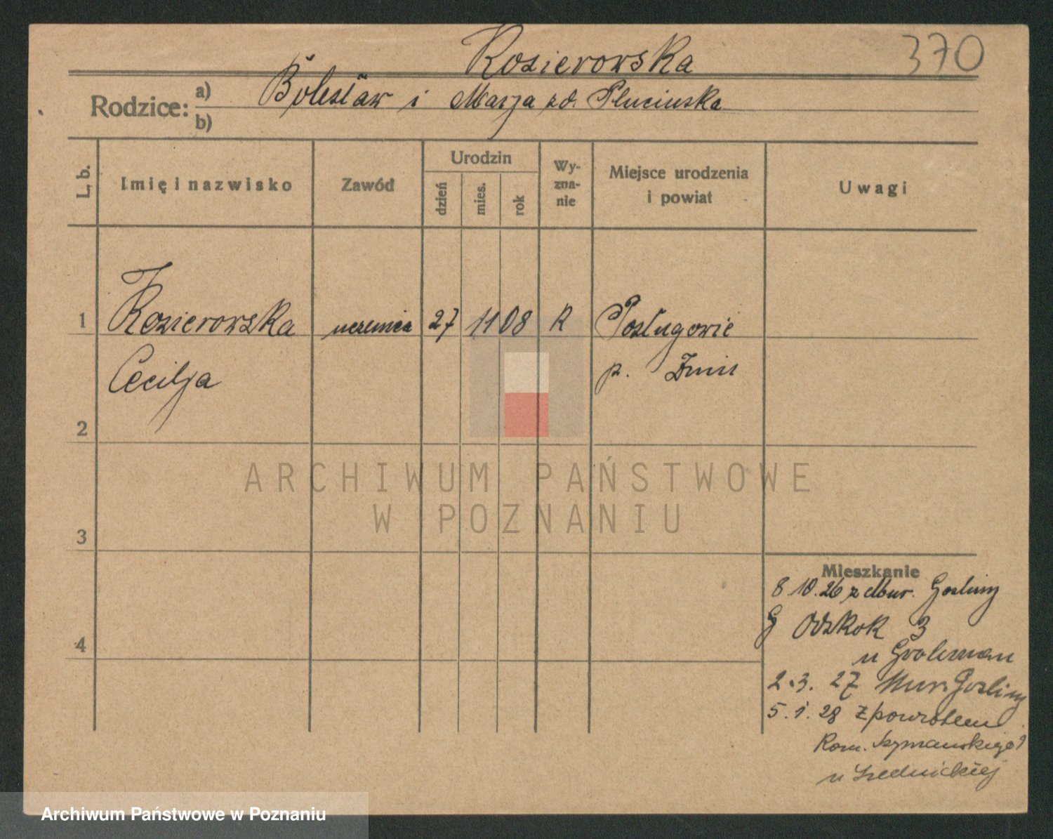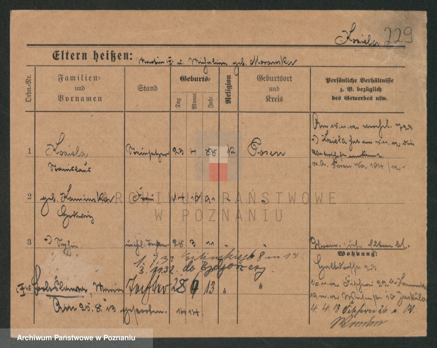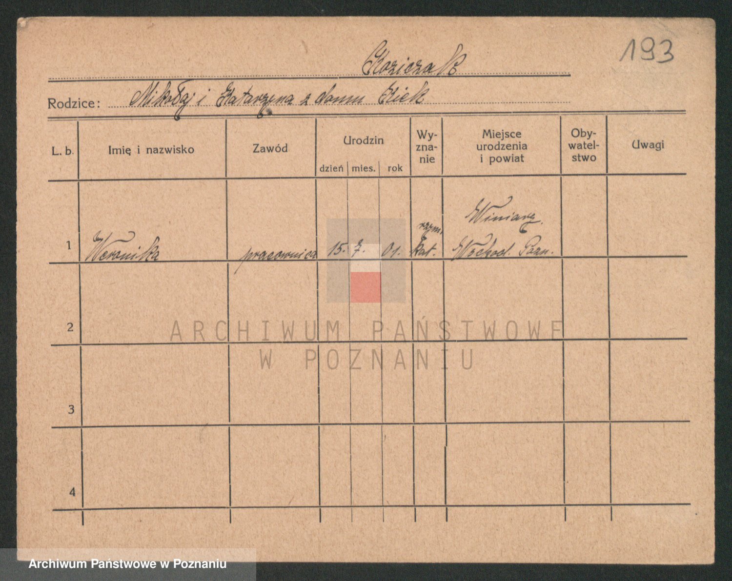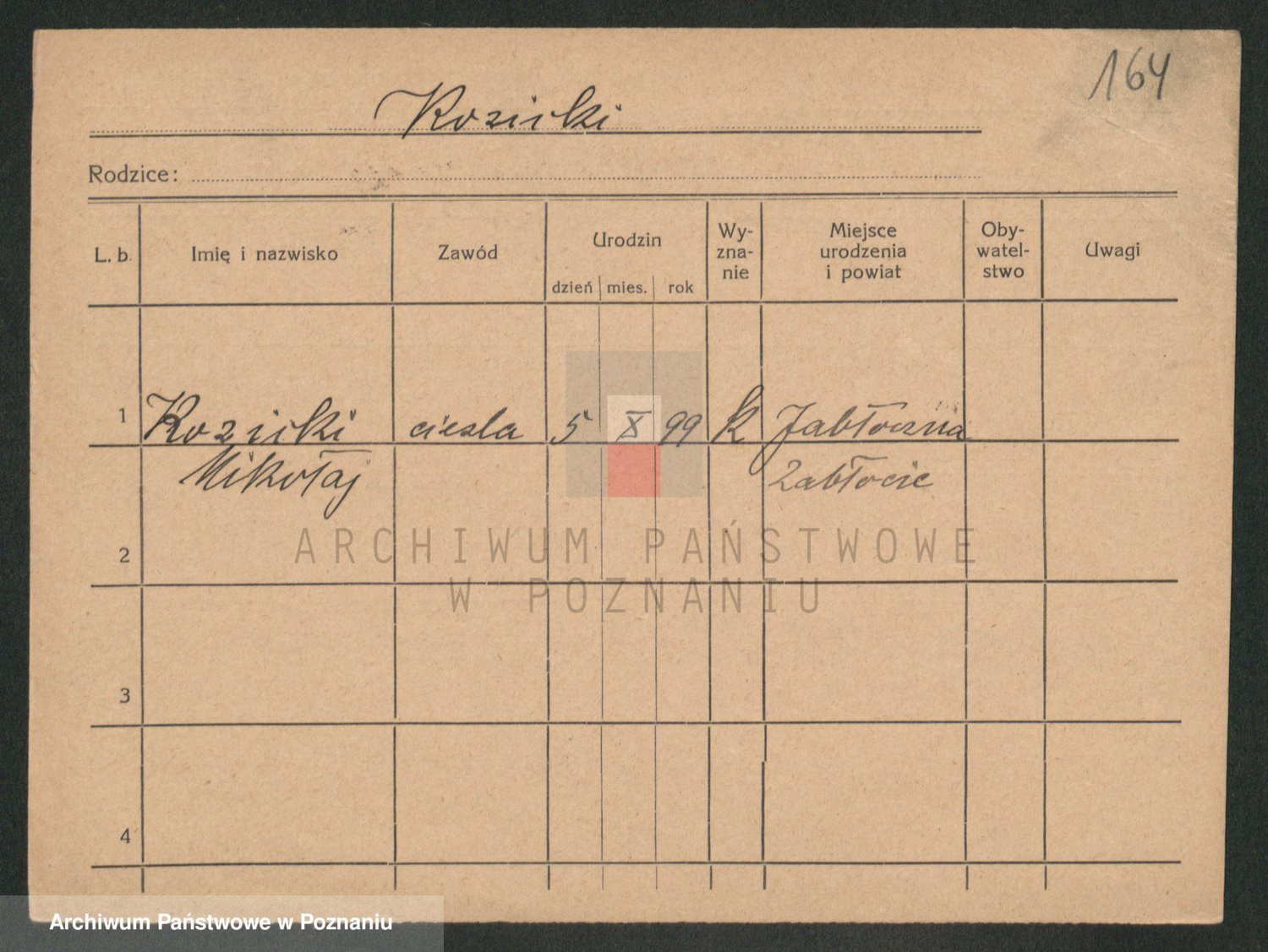 Podgląd karty osobowej dostępny jest po kliknięciu na nazwisko lub ikonkę karty. Można dokonywać powiększenia (ikony na górze) lub przechodzić między kolejnymi skanami (strzałki po bokach).
