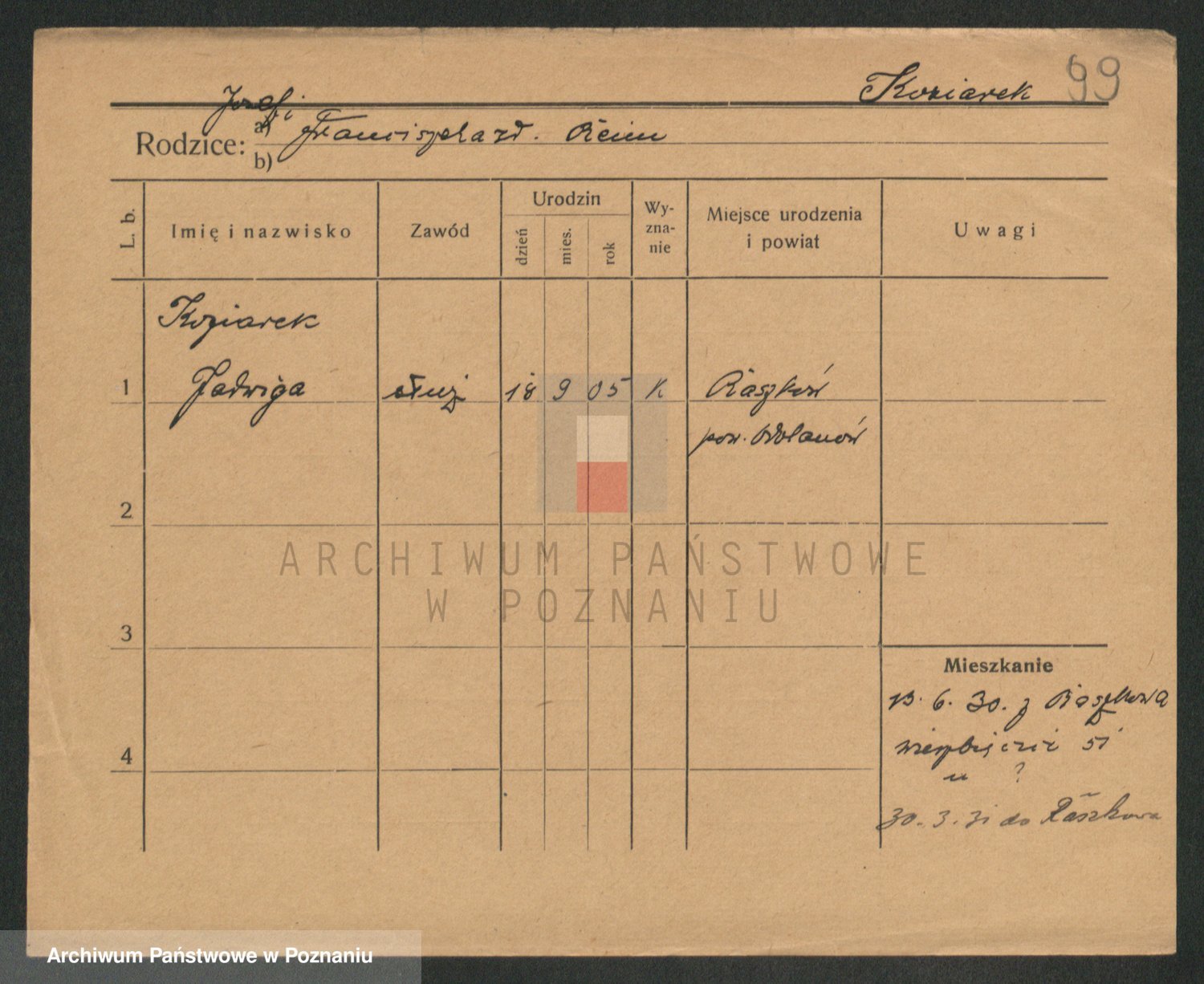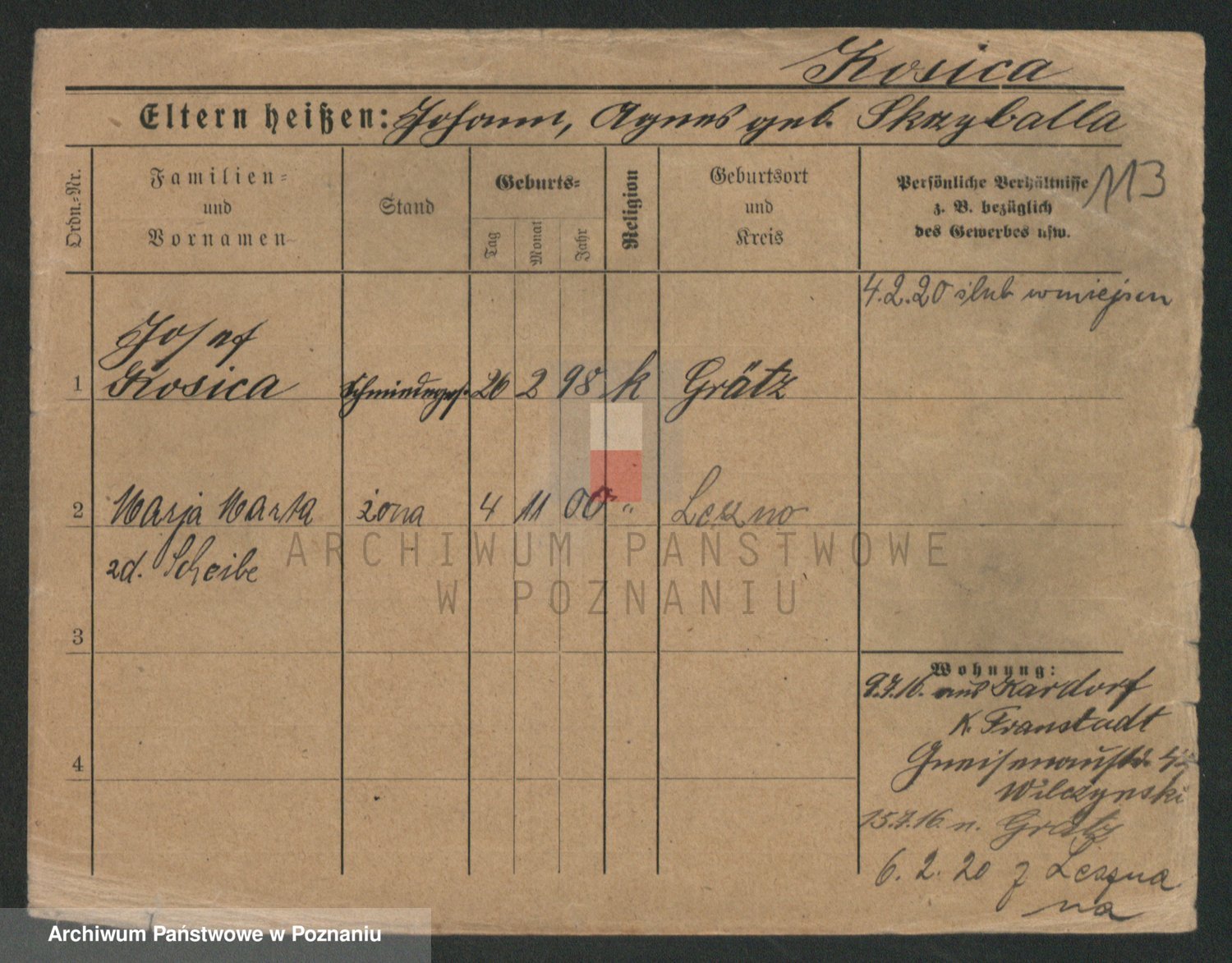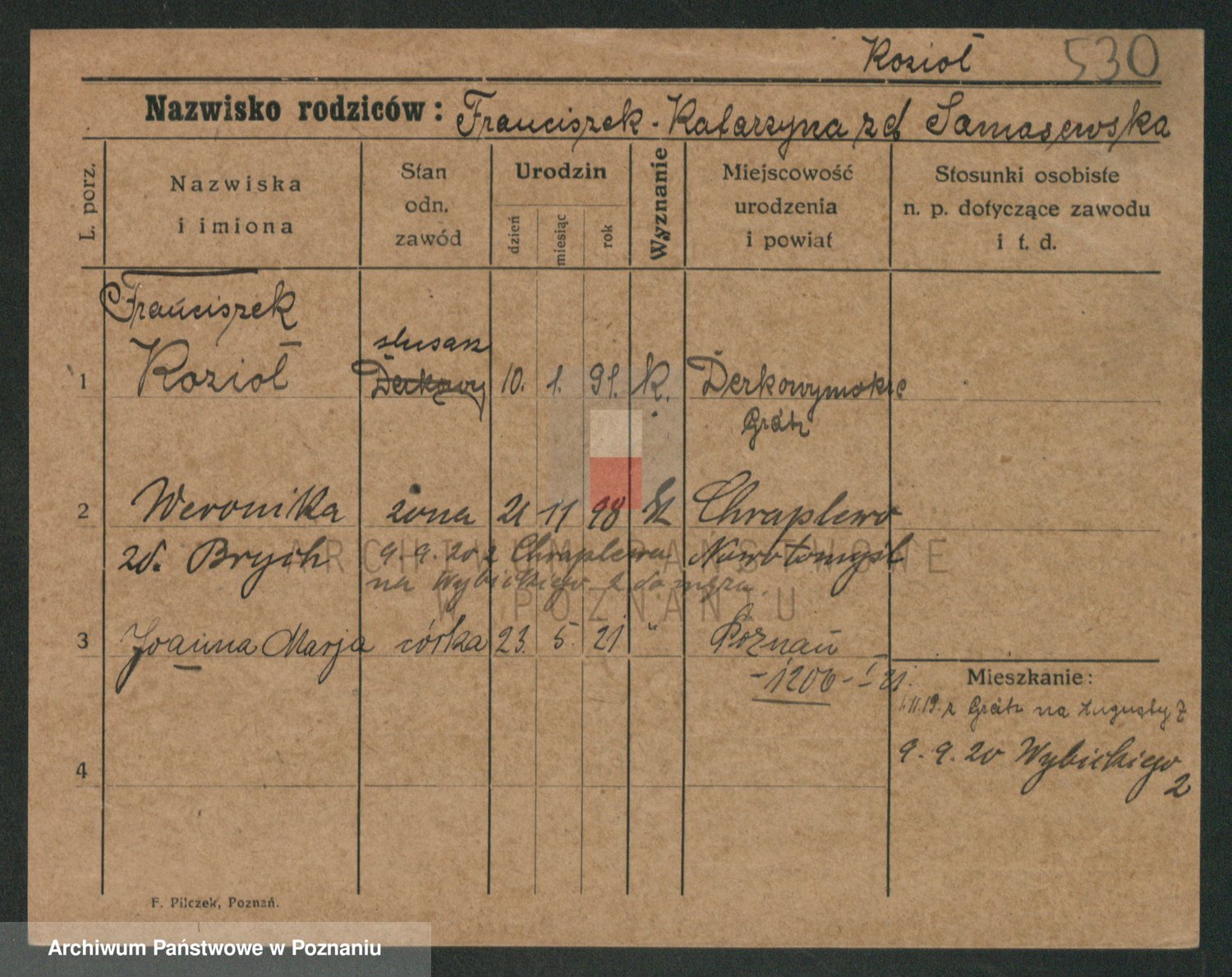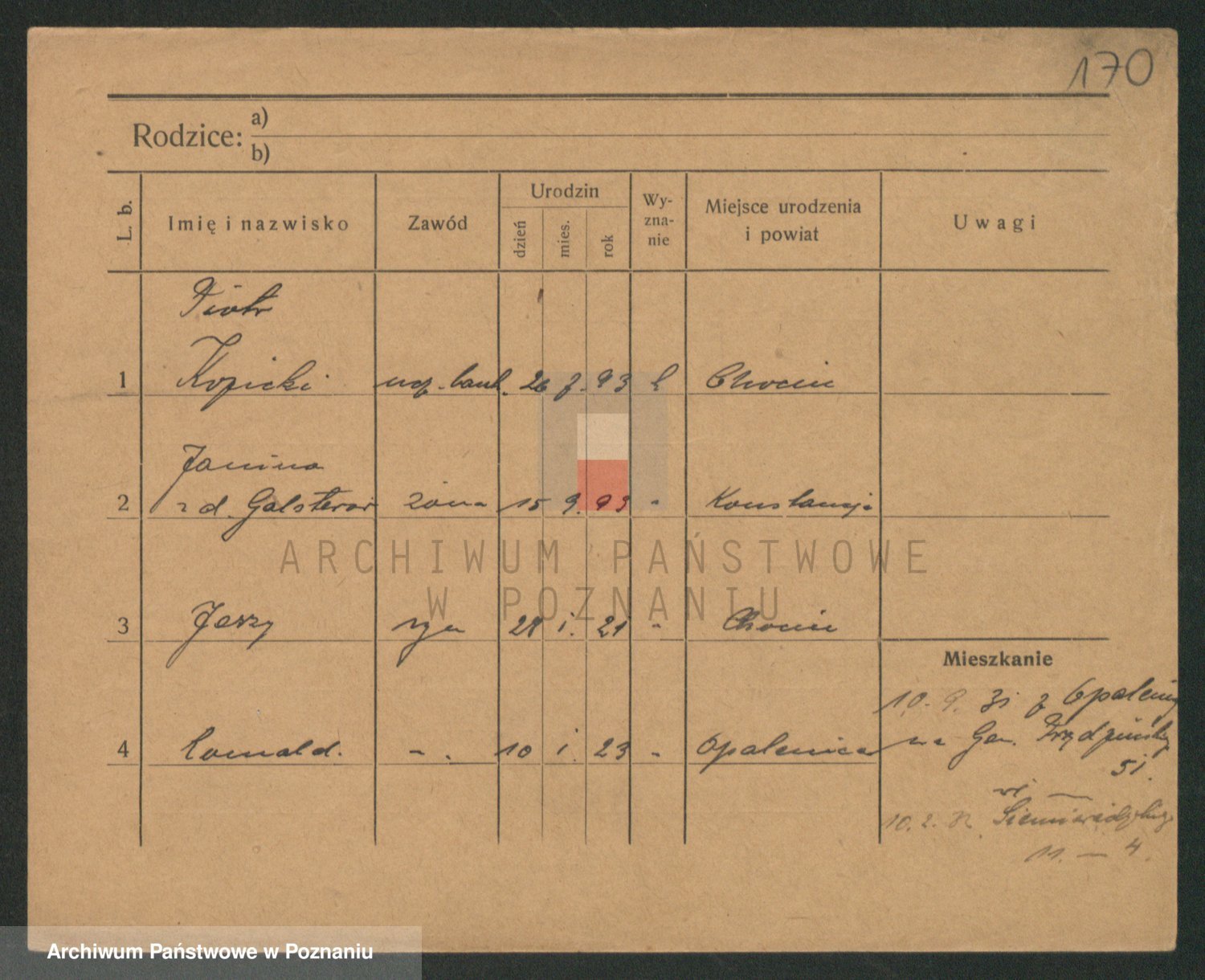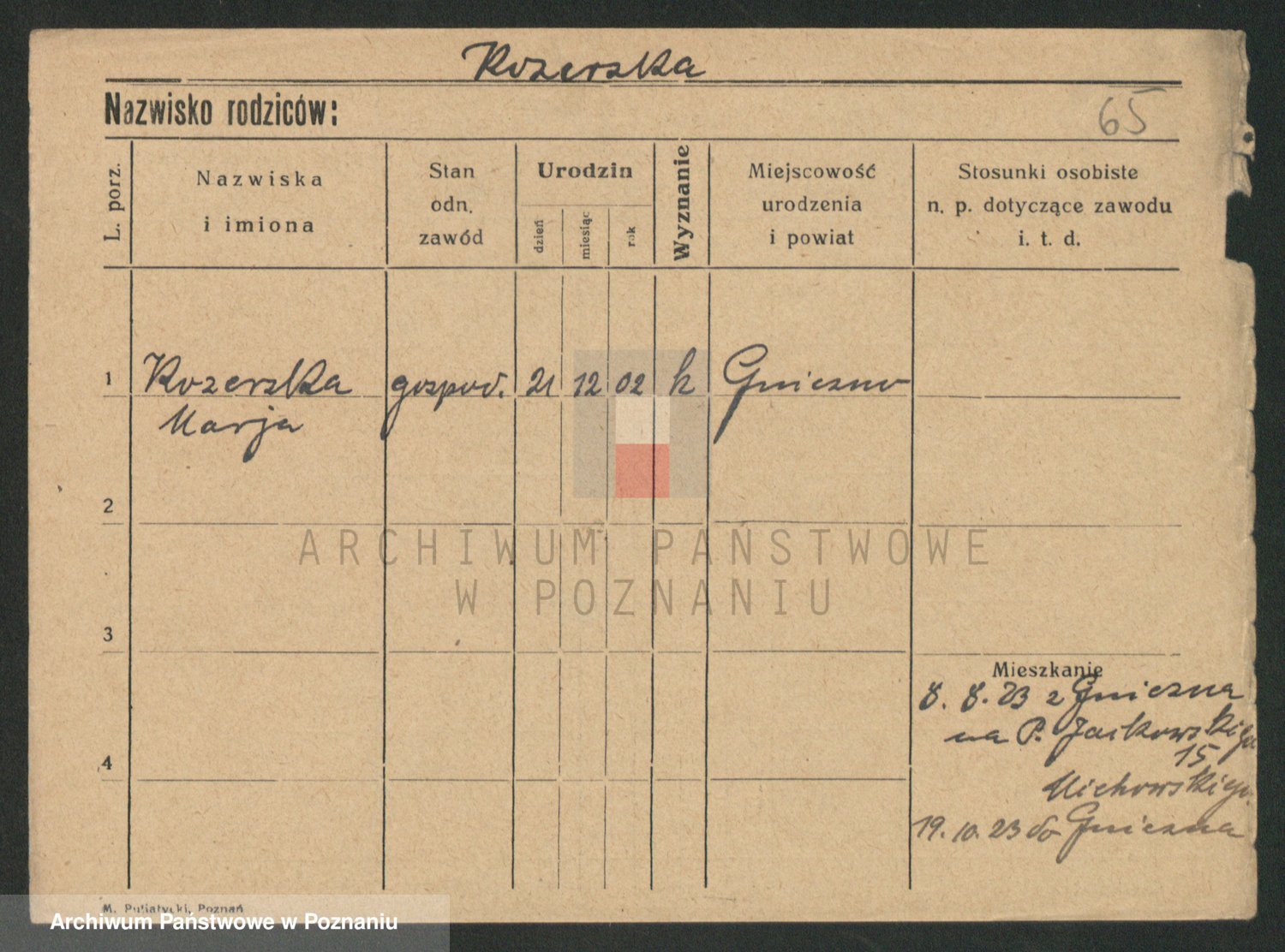 Podgląd karty osobowej dostępny jest po kliknięciu na nazwisko lub ikonkę karty. Można dokonywać powiększenia (ikony na górze) lub przechodzić między kolejnymi skanami (strzałki po bokach).