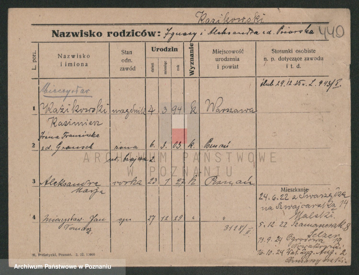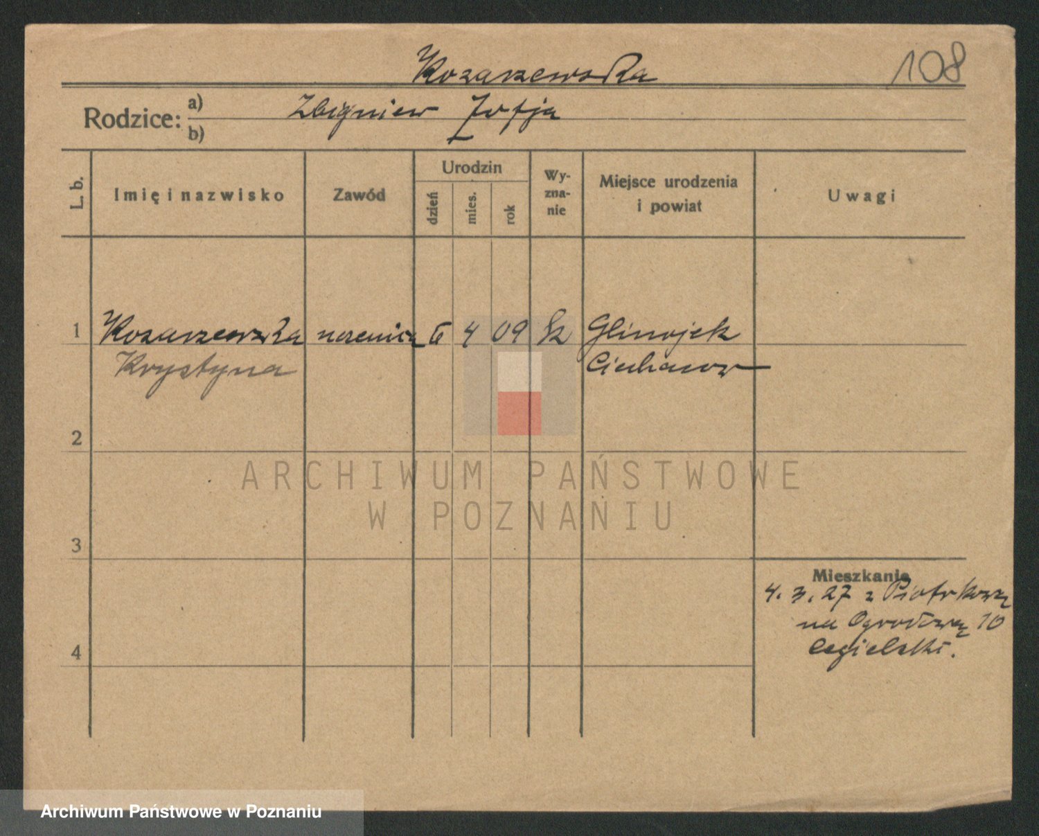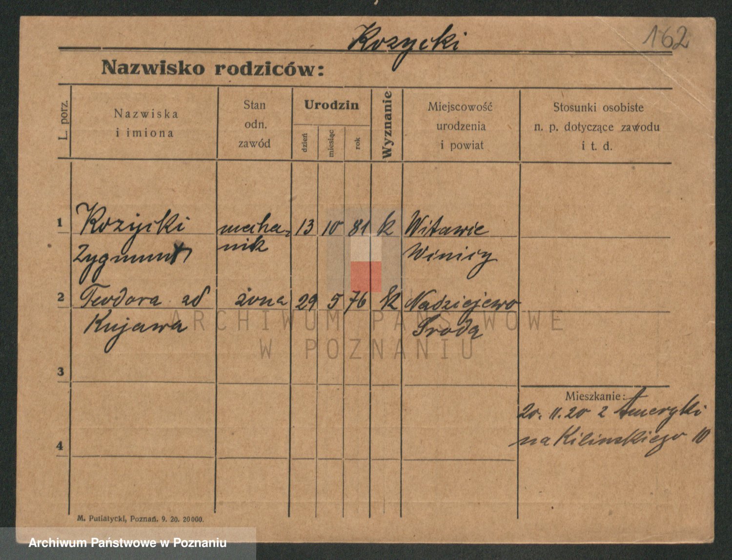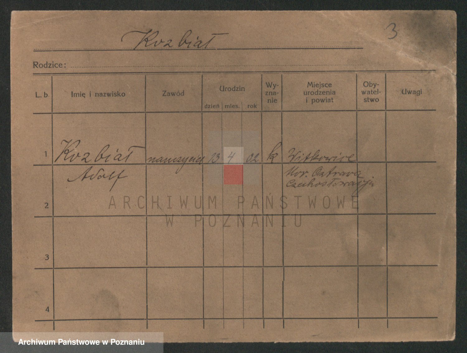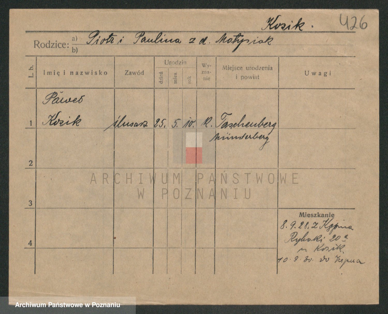 Podgląd karty osobowej dostępny jest po kliknięciu na nazwisko lub ikonkę karty. Można dokonywać powiększenia (ikony na górze) lub przechodzić między kolejnymi skanami (strzałki po bokach).