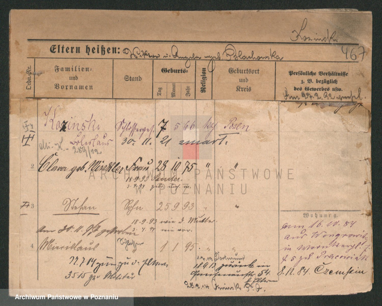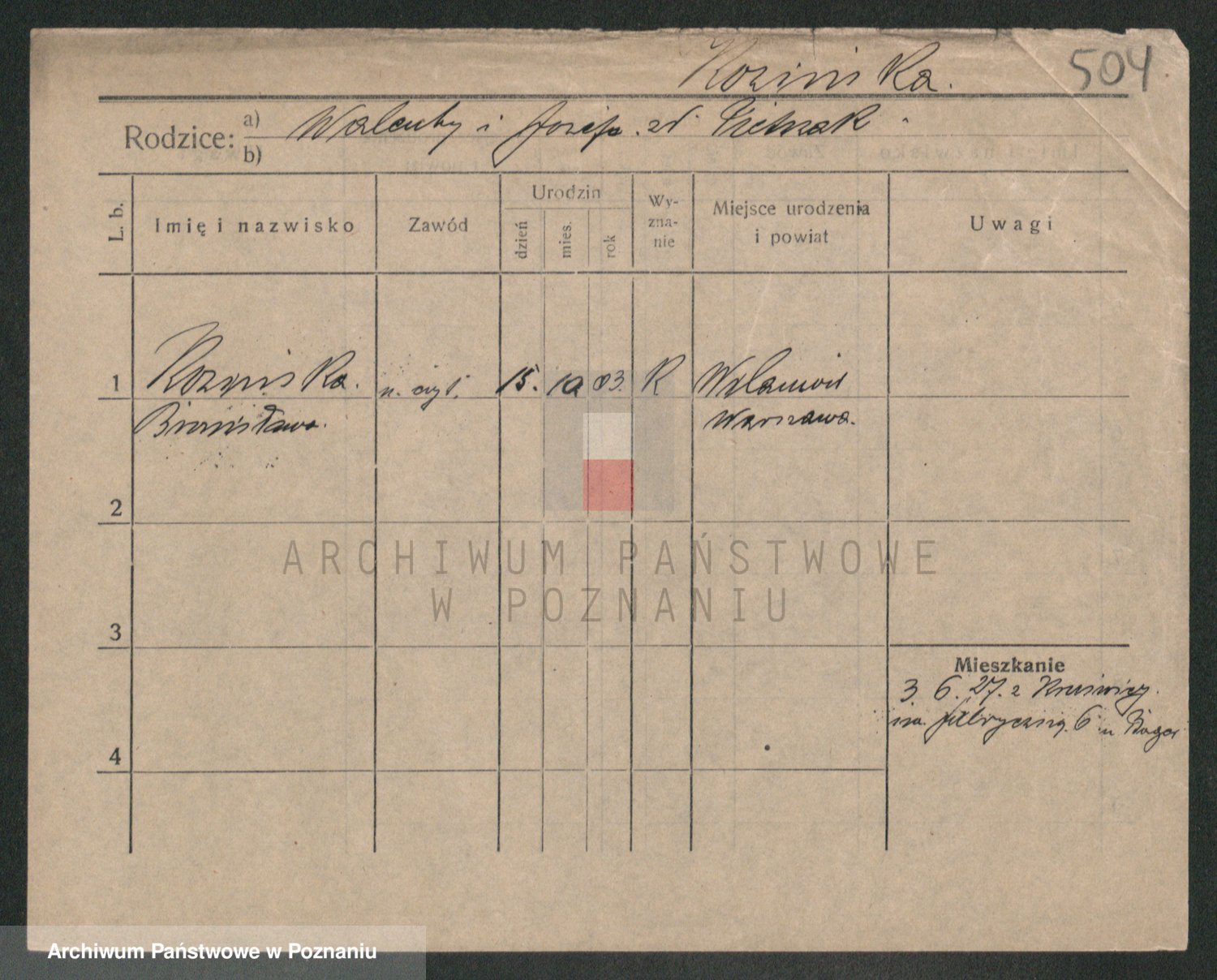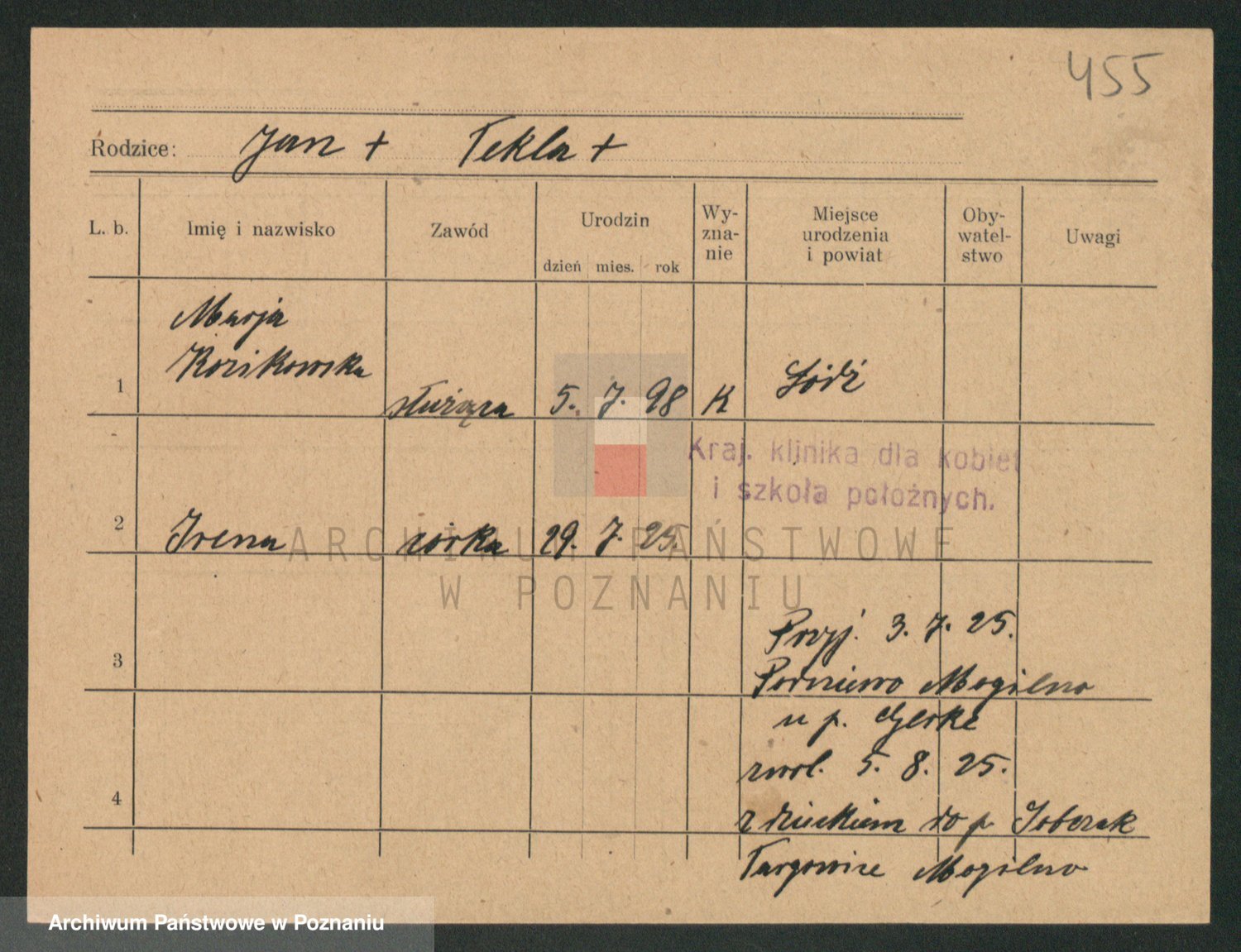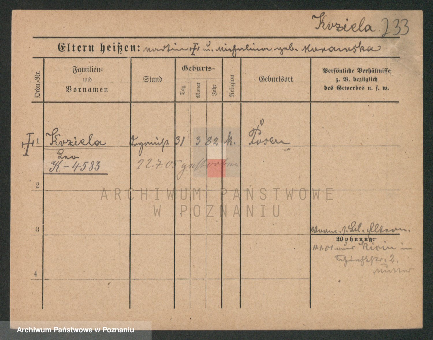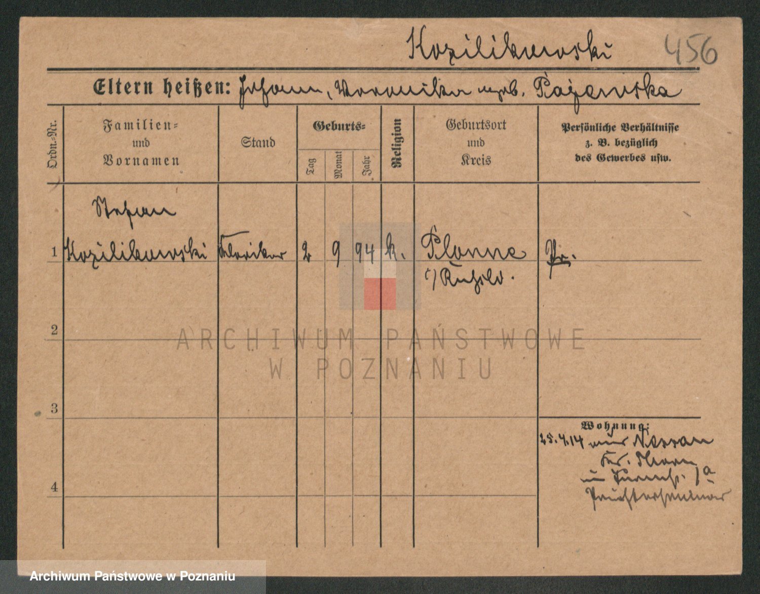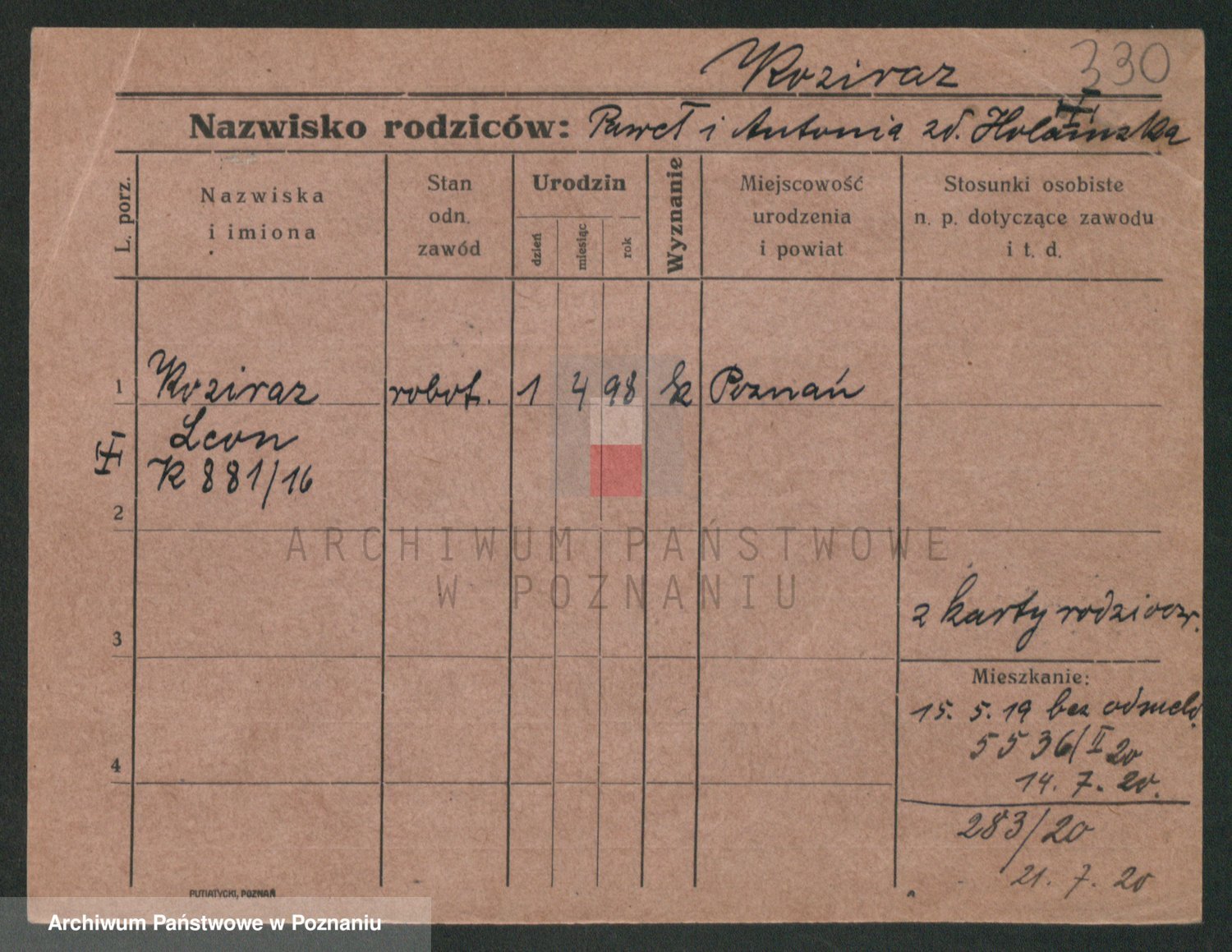 Podgląd karty osobowej dostępny jest po kliknięciu na nazwisko lub ikonkę karty. Można dokonywać powiększenia (ikony na górze) lub przechodzić między kolejnymi skanami (strzałki po bokach).