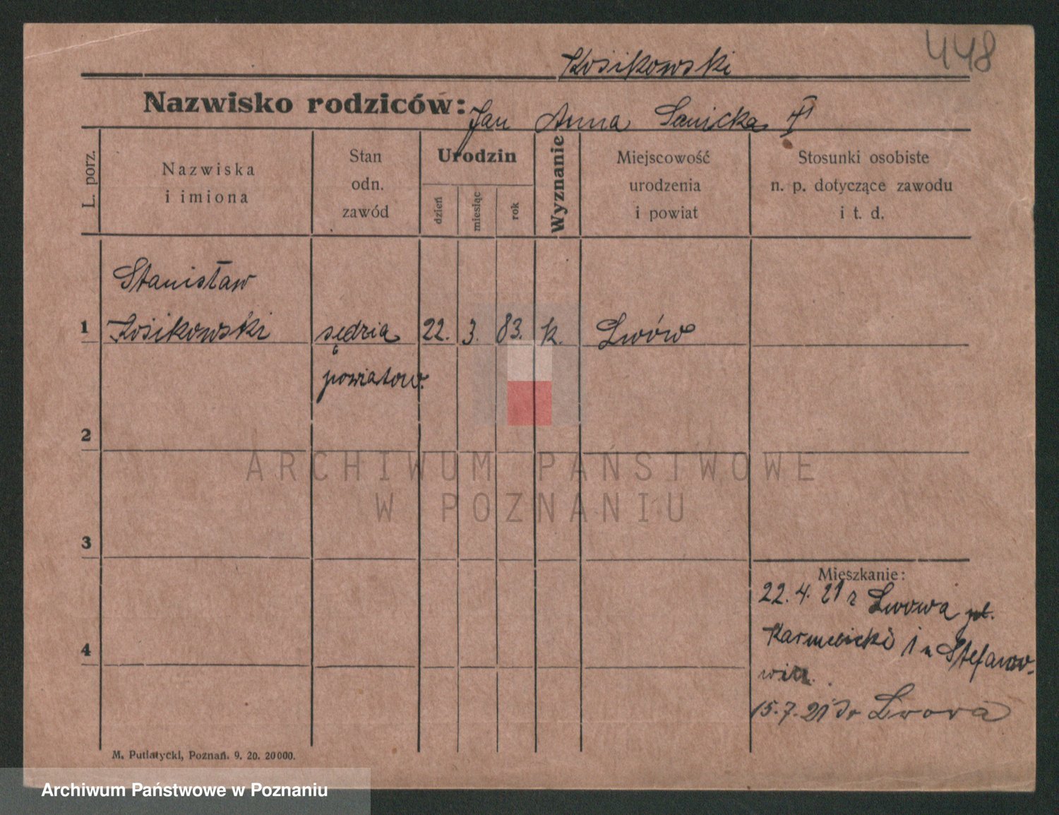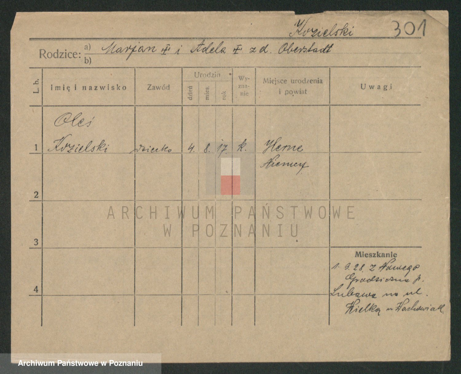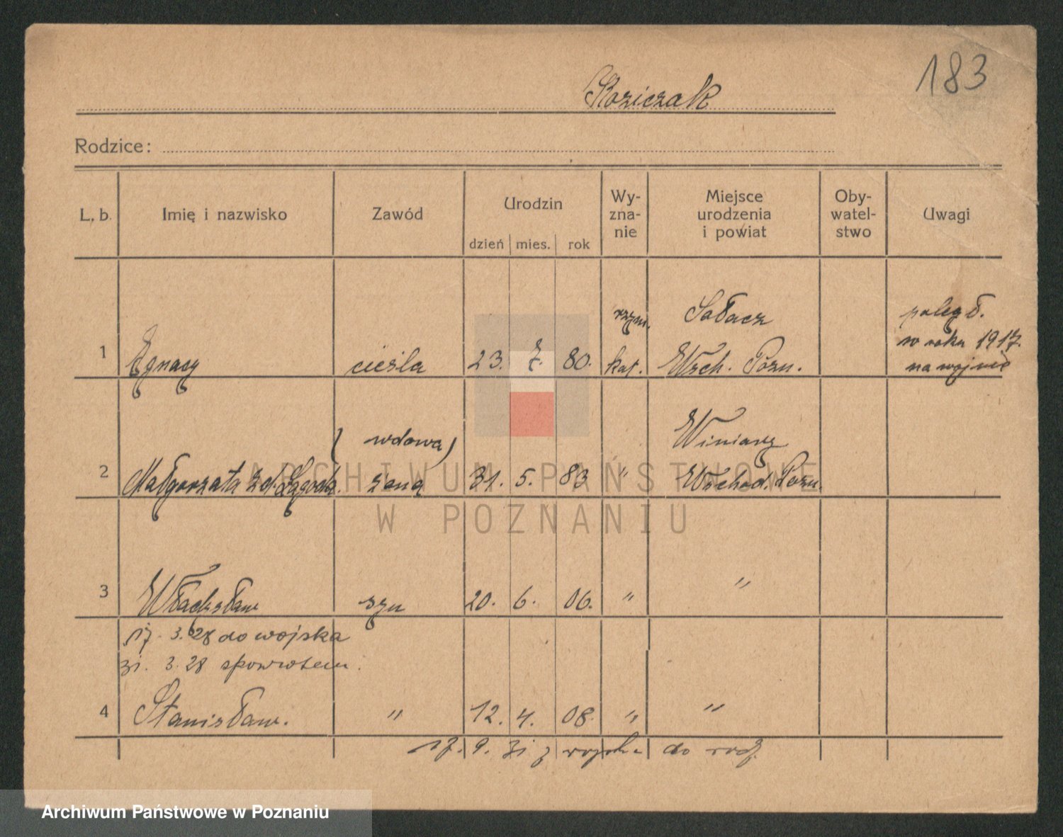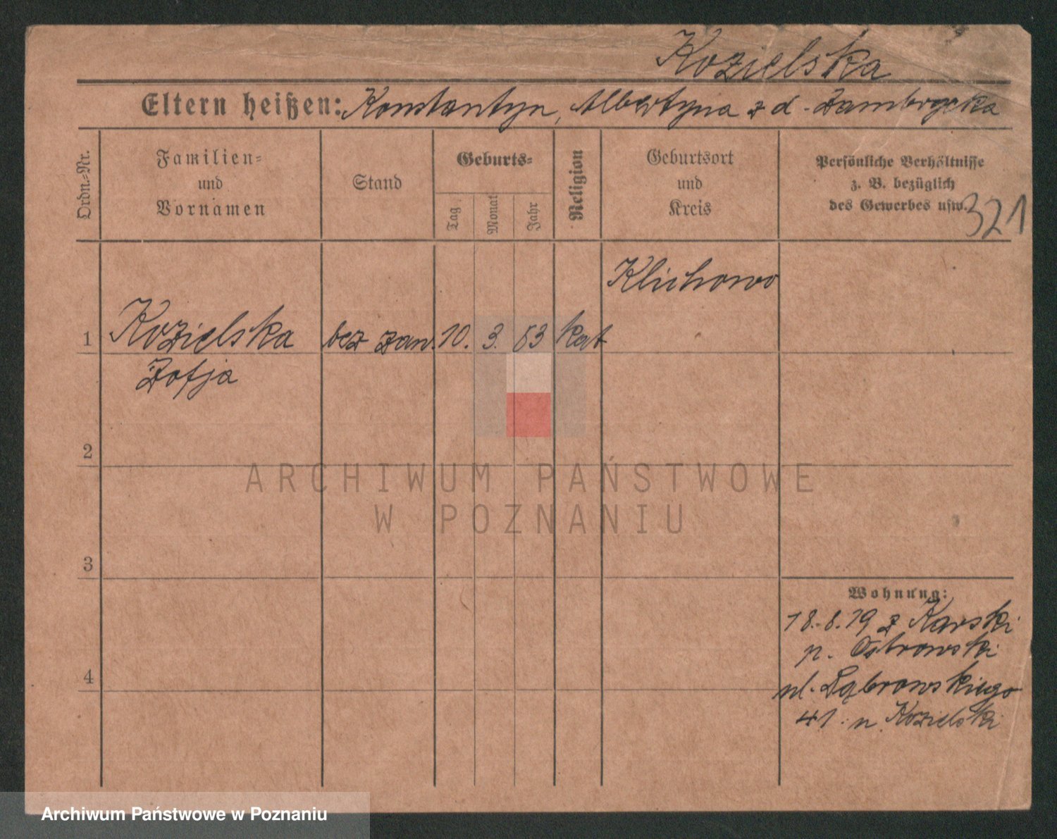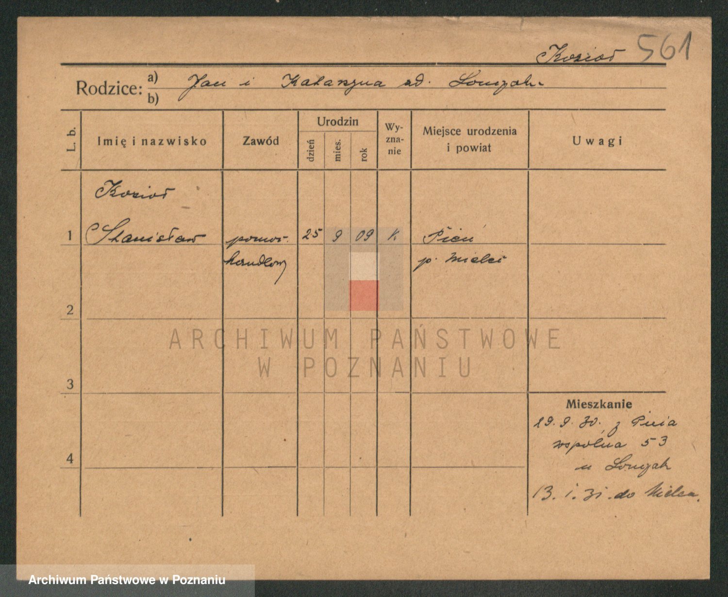 Podgląd karty osobowej dostępny jest po kliknięciu na nazwisko lub ikonkę karty. Można dokonywać powiększenia (ikony na górze) lub przechodzić między kolejnymi skanami (strzałki po bokach).