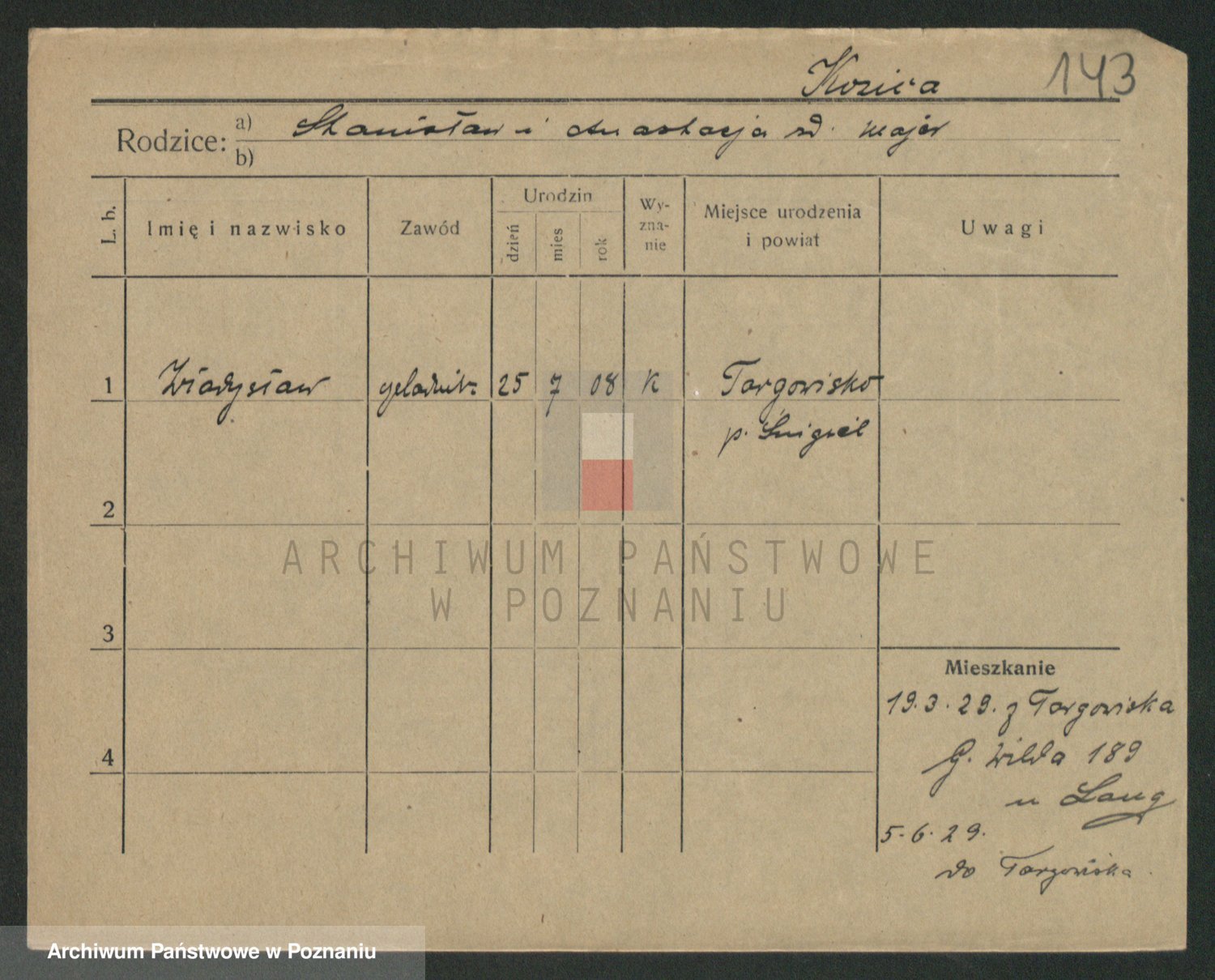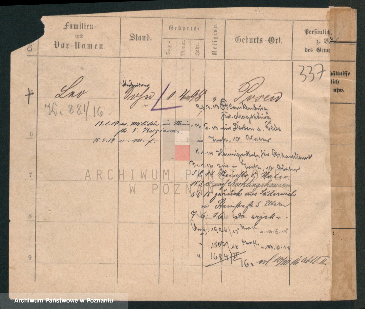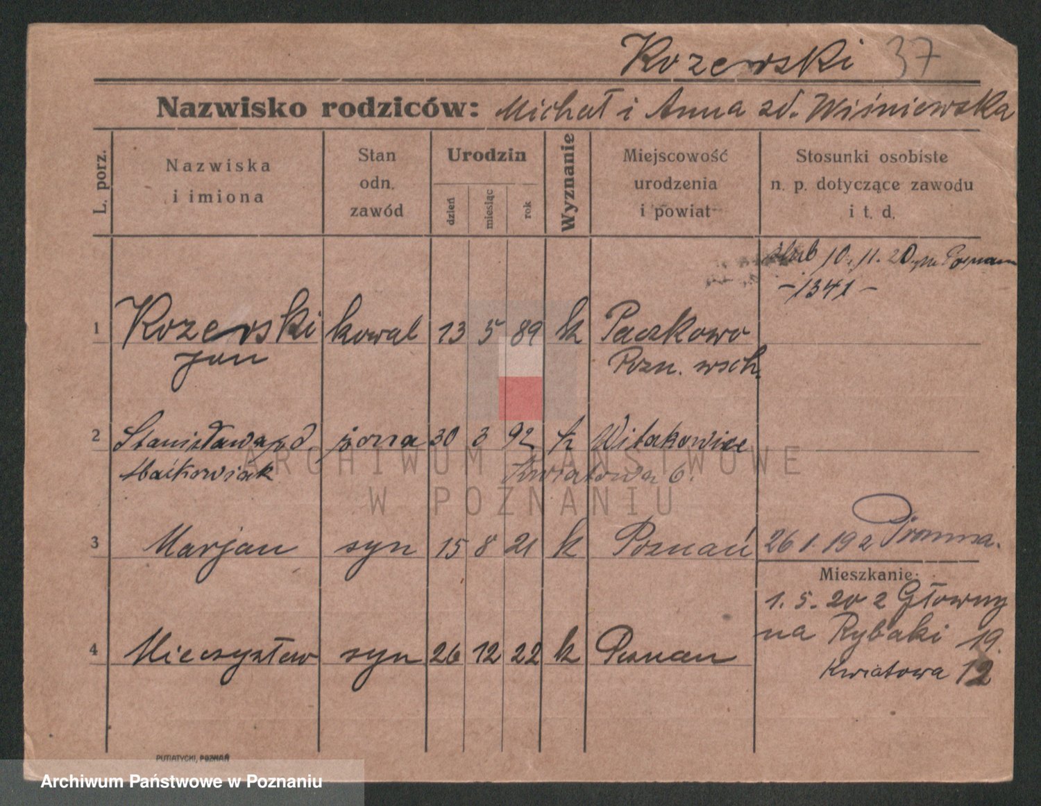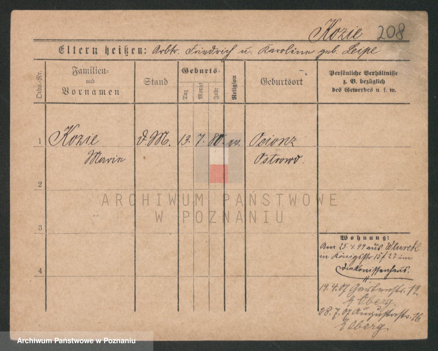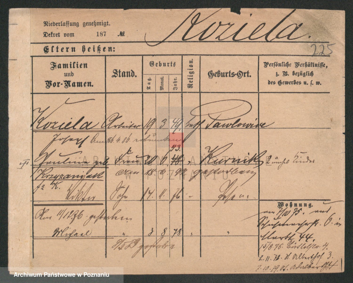 Podgląd karty osobowej dostępny jest po kliknięciu na nazwisko lub ikonkę karty. Można dokonywać powiększenia (ikony na górze) lub przechodzić między kolejnymi skanami (strzałki po bokach).