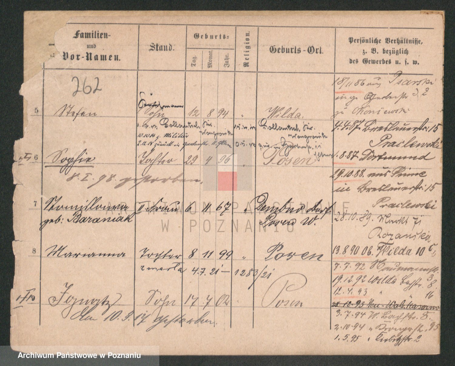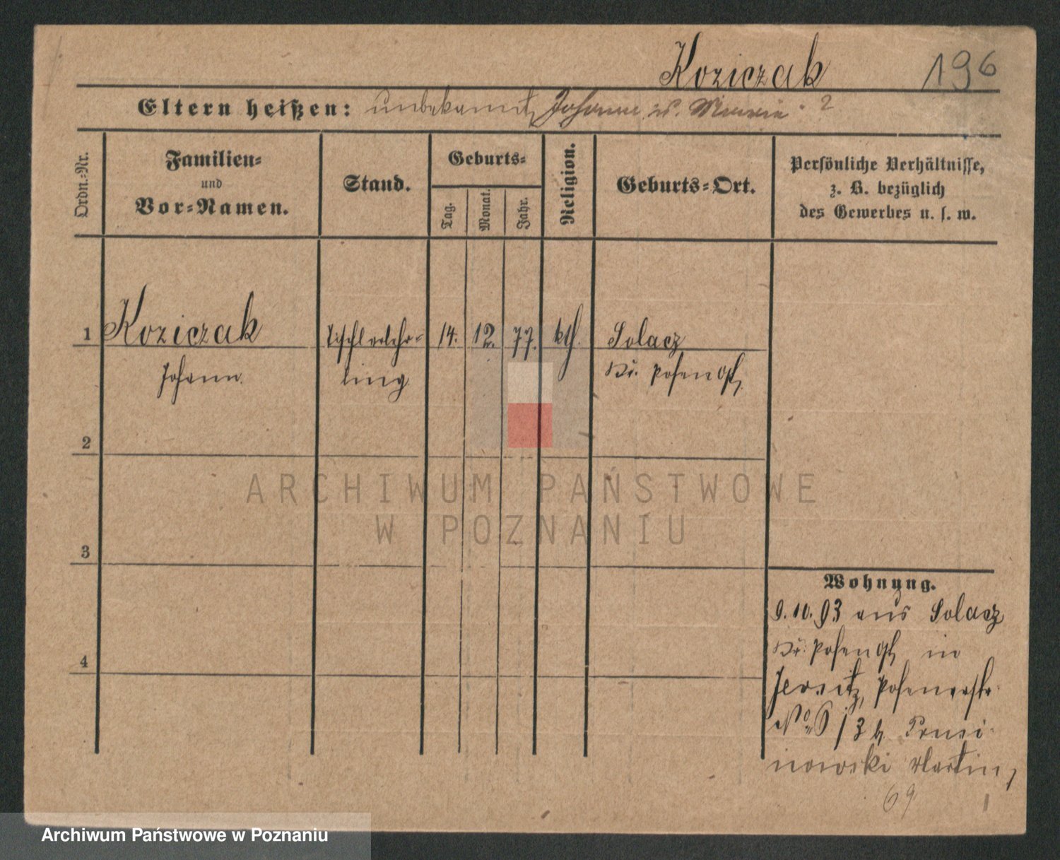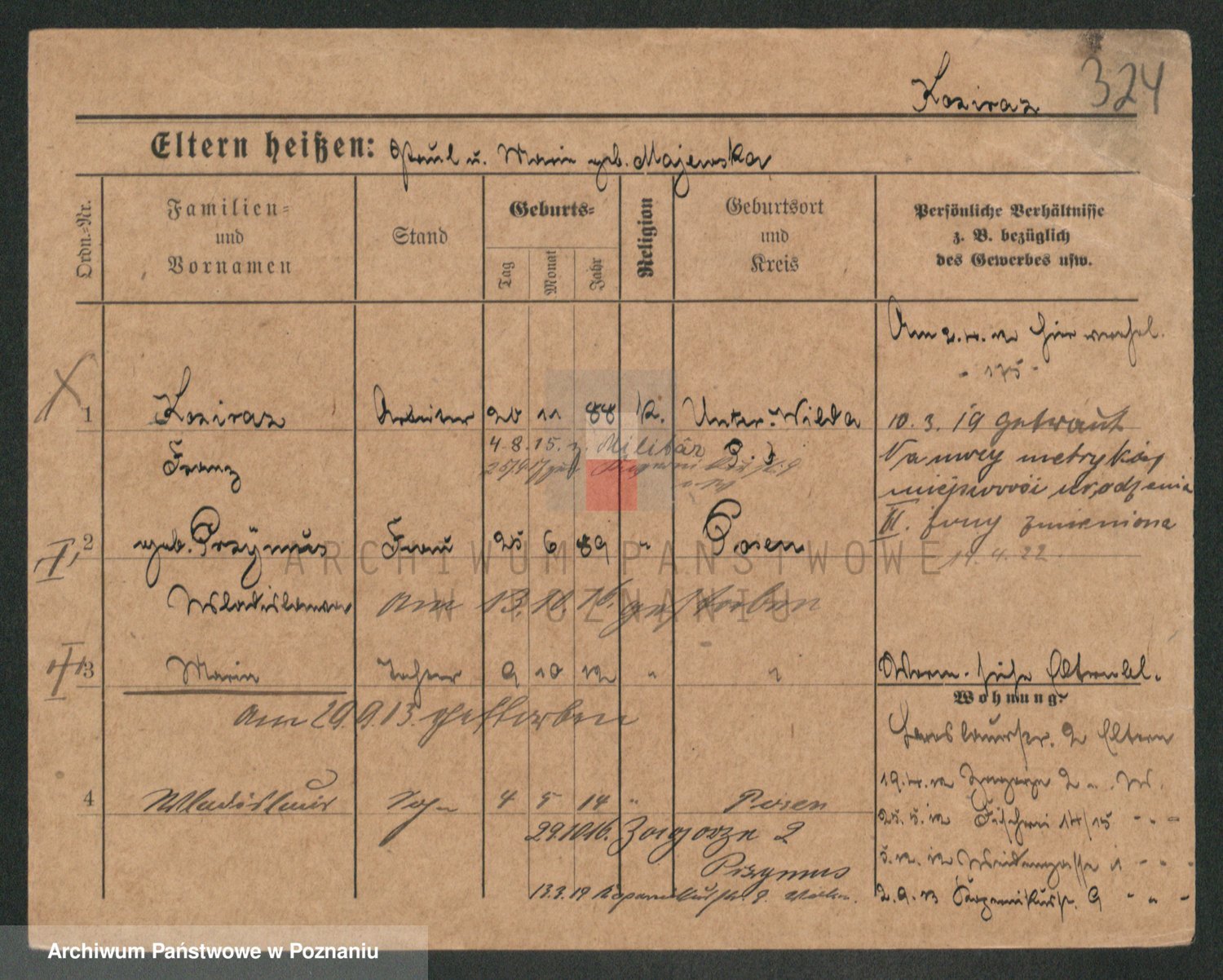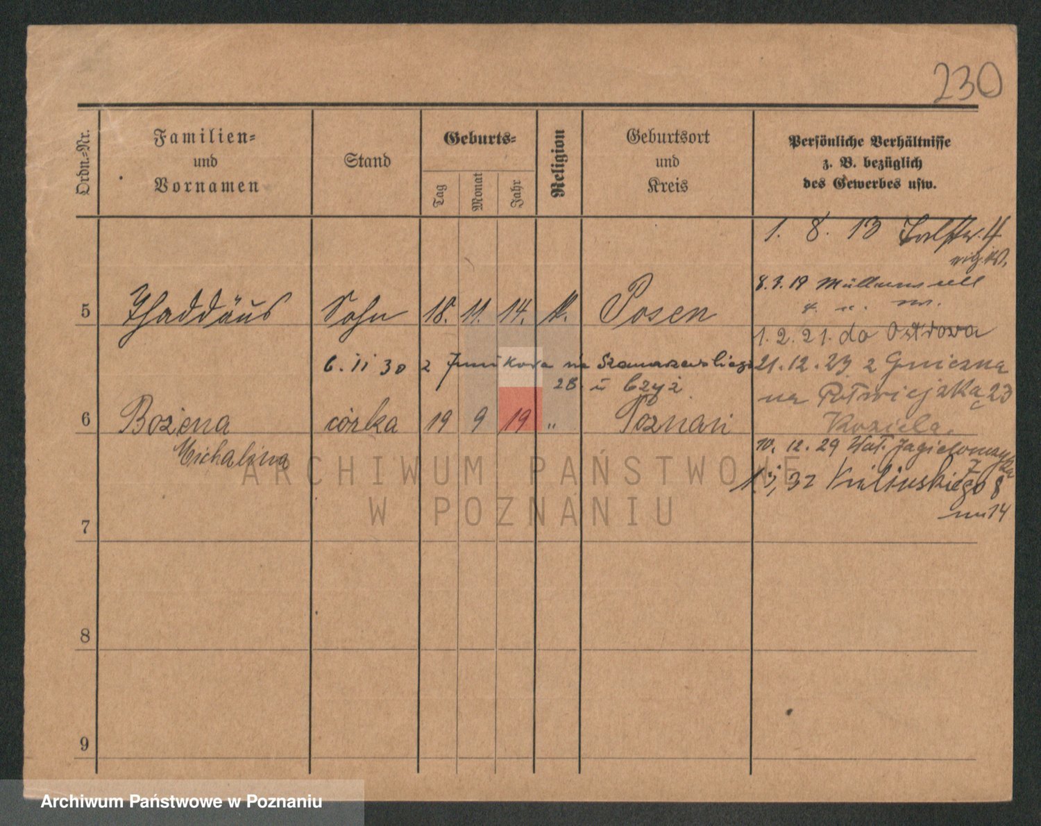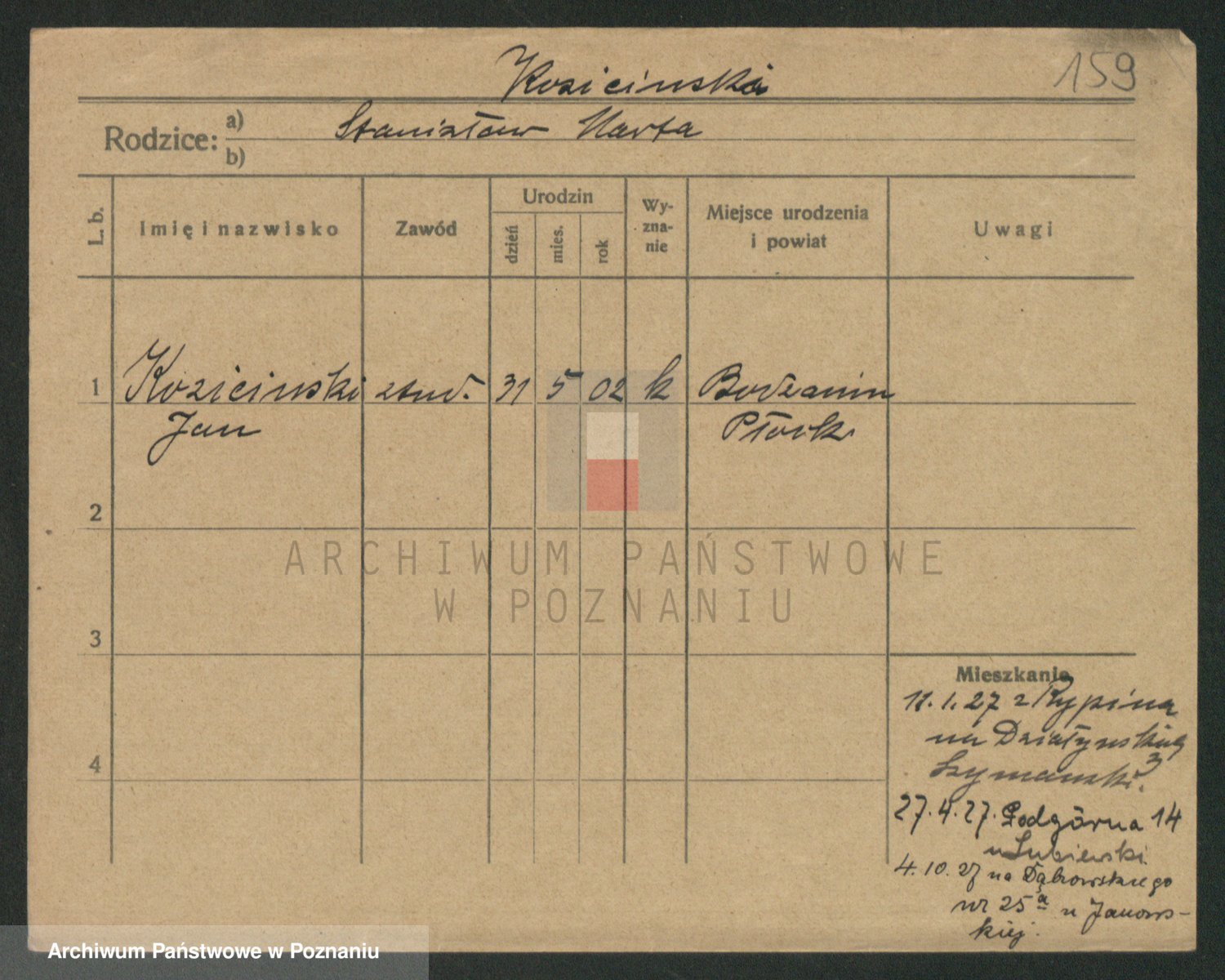 Podgląd karty osobowej dostępny jest po kliknięciu na nazwisko lub ikonkę karty. Można dokonywać powiększenia (ikony na górze) lub przechodzić między kolejnymi skanami (strzałki po bokach).
